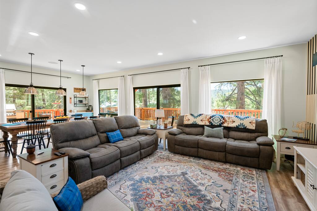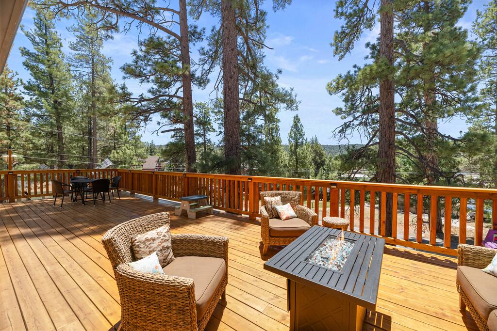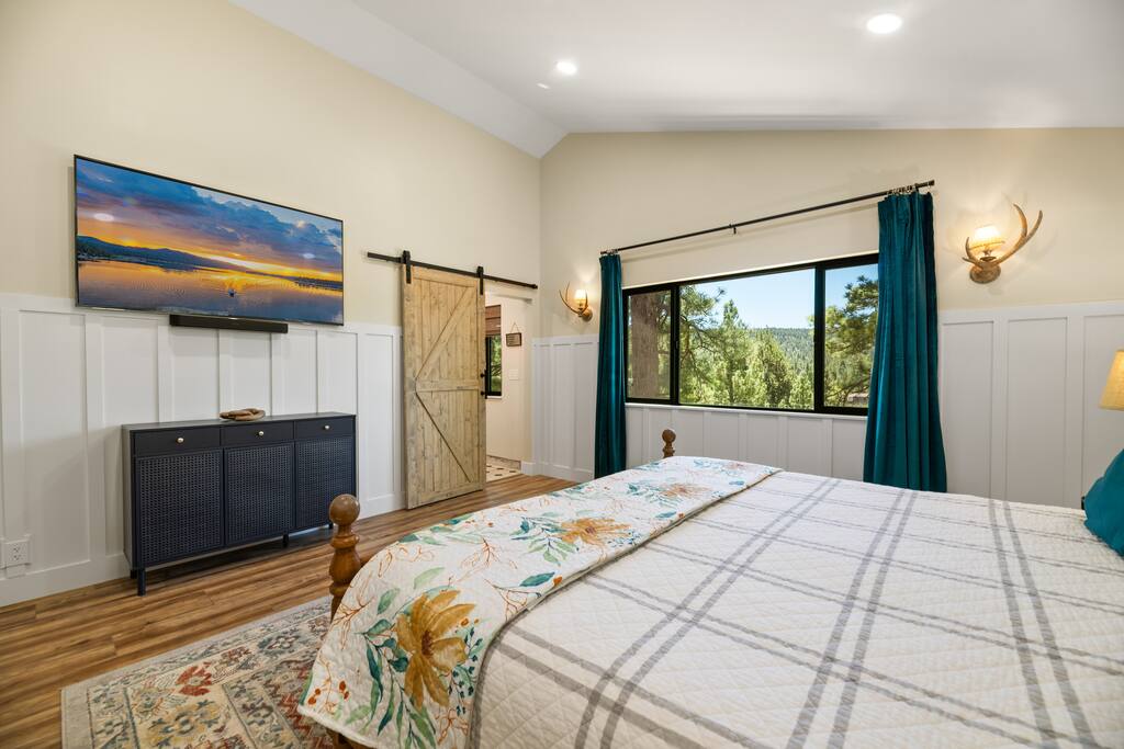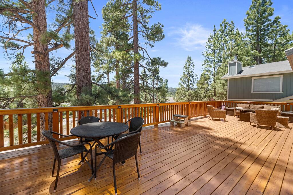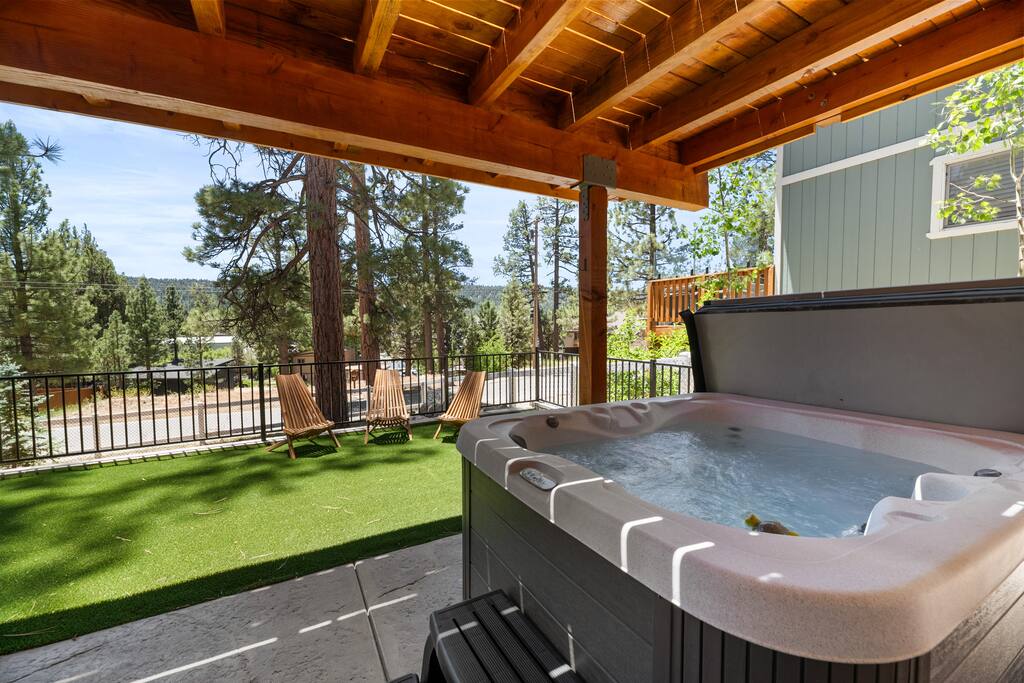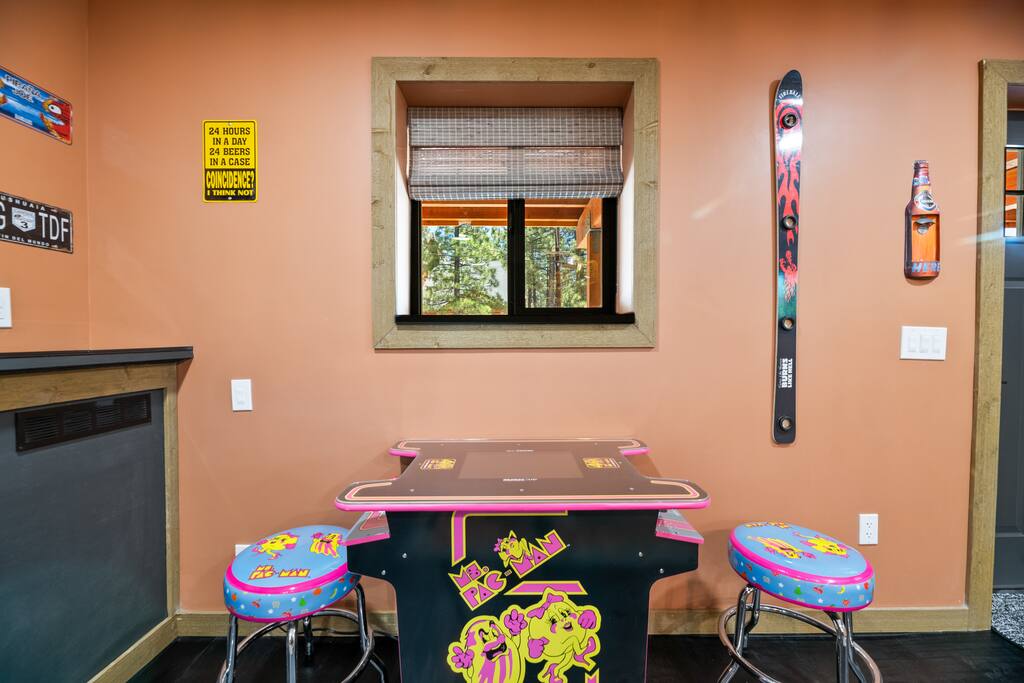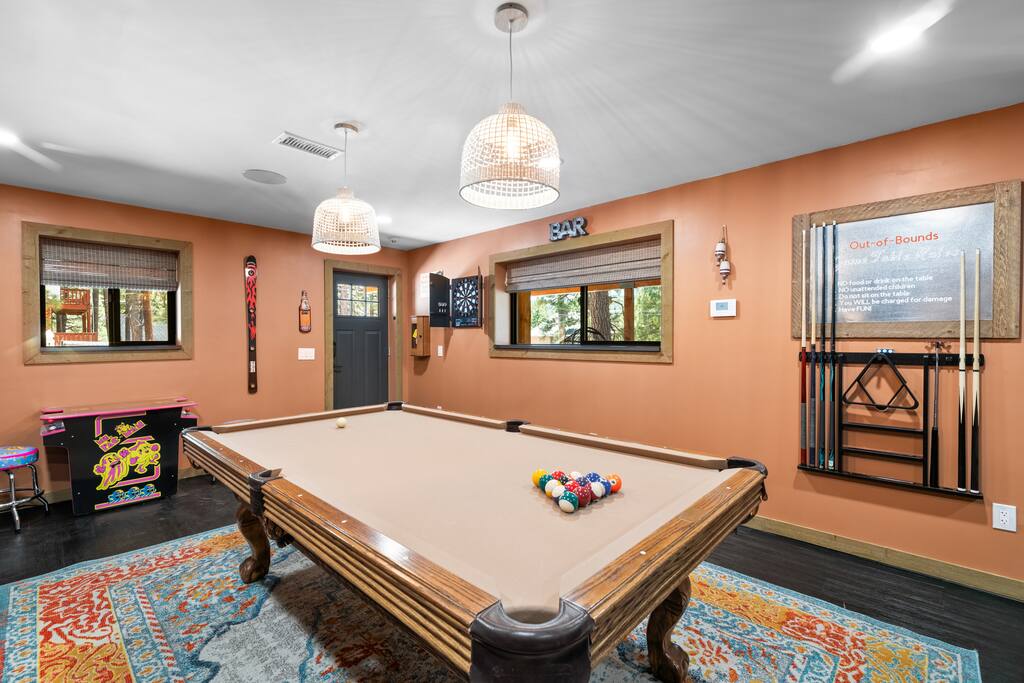 Escape to comfort and adventure at Out Of Bounds Cabin! Tucked into the scenic beauty of Big Bear and directly across the street from the lake, Out Of Bounds Cabin is the perfect destination for making memories and connections. With three spacious levels, six bedrooms, and a generous layout accommodating up to 13 guests, this grand retreat is the ultimate getaway for family gatherings, weekend reunions with friends, or pet-friendly vacations. Whether you're unwinding after a day on the slopes or soaking in the tranquil scenery, you'll find that every detail at Out Of Bounds Cabin is designed to help you feel right at home. Start your mornings with fresh mountain air on the upper deck, sipping coffee as the sun rises over the lake just across the street. The gourmet kitchen makes breakfast a breeze whether you're flipping pancakes on the griddle or preparing a delicious brunch before heading out to hike, bike, or ski. After an active day exploring Big Bear, return to the comfort of plush sofas and gather in the open-concept living room complete with a 65” Samsung TV and Sonos sound bar for movie night or gaming marathons. When it's time for some fun indoors, guests can head to the game room for entertainment galore including shuffleboard, pool table, arcade classics, and even bar seating for spectators. Poker nights come alive in the game area on the main level, or challenge the kids to a ping pong match on the patio. Then, reward your sore muscles with a soak in the private hot tub under the stars, followed by a get-together around the fire pit on the deck. The cabin’s six bedrooms offer a range of cozy options with everything from a private suite with California king beds and ensuite to a bunk room that’s perfect for kids complete with a loveseat and Roku TV. Each room is outfitted with comfortable bedding, hardwood floors, and amenities that blend rustic charm with modern flair. And with fast Wi-Fi, TVs with Roku, an EV charger (Tesla and universal adaptor), and central air conditioner, you'll have all the modern conveniences you need without ever having to leave the mountainside magic. Just minutes from Big Bear Village’s shops and restaurants and central to outdoor adventures all year round, Out Of Bounds Cabin is where luxury meets laid-back mountain living. Book your stay and discover the perfect balance of relaxation, recreation, and reconnection! ---------- ROOM DESCRIPTIONS * Living Room: The open-concept living room is located on the main level. It has 2 big reclining sofas, 2 plush chairs, DVD player, and access to the upper deck. The 65” Samsung TV has Roku, a Sonos sound system bar, and an HDMI game port (for use if you bring your own video game console). * Kitchen: The open-concept kitchen is located on the main level. It has a refrigerator, a dishwasher, a range, a microwave, and a toaster oven. Amenities include a crockpot, a mini crockpot, a waffle maker, a griddle, coffee machine, and assorted cooking necessities. This room has access to the upper deck as well as a sliding security gate on one side of the kitchen for small children and pets. * Dining Area: The open-concept dining area is located on the main level and has a dining table near the kitchen that can seat 12 guests. There is also a bar area with a mini-fridge. * Game Area: There is a game area on the main level near the living room. It has a convertible game table for poker and checkers, a 35” TV, and a wood burning fireplace. In addition to this game area, there is a dedicated game room located on the lower level. * Game Room: The dedicated game room is located on the lower level and is accessible through the main patio. It has a shuffleboard table, a pool table, bar seating for guests, an arcade console table with classic video games, a dart board, and 3 TVs (1 is 65” & 2 are 43”). * Laundry Area: The laundry area is located on the main floor near the kitchen. The washer and dryer are available to guest use for a small fee, thru an app. The fee is $5.35 for 24 hours unlimited use. * Garage: The garage is located on the main level. It has 1 EV charger (Tesla & universal adapter) available for guests to use for a small fee thru an app. ---------- OUTSIDE AREA DESCRIPTIONS * Upper Deck: The wraparound deck has a propane barbecue grill, outdoor dining for 4 guests, a Tommy Bahama cooler, outdoor seating, a propane fire pit, and gorgeous views. This deck is accessible through the main level of the cabin. * Patio: The patio has 2 hanging chairs, additional outdoor seating, a ping pong table, child size basketball set, a grassy recreation area, access to the game room, and a four person hot tub. The lower yard area is also fully fenced for children and pets. * Lower Yard: The lower yard is a large backyard area that is fully fenced and located under the patio area. ---------- BEDROOMS: Out Of Bounds Cabin has 6 bedrooms total. There are 2 bedrooms located on the main level and 4 bedrooms located on the upper level. * Bedroom #1: This lower level bedroom is a primary bedroom that has 1 California king bed, hardwood floor, a 45” Samsung TV, and a walk-in closet. * Bedroom #2: This lower level bedroom has 1 queen bed, hardwood floor, a 45” Samsung TV, and a closet. * Bedroom #3 (Bunk Bed Room): This upper level bedroom has 2 bunk beds with a total of 5 twin beds. The first bunk bed has 2 stacked twin beds. The second bunk bed has 3 stacked twin beds. It also has a sitting area with a loveseat, hardwood floor, a Sonos sound system, and a 45” Samsung TV with Roku. * Bedroom #4: This upper level bedroom has 1 queen bed, a 43” Samsung TV with Roku, hardwood floor, and a closet. * Bedroom #5: This upper level bedroom has 1 queen bed, a 43” Samsung TV with Roku, hardwood floor, and a closet. * Bedroom #6: This upper level primary suite has 1 California king bed, hardwood floor, a 65” Samsung TV with sound bar, an ensuite bathroom (Bathroom #3), and a sitting area with a desk. ---------- BATHROOM