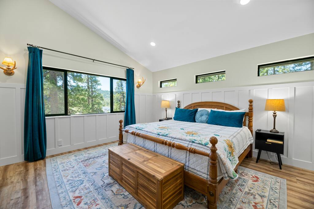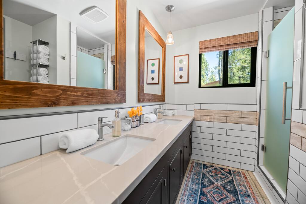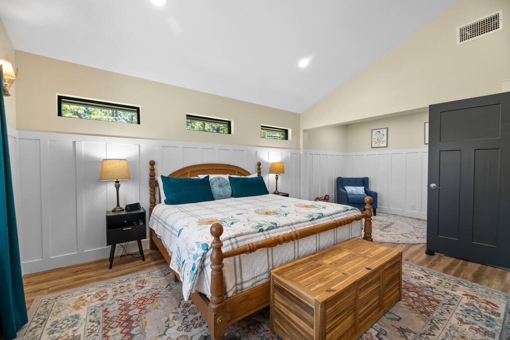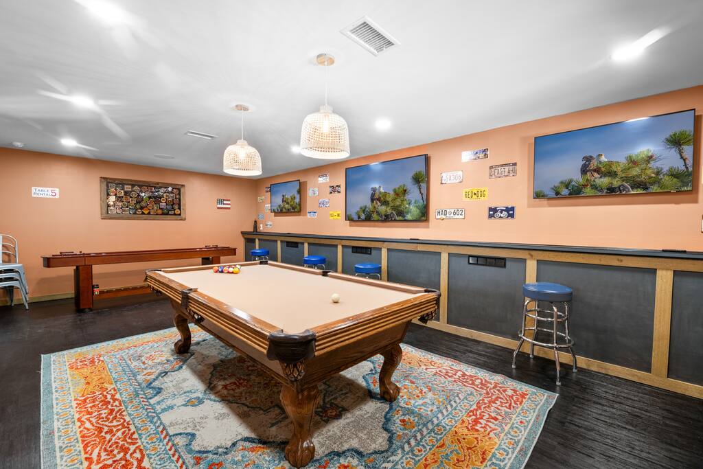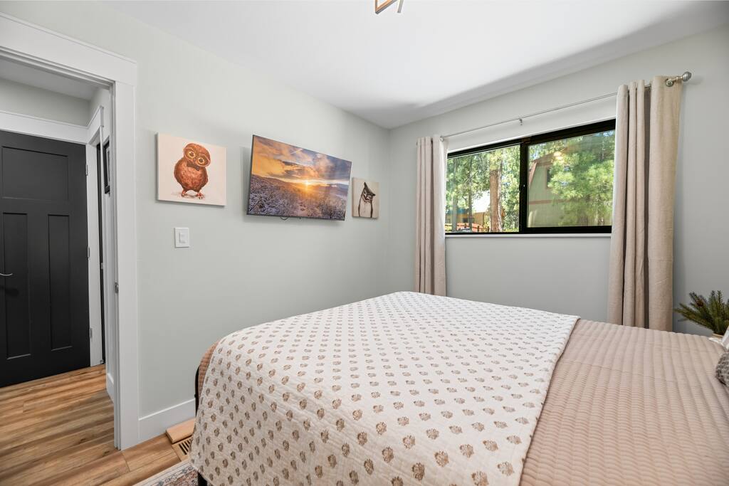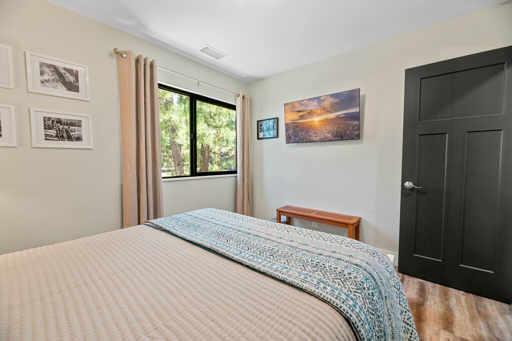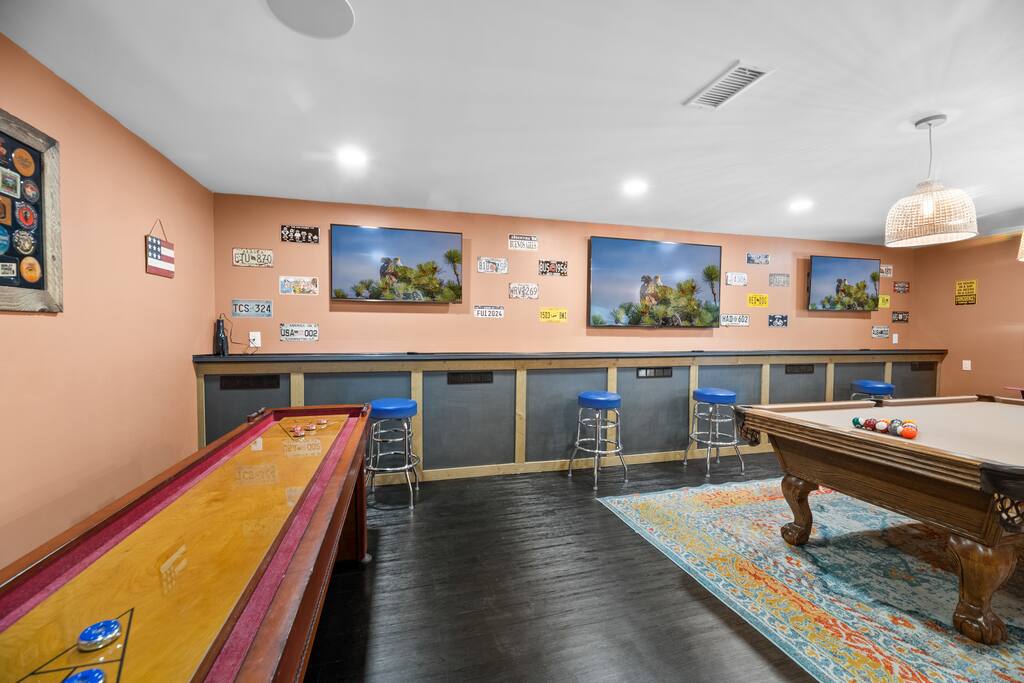 Escape to comfort and adventure at Out Of Bounds Cabin! Tucked into the scenic beauty of Big Bear and directly across the street from the lake, Out Of Bounds Cabin is the perfect destination for making memories and connections. With three spacious levels, six bedrooms, and a generous layout accommodating up to 13 guests, this grand retreat is the ultimate getaway for family gatherings, weekend reunions with friends, or pet-friendly vacations. Whether you're unwinding after a day on the slopes or soaking in the tranquil scenery, you'll find that every detail at Out Of Bounds Cabin is designed to help you feel right at home. Start your mornings with fresh mountain air on the upper deck, sipping coffee as the sun rises over the lake just across the street. The gourmet kitchen makes breakfast a breeze whether you're flipping pancakes on the griddle or preparing a delicious brunch before heading out to hike, bike, or ski. After an active day exploring Big Bear, return to the comfort of plush sofas and gather in the open-concept living room complete with a 65” Samsung TV and Sonos sound bar for movie night or gaming marathons. When it's time for some fun indoors, guests can head to the game room for entertainment galore including shuffleboard, pool table, arcade classics, and even bar seating for spectators. Poker nights come alive in the game area on the main level, or challenge the kids to a ping pong match on the patio. Then, reward your sore muscles with a soak in the private hot tub under the stars, followed by a get-together around the fire pit on the deck. The cabin’s six bedrooms offer a range of cozy options with everything from a private suite with California king beds and ensuite to a bunk room that’s perfect for kids complete with a loveseat and Roku TV. Each room is outfitted with comfortable bedding, hardwood floors, and amenities that blend rustic charm with modern flair. And with fast Wi-Fi, TVs with Roku, an EV charger (Tesla and universal adaptor), and central air conditioner, you'll have all the modern conveniences you need without ever having to leave the mountainside magic. Just minutes from Big Bear Village’s shops and restaurants and central to outdoor adventures all year round, Out Of Bounds Cabin is where luxury meets laid-back mountain living. Book your stay and discover the perfect balance of relaxation, recreation, and reconnection! ---------- ROOM DESCRIPTIONS * Living Room: The open-concept living room is located on the main level. It has 2 big reclining sofas, 2 plush chairs, DVD player, and access to the upper deck. The 65” Samsung TV has Roku, a Sonos sound system bar, and an HDMI game port (for use if you bring your own video game console). * Kitchen: The open-concept kitchen is located on the main level. It has a refrigerator, a dishwasher, a range, a microwave, and a toaster oven. Amenities include a crockpot, a mini crockpot, a waffle maker, a griddle, coffee machine, and assorted cooking necessities. This room has access to the upper deck as well as a sliding security gate on one side of the kitchen for small children and pets. * Dining Area: The open-concept dining area is located on the main level and has a dining table near the kitchen that can seat 12 guests. There is also a bar area with a mini-fridge. * Game Area: There is a game area on the main level near the living room. It has a convertible game table for poker and checkers, a 35” TV, and a wood burning fireplace. In addition to this game area, there is a dedicated game room located on the lower level. * Game Room: The dedicated game room is located on the lower level and is accessible through the main patio. It has a shuffleboard table, a pool table, bar seating for guests, an arcade console table with classic video games, a dart board, and 3 TVs (1 is 65” & 2 are 43”). * Laundry Area: The laundry area is located on the main floor near the kitchen. The washer and dryer are available to guest use for a small fee, thru an app. The fee is $5.35 for 24 hours unlimited use. * Garage: The garage is located on the main level. It has 1 EV charger (Tesla & universal adapter) available for guests to use for a small fee thru an app. ---------- OUTSIDE AREA DESCRIPTIONS * Upper Deck: The wraparound deck has a propane barbecue grill, outdoor dining for 4 guests, a Tommy Bahama cooler, outdoor seating, a propane fire pit, and gorgeous views. This deck is accessible through the main level of the cabin. * Patio: The patio has 2 hanging chairs, additional outdoor seating, a ping pong table, child size basketball set, a grassy recreation area, access to the game room, and a four person hot tub. The lower yard area is also fully fenced for children and pets. * Lower Yard: The lower yard is a large backyard area that is fully fenced and located under the patio area. ---------- BEDROOMS: Out Of Bounds Cabin has 6 bedrooms total. There are 2 bedrooms located on the main level and 4 bedrooms located on the upper level. * Bedroom #1: This lower level bedroom is a primary bedroom that has 1 California king bed, hardwood floor, a 45” Samsung TV, and a walk-in closet. * Bedroom #2: This lower level bedroom has 1 queen bed, hardwood floor, a 45” Samsung TV, and a closet. * Bedroom #3 (Bunk Bed Room): This upper level bedroom has 2 bunk beds with a total of 5 twin beds. The first bunk bed has 2 stacked twin beds. The second bunk bed has 3 stacked twin beds. It also has a sitting area with a loveseat, hardwood floor, a Sonos sound system, and a 45” Samsung TV with Roku. * Bedroom #4: This upper level bedroom has 1 queen bed, a 43” Samsung TV with Roku, hardwood floor, and a closet. * Bedroom #5: This upper level bedroom has 1 queen bed, a 43” Samsung TV with Roku, hardwood floor, and a closet. * Bedroom #6: This upper level primary suite has 1 California king bed, hardwood floor, a 65” Samsung TV with sound bar, an ensuite bathroom (Bathroom #3), and a sitting area with a desk. ---------- BATHROOM