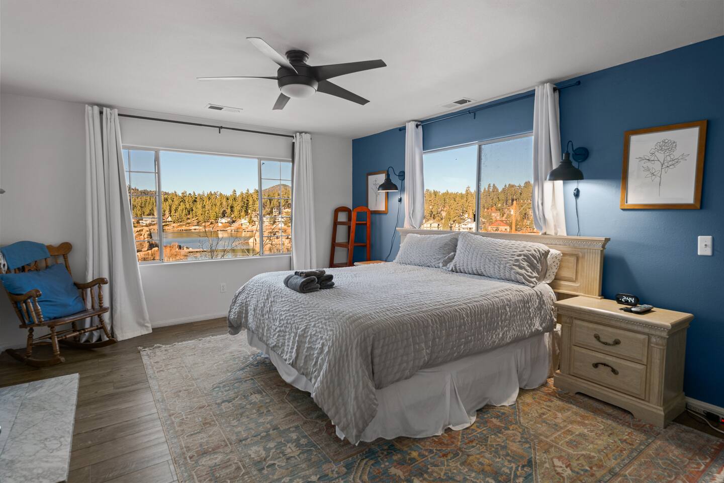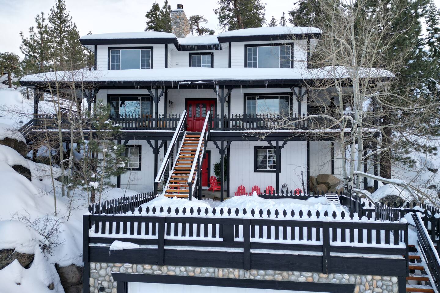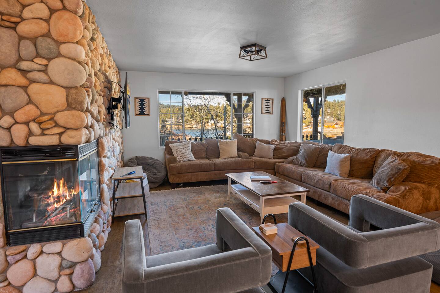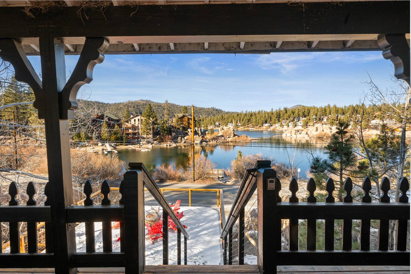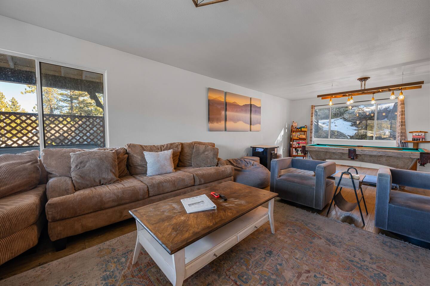 This spectacular 2,400+ sq. ft. cabin in Boulder Bay has 2 levels, 4 bedrooms, 4 bathrooms, & a private dock on Big Bear Lake. Big Bear local ordinance 99.300 limits maximum occupancy to 12 people & 4 parked cars for Boulder Bay Farmhouse. Boulder Bay Farmhouse also has 2 patios, 2 gas fireplaces, access to the National Forest, & a hot tub. The kitchen is fully-stocked and all bedding & linens are provided by our professional cleaning crew. This beautiful cabin is the perfect getaway for family, friends, & even pets! The cabin’s main entrance is accessible via outdoor stairs, so guests should be comfortable using them. Amenities include free Starlink high speed Wi-Fi, HD TVs with streaming services, central air conditioning, a ping pong & pool table, a vintage arcade console, spectacular lake views, a Powerwall whole house battery, a high speed NEMA 14-50 amp outlet EV car charger for Teslas (must bring your own cable & adapter), and a dedicated kids bunk bed room. For your convenience, this cabin is in the Boulder Bay neighborhood of Big Bear & perfectly located just minutes from tons of activities - hiking, golfing, skiing, biking, & more. This retreat is 6.2 miles from Bear Mountain, 4.5 miles from Snow Summit, and a quick 5 minute drive to Big Bear Village downtown shops & restaurants. *Note- The cabin is conveniently located on a main street, making it easy to get around. However, there is some traffic noise, especially during peak hours. ---------- ROOM DESCRIPTIONS * LIVING ROOM: The living room is located on the lower level & features big windows that offer beautiful lake views. This cozy living room has a large sectional sofa, ample seating, a gas fireplace, a TV, an arcade console with vintage video games, a pool table that can convert into a ping pong table, & shelves stocked with various board games. * DINING ROOM & KITCHEN: The fully-stocked & open-concept kitchen is located on the lower level & features breathtaking views of the lake. It has stainless steel appliances including a stove, a refrigerator, a microwave, & a dishwasher. The kitchen also has a toaster, a kettle, a farmhouse sink, and a Keurig coffee maker as well as other cooking and serving essentials. There is a breakfast bar with seating for 4 people in addition to two available dining tables. The casual dining table in the kitchen has seating for 6 people while the adjacent formal dining room has a table that seats 6 people. * BEDROOM #1: This primary bedroom is a 220 sq. ft. suite located on the lower level. It has a king bed, wood floor, a private entrance, seating, a mini fridge, ceiling fan, & an ensuite full bathroom with a walk-in shower (Bathroom #1). Note- The Master Suite is a private retreat, separate from the main living area. Perfect for those who enjoy extra privacy! The suite is secluded with no indoor access between the suite and the rest of the cabin. * BEDROOM #2: This primary bedroom is located on the upper level. It has a king bed, wood floor, a gas fireplace, gorgeous views of the lake, TV, ceiling fan, & an ensuite bathroom (Bathroom #2). * BEDROOM #3: This bedroom is located on the upper level. It has a king bed, wood floor, ceiling fan, & lovely views of the lake. * BEDROOM #4 (Kids Room): This bedroom has 3 bunk beds with a total of 7 total twin beds, wood floor, & ceiling fan. Bunk bed #1 has 2 twin beds. Bunk bed #2 has 2 twin beds. Bunk bed #3 has 3 twin beds. * BATHROOM #1: This full ensuite bathroom to Bedroom #1 is located on the lower level & has a walk-in shower. * BATHROOM #2: This full ensuite bathroom to Bedroom #2 is located on the upper level. It has a walk-in shower with dual shower heads & dual sinks. * BATHROOM #3: This full bathroom is located on the upper level that has a bathtub & a walk-in shower. * BATHROOM #4: This full bathroom is located on the lower level through the laundry room & has a walk-in shower. * LAUNDRY ROOM: There is a dedicated laundry room located on the lower level adjacent to the kitchen that has a full size washer & dryer for your convenience. * LOWER PATIO: With the Boulder Bay area of Big Bear Lake located directly across the street from this cabin, the large elevated patio located on the lower level has gorgeous panoramic views of the lake, outdoor seating with Adirondack chairs, & a gas fire pit (Fire pit is not available during winter months). It is the perfect spot for sunset views, stargazing, & gathering with family and friends. * UPPER PATIO: The upper patio has outdoor seating including rocking chairs, spectacular lake views, an outdoor dining table with seating for 6 people, a Weber gas grill, and a private hot tub. *DRIVEWAYS: This cabin has 2 driveways. The main driveway is located in the front of the cabin and fits 2 cars. The additional driveway is located on the side of the cabin and can fit 2 cars when there is no snow. During snowy weather, this additional driveway can only accommodate 1 vehicle. * DOCK: Boulder Bay Farmhouse is located next to the Boulder Bay area of the lake. This cabin has a private dock that is directly across the street. The dock is the perfect spot for fishing, kayaking, & enjoying the natural beauty of Big Bear Lake. Please know that you do need to cross Big Bear Boulevard to access the private dock across the street (so look both ways!). * NATIONAL FOREST: The San Bernardino National Forest is located directly behind this cabin & offers endless hiking, bouldering, and other outdoor recreation opportunities for guests.