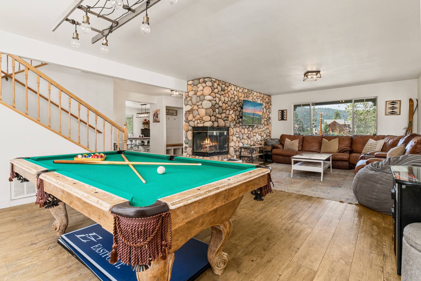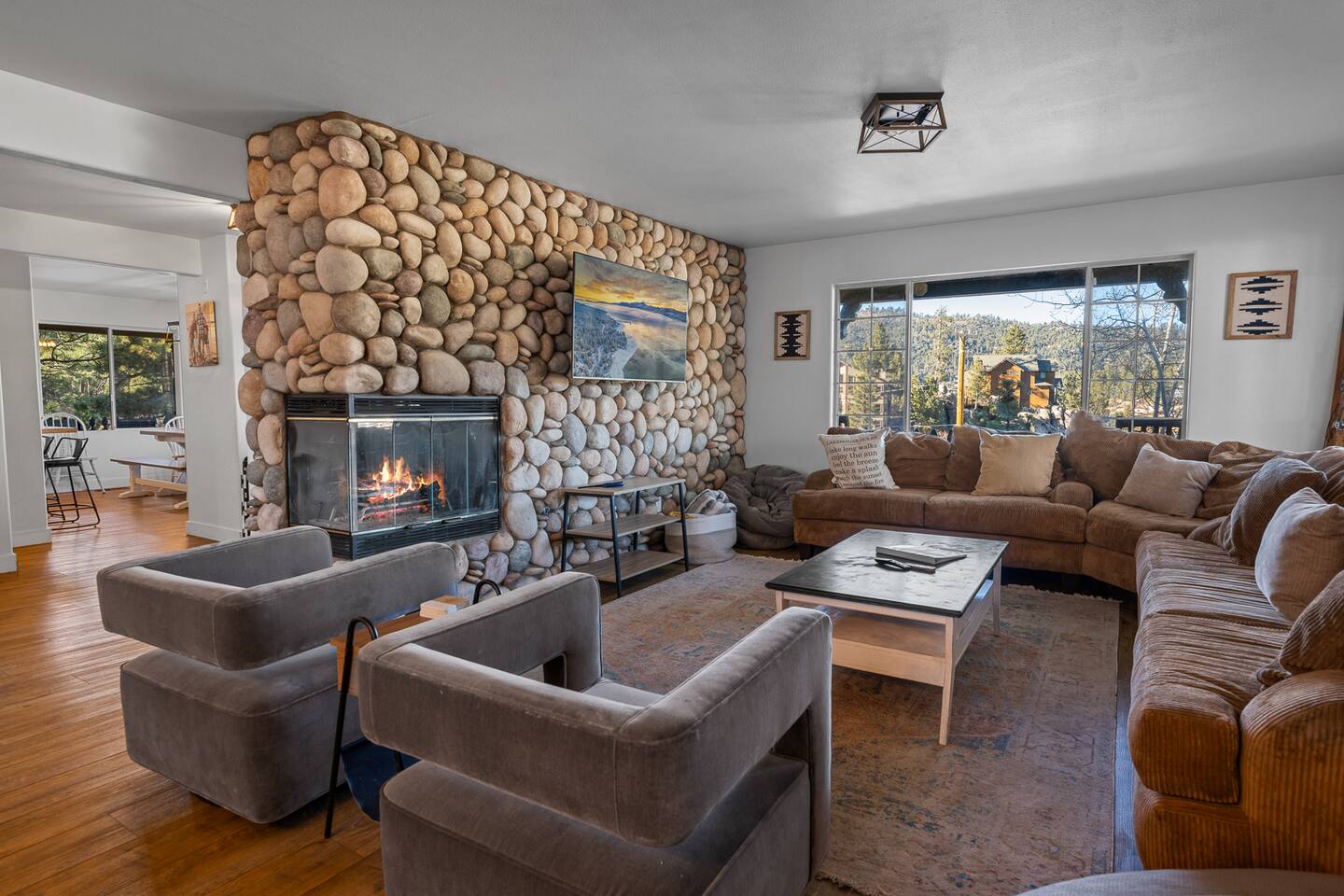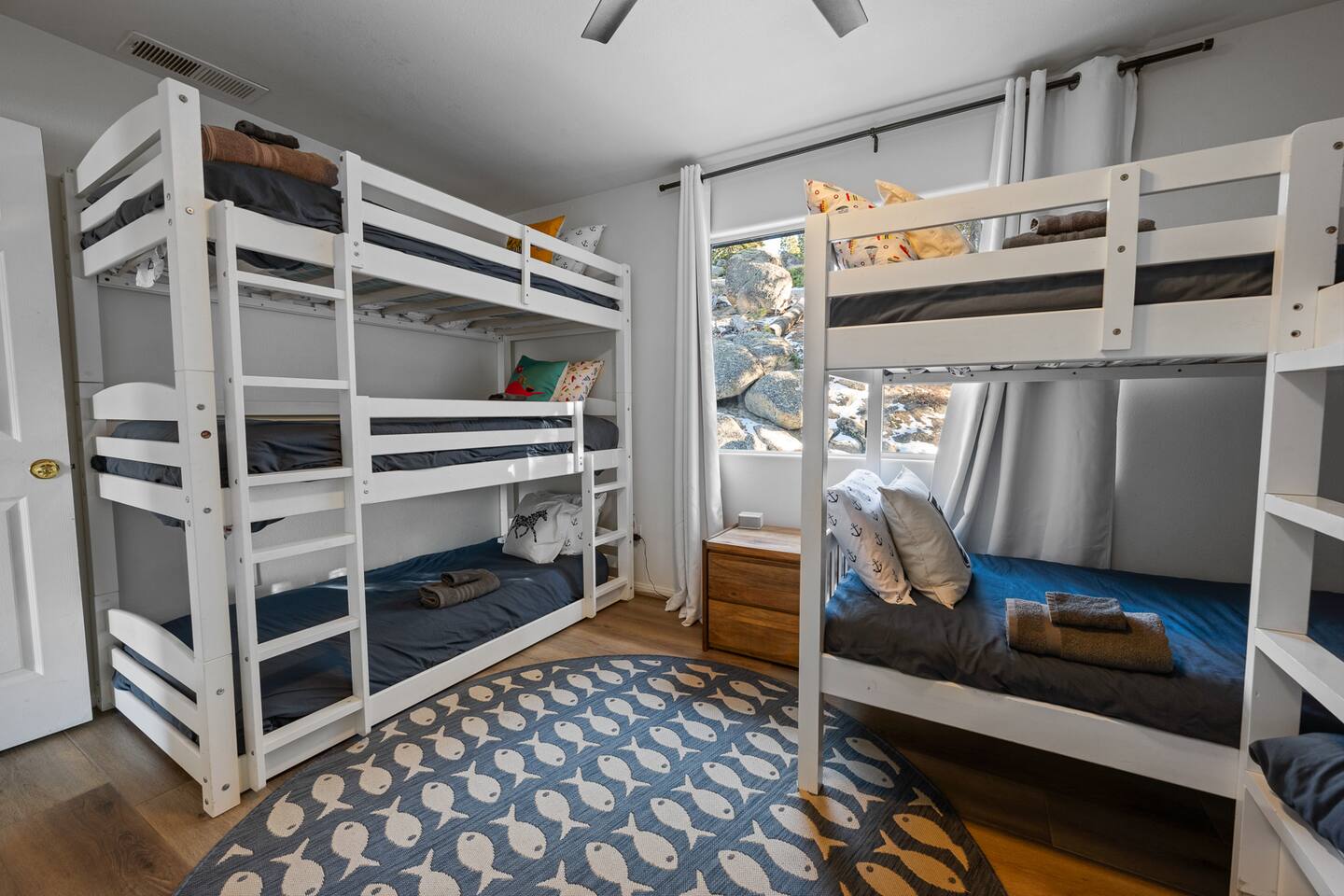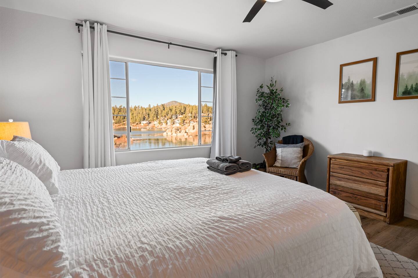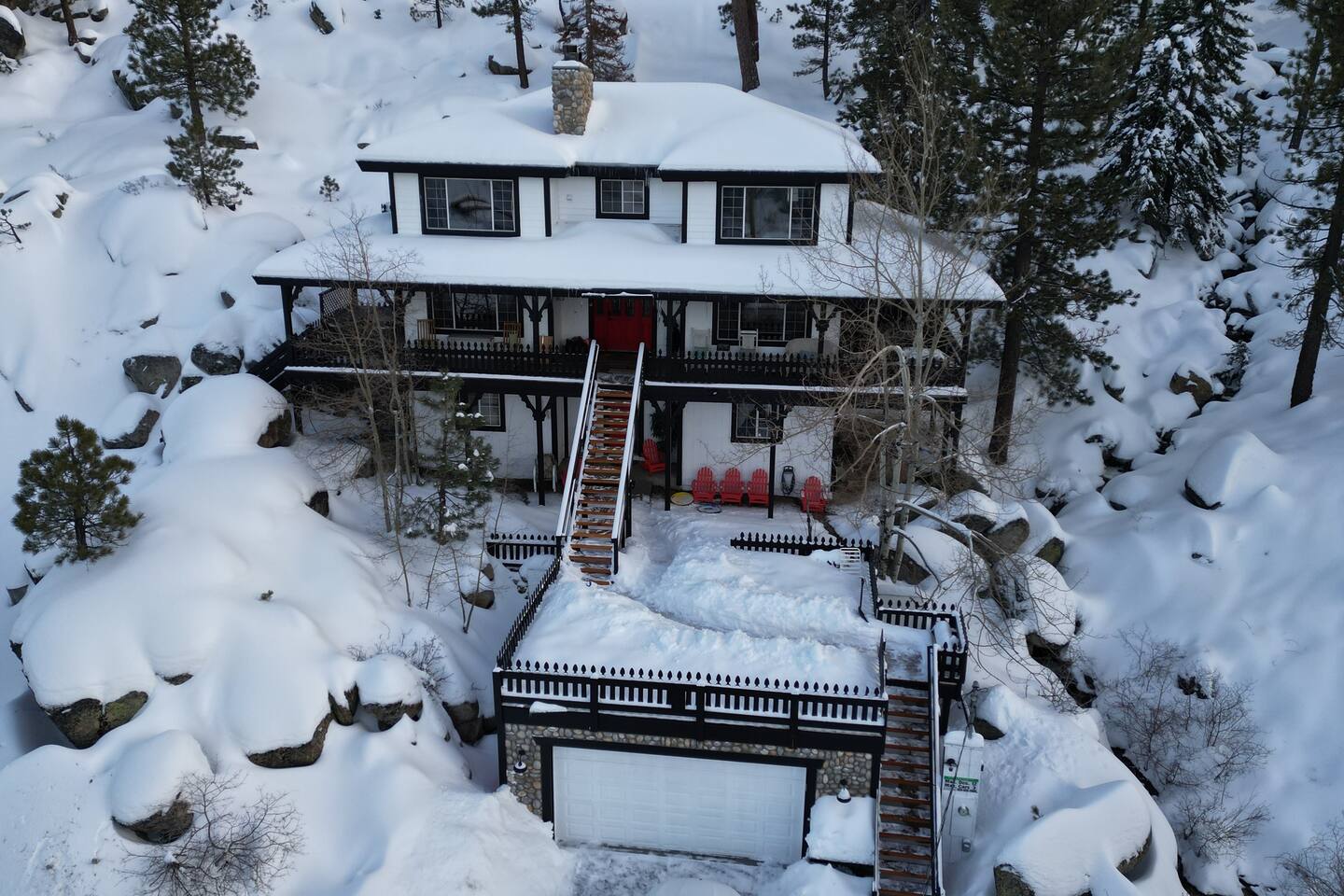 This spectacular 2,400+ sq. ft. cabin in Boulder Bay has 2 levels, 4 bedrooms, 4 bathrooms, & a private dock on Big Bear Lake. Big Bear local ordinance 99.300 limits maximum occupancy to 12 people & 4 parked cars for Boulder Bay Farmhouse. Boulder Bay Farmhouse also has 2 patios, 2 gas fireplaces, access to the National Forest, & a hot tub. The kitchen is fully-stocked and all bedding & linens are provided by our professional cleaning crew. This beautiful cabin is the perfect getaway for family, friends, & even pets! The cabin’s main entrance is accessible via outdoor stairs, so guests should be comfortable using them. Amenities include free Starlink high speed Wi-Fi, HD TVs with streaming services, central air conditioning, a ping pong & pool table, a vintage arcade console, spectacular lake views, a Powerwall whole house battery, a high speed NEMA 14-50 amp outlet EV car charger for Teslas (must bring your own cable & adapter), and a dedicated kids bunk bed room. For your convenience, this cabin is in the Boulder Bay neighborhood of Big Bear & perfectly located just minutes from tons of activities - hiking, golfing, skiing, biking, & more. This retreat is 6.2 miles from Bear Mountain, 4.5 miles from Snow Summit, and a quick 5 minute drive to Big Bear Village downtown shops & restaurants. *Note- The cabin is conveniently located on a main street, making it easy to get around. However, there is some traffic noise, especially during peak hours. ---------- ROOM DESCRIPTIONS * LIVING ROOM: The living room is located on the lower level & features big windows that offer beautiful lake views. This cozy living room has a large sectional sofa, ample seating, a gas fireplace, a TV, an arcade console with vintage video games, a pool table that can convert into a ping pong table, & shelves stocked with various board games. * DINING ROOM & KITCHEN: The fully-stocked & open-concept kitchen is located on the lower level & features breathtaking views of the lake. It has stainless steel appliances including a stove, a refrigerator, a microwave, & a dishwasher. The kitchen also has a toaster, a kettle, a farmhouse sink, and a Keurig coffee maker as well as other cooking and serving essentials. There is a breakfast bar with seating for 4 people in addition to two available dining tables. The casual dining table in the kitchen has seating for 6 people while the adjacent formal dining room has a table that seats 6 people. * BEDROOM #1: This primary bedroom is a 220 sq. ft. suite located on the lower level. It has a king bed, wood floor, a private entrance, seating, a mini fridge, ceiling fan, & an ensuite full bathroom with a walk-in shower (Bathroom #1). Note- The Master Suite is a private retreat, separate from the main living area. Perfect for those who enjoy extra privacy! The suite is secluded with no indoor access between the suite and the rest of the cabin. * BEDROOM #2: This primary bedroom is located on the upper level. It has a king bed, wood floor, a gas fireplace, gorgeous views of the lake, TV, ceiling fan, & an ensuite bathroom (Bathroom #2). * BEDROOM #3: This bedroom is located on the upper level. It has a king bed, wood floor, ceiling fan, & lovely views of the lake. * BEDROOM #4 (Kids Room): This bedroom has 3 bunk beds with a total of 7 total twin beds, wood floor, & ceiling fan. Bunk bed #1 has 2 twin beds. Bunk bed #2 has 2 twin beds. Bunk bed #3 has 3 twin beds. * BATHROOM #1: This full ensuite bathroom to Bedroom #1 is located on the lower level & has a walk-in shower. * BATHROOM #2: This full ensuite bathroom to Bedroom #2 is located on the upper level. It has a walk-in shower with dual shower heads & dual sinks. * BATHROOM #3: This full bathroom is located on the upper level that has a bathtub & a walk-in shower. * BATHROOM #4: This full bathroom is located on the lower level through the laundry room & has a walk-in shower. * LAUNDRY ROOM: There is a dedicated laundry room located on the lower level adjacent to the kitchen that has a full size washer & dryer for your convenience. * LOWER PATIO: With the Boulder Bay area of Big Bear Lake located directly across the street from this cabin, the large elevated patio located on the lower level has gorgeous panoramic views of the lake, outdoor seating with Adirondack chairs, & a gas fire pit (Fire pit is not available during winter months). It is the perfect spot for sunset views, stargazing, & gathering with family and friends. * UPPER PATIO: The upper patio has outdoor seating including rocking chairs, spectacular lake views, an outdoor dining table with seating for 6 people, a Weber gas grill, and a private hot tub. *DRIVEWAYS: This cabin has 2 driveways. The main driveway is located in the front of the cabin and fits 2 cars. The additional driveway is located on the side of the cabin and can fit 2 cars when there is no snow. During snowy weather, this additional driveway can only accommodate 1 vehicle. * DOCK: Boulder Bay Farmhouse is located next to the Boulder Bay area of the lake. This cabin has a private dock that is directly across the street. The dock is the perfect spot for fishing, kayaking, & enjoying the natural beauty of Big Bear Lake. Please know that you do need to cross Big Bear Boulevard to access the private dock across the street (so look both ways!). * NATIONAL FOREST: The San Bernardino National Forest is located directly behind this cabin & offers endless hiking, bouldering, and other outdoor recreation opportunities for guests.
