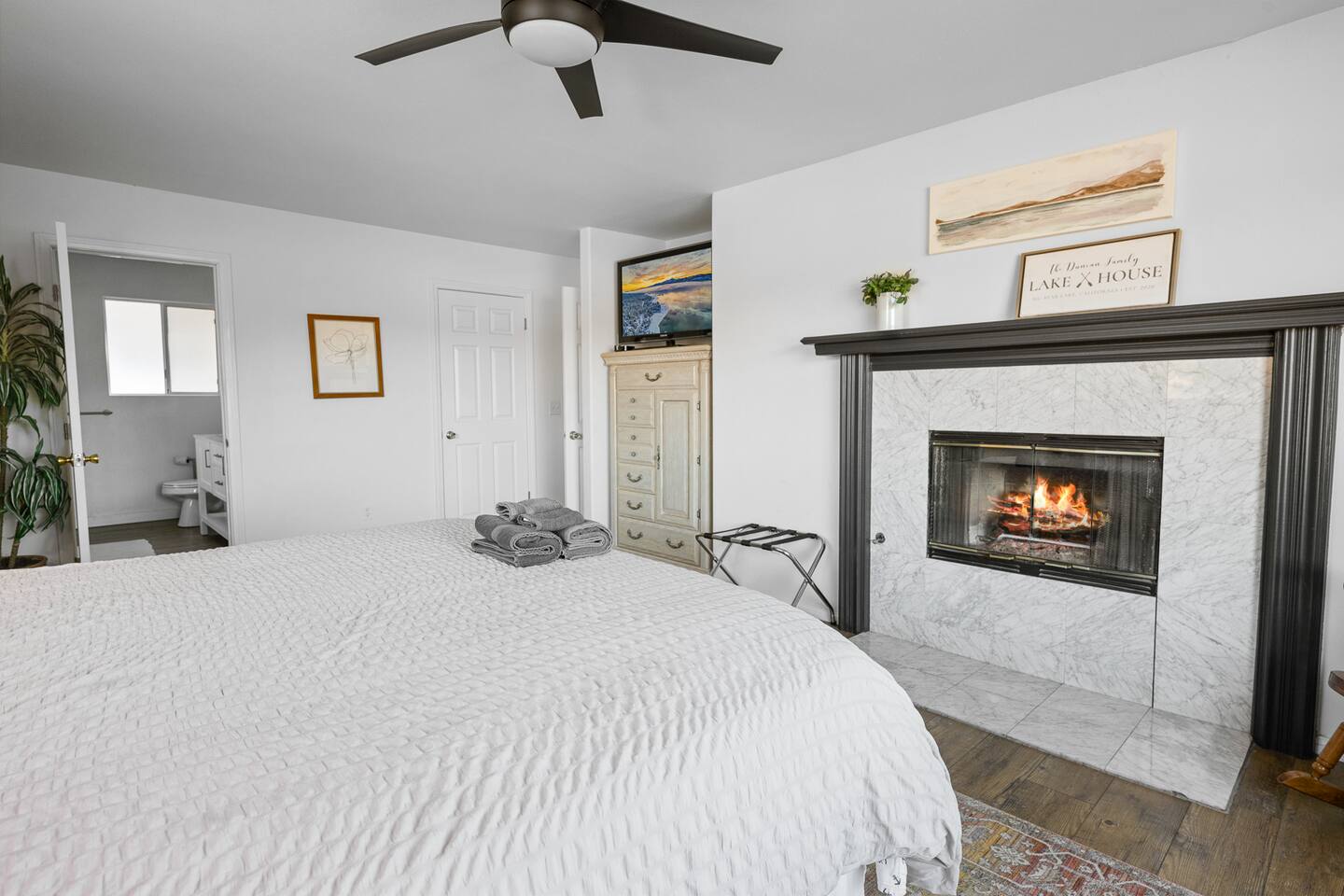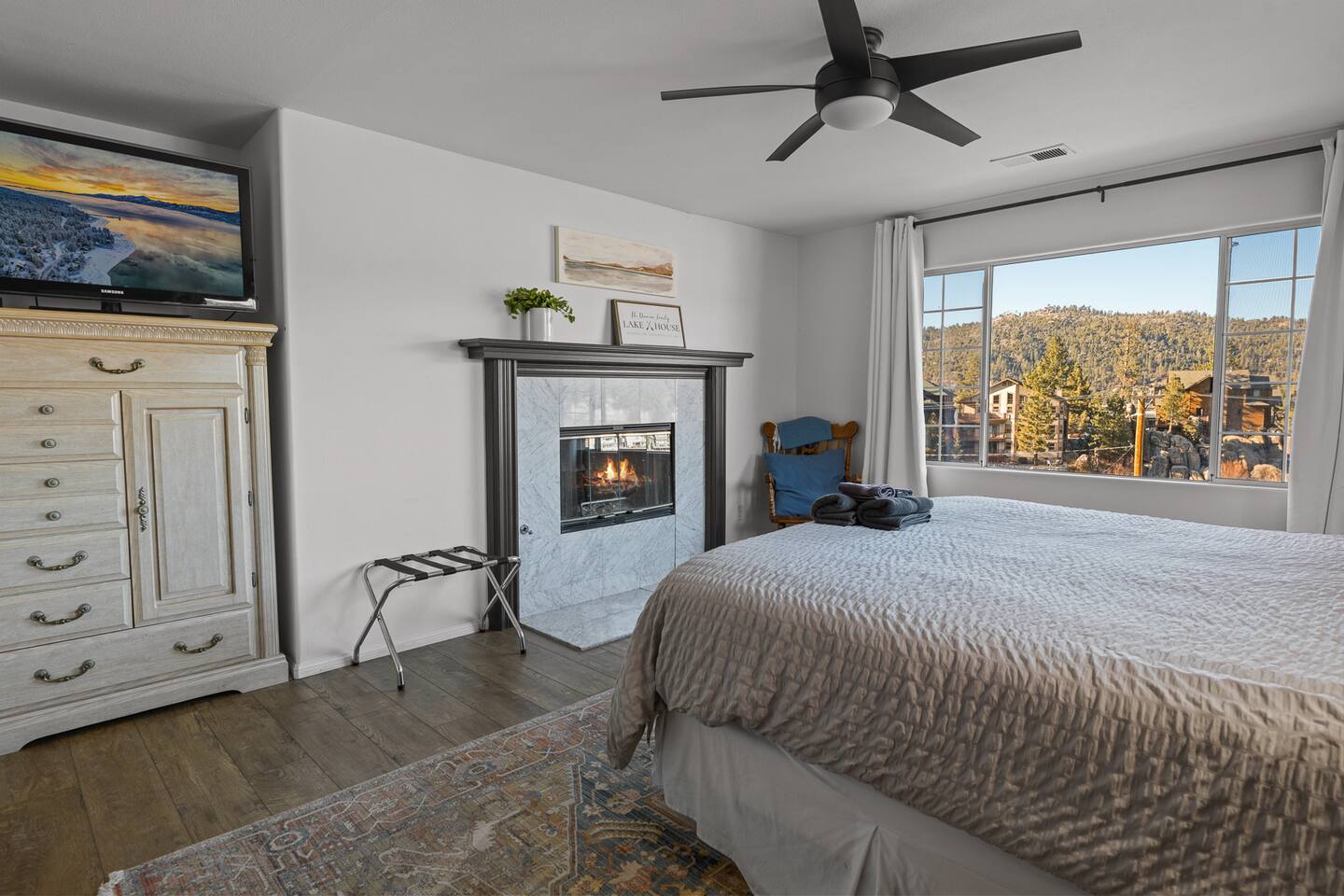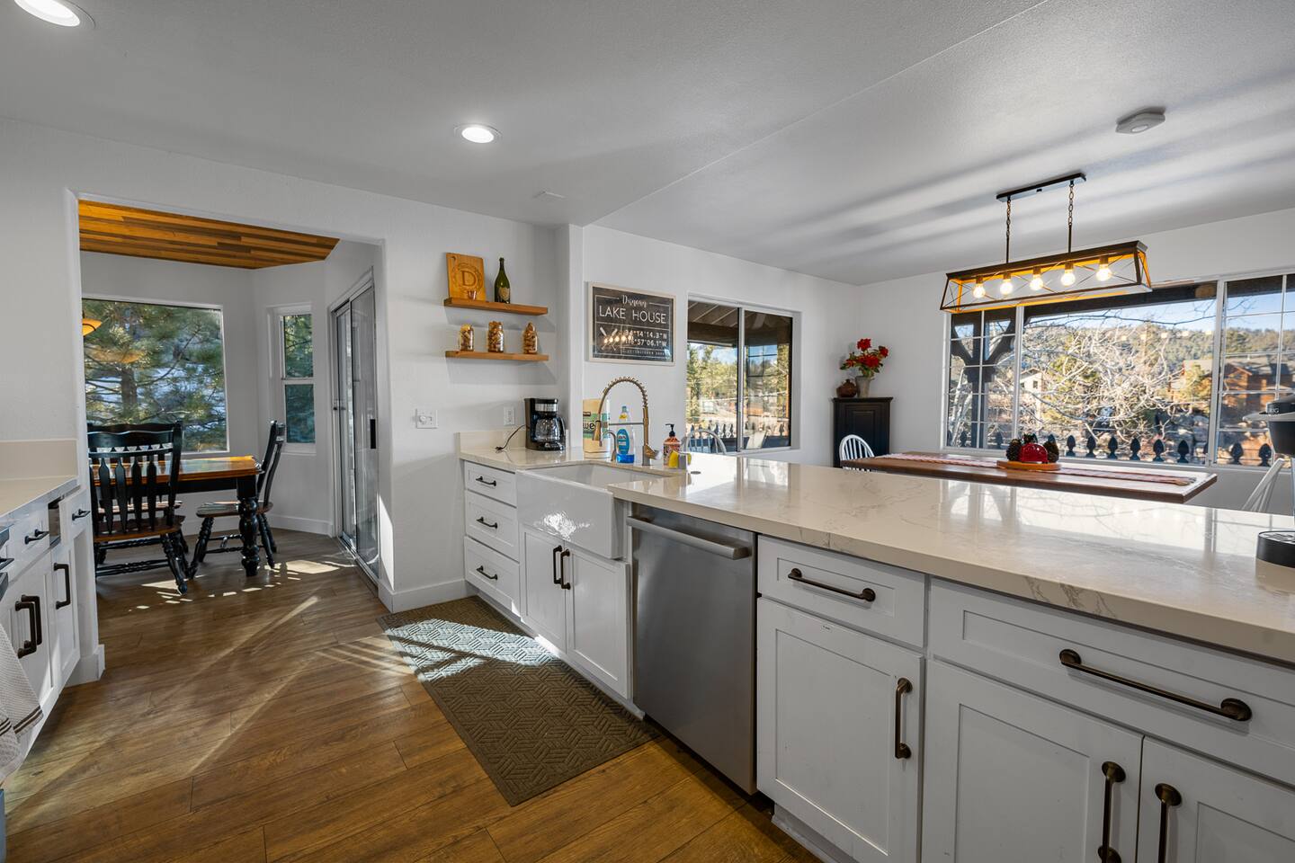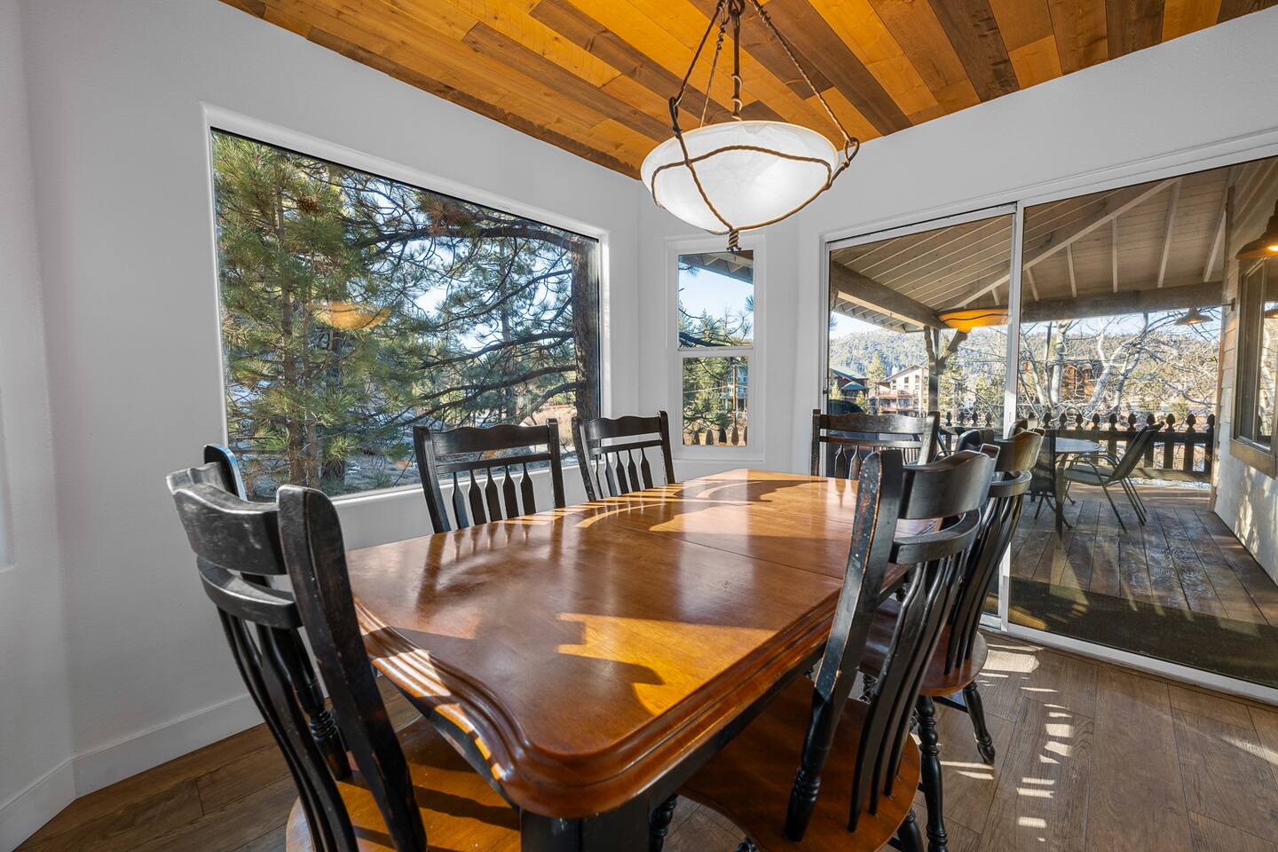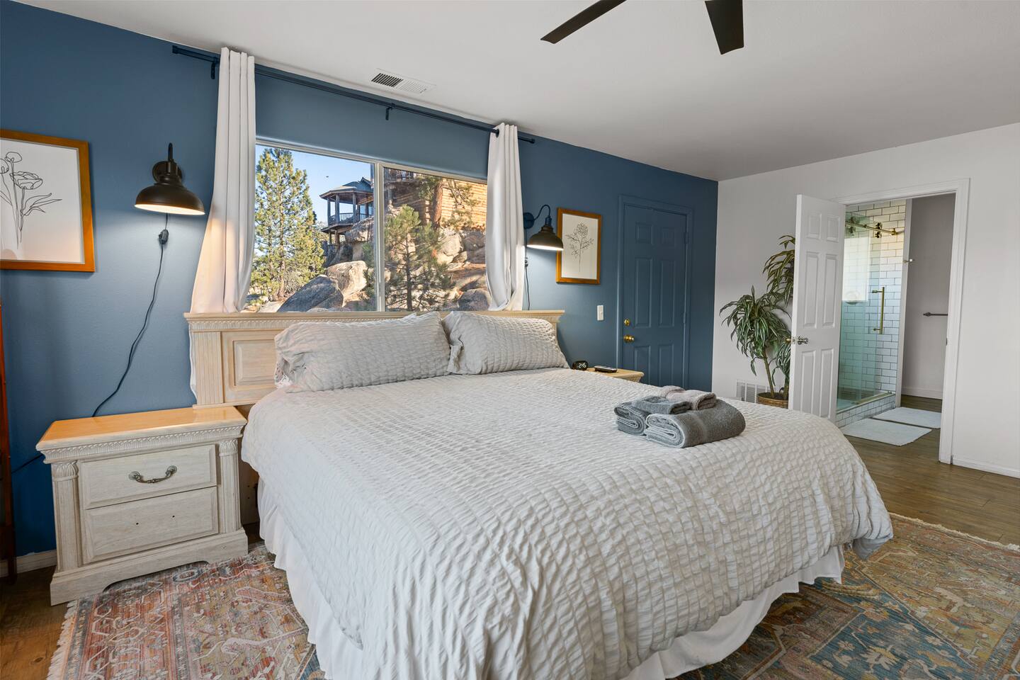 This spectacular 2,400+ sq. ft. cabin in Boulder Bay has 2 levels, 4 bedrooms, 4 bathrooms, & a private dock on Big Bear Lake. Big Bear local ordinance 99.300 limits maximum occupancy to 12 people & 4 parked cars for Boulder Bay Farmhouse. Boulder Bay Farmhouse also has 2 patios, 2 gas fireplaces, access to the National Forest, & a hot tub. The kitchen is fully-stocked and all bedding & linens are provided by our professional cleaning crew. This beautiful cabin is the perfect getaway for family, friends, & even pets! The cabin’s main entrance is accessible via outdoor stairs, so guests should be comfortable using them. Amenities include free Starlink high speed Wi-Fi, HD TVs with streaming services, central air conditioning, a ping pong & pool table, a vintage arcade console, spectacular lake views, a Powerwall whole house battery, a high speed NEMA 14-50 amp outlet EV car charger for Teslas (must bring your own cable & adapter), and a dedicated kids bunk bed room. For your convenience, this cabin is in the Boulder Bay neighborhood of Big Bear & perfectly located just minutes from tons of activities - hiking, golfing, skiing, biking, & more. This retreat is 6.2 miles from Bear Mountain, 4.5 miles from Snow Summit, and a quick 5 minute drive to Big Bear Village downtown shops & restaurants. *Note- The cabin is conveniently located on a main street, making it easy to get around. However, there is some traffic noise, especially during peak hours. ---------- ROOM DESCRIPTIONS * LIVING ROOM: The living room is located on the lower level & features big windows that offer beautiful lake views. This cozy living room has a large sectional sofa, ample seating, a gas fireplace, a TV, an arcade console with vintage video games, a pool table that can convert into a ping pong table, & shelves stocked with various board games. * DINING ROOM & KITCHEN: The fully-stocked & open-concept kitchen is located on the lower level & features breathtaking views of the lake. It has stainless steel appliances including a stove, a refrigerator, a microwave, & a dishwasher. The kitchen also has a toaster, a kettle, a farmhouse sink, and a Keurig coffee maker as well as other cooking and serving essentials. There is a breakfast bar with seating for 4 people in addition to two available dining tables. The casual dining table in the kitchen has seating for 6 people while the adjacent formal dining room has a table that seats 6 people. * BEDROOM #1: This primary bedroom is a 220 sq. ft. suite located on the lower level. It has a king bed, wood floor, a private entrance, seating, a mini fridge, ceiling fan, & an ensuite full bathroom with a walk-in shower (Bathroom #1). Note- The Master Suite is a private retreat, separate from the main living area. Perfect for those who enjoy extra privacy! The suite is secluded with no indoor access between the suite and the rest of the cabin. * BEDROOM #2: This primary bedroom is located on the upper level. It has a king bed, wood floor, a gas fireplace, gorgeous views of the lake, TV, ceiling fan, & an ensuite bathroom (Bathroom #2). * BEDROOM #3: This bedroom is located on the upper level. It has a king bed, wood floor, ceiling fan, & lovely views of the lake. * BEDROOM #4 (Kids Room): This bedroom has 3 bunk beds with a total of 7 total twin beds, wood floor, & ceiling fan. Bunk bed #1 has 2 twin beds. Bunk bed #2 has 2 twin beds. Bunk bed #3 has 3 twin beds. * BATHROOM #1: This full ensuite bathroom to Bedroom #1 is located on the lower level & has a walk-in shower. * BATHROOM #2: This full ensuite bathroom to Bedroom #2 is located on the upper level. It has a walk-in shower with dual shower heads & dual sinks. * BATHROOM #3: This full bathroom is located on the upper level that has a bathtub & a walk-in shower. * BATHROOM #4: This full bathroom is located on the lower level through the laundry room & has a walk-in shower. * LAUNDRY ROOM: There is a dedicated laundry room located on the lower level adjacent to the kitchen that has a full size washer & dryer for your convenience. * LOWER PATIO: With the Boulder Bay area of Big Bear Lake located directly across the street from this cabin, the large elevated patio located on the lower level has gorgeous panoramic views of the lake, outdoor seating with Adirondack chairs, & a gas fire pit (Fire pit is not available during winter months). It is the perfect spot for sunset views, stargazing, & gathering with family and friends. * UPPER PATIO: The upper patio has outdoor seating including rocking chairs, spectacular lake views, an outdoor dining table with seating for 6 people, a Weber gas grill, and a private hot tub. *DRIVEWAYS: This cabin has 2 driveways. The main driveway is located in the front of the cabin and fits 2 cars. The additional driveway is located on the side of the cabin and can fit 2 cars when there is no snow. During snowy weather, this additional driveway can only accommodate 1 vehicle. * DOCK: Boulder Bay Farmhouse is located next to the Boulder Bay area of the lake. This cabin has a private dock that is directly across the street. The dock is the perfect spot for fishing, kayaking, & enjoying the natural beauty of Big Bear Lake. Please know that you do need to cross Big Bear Boulevard to access the private dock across the street (so look both ways!). * NATIONAL FOREST: The San Bernardino National Forest is located directly behind this cabin & offers endless hiking, bouldering, and other outdoor recreation opportunities for guests.