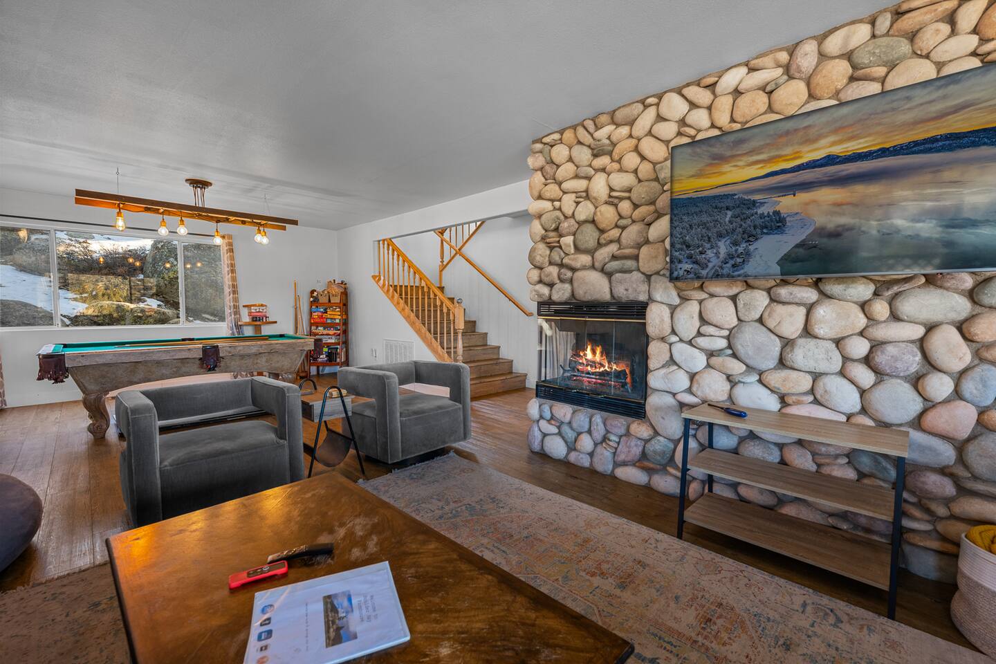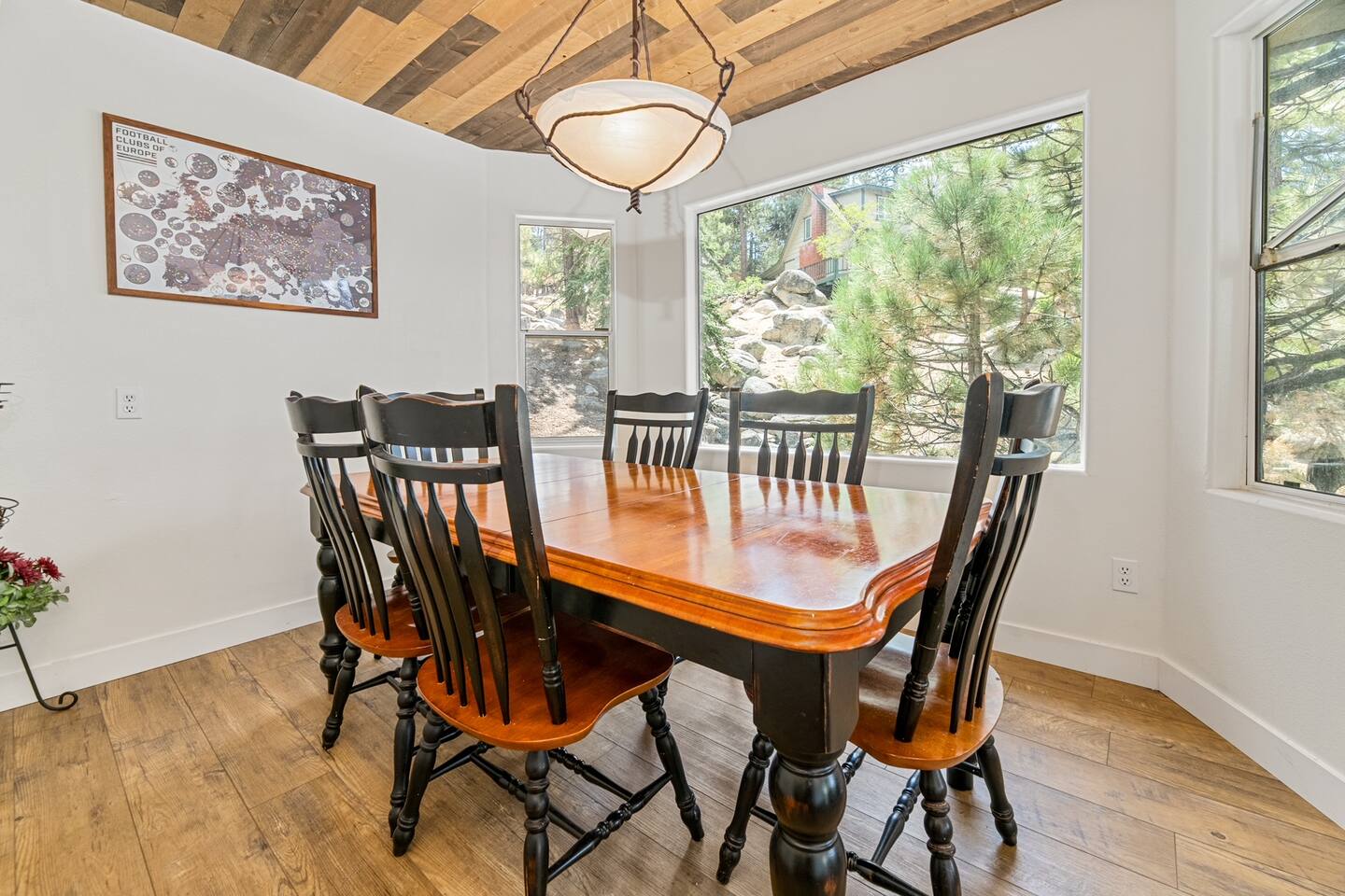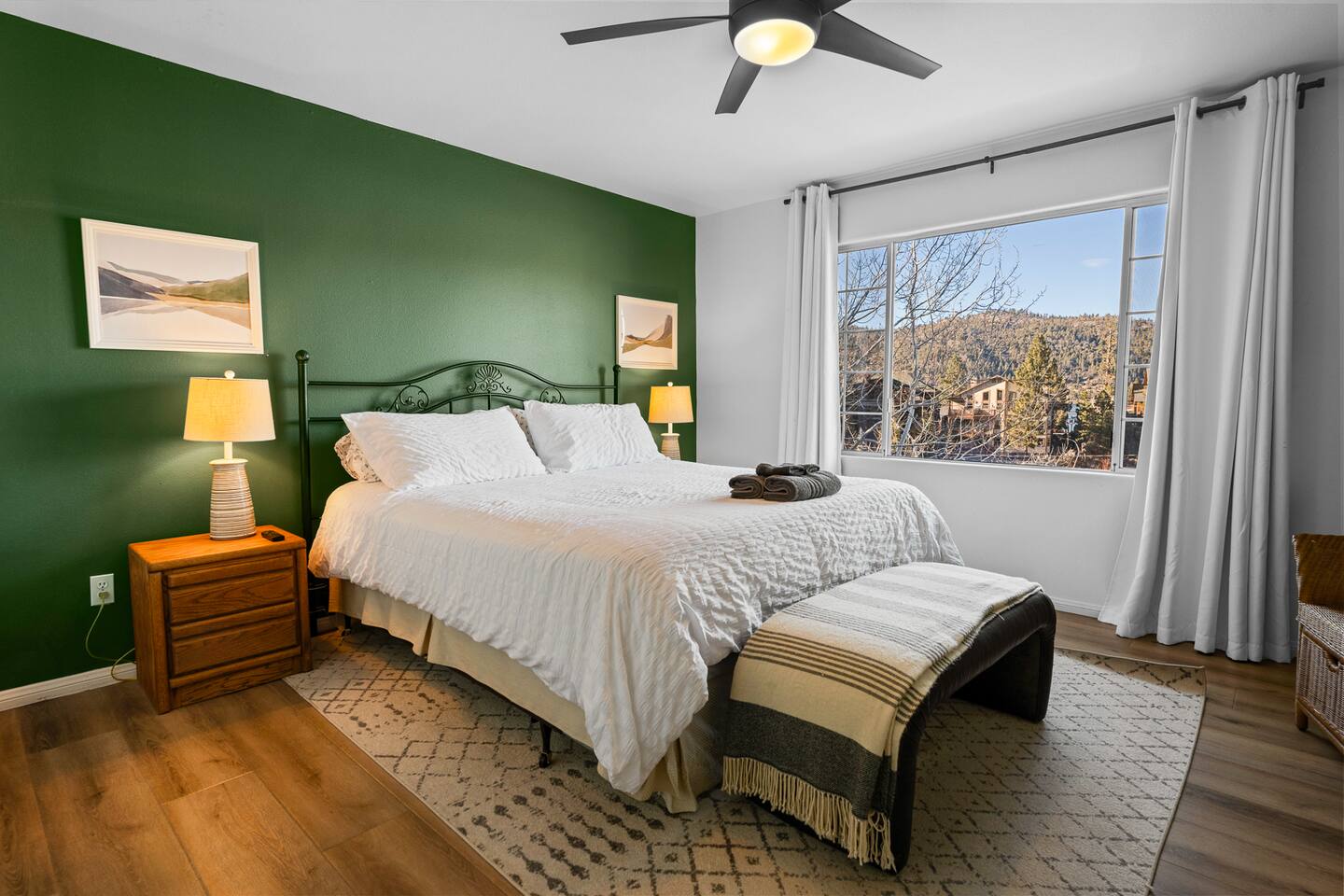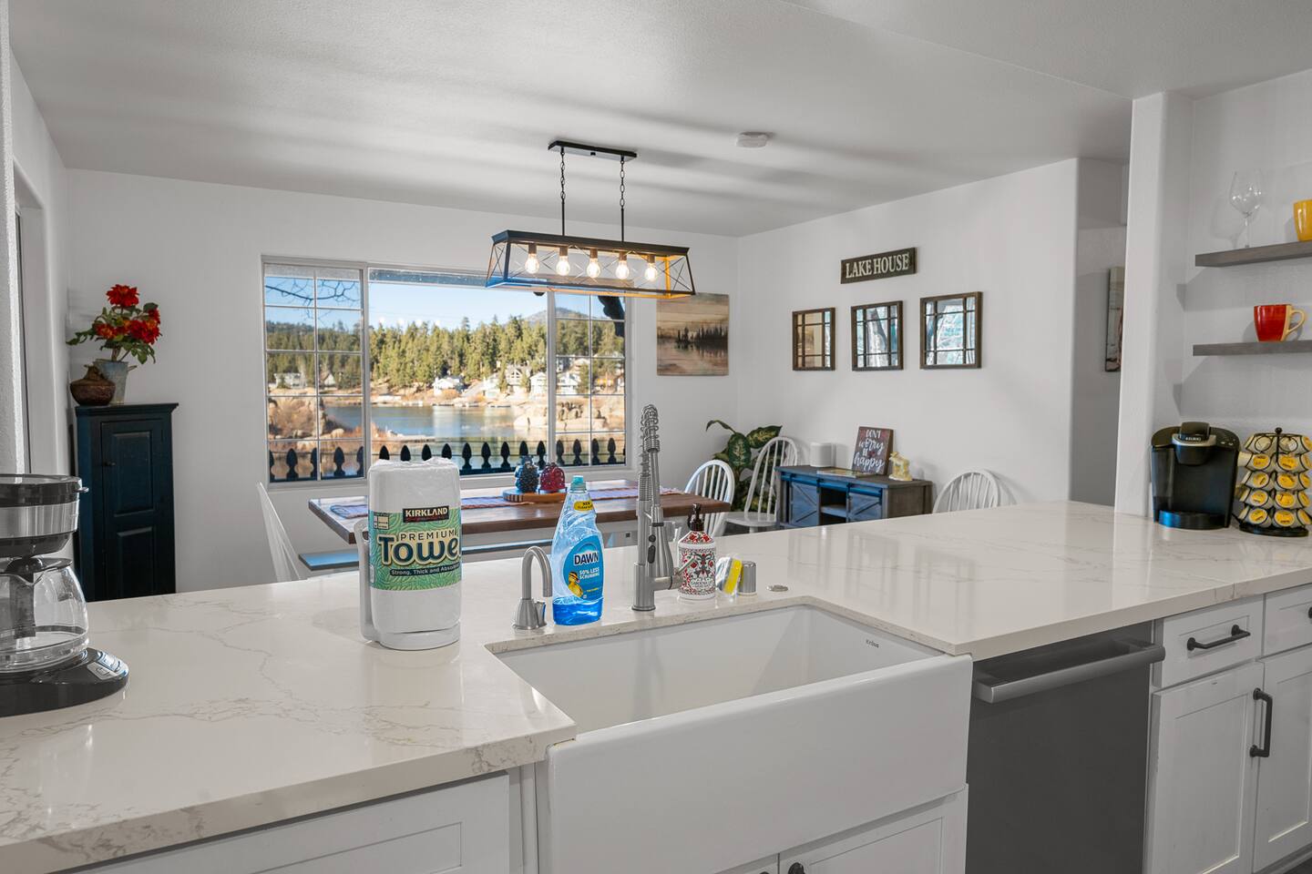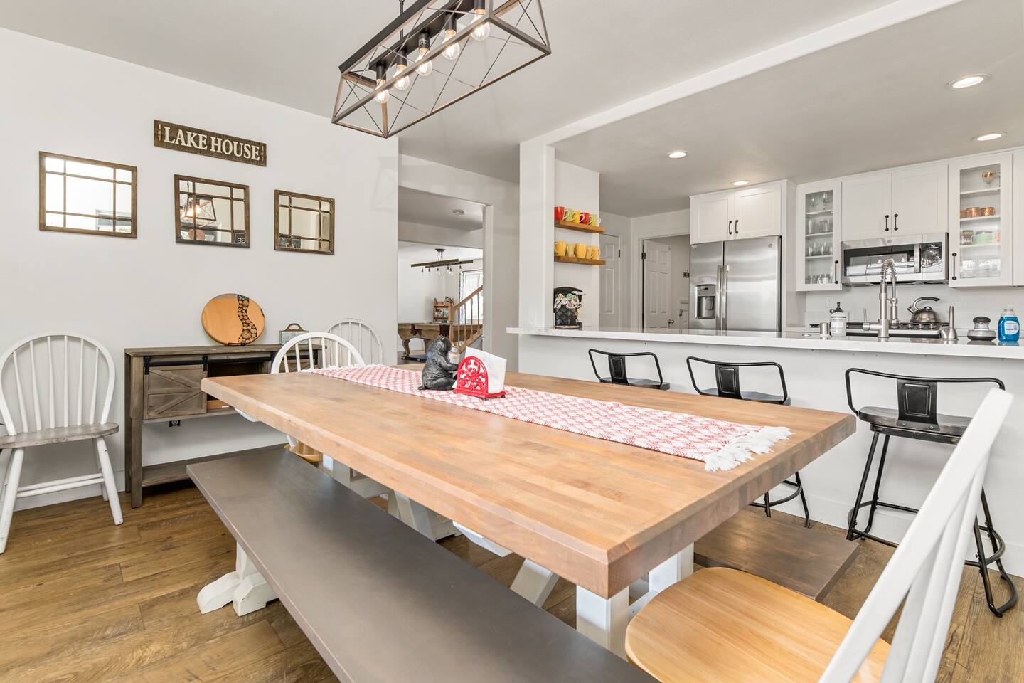 This spectacular 2,400+ sq. ft. cabin in Boulder Bay has 2 levels, 4 bedrooms, 4 bathrooms, & a private dock on Big Bear Lake. Big Bear local ordinance 99.300 limits maximum occupancy to 12 people & 4 parked cars for Boulder Bay Farmhouse. Boulder Bay Farmhouse also has 2 patios, 2 gas fireplaces, access to the National Forest, & a hot tub. The kitchen is fully-stocked and all bedding & linens are provided by our professional cleaning crew. This beautiful cabin is the perfect getaway for family, friends, & even pets! The cabin’s main entrance is accessible via outdoor stairs, so guests should be comfortable using them. Amenities include free Starlink high speed Wi-Fi, HD TVs with streaming services, central air conditioning, a ping pong & pool table, a vintage arcade console, spectacular lake views, a Powerwall whole house battery, a high speed NEMA 14-50 amp outlet EV car charger for Teslas (must bring your own cable & adapter), and a dedicated kids bunk bed room. For your convenience, this cabin is in the Boulder Bay neighborhood of Big Bear & perfectly located just minutes from tons of activities - hiking, golfing, skiing, biking, & more. This retreat is 6.2 miles from Bear Mountain, 4.5 miles from Snow Summit, and a quick 5 minute drive to Big Bear Village downtown shops & restaurants. *Note- The cabin is conveniently located on a main street, making it easy to get around. However, there is some traffic noise, especially during peak hours. ---------- ROOM DESCRIPTIONS * LIVING ROOM: The living room is located on the lower level & features big windows that offer beautiful lake views. This cozy living room has a large sectional sofa, ample seating, a gas fireplace, a TV, an arcade console with vintage video games, a pool table that can convert into a ping pong table, & shelves stocked with various board games. * DINING ROOM & KITCHEN: The fully-stocked & open-concept kitchen is located on the lower level & features breathtaking views of the lake. It has stainless steel appliances including a stove, a refrigerator, a microwave, & a dishwasher. The kitchen also has a toaster, a kettle, a farmhouse sink, and a Keurig coffee maker as well as other cooking and serving essentials. There is a breakfast bar with seating for 4 people in addition to two available dining tables. The casual dining table in the kitchen has seating for 6 people while the adjacent formal dining room has a table that seats 6 people. * BEDROOM #1: This primary bedroom is a 220 sq. ft. suite located on the lower level. It has a king bed, wood floor, a private entrance, seating, a mini fridge, ceiling fan, & an ensuite full bathroom with a walk-in shower (Bathroom #1). Note- The Master Suite is a private retreat, separate from the main living area. Perfect for those who enjoy extra privacy! The suite is secluded with no indoor access between the suite and the rest of the cabin. * BEDROOM #2: This primary bedroom is located on the upper level. It has a king bed, wood floor, a gas fireplace, gorgeous views of the lake, TV, ceiling fan, & an ensuite bathroom (Bathroom #2). * BEDROOM #3: This bedroom is located on the upper level. It has a king bed, wood floor, ceiling fan, & lovely views of the lake. * BEDROOM #4 (Kids Room): This bedroom has 3 bunk beds with a total of 7 total twin beds, wood floor, & ceiling fan. Bunk bed #1 has 2 twin beds. Bunk bed #2 has 2 twin beds. Bunk bed #3 has 3 twin beds. * BATHROOM #1: This full ensuite bathroom to Bedroom #1 is located on the lower level & has a walk-in shower. * BATHROOM #2: This full ensuite bathroom to Bedroom #2 is located on the upper level. It has a walk-in shower with dual shower heads & dual sinks. * BATHROOM #3: This full bathroom is located on the upper level that has a bathtub & a walk-in shower. * BATHROOM #4: This full bathroom is located on the lower level through the laundry room & has a walk-in shower. * LAUNDRY ROOM: There is a dedicated laundry room located on the lower level adjacent to the kitchen that has a full size washer & dryer for your convenience. * LOWER PATIO: With the Boulder Bay area of Big Bear Lake located directly across the street from this cabin, the large elevated patio located on the lower level has gorgeous panoramic views of the lake, outdoor seating with Adirondack chairs, & a gas fire pit (Fire pit is not available during winter months). It is the perfect spot for sunset views, stargazing, & gathering with family and friends. * UPPER PATIO: The upper patio has outdoor seating including rocking chairs, spectacular lake views, an outdoor dining table with seating for 6 people, a Weber gas grill, and a private hot tub. *DRIVEWAYS: This cabin has 2 driveways. The main driveway is located in the front of the cabin and fits 2 cars. The additional driveway is located on the side of the cabin and can fit 2 cars when there is no snow. During snowy weather, this additional driveway can only accommodate 1 vehicle. * DOCK: Boulder Bay Farmhouse is located next to the Boulder Bay area of the lake. This cabin has a private dock that is directly across the street. The dock is the perfect spot for fishing, kayaking, & enjoying the natural beauty of Big Bear Lake. Please know that you do need to cross Big Bear Boulevard to access the private dock across the street (so look both ways!). * NATIONAL FOREST: The San Bernardino National Forest is located directly behind this cabin & offers endless hiking, bouldering, and other outdoor recreation opportunities for guests.
