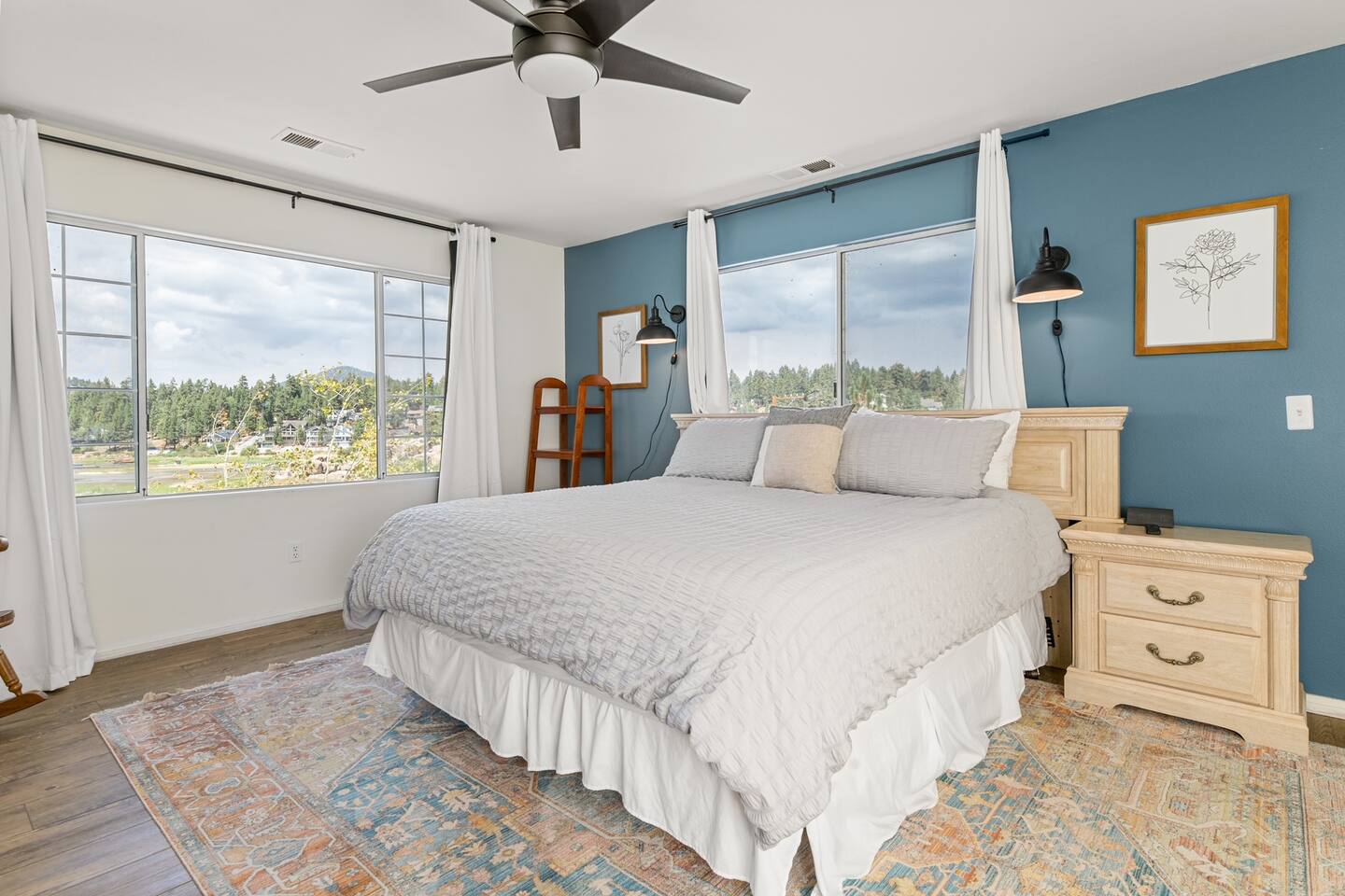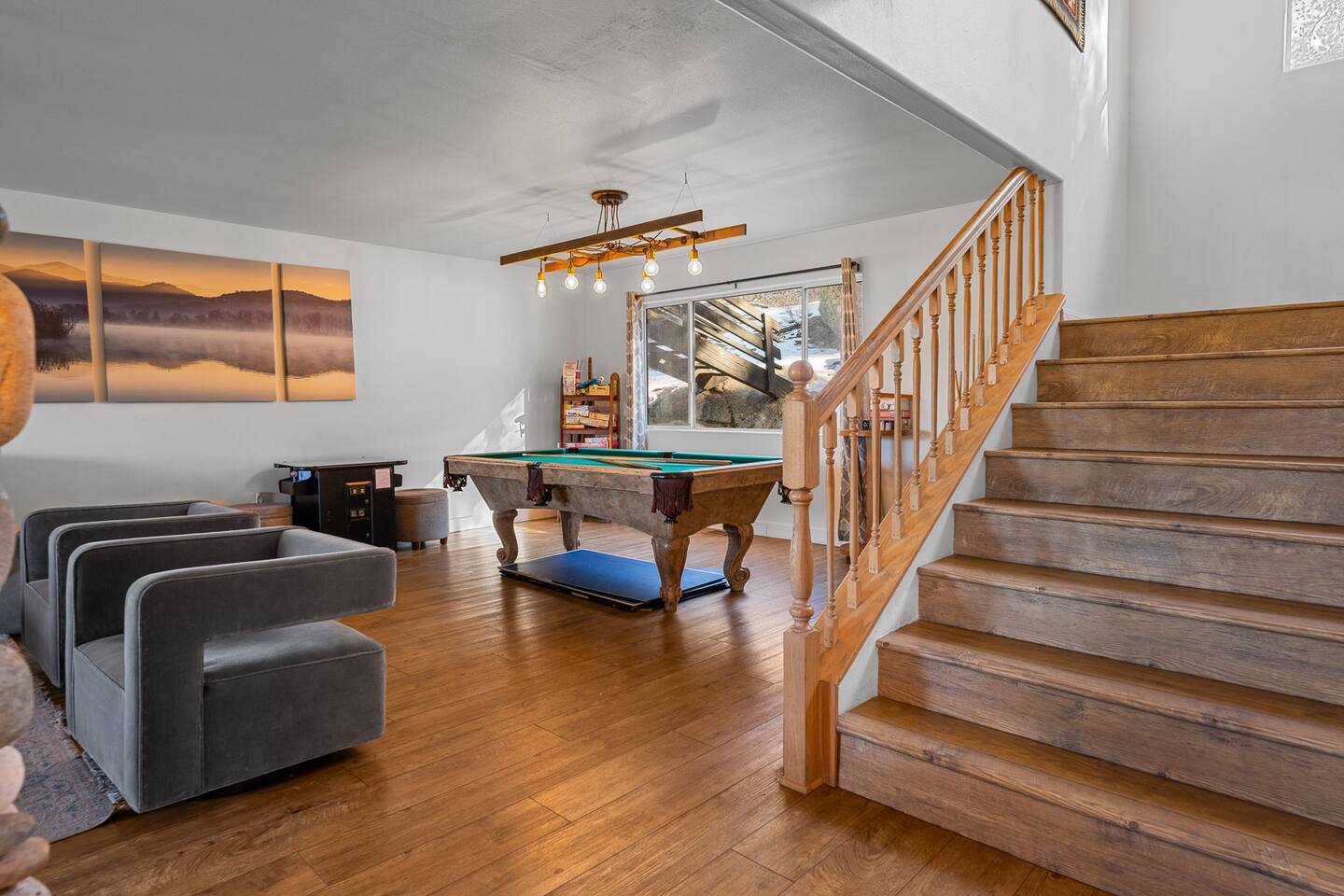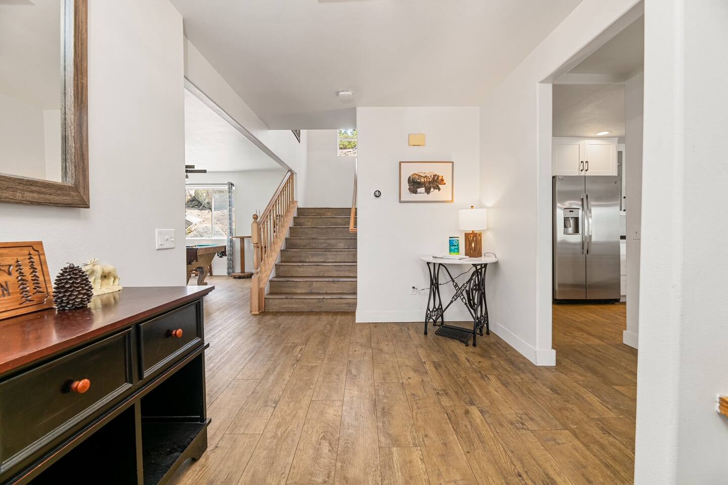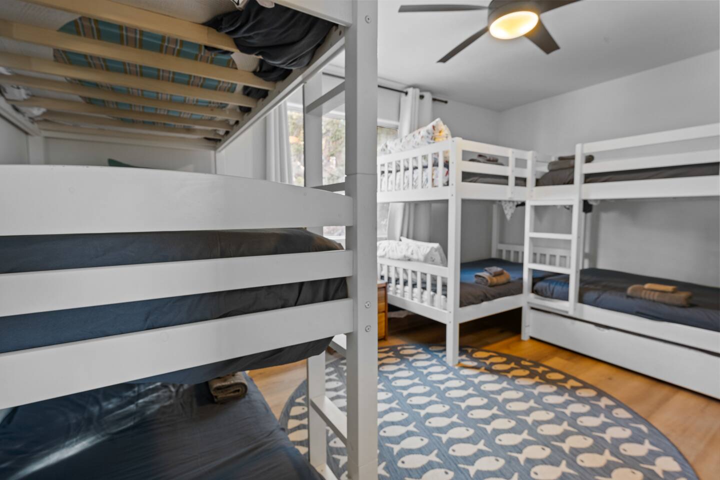This spectacular 2,400+ sq. ft. cabin in Boulder Bay has 2 levels, 4 bedrooms, 4 bathrooms, & a private dock on Big Bear Lake. Big Bear local ordinance 99.300 limits maximum occupancy to 12 people & 4 parked cars for Boulder Bay Farmhouse. Boulder Bay Farmhouse also has 2 patios, 2 gas fireplaces, access to the National Forest, & a hot tub. The kitchen is fully-stocked and all bedding & linens are provided by our professional cleaning crew. This beautiful cabin is the perfect getaway for family, friends, & even pets! The cabin’s main entrance is accessible via outdoor stairs, so guests should be comfortable using them. Amenities include free Starlink high speed Wi-Fi, HD TVs with streaming services, central air conditioning, a ping pong & pool table, a vintage arcade console, spectacular lake views, a Powerwall whole house battery, a high speed NEMA 14-50 amp outlet EV car charger for Teslas (must bring your own cable & adapter), and a dedicated kids bunk bed room. For your convenience, this cabin is in the Boulder Bay neighborhood of Big Bear & perfectly located just minutes from tons of activities - hiking, golfing, skiing, biking, & more. This retreat is 6.2 miles from Bear Mountain, 4.5 miles from Snow Summit, and a quick 5 minute drive to Big Bear Village downtown shops & restaurants. *Note- The cabin is conveniently located on a main street, making it easy to get around. However, there is some traffic noise, especially during peak hours. ---------- ROOM DESCRIPTIONS * LIVING ROOM: The living room is located on the lower level & features big windows that offer beautiful lake views. This cozy living room has a large sectional sofa, ample seating, a gas fireplace, a TV, an arcade console with vintage video games, a pool table that can convert into a ping pong table, & shelves stocked with various board games. * DINING ROOM & KITCHEN: The fully-stocked & open-concept kitchen is located on the lower level & features breathtaking views of the lake. It has stainless steel appliances including a stove, a refrigerator, a microwave, & a dishwasher. The kitchen also has a toaster, a kettle, a farmhouse sink, and a Keurig coffee maker as well as other cooking and serving essentials. There is a breakfast bar with seating for 4 people in addition to two available dining tables. The casual dining table in the kitchen has seating for 6 people while the adjacent formal dining room has a table that seats 6 people. * BEDROOM #1: This primary bedroom is a 220 sq. ft. suite located on the lower level. It has a king bed, wood floor, a private entrance, seating, a mini fridge, ceiling fan, & an ensuite full bathroom with a walk-in shower (Bathroom #1). Note- The Master Suite is a private retreat, separate from the main living area. Perfect for those who enjoy extra privacy! The suite is secluded with no indoor access between the suite and the rest of the cabin. * BEDROOM #2: This primary bedroom is located on the upper level. It has a king bed, wood floor, a gas fireplace, gorgeous views of the lake, TV, ceiling fan, & an ensuite bathroom (Bathroom #2). * BEDROOM #3: This bedroom is located on the upper level. It has a king bed, wood floor, ceiling fan, & lovely views of the lake. * BEDROOM #4 (Kids Room): This bedroom has 3 bunk beds with a total of 7 total twin beds, wood floor, & ceiling fan. Bunk bed #1 has 2 twin beds. Bunk bed #2 has 2 twin beds. Bunk bed #3 has 3 twin beds. * BATHROOM #1: This full ensuite bathroom to Bedroom #1 is located on the lower level & has a walk-in shower. * BATHROOM #2: This full ensuite bathroom to Bedroom #2 is located on the upper level. It has a walk-in shower with dual shower heads & dual sinks. * BATHROOM #3: This full bathroom is located on the upper level that has a bathtub & a walk-in shower. * BATHROOM #4: This full bathroom is located on the lower level through the laundry room & has a walk-in shower. * LAUNDRY ROOM: There is a dedicated laundry room located on the lower level adjacent to the kitchen that has a full size washer & dryer for your convenience. * LOWER PATIO: With the Boulder Bay area of Big Bear Lake located directly across the street from this cabin, the large elevated patio located on the lower level has gorgeous panoramic views of the lake, outdoor seating with Adirondack chairs, & a gas fire pit (Fire pit is not available during winter months). It is the perfect spot for sunset views, stargazing, & gathering with family and friends. * UPPER PATIO: The upper patio has outdoor seating including rocking chairs, spectacular lake views, an outdoor dining table with seating for 6 people, a Weber gas grill, and a private hot tub. *DRIVEWAYS: This cabin has 2 driveways. The main driveway is located in the front of the cabin and fits 2 cars. The additional driveway is located on the side of the cabin and can fit 2 cars when there is no snow. During snowy weather, this additional driveway can only accommodate 1 vehicle. * DOCK: Boulder Bay Farmhouse is located next to the Boulder Bay area of the lake. This cabin has a private dock that is directly across the street. The dock is the perfect spot for fishing, kayaking, & enjoying the natural beauty of Big Bear Lake. Please know that you do need to cross Big Bear Boulevard to access the private dock across the street (so look both ways!). * NATIONAL FOREST: The San Bernardino National Forest is located directly behind this cabin & offers endless hiking, bouldering, and other outdoor recreation opportunities for guests.