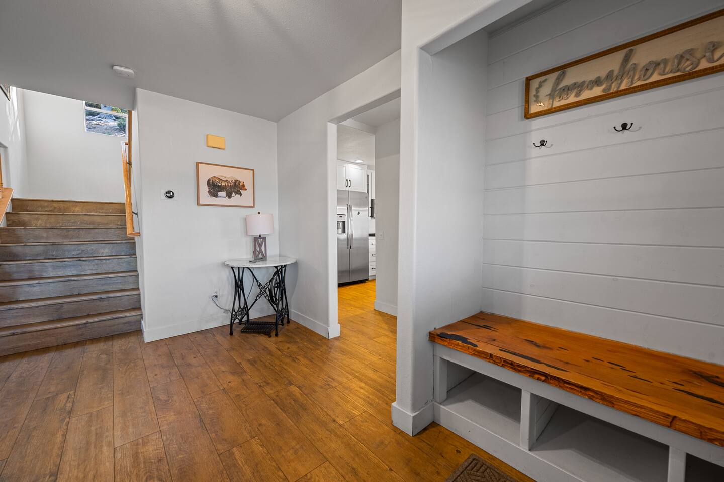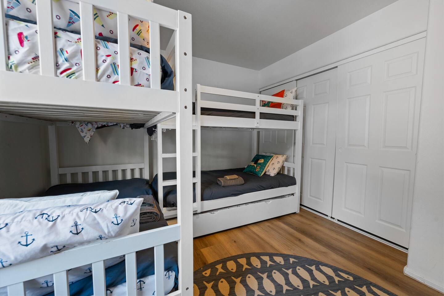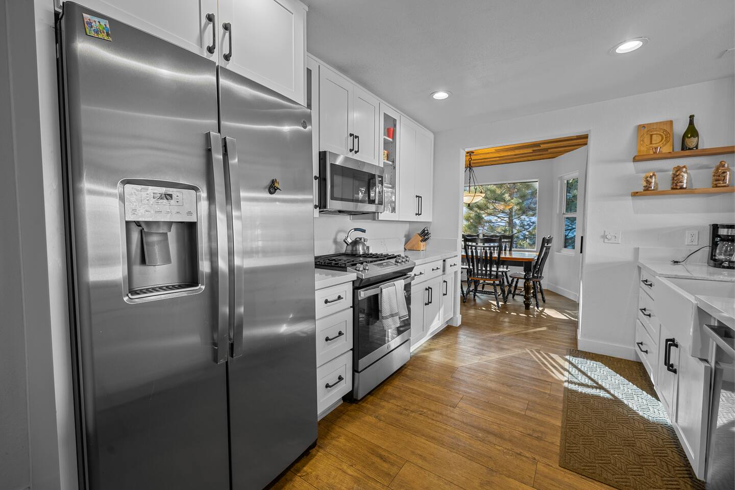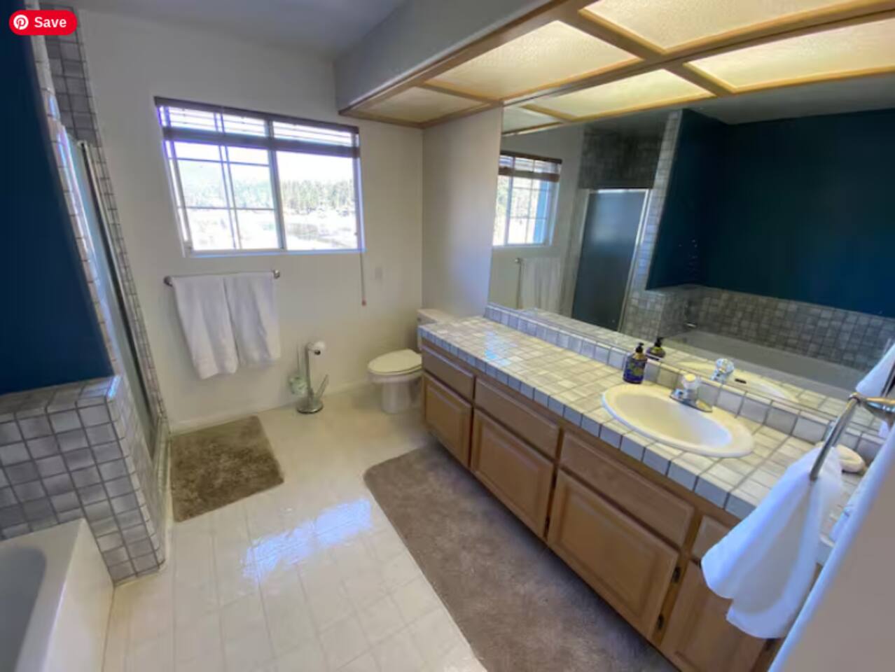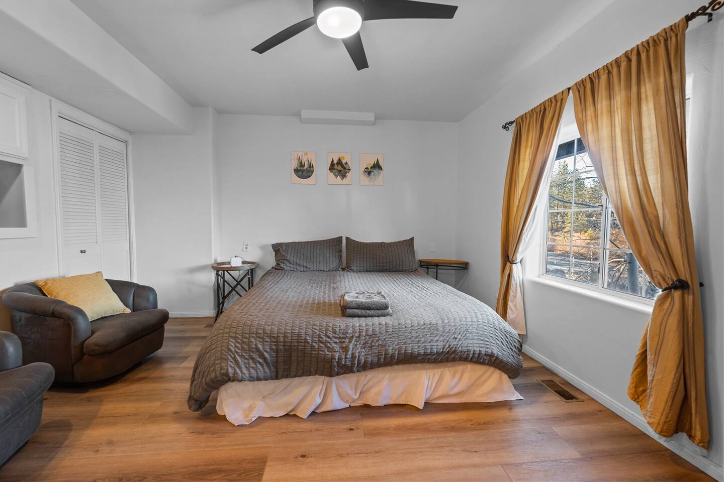 This spectacular 2,400+ sq. ft. cabin in Boulder Bay has 2 levels, 4 bedrooms, 4 bathrooms, & a private dock on Big Bear Lake. Big Bear local ordinance 99.300 limits maximum occupancy to 12 people & 4 parked cars for Boulder Bay Farmhouse. Boulder Bay Farmhouse also has 2 patios, 2 gas fireplaces, access to the National Forest, & a hot tub. The kitchen is fully-stocked and all bedding & linens are provided by our professional cleaning crew. This beautiful cabin is the perfect getaway for family, friends, & even pets! The cabin’s main entrance is accessible via outdoor stairs, so guests should be comfortable using them. Amenities include free Starlink high speed Wi-Fi, HD TVs with streaming services, central air conditioning, a ping pong & pool table, a vintage arcade console, spectacular lake views, a Powerwall whole house battery, a high speed NEMA 14-50 amp outlet EV car charger for Teslas (must bring your own cable & adapter), and a dedicated kids bunk bed room. For your convenience, this cabin is in the Boulder Bay neighborhood of Big Bear & perfectly located just minutes from tons of activities - hiking, golfing, skiing, biking, & more. This retreat is 6.2 miles from Bear Mountain, 4.5 miles from Snow Summit, and a quick 5 minute drive to Big Bear Village downtown shops & restaurants. *Note- The cabin is conveniently located on a main street, making it easy to get around. However, there is some traffic noise, especially during peak hours. ---------- ROOM DESCRIPTIONS * LIVING ROOM: The living room is located on the lower level & features big windows that offer beautiful lake views. This cozy living room has a large sectional sofa, ample seating, a gas fireplace, a TV, an arcade console with vintage video games, a pool table that can convert into a ping pong table, & shelves stocked with various board games. * DINING ROOM & KITCHEN: The fully-stocked & open-concept kitchen is located on the lower level & features breathtaking views of the lake. It has stainless steel appliances including a stove, a refrigerator, a microwave, & a dishwasher. The kitchen also has a toaster, a kettle, a farmhouse sink, and a Keurig coffee maker as well as other cooking and serving essentials. There is a breakfast bar with seating for 4 people in addition to two available dining tables. The casual dining table in the kitchen has seating for 6 people while the adjacent formal dining room has a table that seats 6 people. * BEDROOM #1: This primary bedroom is a 220 sq. ft. suite located on the lower level. It has a king bed, wood floor, a private entrance, seating, a mini fridge, ceiling fan, & an ensuite full bathroom with a walk-in shower (Bathroom #1). Note- The Master Suite is a private retreat, separate from the main living area. Perfect for those who enjoy extra privacy! The suite is secluded with no indoor access between the suite and the rest of the cabin. * BEDROOM #2: This primary bedroom is located on the upper level. It has a king bed, wood floor, a gas fireplace, gorgeous views of the lake, TV, ceiling fan, & an ensuite bathroom (Bathroom #2). * BEDROOM #3: This bedroom is located on the upper level. It has a king bed, wood floor, ceiling fan, & lovely views of the lake. * BEDROOM #4 (Kids Room): This bedroom has 3 bunk beds with a total of 7 total twin beds, wood floor, & ceiling fan. Bunk bed #1 has 2 twin beds. Bunk bed #2 has 2 twin beds. Bunk bed #3 has 3 twin beds. * BATHROOM #1: This full ensuite bathroom to Bedroom #1 is located on the lower level & has a walk-in shower. * BATHROOM #2: This full ensuite bathroom to Bedroom #2 is located on the upper level. It has a walk-in shower with dual shower heads & dual sinks. * BATHROOM #3: This full bathroom is located on the upper level that has a bathtub & a walk-in shower. * BATHROOM #4: This full bathroom is located on the lower level through the laundry room & has a walk-in shower. * LAUNDRY ROOM: There is a dedicated laundry room located on the lower level adjacent to the kitchen that has a full size washer & dryer for your convenience. * LOWER PATIO: With the Boulder Bay area of Big Bear Lake located directly across the street from this cabin, the large elevated patio located on the lower level has gorgeous panoramic views of the lake, outdoor seating with Adirondack chairs, & a gas fire pit (Fire pit is not available during winter months). It is the perfect spot for sunset views, stargazing, & gathering with family and friends. * UPPER PATIO: The upper patio has outdoor seating including rocking chairs, spectacular lake views, an outdoor dining table with seating for 6 people, a Weber gas grill, and a private hot tub. *DRIVEWAYS: This cabin has 2 driveways. The main driveway is located in the front of the cabin and fits 2 cars. The additional driveway is located on the side of the cabin and can fit 2 cars when there is no snow. During snowy weather, this additional driveway can only accommodate 1 vehicle. * DOCK: Boulder Bay Farmhouse is located next to the Boulder Bay area of the lake. This cabin has a private dock that is directly across the street. The dock is the perfect spot for fishing, kayaking, & enjoying the natural beauty of Big Bear Lake. Please know that you do need to cross Big Bear Boulevard to access the private dock across the street (so look both ways!). * NATIONAL FOREST: The San Bernardino National Forest is located directly behind this cabin & offers endless hiking, bouldering, and other outdoor recreation opportunities for guests.