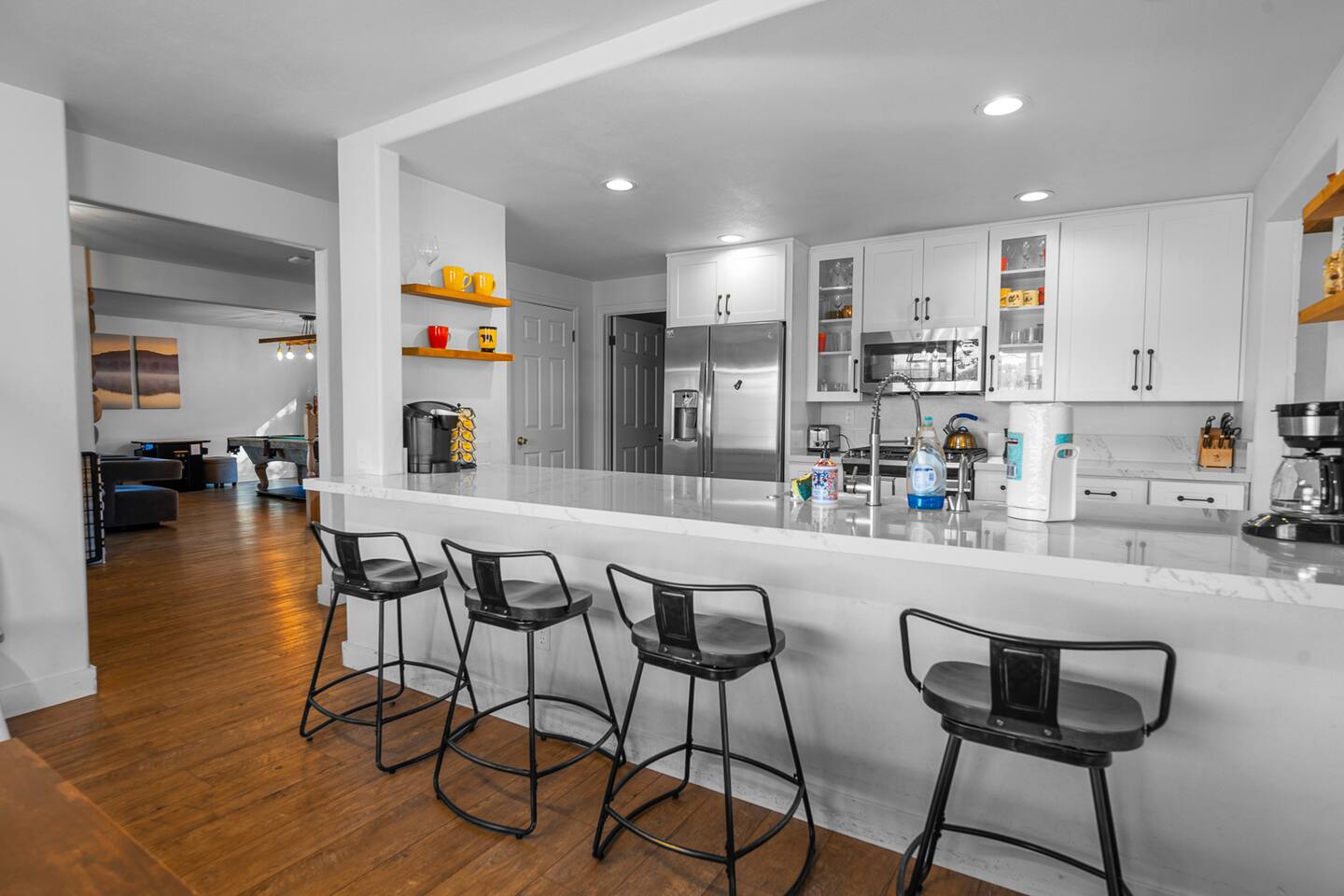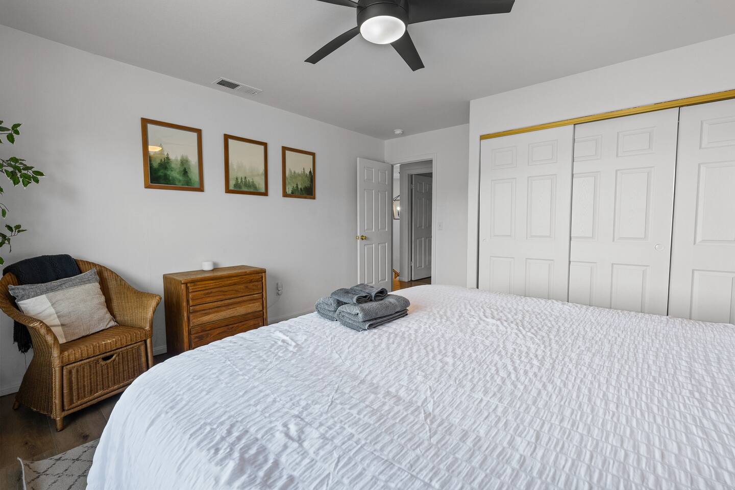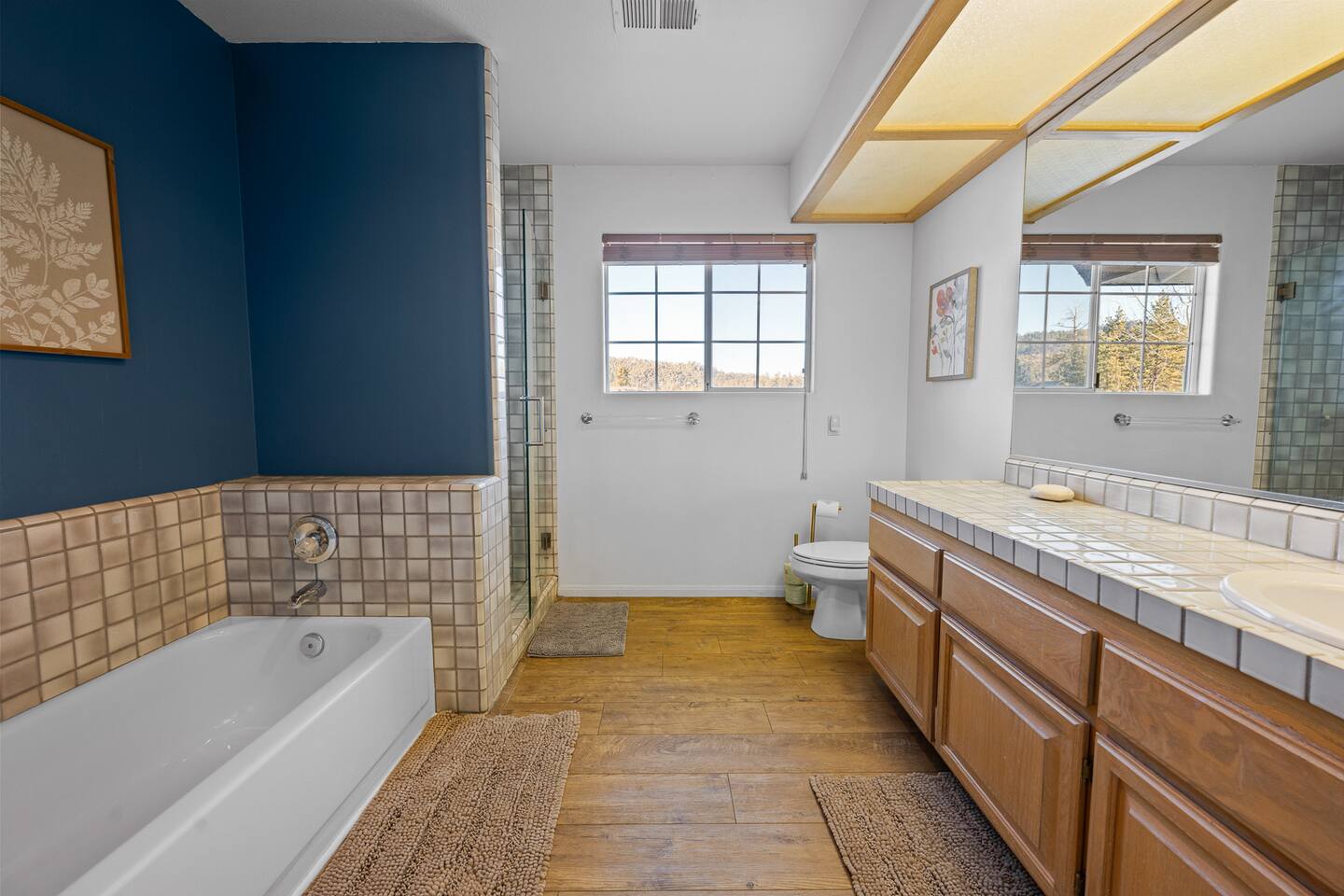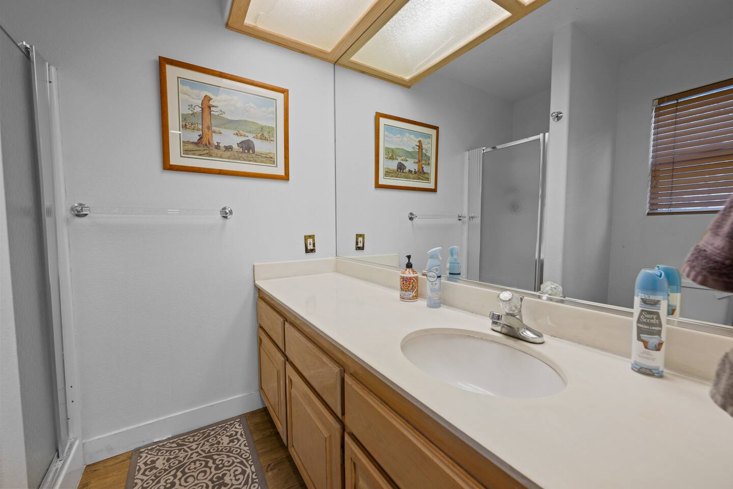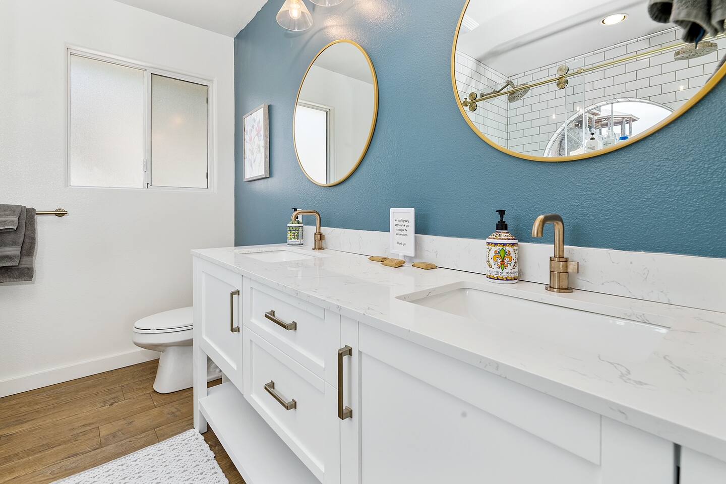 This spectacular 2,400+ sq. ft. cabin in Boulder Bay has 2 levels, 4 bedrooms, 4 bathrooms, & a private dock on Big Bear Lake. Big Bear local ordinance 99.300 limits maximum occupancy to 12 people & 4 parked cars for Boulder Bay Farmhouse. Boulder Bay Farmhouse also has 2 patios, 2 gas fireplaces, access to the National Forest, & a hot tub. The kitchen is fully-stocked and all bedding & linens are provided by our professional cleaning crew. This beautiful cabin is the perfect getaway for family, friends, & even pets! The cabin’s main entrance is accessible via outdoor stairs, so guests should be comfortable using them. Amenities include free Starlink high speed Wi-Fi, HD TVs with streaming services, central air conditioning, a ping pong & pool table, a vintage arcade console, spectacular lake views, a Powerwall whole house battery, a high speed NEMA 14-50 amp outlet EV car charger for Teslas (must bring your own cable & adapter), and a dedicated kids bunk bed room. For your convenience, this cabin is in the Boulder Bay neighborhood of Big Bear & perfectly located just minutes from tons of activities - hiking, golfing, skiing, biking, & more. This retreat is 6.2 miles from Bear Mountain, 4.5 miles from Snow Summit, and a quick 5 minute drive to Big Bear Village downtown shops & restaurants. *Note- The cabin is conveniently located on a main street, making it easy to get around. However, there is some traffic noise, especially during peak hours. ---------- ROOM DESCRIPTIONS * LIVING ROOM: The living room is located on the lower level & features big windows that offer beautiful lake views. This cozy living room has a large sectional sofa, ample seating, a gas fireplace, a TV, an arcade console with vintage video games, a pool table that can convert into a ping pong table, & shelves stocked with various board games. * DINING ROOM & KITCHEN: The fully-stocked & open-concept kitchen is located on the lower level & features breathtaking views of the lake. It has stainless steel appliances including a stove, a refrigerator, a microwave, & a dishwasher. The kitchen also has a toaster, a kettle, a farmhouse sink, and a Keurig coffee maker as well as other cooking and serving essentials. There is a breakfast bar with seating for 4 people in addition to two available dining tables. The casual dining table in the kitchen has seating for 6 people while the adjacent formal dining room has a table that seats 6 people. * BEDROOM #1: This primary bedroom is a 220 sq. ft. suite located on the lower level. It has a king bed, wood floor, a private entrance, seating, a mini fridge, ceiling fan, & an ensuite full bathroom with a walk-in shower (Bathroom #1). Note- The Master Suite is a private retreat, separate from the main living area. Perfect for those who enjoy extra privacy! The suite is secluded with no indoor access between the suite and the rest of the cabin. * BEDROOM #2: This primary bedroom is located on the upper level. It has a king bed, wood floor, a gas fireplace, gorgeous views of the lake, TV, ceiling fan, & an ensuite bathroom (Bathroom #2). * BEDROOM #3: This bedroom is located on the upper level. It has a king bed, wood floor, ceiling fan, & lovely views of the lake. * BEDROOM #4 (Kids Room): This bedroom has 3 bunk beds with a total of 7 total twin beds, wood floor, & ceiling fan. Bunk bed #1 has 2 twin beds. Bunk bed #2 has 2 twin beds. Bunk bed #3 has 3 twin beds. * BATHROOM #1: This full ensuite bathroom to Bedroom #1 is located on the lower level & has a walk-in shower. * BATHROOM #2: This full ensuite bathroom to Bedroom #2 is located on the upper level. It has a walk-in shower with dual shower heads & dual sinks. * BATHROOM #3: This full bathroom is located on the upper level that has a bathtub & a walk-in shower. * BATHROOM #4: This full bathroom is located on the lower level through the laundry room & has a walk-in shower. * LAUNDRY ROOM: There is a dedicated laundry room located on the lower level adjacent to the kitchen that has a full size washer & dryer for your convenience. * LOWER PATIO: With the Boulder Bay area of Big Bear Lake located directly across the street from this cabin, the large elevated patio located on the lower level has gorgeous panoramic views of the lake, outdoor seating with Adirondack chairs, & a gas fire pit (Fire pit is not available during winter months). It is the perfect spot for sunset views, stargazing, & gathering with family and friends. * UPPER PATIO: The upper patio has outdoor seating including rocking chairs, spectacular lake views, an outdoor dining table with seating for 6 people, a Weber gas grill, and a private hot tub. *DRIVEWAYS: This cabin has 2 driveways. The main driveway is located in the front of the cabin and fits 2 cars. The additional driveway is located on the side of the cabin and can fit 2 cars when there is no snow. During snowy weather, this additional driveway can only accommodate 1 vehicle. * DOCK: Boulder Bay Farmhouse is located next to the Boulder Bay area of the lake. This cabin has a private dock that is directly across the street. The dock is the perfect spot for fishing, kayaking, & enjoying the natural beauty of Big Bear Lake. Please know that you do need to cross Big Bear Boulevard to access the private dock across the street (so look both ways!). * NATIONAL FOREST: The San Bernardino National Forest is located directly behind this cabin & offers endless hiking, bouldering, and other outdoor recreation opportunities for guests.