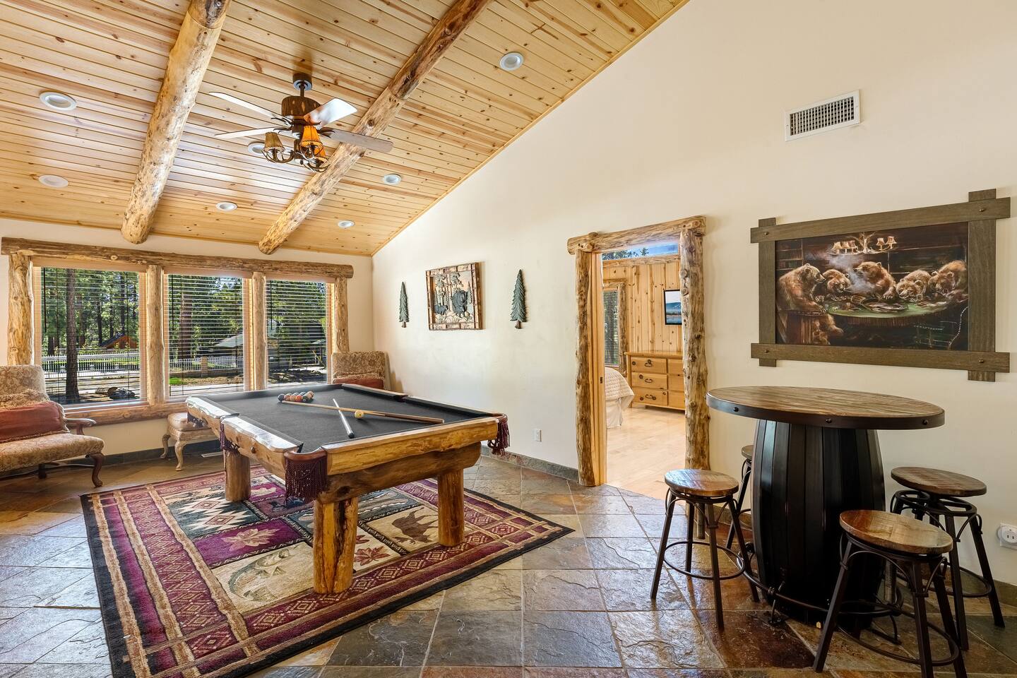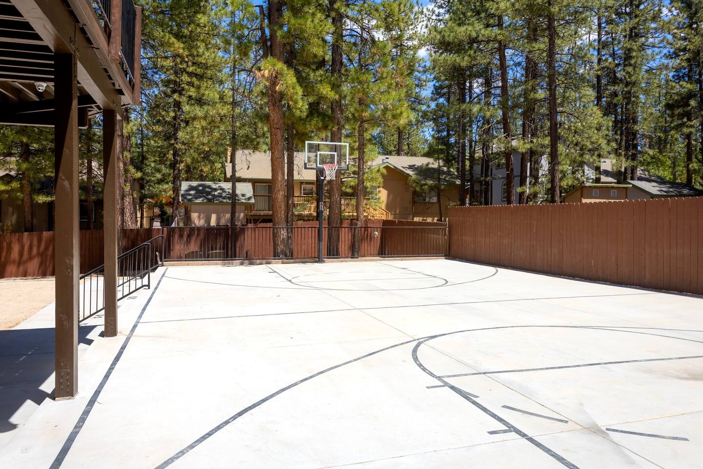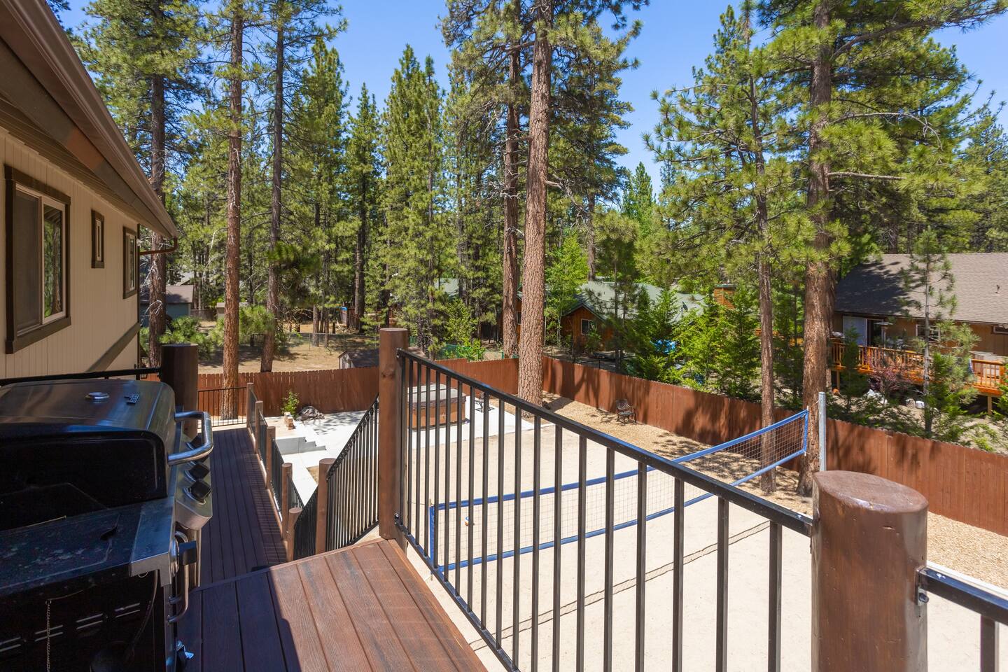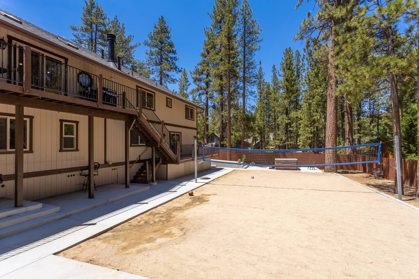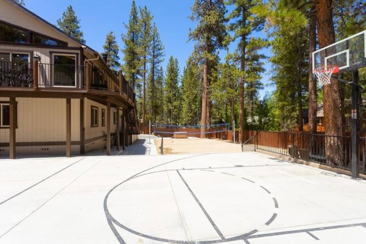 Welcome to Silver Fox Cabin! Tucked among the towering pines of Big Bear’s peaceful Fox Farm neighborhood, Silver Fox Cabin is a spectacular luxury retreat designed for unforgettable mountain getaways. With 2 spacious levels, 6 beautifully appointed bedrooms, and 4 full bathrooms, this grand cabin offers plenty of room for families and friends to relax, reconnect, and make lasting memories. Whether you're gathering around the fireplace after a day on the slopes or enjoying a lively evening in one of the game rooms, Silver Fox Cabin delivers comfort, style, and entertainment at every turn. Inside, the home blends rustic mountain charm with upscale amenities. The open-concept upper level features a warm and inviting living room with a cozy gas fireplace and large TV that’s perfect for movie nights or quiet mornings with coffee. Just steps away, the fully stocked gourmet kitchen makes it easy to cook for a crowd, with stainless steel appliances, a gas range, and both Keurig and classic drip coffee makers to start your day right. The adjacent dining area and breakfast bar provide plenty of seating, while the wraparound deck invites guests to step outside and enjoy fresh mountain air while grilling or dining under the trees. Silver Fox Cabin is designed for fun as much as relaxation. The 2 dedicated game rooms provide entertainment for every age, featuring a pool table, foosball table, shuffleboard, comfortable seating areas, and multiple TVs with Roku. After a day of adventure, guests can retreat to one of the cabin’s spacious bedrooms including 2 luxurious primary suites with ensuite bathrooms offering comfortable beds, cozy seating, and quiet spaces to unwind. The kitchen is fully-stocked and all bedding & linens are provided by our professional cleaning crew. Guests have access to free high speed Wi-Fi, TVs with Roku, & countless upscale amenities. The outdoor space truly makes Silver Fox Cabin stand out. Set on a fully fenced half-acre property, the backyard feels like a private mountain playground. Guests can soak beneath the stars in the hot tub, challenge friends to a game on the full basketball court or beach volleyball court, or relax with corn-hole and horseshoes in the fresh alpine air. The upper deck is perfect for outdoor dining and barbecues, while the spacious yard offers plenty of room for pets and kids to play. Perfectly located just minutes from Big Bear’s best attractions, Silver Fox Cabin makes it easy to enjoy everything the area has to offer. Bear Mountain and Snow Summit ski resorts are only a short drive away, and Big Bear Village with its charming shops, restaurants, and lakefront activities is just a 6-8 minute car ride from the cabin. From hiking and biking in the summer to skiing and snowboarding in the winter, adventure is always close by. Whether you're planning a family reunion, a getaway with friends, or a mountain escape with your pets, Silver Fox Cabin offers the perfect blend of luxury, comfort, and recreation as your own private lodge in the heart of Big Bear. ========== LOCATION For your convenience, Silver Fox Cabin is in the upscale Fox Farm neighborhood of Big Bear & perfectly located just minutes from tons of activities including hiking, golfing, skiing, biking, swimming, & more. This grand retreat is 2.2 miles from Bear Mountain, 1.6 miles from Snow Summit, and a quick 6-8 minute drive to Big Bear Village downtown shops & restaurants. ========== ROOM DESCRIPTIONS * LIVING ROOM: The beautiful living room is located on the upper level and has a gas fireplace, an LG TV with Roku, a sofa, skylights, a ceiling fan, and additional seating for guests. * KITCHEN: The gourmet kitchen is located on the upper level. It has stainless steel appliances, cooking basics, a spice rack, a Keurig coffee maker, a classic drip style coffee maker, and access to the wraparound deck. Appliances include a dishwasher, a refrigerator, a freezer with an ice maker, a toaster, an LG microwave, a Ninja blender, a food processor, a crock pot, barbecue tools, and a DCS by Fisher & Paykel gas range (oven and stove) with a griddle. The island has a prep sink and a breakfast bar with stool seats for guests. * DINING AREA: The open-concept dining area is located on the upper level and offers access to the wraparound deck. It has a rustic dining table with seating for 8 guests. * GAME ROOM #1: The upper level game room has a pool table, guest seating, a bar top table with stools, a ceiling fan, and a 60” LG TV with Roku. * GAME ROOM #2: The lower level game room with a sectional sofa, a 72” Samsung Smart TV, seating areas with 8 stools, a foosball table, a shuffleboard table, and access to the outdoor full basketball court. * LAUNDRY ROOM: This laundry room is located on the lower level near Game Room #2. It has a full size washer and a full size dryer for guest use. ========== BEDROOM DESCRIPTIONS This cabin has 6 bedrooms. It has 2 primary suites with ensuite bathrooms. The first primary suite is located on the upper level and the second primary suite is located on the lower level. * BEDROOM #1 (Primary Suite): This primary suite on the upper level has 1 king bed, a ceiling fan, a TV with Roku, a dresser, 2 chairs, and an ensuite bathroom (Bathroom #1). * BEDROOM #2: This bedroom on the upper level has 1 queen bed, a closet, built-in shelves, wood floor, and a ceiling fan. * BEDROOM #3 (Bunk Bed Room): This bedroom on the upper level has 1 queen bed, dresser, 1 bunk bed (1 twin bed over 1 queen bed), a closet, a ceiling fan, and an LG TV with Roku. * BEDROOM #4: This bedroom on the lower level has 1 full bed, wood floor, and a closet. * BEDROOM #5: This bedroom on the lower level has 2 queen beds and a closet. * BEDROOM #6 (Primary Suite): This primary suite on the lower level has 1 king bed, a loveseat with 2 recliners, a closet, a TV, a desk, and an ensuite bathroom (Bathroom #4). ========== BATHROOMS DESCRIPTIONS This cabin has 4 full bathrooms. * BATHROOM #1: This full 