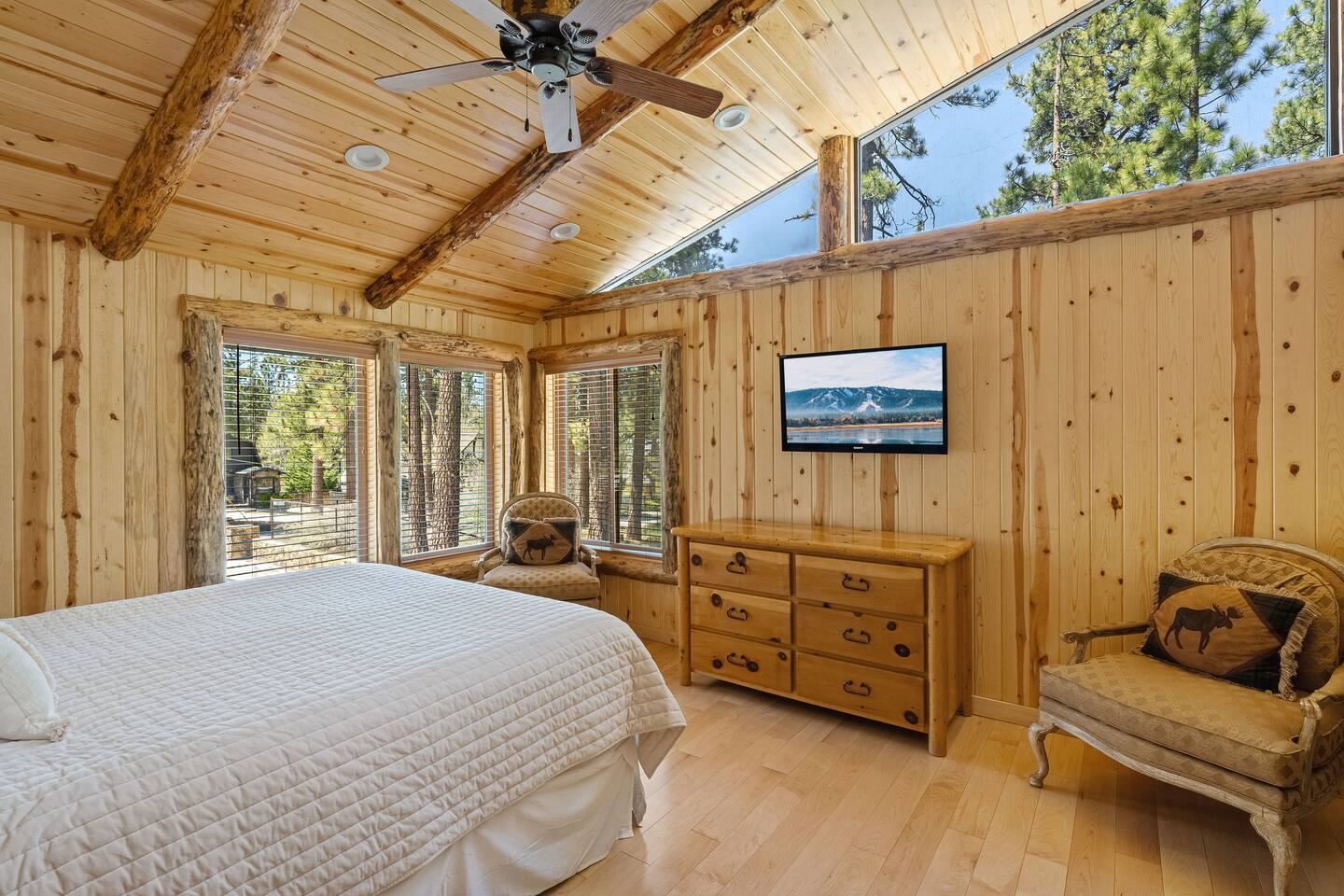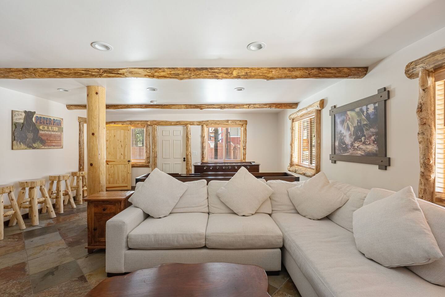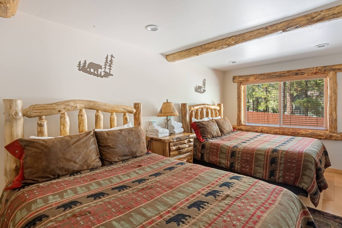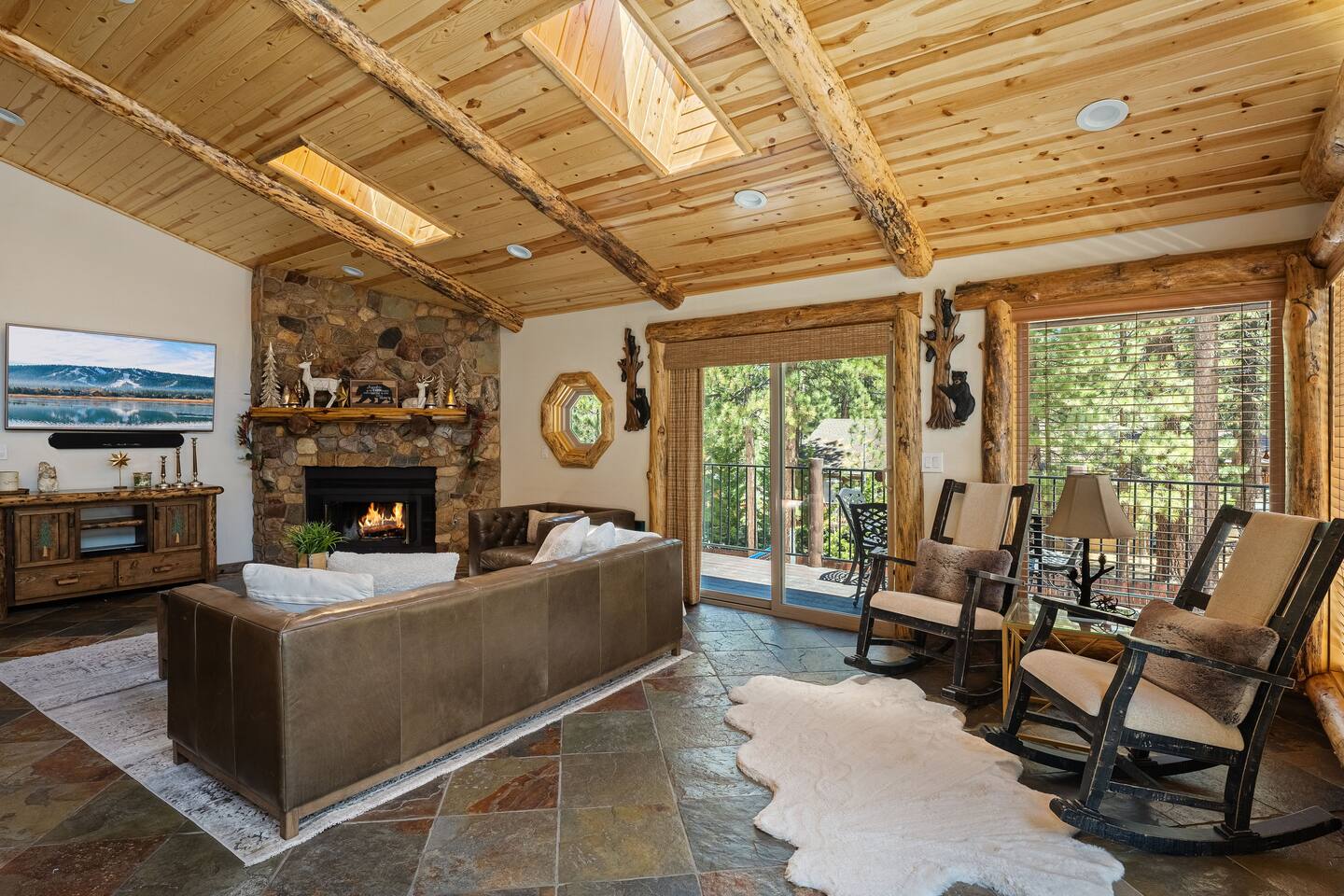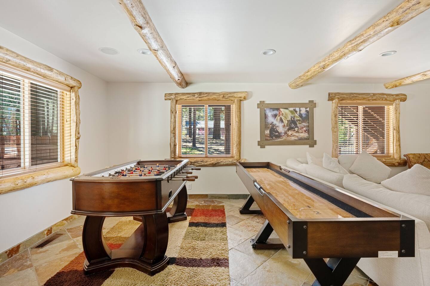 Welcome to Silver Fox Cabin! Tucked among the towering pines of Big Bear’s peaceful Fox Farm neighborhood, Silver Fox Cabin is a spectacular luxury retreat designed for unforgettable mountain getaways. With 2 spacious levels, 6 beautifully appointed bedrooms, and 4 full bathrooms, this grand cabin offers plenty of room for families and friends to relax, reconnect, and make lasting memories. Whether you're gathering around the fireplace after a day on the slopes or enjoying a lively evening in one of the game rooms, Silver Fox Cabin delivers comfort, style, and entertainment at every turn. Inside, the home blends rustic mountain charm with upscale amenities. The open-concept upper level features a warm and inviting living room with a cozy gas fireplace and large TV that’s perfect for movie nights or quiet mornings with coffee. Just steps away, the fully stocked gourmet kitchen makes it easy to cook for a crowd, with stainless steel appliances, a gas range, and both Keurig and classic drip coffee makers to start your day right. The adjacent dining area and breakfast bar provide plenty of seating, while the wraparound deck invites guests to step outside and enjoy fresh mountain air while grilling or dining under the trees. Silver Fox Cabin is designed for fun as much as relaxation. The 2 dedicated game rooms provide entertainment for every age, featuring a pool table, foosball table, shuffleboard, comfortable seating areas, and multiple TVs with Roku. After a day of adventure, guests can retreat to one of the cabin’s spacious bedrooms including 2 luxurious primary suites with ensuite bathrooms offering comfortable beds, cozy seating, and quiet spaces to unwind. The kitchen is fully-stocked and all bedding & linens are provided by our professional cleaning crew. Guests have access to free high speed Wi-Fi, TVs with Roku, & countless upscale amenities. The outdoor space truly makes Silver Fox Cabin stand out. Set on a fully fenced half-acre property, the backyard feels like a private mountain playground. Guests can soak beneath the stars in the hot tub, challenge friends to a game on the full basketball court or beach volleyball court, or relax with corn-hole and horseshoes in the fresh alpine air. The upper deck is perfect for outdoor dining and barbecues, while the spacious yard offers plenty of room for pets and kids to play. Perfectly located just minutes from Big Bear’s best attractions, Silver Fox Cabin makes it easy to enjoy everything the area has to offer. Bear Mountain and Snow Summit ski resorts are only a short drive away, and Big Bear Village with its charming shops, restaurants, and lakefront activities is just a 6-8 minute car ride from the cabin. From hiking and biking in the summer to skiing and snowboarding in the winter, adventure is always close by. Whether you're planning a family reunion, a getaway with friends, or a mountain escape with your pets, Silver Fox Cabin offers the perfect blend of luxury, comfort, and recreation as your own private lodge in the heart of Big Bear. ========== LOCATION For your convenience, Silver Fox Cabin is in the upscale Fox Farm neighborhood of Big Bear & perfectly located just minutes from tons of activities including hiking, golfing, skiing, biking, swimming, & more. This grand retreat is 2.2 miles from Bear Mountain, 1.6 miles from Snow Summit, and a quick 6-8 minute drive to Big Bear Village downtown shops & restaurants. ========== ROOM DESCRIPTIONS * LIVING ROOM: The beautiful living room is located on the upper level and has a gas fireplace, an LG TV with Roku, a sofa, skylights, a ceiling fan, and additional seating for guests. * KITCHEN: The gourmet kitchen is located on the upper level. It has stainless steel appliances, cooking basics, a spice rack, a Keurig coffee maker, a classic drip style coffee maker, and access to the wraparound deck. Appliances include a dishwasher, a refrigerator, a freezer with an ice maker, a toaster, an LG microwave, a Ninja blender, a food processor, a crock pot, barbecue tools, and a DCS by Fisher & Paykel gas range (oven and stove) with a griddle. The island has a prep sink and a breakfast bar with stool seats for guests. * DINING AREA: The open-concept dining area is located on the upper level and offers access to the wraparound deck. It has a rustic dining table with seating for 8 guests. * GAME ROOM #1: The upper level game room has a pool table, guest seating, a bar top table with stools, a ceiling fan, and a 60” LG TV with Roku. * GAME ROOM #2: The lower level game room with a sectional sofa, a 72” Samsung Smart TV, seating areas with 8 stools, a foosball table, a shuffleboard table, and access to the outdoor full basketball court. * LAUNDRY ROOM: This laundry room is located on the lower level near Game Room #2. It has a full size washer and a full size dryer for guest use. ========== BEDROOM DESCRIPTIONS This cabin has 6 bedrooms. It has 2 primary suites with ensuite bathrooms. The first primary suite is located on the upper level and the second primary suite is located on the lower level. * BEDROOM #1 (Primary Suite): This primary suite on the upper level has 1 king bed, a ceiling fan, a TV with Roku, a dresser, 2 chairs, and an ensuite bathroom (Bathroom #1). * BEDROOM #2: This bedroom on the upper level has 1 queen bed, a closet, built-in shelves, wood floor, and a ceiling fan. * BEDROOM #3 (Bunk Bed Room): This bedroom on the upper level has 1 queen bed, dresser, 1 bunk bed (1 twin bed over 1 queen bed), a closet, a ceiling fan, and an LG TV with Roku. * BEDROOM #4: This bedroom on the lower level has 1 full bed, wood floor, and a closet. * BEDROOM #5: This bedroom on the lower level has 2 queen beds and a closet. * BEDROOM #6 (Primary Suite): This primary suite on the lower level has 1 king bed, a loveseat with 2 recliners, a closet, a TV, a desk, and an ensuite bathroom (Bathroom #4). ========== BATHROOMS DESCRIPTIONS This cabin has 4 full bathrooms. * BATHROOM #1: This full 