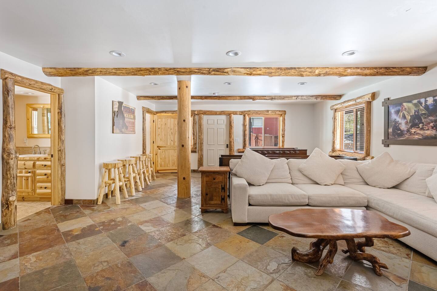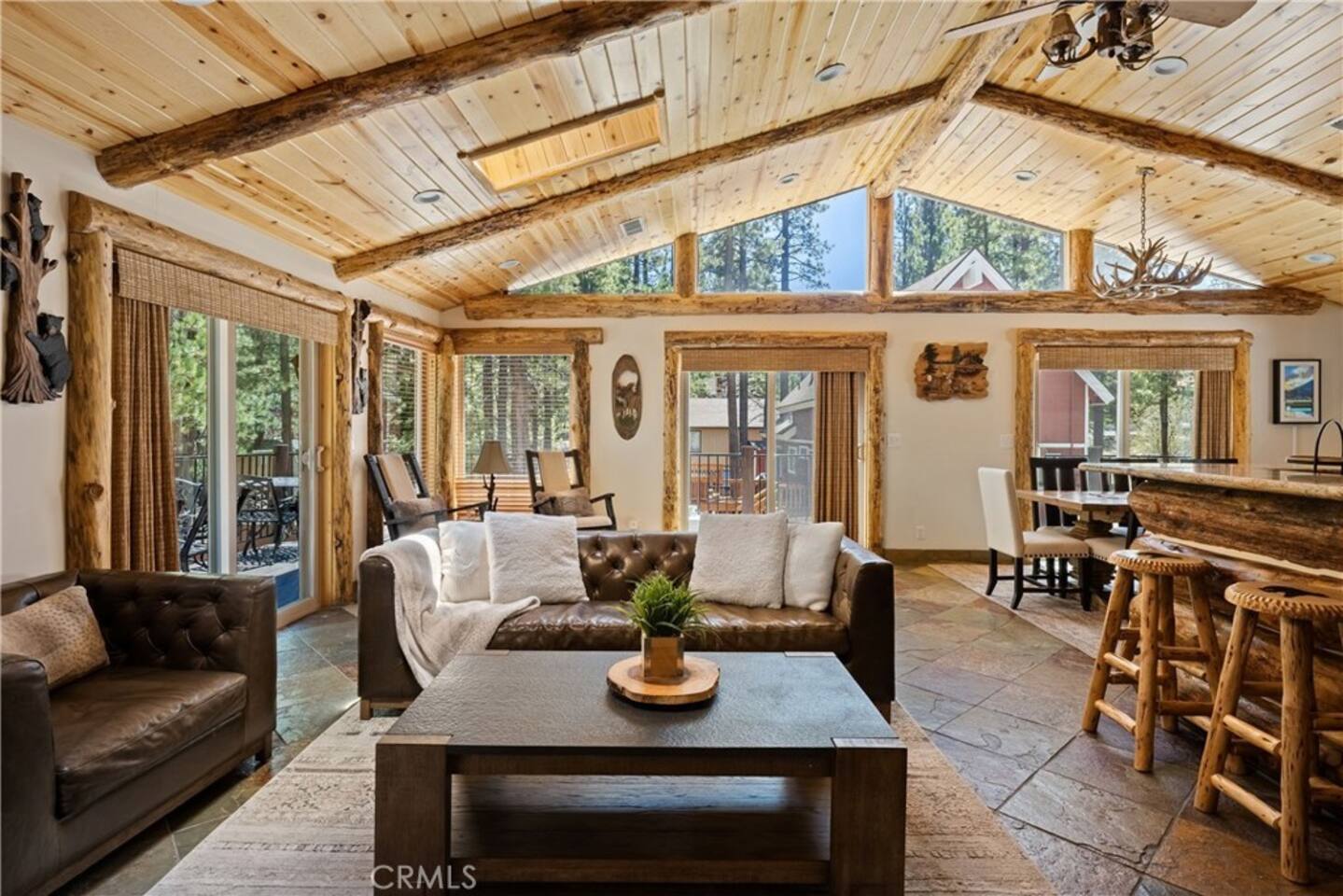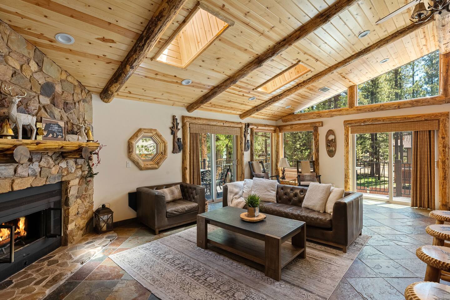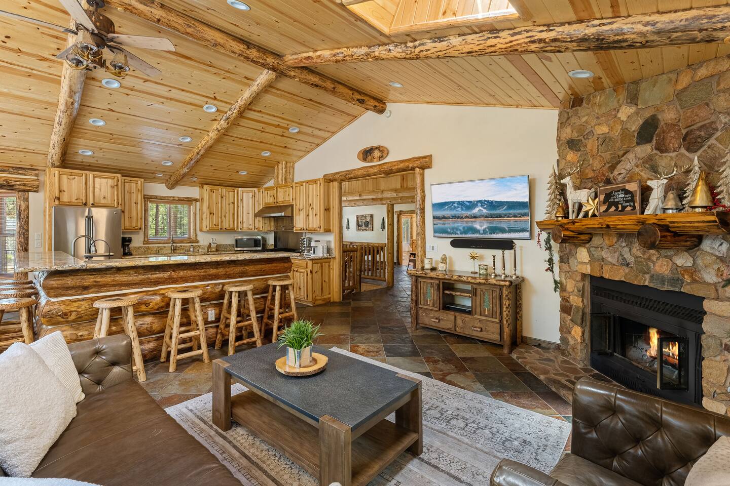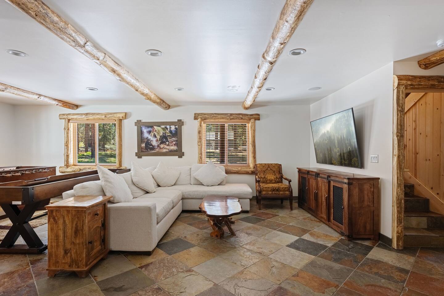 Welcome to Silver Fox Cabin! Tucked among the towering pines of Big Bear’s peaceful Fox Farm neighborhood, Silver Fox Cabin is a spectacular luxury retreat designed for unforgettable mountain getaways. With 2 spacious levels, 6 beautifully appointed bedrooms, and 4 full bathrooms, this grand cabin offers plenty of room for families and friends to relax, reconnect, and make lasting memories. Whether you're gathering around the fireplace after a day on the slopes or enjoying a lively evening in one of the game rooms, Silver Fox Cabin delivers comfort, style, and entertainment at every turn. Inside, the home blends rustic mountain charm with upscale amenities. The open-concept upper level features a warm and inviting living room with a cozy gas fireplace and large TV that’s perfect for movie nights or quiet mornings with coffee. Just steps away, the fully stocked gourmet kitchen makes it easy to cook for a crowd, with stainless steel appliances, a gas range, and both Keurig and classic drip coffee makers to start your day right. The adjacent dining area and breakfast bar provide plenty of seating, while the wraparound deck invites guests to step outside and enjoy fresh mountain air while grilling or dining under the trees. Silver Fox Cabin is designed for fun as much as relaxation. The 2 dedicated game rooms provide entertainment for every age, featuring a pool table, foosball table, shuffleboard, comfortable seating areas, and multiple TVs with Roku. After a day of adventure, guests can retreat to one of the cabin’s spacious bedrooms including 2 luxurious primary suites with ensuite bathrooms offering comfortable beds, cozy seating, and quiet spaces to unwind. The kitchen is fully-stocked and all bedding & linens are provided by our professional cleaning crew. Guests have access to free high speed Wi-Fi, TVs with Roku, & countless upscale amenities. The outdoor space truly makes Silver Fox Cabin stand out. Set on a fully fenced half-acre property, the backyard feels like a private mountain playground. Guests can soak beneath the stars in the hot tub, challenge friends to a game on the full basketball court or beach volleyball court, or relax with corn-hole and horseshoes in the fresh alpine air. The upper deck is perfect for outdoor dining and barbecues, while the spacious yard offers plenty of room for pets and kids to play. Perfectly located just minutes from Big Bear’s best attractions, Silver Fox Cabin makes it easy to enjoy everything the area has to offer. Bear Mountain and Snow Summit ski resorts are only a short drive away, and Big Bear Village with its charming shops, restaurants, and lakefront activities is just a 6-8 minute car ride from the cabin. From hiking and biking in the summer to skiing and snowboarding in the winter, adventure is always close by. Whether you're planning a family reunion, a getaway with friends, or a mountain escape with your pets, Silver Fox Cabin offers the perfect blend of luxury, comfort, and recreation as your own private lodge in the heart of Big Bear. ========== LOCATION For your convenience, Silver Fox Cabin is in the upscale Fox Farm neighborhood of Big Bear & perfectly located just minutes from tons of activities including hiking, golfing, skiing, biking, swimming, & more. This grand retreat is 2.2 miles from Bear Mountain, 1.6 miles from Snow Summit, and a quick 6-8 minute drive to Big Bear Village downtown shops & restaurants. ========== ROOM DESCRIPTIONS * LIVING ROOM: The beautiful living room is located on the upper level and has a gas fireplace, an LG TV with Roku, a sofa, skylights, a ceiling fan, and additional seating for guests. * KITCHEN: The gourmet kitchen is located on the upper level. It has stainless steel appliances, cooking basics, a spice rack, a Keurig coffee maker, a classic drip style coffee maker, and access to the wraparound deck. Appliances include a dishwasher, a refrigerator, a freezer with an ice maker, a toaster, an LG microwave, a Ninja blender, a food processor, a crock pot, barbecue tools, and a DCS by Fisher & Paykel gas range (oven and stove) with a griddle. The island has a prep sink and a breakfast bar with stool seats for guests. * DINING AREA: The open-concept dining area is located on the upper level and offers access to the wraparound deck. It has a rustic dining table with seating for 8 guests. * GAME ROOM #1: The upper level game room has a pool table, guest seating, a bar top table with stools, a ceiling fan, and a 60” LG TV with Roku. * GAME ROOM #2: The lower level game room with a sectional sofa, a 72” Samsung Smart TV, seating areas with 8 stools, a foosball table, a shuffleboard table, and access to the outdoor full basketball court. * LAUNDRY ROOM: This laundry room is located on the lower level near Game Room #2. It has a full size washer and a full size dryer for guest use. ========== BEDROOM DESCRIPTIONS This cabin has 6 bedrooms. It has 2 primary suites with ensuite bathrooms. The first primary suite is located on the upper level and the second primary suite is located on the lower level. * BEDROOM #1 (Primary Suite): This primary suite on the upper level has 1 king bed, a ceiling fan, a TV with Roku, a dresser, 2 chairs, and an ensuite bathroom (Bathroom #1). * BEDROOM #2: This bedroom on the upper level has 1 queen bed, a closet, built-in shelves, wood floor, and a ceiling fan. * BEDROOM #3 (Bunk Bed Room): This bedroom on the upper level has 1 queen bed, dresser, 1 bunk bed (1 twin bed over 1 queen bed), a closet, a ceiling fan, and an LG TV with Roku. * BEDROOM #4: This bedroom on the lower level has 1 full bed, wood floor, and a closet. * BEDROOM #5: This bedroom on the lower level has 2 queen beds and a closet. * BEDROOM #6 (Primary Suite): This primary suite on the lower level has 1 king bed, a loveseat with 2 recliners, a closet, a TV, a desk, and an ensuite bathroom (Bathroom #4). ========== BATHROOMS DESCRIPTIONS This cabin has 4 full bathrooms. * BATHROOM #1: This full 