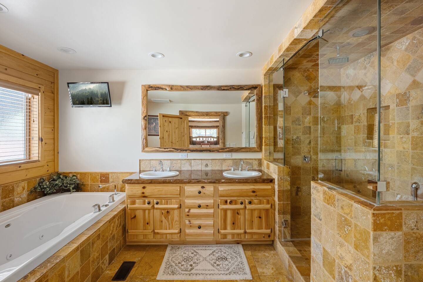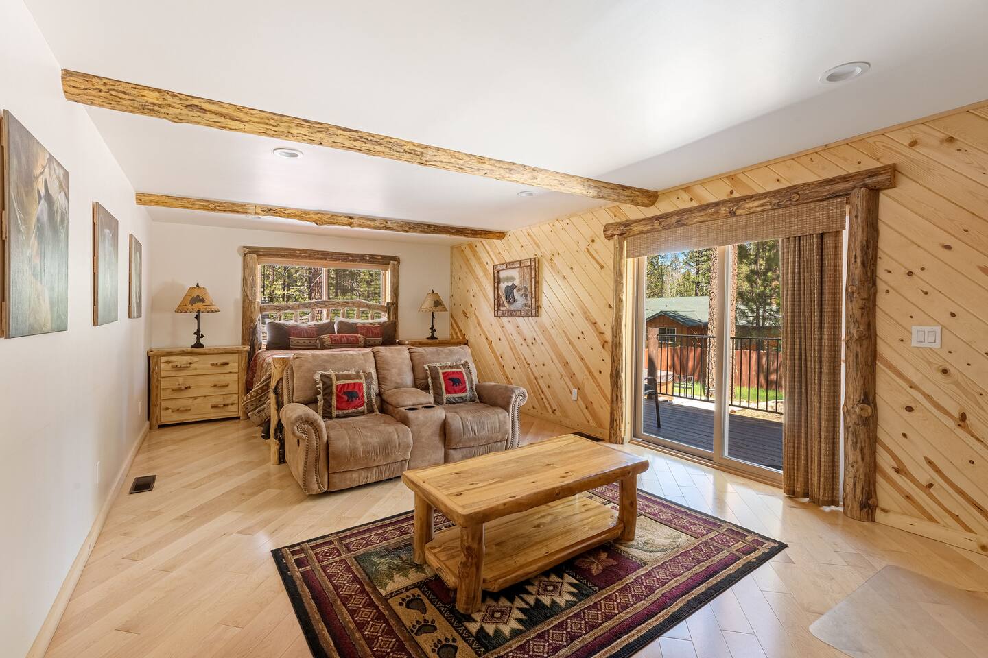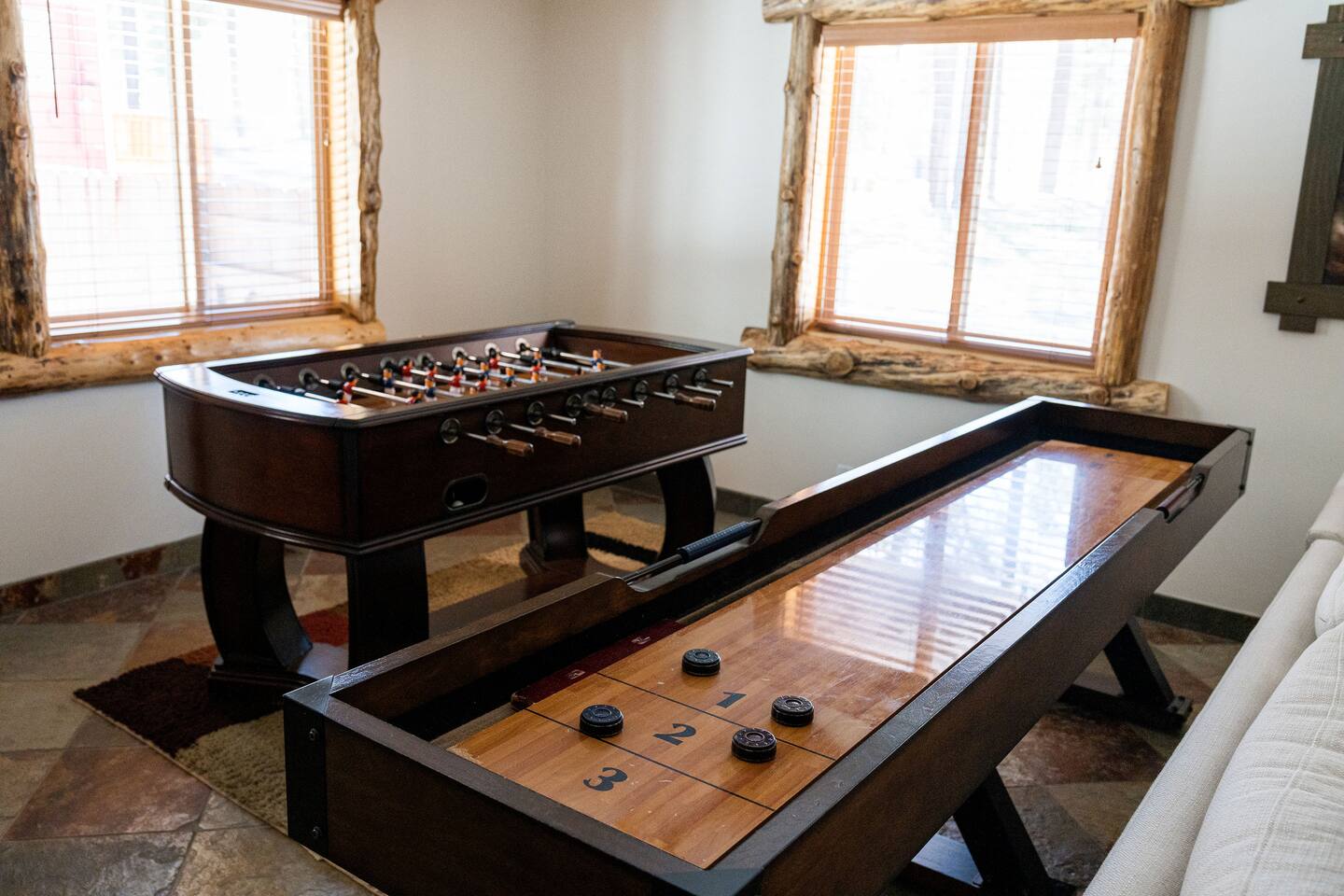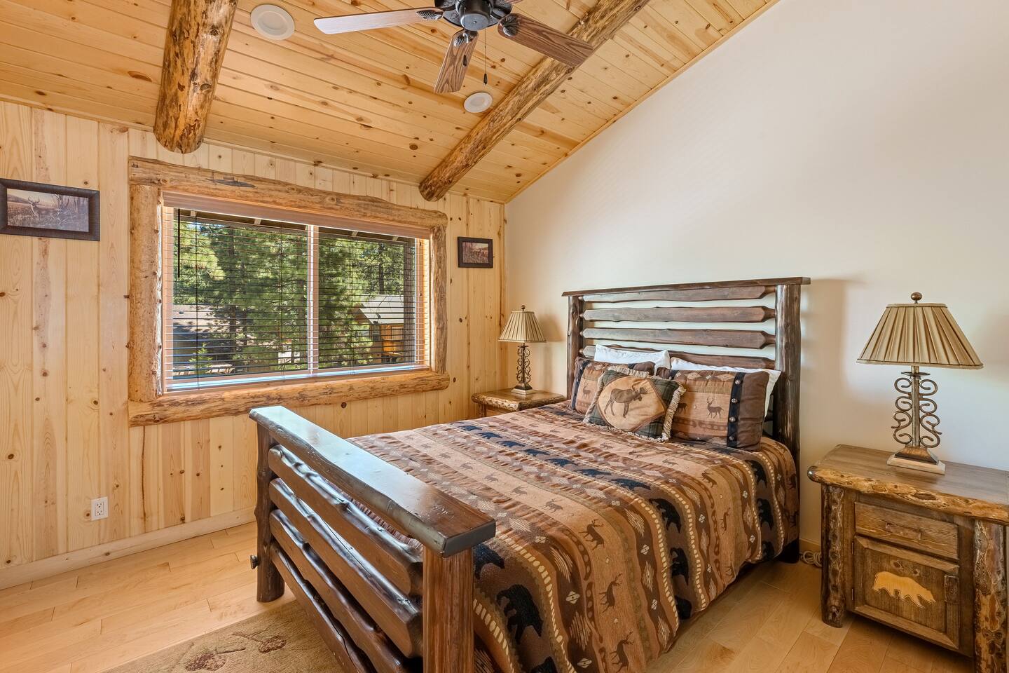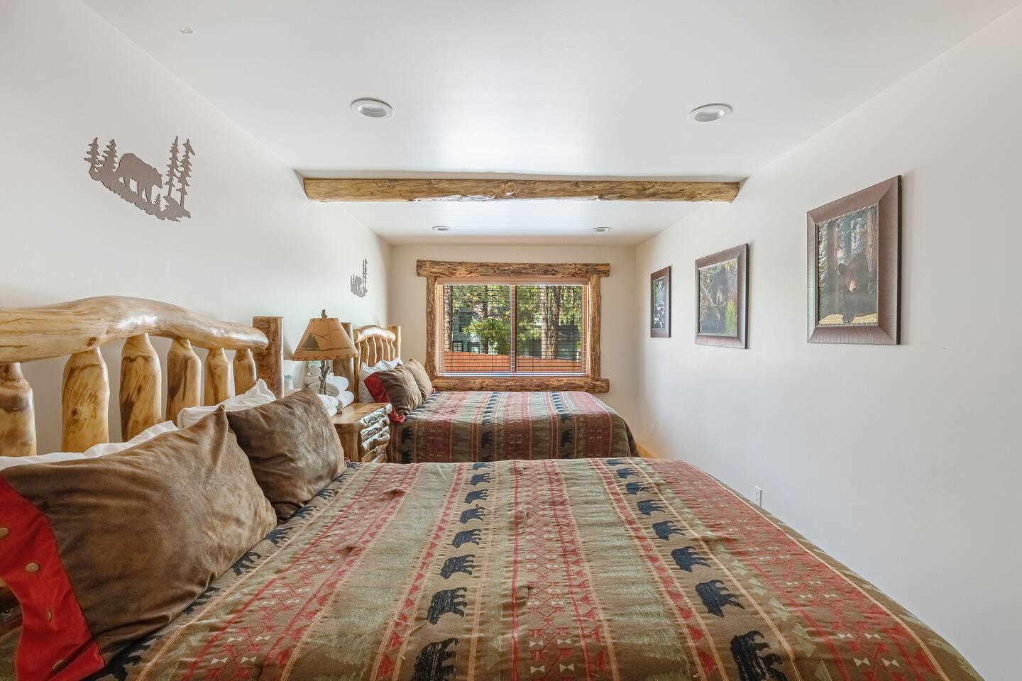 Welcome to Silver Fox Cabin! Tucked among the towering pines of Big Bear’s peaceful Fox Farm neighborhood, Silver Fox Cabin is a spectacular luxury retreat designed for unforgettable mountain getaways. With 2 spacious levels, 6 beautifully appointed bedrooms, and 4 full bathrooms, this grand cabin offers plenty of room for families and friends to relax, reconnect, and make lasting memories. Whether you're gathering around the fireplace after a day on the slopes or enjoying a lively evening in one of the game rooms, Silver Fox Cabin delivers comfort, style, and entertainment at every turn. Inside, the home blends rustic mountain charm with upscale amenities. The open-concept upper level features a warm and inviting living room with a cozy gas fireplace and large TV that’s perfect for movie nights or quiet mornings with coffee. Just steps away, the fully stocked gourmet kitchen makes it easy to cook for a crowd, with stainless steel appliances, a gas range, and both Keurig and classic drip coffee makers to start your day right. The adjacent dining area and breakfast bar provide plenty of seating, while the wraparound deck invites guests to step outside and enjoy fresh mountain air while grilling or dining under the trees. Silver Fox Cabin is designed for fun as much as relaxation. The 2 dedicated game rooms provide entertainment for every age, featuring a pool table, foosball table, shuffleboard, comfortable seating areas, and multiple TVs with Roku. After a day of adventure, guests can retreat to one of the cabin’s spacious bedrooms including 2 luxurious primary suites with ensuite bathrooms offering comfortable beds, cozy seating, and quiet spaces to unwind. The kitchen is fully-stocked and all bedding & linens are provided by our professional cleaning crew. Guests have access to free high speed Wi-Fi, TVs with Roku, & countless upscale amenities. The outdoor space truly makes Silver Fox Cabin stand out. Set on a fully fenced half-acre property, the backyard feels like a private mountain playground. Guests can soak beneath the stars in the hot tub, challenge friends to a game on the full basketball court or beach volleyball court, or relax with corn-hole and horseshoes in the fresh alpine air. The upper deck is perfect for outdoor dining and barbecues, while the spacious yard offers plenty of room for pets and kids to play. Perfectly located just minutes from Big Bear’s best attractions, Silver Fox Cabin makes it easy to enjoy everything the area has to offer. Bear Mountain and Snow Summit ski resorts are only a short drive away, and Big Bear Village with its charming shops, restaurants, and lakefront activities is just a 6-8 minute car ride from the cabin. From hiking and biking in the summer to skiing and snowboarding in the winter, adventure is always close by. Whether you're planning a family reunion, a getaway with friends, or a mountain escape with your pets, Silver Fox Cabin offers the perfect blend of luxury, comfort, and recreation as your own private lodge in the heart of Big Bear. ========== LOCATION For your convenience, Silver Fox Cabin is in the upscale Fox Farm neighborhood of Big Bear & perfectly located just minutes from tons of activities including hiking, golfing, skiing, biking, swimming, & more. This grand retreat is 2.2 miles from Bear Mountain, 1.6 miles from Snow Summit, and a quick 6-8 minute drive to Big Bear Village downtown shops & restaurants. ========== ROOM DESCRIPTIONS * LIVING ROOM: The beautiful living room is located on the upper level and has a gas fireplace, an LG TV with Roku, a sofa, skylights, a ceiling fan, and additional seating for guests. * KITCHEN: The gourmet kitchen is located on the upper level. It has stainless steel appliances, cooking basics, a spice rack, a Keurig coffee maker, a classic drip style coffee maker, and access to the wraparound deck. Appliances include a dishwasher, a refrigerator, a freezer with an ice maker, a toaster, an LG microwave, a Ninja blender, a food processor, a crock pot, barbecue tools, and a DCS by Fisher & Paykel gas range (oven and stove) with a griddle. The island has a prep sink and a breakfast bar with stool seats for guests. * DINING AREA: The open-concept dining area is located on the upper level and offers access to the wraparound deck. It has a rustic dining table with seating for 8 guests. * GAME ROOM #1: The upper level game room has a pool table, guest seating, a bar top table with stools, a ceiling fan, and a 60” LG TV with Roku. * GAME ROOM #2: The lower level game room with a sectional sofa, a 72” Samsung Smart TV, seating areas with 8 stools, a foosball table, a shuffleboard table, and access to the outdoor full basketball court. * LAUNDRY ROOM: This laundry room is located on the lower level near Game Room #2. It has a full size washer and a full size dryer for guest use. ========== BEDROOM DESCRIPTIONS This cabin has 6 bedrooms. It has 2 primary suites with ensuite bathrooms. The first primary suite is located on the upper level and the second primary suite is located on the lower level. * BEDROOM #1 (Primary Suite): This primary suite on the upper level has 1 king bed, a ceiling fan, a TV with Roku, a dresser, 2 chairs, and an ensuite bathroom (Bathroom #1). * BEDROOM #2: This bedroom on the upper level has 1 queen bed, a closet, built-in shelves, wood floor, and a ceiling fan. * BEDROOM #3 (Bunk Bed Room): This bedroom on the upper level has 1 queen bed, dresser, 1 bunk bed (1 twin bed over 1 queen bed), a closet, a ceiling fan, and an LG TV with Roku. * BEDROOM #4: This bedroom on the lower level has 1 full bed, wood floor, and a closet. * BEDROOM #5: This bedroom on the lower level has 2 queen beds and a closet. * BEDROOM #6 (Primary Suite): This primary suite on the lower level has 1 king bed, a loveseat with 2 recliners, a closet, a TV, a desk, and an ensuite bathroom (Bathroom #4). ========== BATHROOMS DESCRIPTIONS This cabin has 4 full bathrooms. * BATHROOM #1: This full 