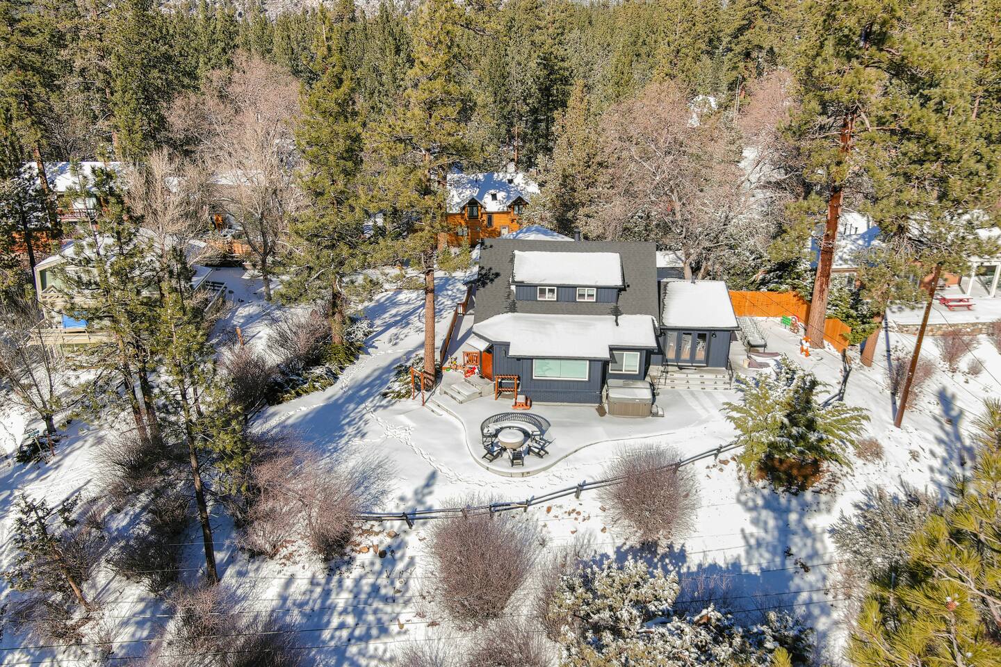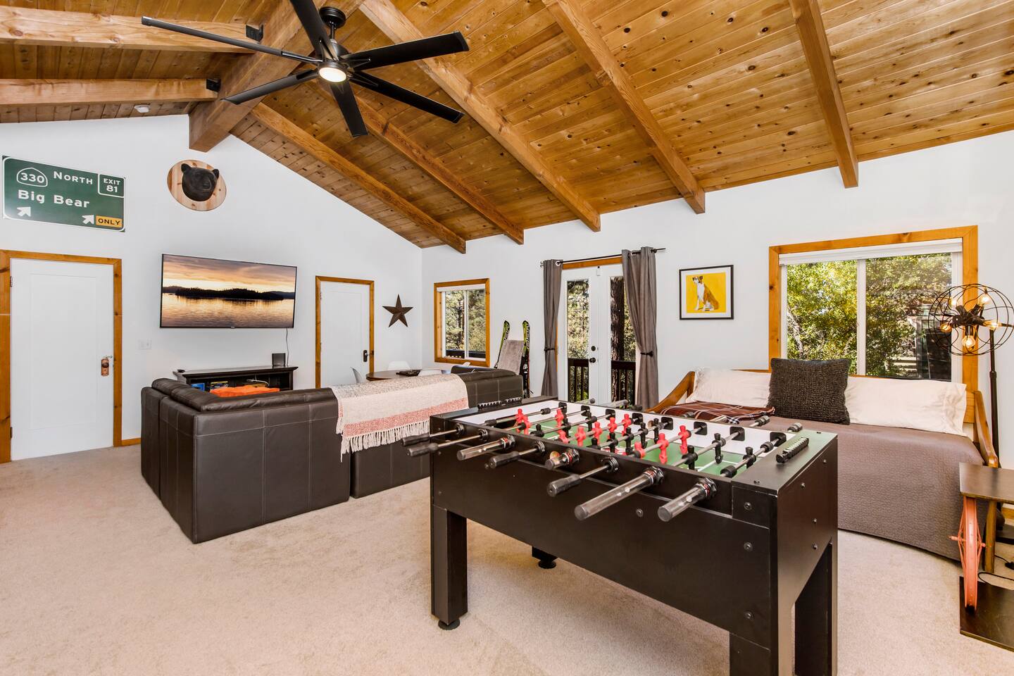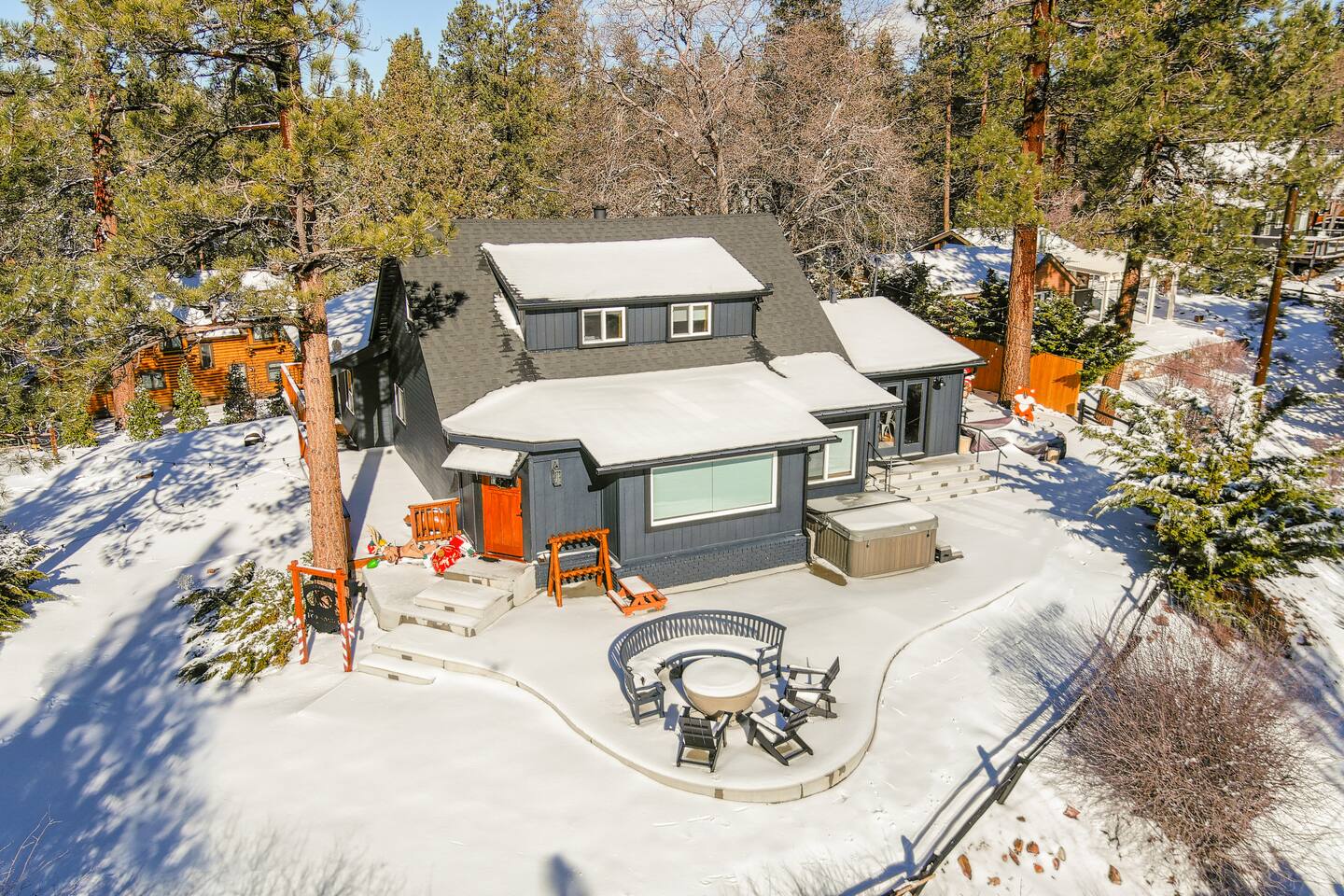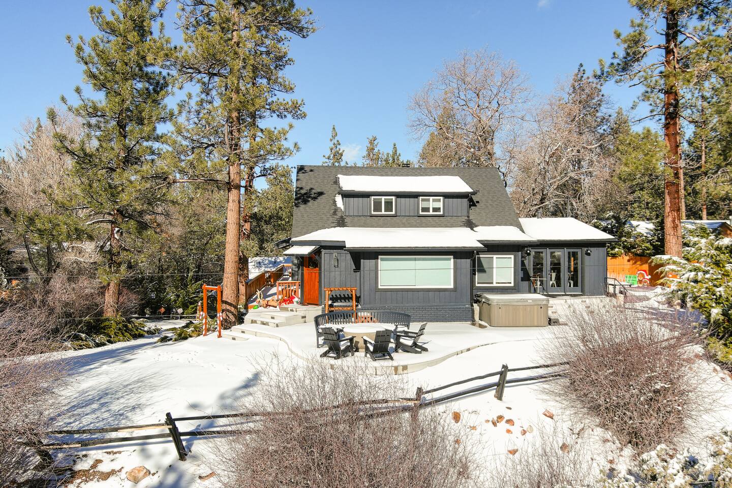 Welcome to Fox Haus! Fox Haus is a charming 2,400+ sq. ft. cabin in Moonridge has 2 levels, 4 bedrooms, & 3 full bathrooms. This spectacular cabin was recently remodeled with modern amenities and stylish decor that preserves its original vintage character. Beautiful details include hardwood floors throughout, sloped hand trolled ceilings, original keyhole doors, coffered ceilings, & vintage tile work. The amazing outdoor space has a propane fire pit, a big hot tub, and dining table with Edison lights. These unique, charming details bring so much warmth and character to this cabin, giving it a true mountain retreat feel that makes it stand out! This gorgeous retreat has a wood-burning fireplace, game room with a foosball table, hot tub for 7, & gorgeous views of both ski resorts. The kitchen is fully-stocked and all bedding & linens are provided by our professional cleaning crew. Amenities include free high speed Wi-Fi, TVs with streaming services, laundry room, play area for kids, & more. Fox Haus is the perfect choice for a romantic getaway, a business retreat, or a fun family destination. -------------------- OCCUPANCY Big Bear Lake local ordinance 99.300 limits maximum occupancy to 12 people (10 adults max) & 4 parked cars for Fox Haus. Please note that children, toddlers, and infants do count as a person. Please do not book or arrive with more than the maximum or you could be fined from the city and evicted with no money back. -------------------- DOGS Dogs always stay for free at Fox Haus! We welcome a maximum of 2 dogs. -------------------- LOCATION For your convenience, Fox Haus is located in the Lower Moonridge area of Big Bear & perfectly located just minutes from tons of activities including hiking, golfing, skiing, biking, swimming, & more. This retreat is 2.3 miles from Bear Mountain, 2 miles from Snow Summit, 1.2 miles from Alpine Zoo, & a quick 8-10 minute drive to Big Bear Village downtown shops & restaurants. -------------------- ROOMS Living Room *** There is NO TV in the living room. Instead, each bedroom has a TV, including a 65" TV in the bunk bedroom/den. * The living room is light and bright with three large picture windows with panoramic views of the mountainside, trees, and ski slopes. * Desk with mountain views – a perfect place to work remotely and/or online learning. (Fast WiFi speed!) * Little library with assorted books for our guests that love to read. * Separate dining area with a long wooden table that sits 8 for family meals or game nights. * A wood-burning fireplace anchors the room for cozy nights by the fire. There is central heat throughout. Room fans are provided during the summer months. ------------ Kitchen * Spacious and fully stocked with dinnerware, utensils, good quality pots, and pans. * Everything you would need to cook a big family meal. Basic spices provided. * All new Kitchen Aid appliances. * Kitchen table with additional seating for 4. * Coffee Bar - Keurig/ full drip coffee maker/French Press/lots of mugs. Coffee pods & sugar provided. * Pre-stocked with paper towels/dish soap/dishwasher tabs/ sponges/garbage bags. * There is a mudroom off the kitchen to hang coats/store adventure gear with attached laundry room with full-size washer and dryer. We even provide laundry pods/fabric sheets for our guest’s convenience. ------------ BATHROOMS * The cabin has three recently remodeled full bathrooms—two on the main level and one upstairs. Shampoo, conditioner, body wash, hand soap, and hairdryers are provided in all bathrooms. ---------------- BEDROOMS Fox Haus has 4 bedrooms. * Bedroom #1: This upstairs bedroom has 2 beds and can sleep up to 3 people. It has 1 queen bed, hardwood floor, a smart TV, a dresser, & 1 pull-out sofa bed (twin). * Bedroom #2 (Bunk Bed & Game Room): This big downstairs bedroom has 6 beds and can sleep up to 8 people. It features a 65” Roku Smart TV (Netflix, Apple TV, Hulu), a dedicated game table for 4, a foosball table, beamed vaulted ceilings, & charging stations. This large bedroom has 4 full size beds and 2 twin size beds. The top beds of the bunk-beds each have a maximum weight of 185 lbs. Bed #1-A: 1 bunk-bed (1 full over 1 full) Bed #1-B: 1 bunk-bed (1 full over 1 full) Bed #1-C: 1 daybed (1 twin) Bed #1-D: 1 daybed with pull-out trundle bed (1 twin) * Bedroom #3: This upstairs bedroom has 1 bed and can sleep up to 2 people. It has 1 queen bed, dresser, a smart TV, & beautiful mountain views. * Bedroom #4: This bedroom has 1 single (twin) bed and hardwood floors. -------------- Outside Amenities Our cabin is on an over 14,000 sq foot lot. (Over 1/3 of an acre) Plenty of usable flat areas both in front and back of the home for exploring and outside play. The front concrete area is an entertainer’s delight, faces mountains and ski resorts so guests can enjoy amazing views and star-filled nights. Stargaze from our brand new 7 seat Jacuzzi hot tub. Natural gas concrete fire pit with wrap-around seating. S'mores anyone? Outside sectional sofa lounge area for relaxing in the fresh mountain air. Outside dining table (seats 12). Overhead string lights for extra ambiance. Flat area for outside games. Wrap around deck has an area with a gas BBQ and prep table to whip up a feast. Back Area Plenty of flat outdoor areas for exploring, outside games, snow play, and sledding. Some outdoor games that we try to provide: * Corn Hole / Bean Bag Toss * Giant Jenga * Croquet * Tic Tac Toe (If any of these games are damaged or missing due to previous guests, we apologize for the inconvenience.) The Fox Haus is family and kid-friendly. We would love for your children to make everlasting memories at our cabin. We provide for our littlest guests: Our super cute playroom (Camp Fox) High Chair Pack and play with sheets. Kids plates/bowls and utensils. Assorted kids books and games. -------------------- RULES Please note that we do not allow parties. Quiet hours in Big Bear Lake are 10 PM to 7 AM so no noise may leave your pro