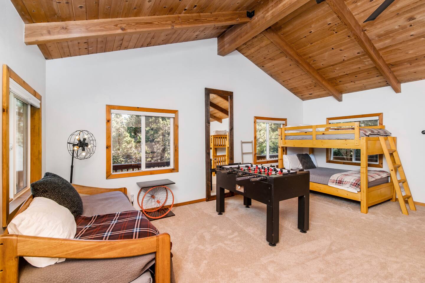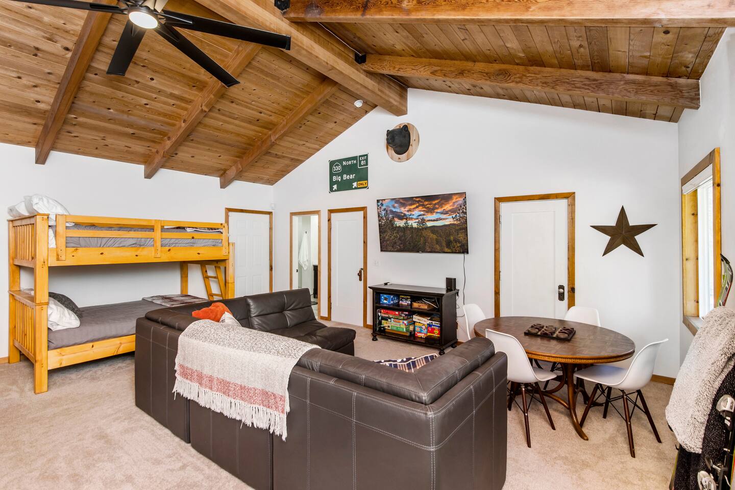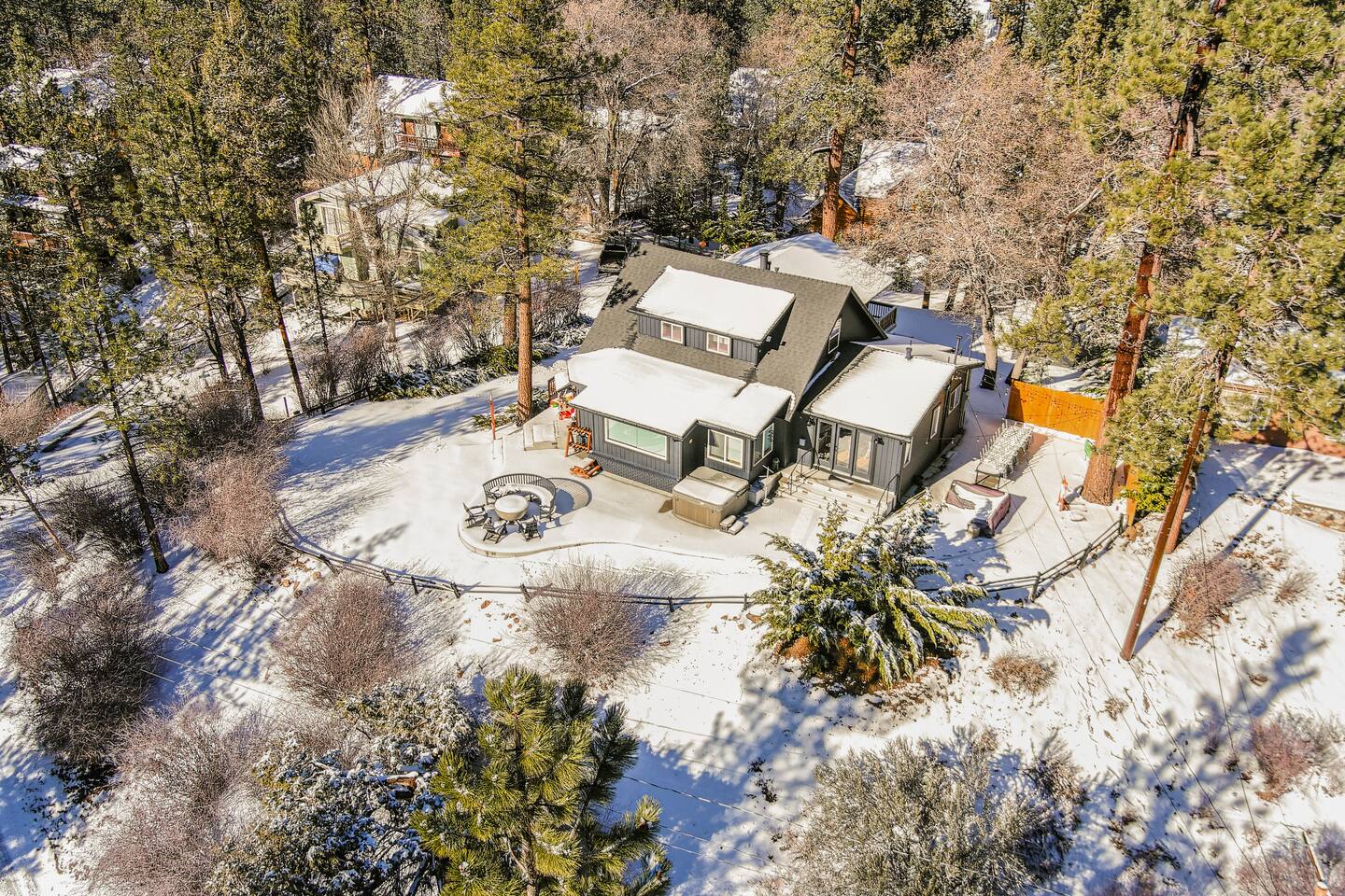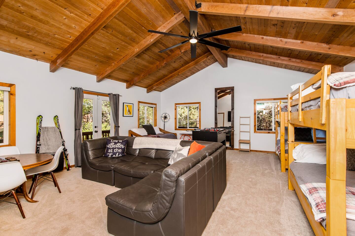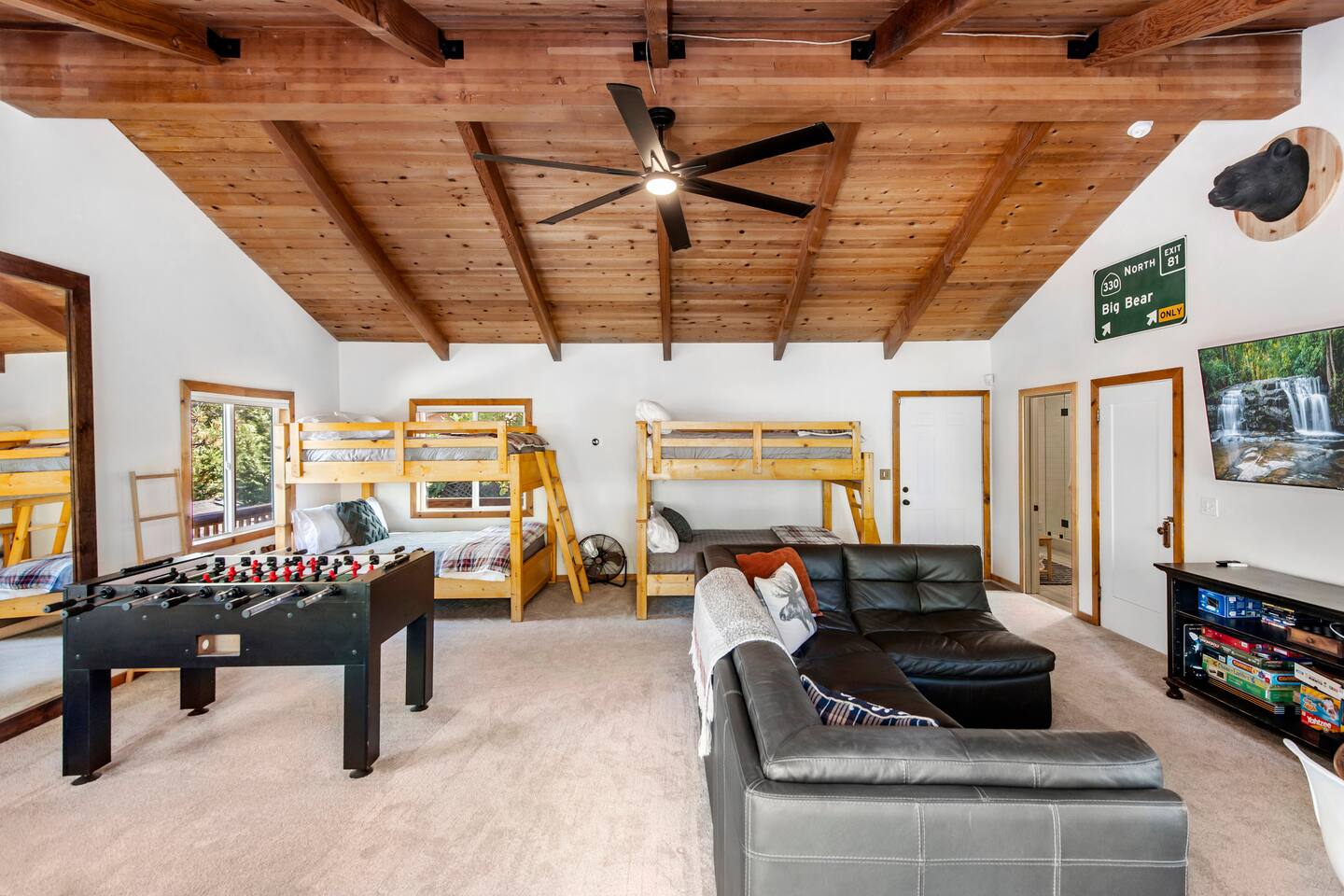 Welcome to Fox Haus! Fox Haus is a charming 2,400+ sq. ft. cabin in Moonridge has 2 levels, 4 bedrooms, & 3 full bathrooms. This spectacular cabin was recently remodeled with modern amenities and stylish decor that preserves its original vintage character. Beautiful details include hardwood floors throughout, sloped hand trolled ceilings, original keyhole doors, coffered ceilings, & vintage tile work. The amazing outdoor space has a propane fire pit, a big hot tub, and dining table with Edison lights. These unique, charming details bring so much warmth and character to this cabin, giving it a true mountain retreat feel that makes it stand out! This gorgeous retreat has a wood-burning fireplace, game room with a foosball table, hot tub for 7, & gorgeous views of both ski resorts. The kitchen is fully-stocked and all bedding & linens are provided by our professional cleaning crew. Amenities include free high speed Wi-Fi, TVs with streaming services, laundry room, play area for kids, & more. Fox Haus is the perfect choice for a romantic getaway, a business retreat, or a fun family destination. -------------------- OCCUPANCY Big Bear Lake local ordinance 99.300 limits maximum occupancy to 12 people (10 adults max) & 4 parked cars for Fox Haus. Please note that children, toddlers, and infants do count as a person. Please do not book or arrive with more than the maximum or you could be fined from the city and evicted with no money back. -------------------- DOGS Dogs always stay for free at Fox Haus! We welcome a maximum of 2 dogs. -------------------- LOCATION For your convenience, Fox Haus is located in the Lower Moonridge area of Big Bear & perfectly located just minutes from tons of activities including hiking, golfing, skiing, biking, swimming, & more. This retreat is 2.3 miles from Bear Mountain, 2 miles from Snow Summit, 1.2 miles from Alpine Zoo, & a quick 8-10 minute drive to Big Bear Village downtown shops & restaurants. -------------------- ROOMS Living Room *** There is NO TV in the living room. Instead, each bedroom has a TV, including a 65" TV in the bunk bedroom/den. * The living room is light and bright with three large picture windows with panoramic views of the mountainside, trees, and ski slopes. * Desk with mountain views – a perfect place to work remotely and/or online learning. (Fast WiFi speed!) * Little library with assorted books for our guests that love to read. * Separate dining area with a long wooden table that sits 8 for family meals or game nights. * A wood-burning fireplace anchors the room for cozy nights by the fire. There is central heat throughout. Room fans are provided during the summer months. ------------ Kitchen * Spacious and fully stocked with dinnerware, utensils, good quality pots, and pans. * Everything you would need to cook a big family meal. Basic spices provided. * All new Kitchen Aid appliances. * Kitchen table with additional seating for 4. * Coffee Bar - Keurig/ full drip coffee maker/French Press/lots of mugs. Coffee pods & sugar provided. * Pre-stocked with paper towels/dish soap/dishwasher tabs/ sponges/garbage bags. * There is a mudroom off the kitchen to hang coats/store adventure gear with attached laundry room with full-size washer and dryer. We even provide laundry pods/fabric sheets for our guest’s convenience. ------------ BATHROOMS * The cabin has three recently remodeled full bathrooms—two on the main level and one upstairs. Shampoo, conditioner, body wash, hand soap, and hairdryers are provided in all bathrooms. ---------------- BEDROOMS Fox Haus has 4 bedrooms. * Bedroom #1: This upstairs bedroom has 2 beds and can sleep up to 3 people. It has 1 queen bed, hardwood floor, a smart TV, a dresser, & 1 pull-out sofa bed (twin). * Bedroom #2 (Bunk Bed & Game Room): This big downstairs bedroom has 6 beds and can sleep up to 8 people. It features a 65” Roku Smart TV (Netflix, Apple TV, Hulu), a dedicated game table for 4, a foosball table, beamed vaulted ceilings, & charging stations. This large bedroom has 4 full size beds and 2 twin size beds. The top beds of the bunk-beds each have a maximum weight of 185 lbs. Bed #1-A: 1 bunk-bed (1 full over 1 full) Bed #1-B: 1 bunk-bed (1 full over 1 full) Bed #1-C: 1 daybed (1 twin) Bed #1-D: 1 daybed with pull-out trundle bed (1 twin) * Bedroom #3: This upstairs bedroom has 1 bed and can sleep up to 2 people. It has 1 queen bed, dresser, a smart TV, & beautiful mountain views. * Bedroom #4: This bedroom has 1 single (twin) bed and hardwood floors. -------------- Outside Amenities Our cabin is on an over 14,000 sq foot lot. (Over 1/3 of an acre) Plenty of usable flat areas both in front and back of the home for exploring and outside play. The front concrete area is an entertainer’s delight, faces mountains and ski resorts so guests can enjoy amazing views and star-filled nights. Stargaze from our brand new 7 seat Jacuzzi hot tub. Natural gas concrete fire pit with wrap-around seating. S'mores anyone? Outside sectional sofa lounge area for relaxing in the fresh mountain air. Outside dining table (seats 12). Overhead string lights for extra ambiance. Flat area for outside games. Wrap around deck has an area with a gas BBQ and prep table to whip up a feast. Back Area Plenty of flat outdoor areas for exploring, outside games, snow play, and sledding. Some outdoor games that we try to provide: * Corn Hole / Bean Bag Toss * Giant Jenga * Croquet * Tic Tac Toe (If any of these games are damaged or missing due to previous guests, we apologize for the inconvenience.) The Fox Haus is family and kid-friendly. We would love for your children to make everlasting memories at our cabin. We provide for our littlest guests: Our super cute playroom (Camp Fox) High Chair Pack and play with sheets. Kids plates/bowls and utensils. Assorted kids books and games. -------------------- RULES Please note that we do not allow parties. Quiet hours in Big Bear Lake are 10 PM to 7 AM so no noise may leave your pro
