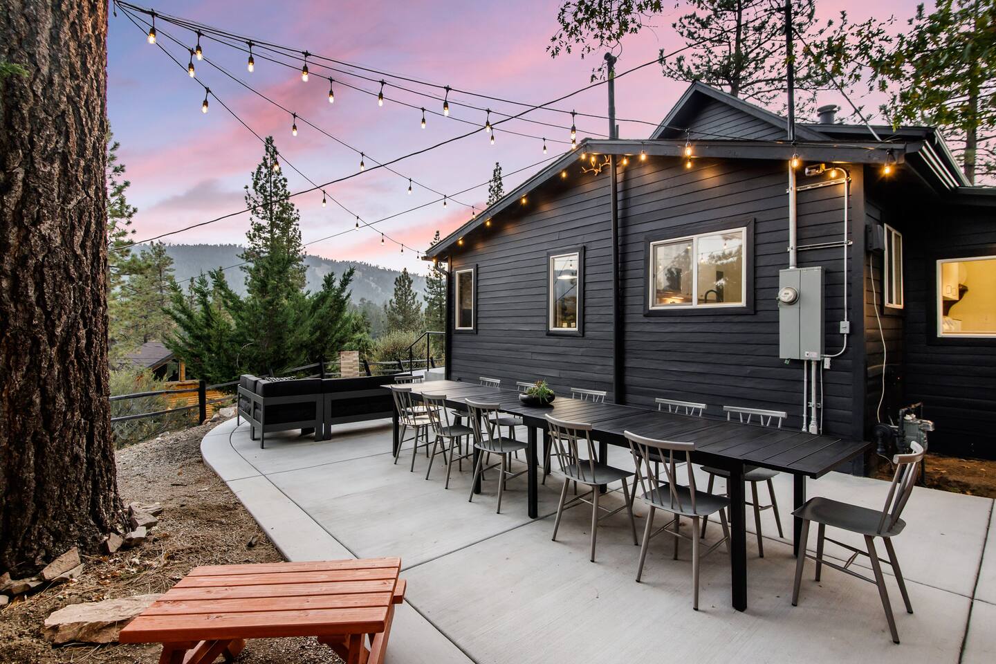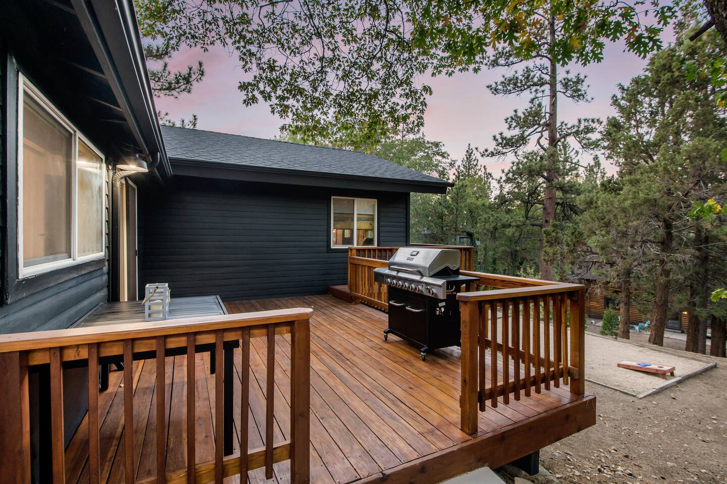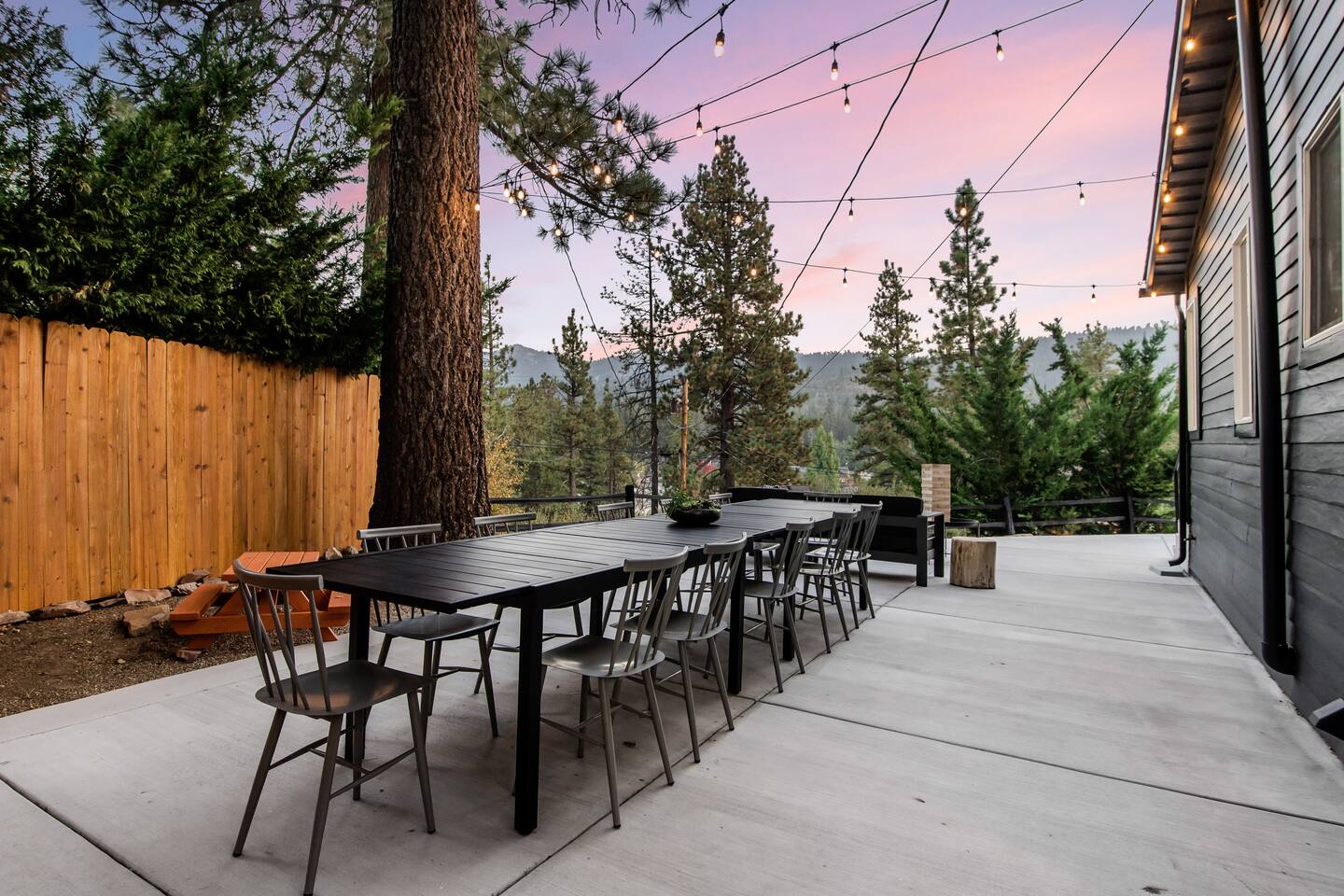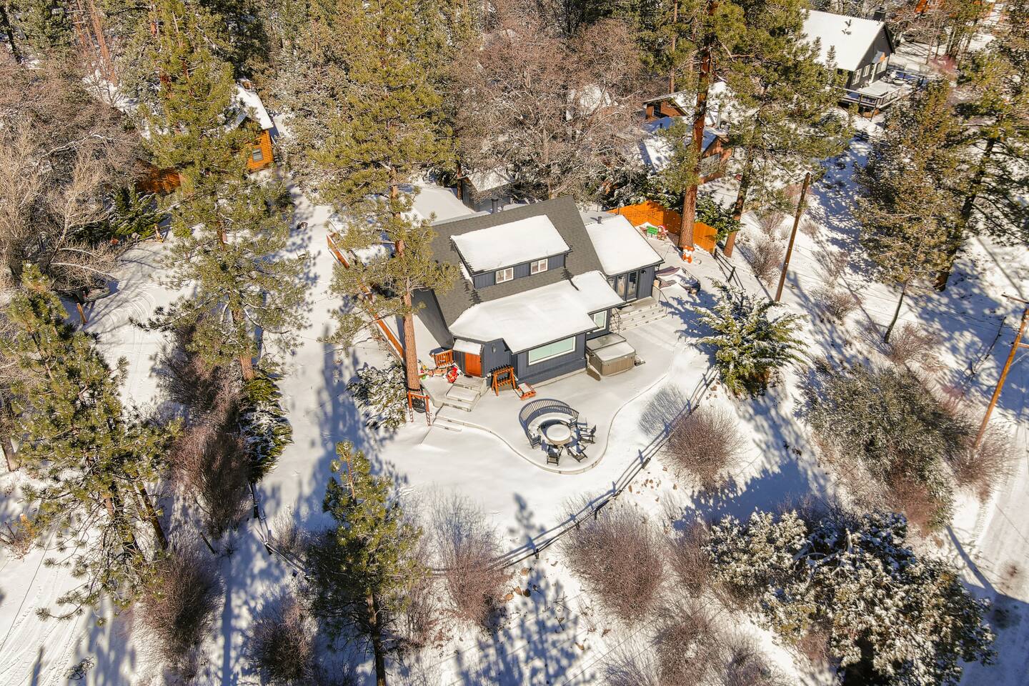Welcome to Fox Haus! Fox Haus is a charming 2,400+ sq. ft. cabin in Moonridge has 2 levels, 4 bedrooms, & 3 full bathrooms. This spectacular cabin was recently remodeled with modern amenities and stylish decor that preserves its original vintage character. Beautiful details include hardwood floors throughout, sloped hand trolled ceilings, original keyhole doors, coffered ceilings, & vintage tile work. The amazing outdoor space has a propane fire pit, a big hot tub, and dining table with Edison lights. These unique, charming details bring so much warmth and character to this cabin, giving it a true mountain retreat feel that makes it stand out! This gorgeous retreat has a wood-burning fireplace, game room with a foosball table, hot tub for 7, & gorgeous views of both ski resorts. The kitchen is fully-stocked and all bedding & linens are provided by our professional cleaning crew. Amenities include free high speed Wi-Fi, TVs with streaming services, laundry room, play area for kids, & more. Fox Haus is the perfect choice for a romantic getaway, a business retreat, or a fun family destination. -------------------- OCCUPANCY Big Bear Lake local ordinance 99.300 limits maximum occupancy to 12 people (10 adults max) & 4 parked cars for Fox Haus. Please note that children, toddlers, and infants do count as a person. Please do not book or arrive with more than the maximum or you could be fined from the city and evicted with no money back. -------------------- DOGS Dogs always stay for free at Fox Haus! We welcome a maximum of 2 dogs. -------------------- LOCATION For your convenience, Fox Haus is located in the Lower Moonridge area of Big Bear & perfectly located just minutes from tons of activities including hiking, golfing, skiing, biking, swimming, & more. This retreat is 2.3 miles from Bear Mountain, 2 miles from Snow Summit, 1.2 miles from Alpine Zoo, & a quick 8-10 minute drive to Big Bear Village downtown shops & restaurants. -------------------- ROOMS Living Room *** There is NO TV in the living room. Instead, each bedroom has a TV, including a 65" TV in the bunk bedroom/den. * The living room is light and bright with three large picture windows with panoramic views of the mountainside, trees, and ski slopes. * Desk with mountain views – a perfect place to work remotely and/or online learning. (Fast WiFi speed!) * Little library with assorted books for our guests that love to read. * Separate dining area with a long wooden table that sits 8 for family meals or game nights. * A wood-burning fireplace anchors the room for cozy nights by the fire. There is central heat throughout. Room fans are provided during the summer months. ------------ Kitchen * Spacious and fully stocked with dinnerware, utensils, good quality pots, and pans. * Everything you would need to cook a big family meal. Basic spices provided. * All new Kitchen Aid appliances. * Kitchen table with additional seating for 4. * Coffee Bar - Keurig/ full drip coffee maker/French Press/lots of mugs. Coffee pods & sugar provided. * Pre-stocked with paper towels/dish soap/dishwasher tabs/ sponges/garbage bags. * There is a mudroom off the kitchen to hang coats/store adventure gear with attached laundry room with full-size washer and dryer. We even provide laundry pods/fabric sheets for our guest’s convenience. ------------ BATHROOMS * The cabin has three recently remodeled full bathrooms—two on the main level and one upstairs. Shampoo, conditioner, body wash, hand soap, and hairdryers are provided in all bathrooms. ---------------- BEDROOMS Fox Haus has 4 bedrooms. * Bedroom #1: This upstairs bedroom has 2 beds and can sleep up to 3 people. It has 1 queen bed, hardwood floor, a smart TV, a dresser, & 1 pull-out sofa bed (twin). * Bedroom #2 (Bunk Bed & Game Room): This big downstairs bedroom has 6 beds and can sleep up to 8 people. It features a 65” Roku Smart TV (Netflix, Apple TV, Hulu), a dedicated game table for 4, a foosball table, beamed vaulted ceilings, & charging stations. This large bedroom has 4 full size beds and 2 twin size beds. The top beds of the bunk-beds each have a maximum weight of 185 lbs. Bed #1-A: 1 bunk-bed (1 full over 1 full) Bed #1-B: 1 bunk-bed (1 full over 1 full) Bed #1-C: 1 daybed (1 twin) Bed #1-D: 1 daybed with pull-out trundle bed (1 twin) * Bedroom #3: This upstairs bedroom has 1 bed and can sleep up to 2 people. It has 1 queen bed, dresser, a smart TV, & beautiful mountain views. * Bedroom #4: This bedroom has 1 single (twin) bed and hardwood floors. -------------- Outside Amenities Our cabin is on an over 14,000 sq foot lot. (Over 1/3 of an acre) Plenty of usable flat areas both in front and back of the home for exploring and outside play. The front concrete area is an entertainer’s delight, faces mountains and ski resorts so guests can enjoy amazing views and star-filled nights. Stargaze from our brand new 7 seat Jacuzzi hot tub. Natural gas concrete fire pit with wrap-around seating. S'mores anyone? Outside sectional sofa lounge area for relaxing in the fresh mountain air. Outside dining table (seats 12). Overhead string lights for extra ambiance. Flat area for outside games. Wrap around deck has an area with a gas BBQ and prep table to whip up a feast. Back Area Plenty of flat outdoor areas for exploring, outside games, snow play, and sledding. Some outdoor games that we try to provide: * Corn Hole / Bean Bag Toss * Giant Jenga * Croquet * Tic Tac Toe (If any of these games are damaged or missing due to previous guests, we apologize for the inconvenience.) The Fox Haus is family and kid-friendly. We would love for your children to make everlasting memories at our cabin. We provide for our littlest guests: Our super cute playroom (Camp Fox) High Chair Pack and play with sheets. Kids plates/bowls and utensils. Assorted kids books and games. -------------------- RULES Please note that we do not allow parties. Quiet hours in Big Bear Lake are 10 PM to 7 AM so no noise may leave your pro