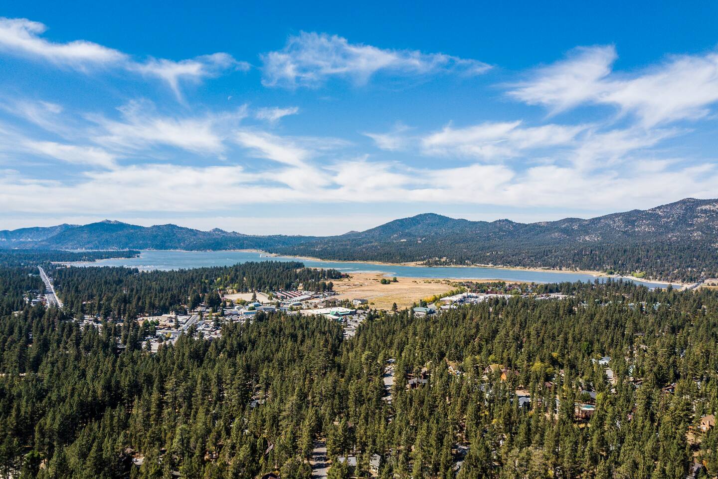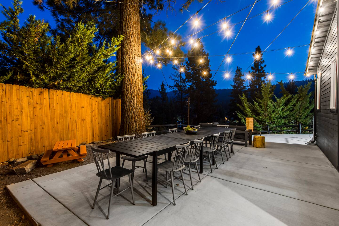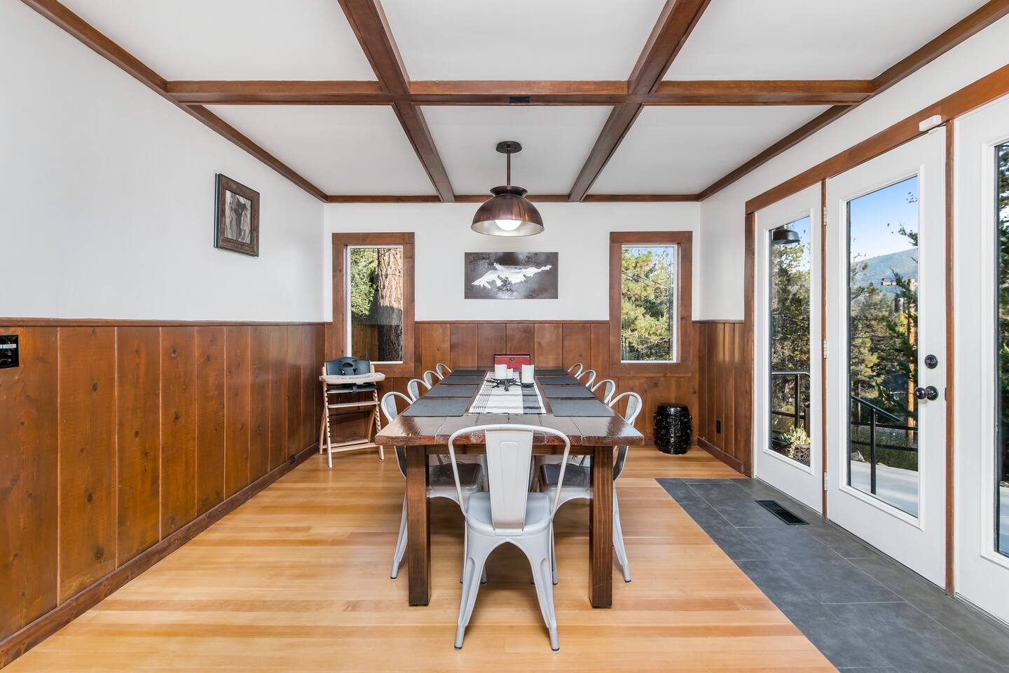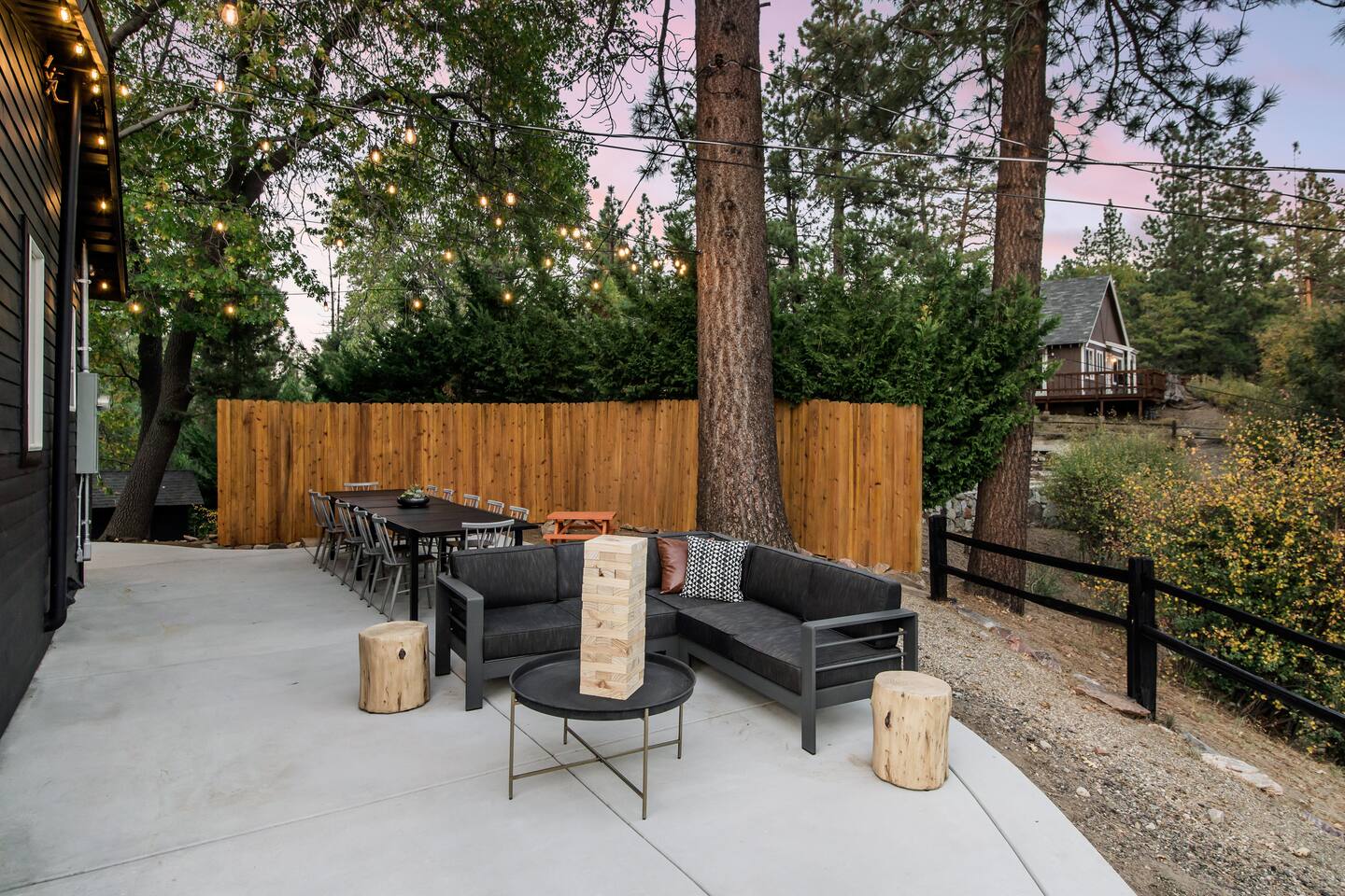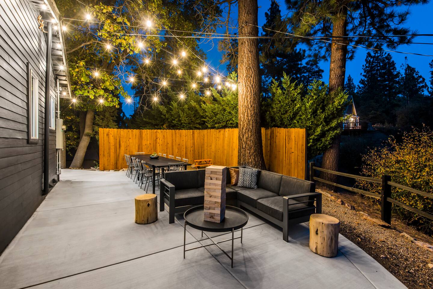 Welcome to Fox Haus! Fox Haus is a charming 2,400+ sq. ft. cabin in Moonridge has 2 levels, 4 bedrooms, & 3 full bathrooms. This spectacular cabin was recently remodeled with modern amenities and stylish decor that preserves its original vintage character. Beautiful details include hardwood floors throughout, sloped hand trolled ceilings, original keyhole doors, coffered ceilings, & vintage tile work. The amazing outdoor space has a propane fire pit, a big hot tub, and dining table with Edison lights. These unique, charming details bring so much warmth and character to this cabin, giving it a true mountain retreat feel that makes it stand out! This gorgeous retreat has a wood-burning fireplace, game room with a foosball table, hot tub for 7, & gorgeous views of both ski resorts. The kitchen is fully-stocked and all bedding & linens are provided by our professional cleaning crew. Amenities include free high speed Wi-Fi, TVs with streaming services, laundry room, play area for kids, & more. Fox Haus is the perfect choice for a romantic getaway, a business retreat, or a fun family destination. -------------------- OCCUPANCY Big Bear Lake local ordinance 99.300 limits maximum occupancy to 12 people (10 adults max) & 4 parked cars for Fox Haus. Please note that children, toddlers, and infants do count as a person. Please do not book or arrive with more than the maximum or you could be fined from the city and evicted with no money back. -------------------- DOGS Dogs always stay for free at Fox Haus! We welcome a maximum of 2 dogs. -------------------- LOCATION For your convenience, Fox Haus is located in the Lower Moonridge area of Big Bear & perfectly located just minutes from tons of activities including hiking, golfing, skiing, biking, swimming, & more. This retreat is 2.3 miles from Bear Mountain, 2 miles from Snow Summit, 1.2 miles from Alpine Zoo, & a quick 8-10 minute drive to Big Bear Village downtown shops & restaurants. -------------------- ROOMS Living Room *** There is NO TV in the living room. Instead, each bedroom has a TV, including a 65" TV in the bunk bedroom/den. * The living room is light and bright with three large picture windows with panoramic views of the mountainside, trees, and ski slopes. * Desk with mountain views – a perfect place to work remotely and/or online learning. (Fast WiFi speed!) * Little library with assorted books for our guests that love to read. * Separate dining area with a long wooden table that sits 8 for family meals or game nights. * A wood-burning fireplace anchors the room for cozy nights by the fire. There is central heat throughout. Room fans are provided during the summer months. ------------ Kitchen * Spacious and fully stocked with dinnerware, utensils, good quality pots, and pans. * Everything you would need to cook a big family meal. Basic spices provided. * All new Kitchen Aid appliances. * Kitchen table with additional seating for 4. * Coffee Bar - Keurig/ full drip coffee maker/French Press/lots of mugs. Coffee pods & sugar provided. * Pre-stocked with paper towels/dish soap/dishwasher tabs/ sponges/garbage bags. * There is a mudroom off the kitchen to hang coats/store adventure gear with attached laundry room with full-size washer and dryer. We even provide laundry pods/fabric sheets for our guest’s convenience. ------------ BATHROOMS * The cabin has three recently remodeled full bathrooms—two on the main level and one upstairs. Shampoo, conditioner, body wash, hand soap, and hairdryers are provided in all bathrooms. ---------------- BEDROOMS Fox Haus has 4 bedrooms. * Bedroom #1: This upstairs bedroom has 2 beds and can sleep up to 3 people. It has 1 queen bed, hardwood floor, a smart TV, a dresser, & 1 pull-out sofa bed (twin). * Bedroom #2 (Bunk Bed & Game Room): This big downstairs bedroom has 6 beds and can sleep up to 8 people. It features a 65” Roku Smart TV (Netflix, Apple TV, Hulu), a dedicated game table for 4, a foosball table, beamed vaulted ceilings, & charging stations. This large bedroom has 4 full size beds and 2 twin size beds. The top beds of the bunk-beds each have a maximum weight of 185 lbs. Bed #1-A: 1 bunk-bed (1 full over 1 full) Bed #1-B: 1 bunk-bed (1 full over 1 full) Bed #1-C: 1 daybed (1 twin) Bed #1-D: 1 daybed with pull-out trundle bed (1 twin) * Bedroom #3: This upstairs bedroom has 1 bed and can sleep up to 2 people. It has 1 queen bed, dresser, a smart TV, & beautiful mountain views. * Bedroom #4: This bedroom has 1 single (twin) bed and hardwood floors. -------------- Outside Amenities Our cabin is on an over 14,000 sq foot lot. (Over 1/3 of an acre) Plenty of usable flat areas both in front and back of the home for exploring and outside play. The front concrete area is an entertainer’s delight, faces mountains and ski resorts so guests can enjoy amazing views and star-filled nights. Stargaze from our brand new 7 seat Jacuzzi hot tub. Natural gas concrete fire pit with wrap-around seating. S'mores anyone? Outside sectional sofa lounge area for relaxing in the fresh mountain air. Outside dining table (seats 12). Overhead string lights for extra ambiance. Flat area for outside games. Wrap around deck has an area with a gas BBQ and prep table to whip up a feast. Back Area Plenty of flat outdoor areas for exploring, outside games, snow play, and sledding. Some outdoor games that we try to provide: * Corn Hole / Bean Bag Toss * Giant Jenga * Croquet * Tic Tac Toe (If any of these games are damaged or missing due to previous guests, we apologize for the inconvenience.) The Fox Haus is family and kid-friendly. We would love for your children to make everlasting memories at our cabin. We provide for our littlest guests: Our super cute playroom (Camp Fox) High Chair Pack and play with sheets. Kids plates/bowls and utensils. Assorted kids books and games. -------------------- RULES Please note that we do not allow parties. Quiet hours in Big Bear Lake are 10 PM to 7 AM so no noise may leave your pro