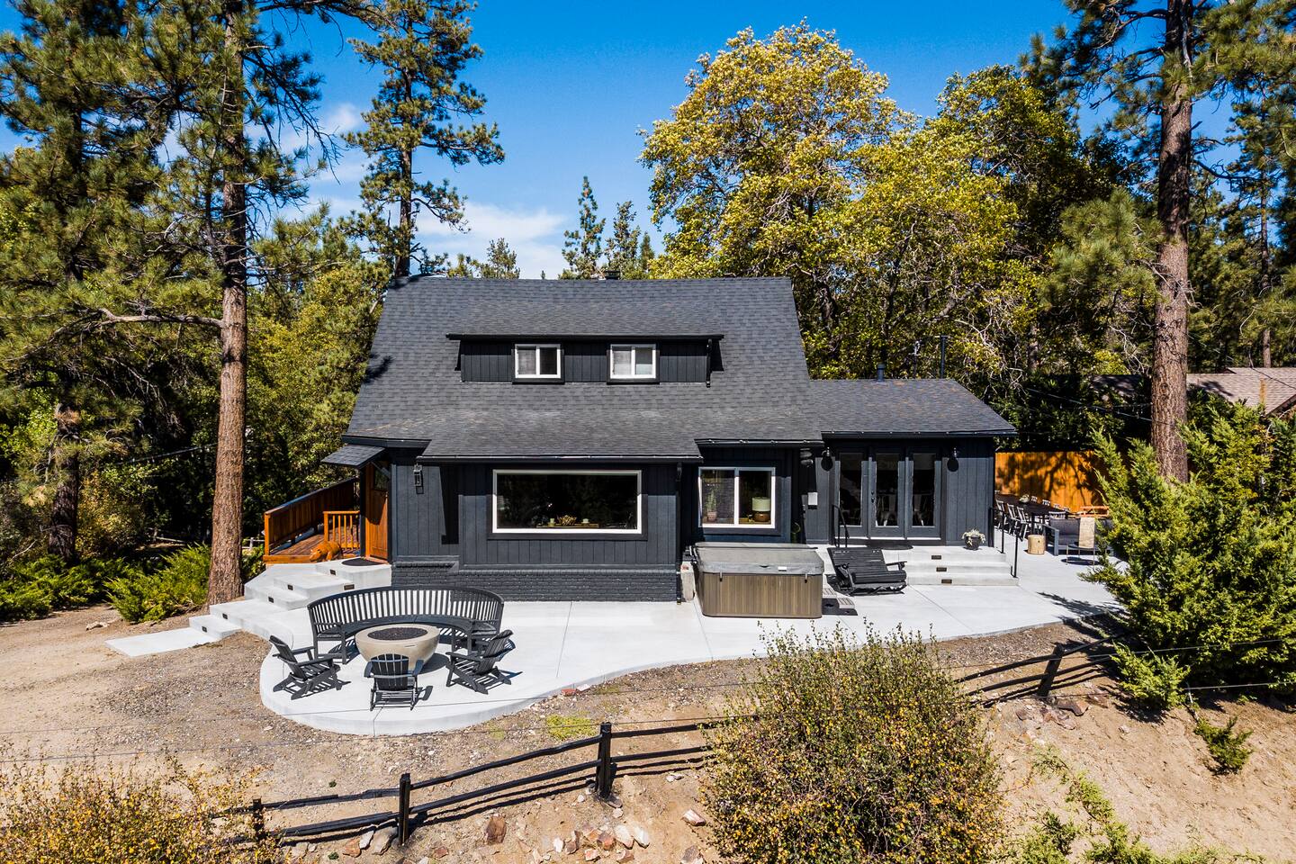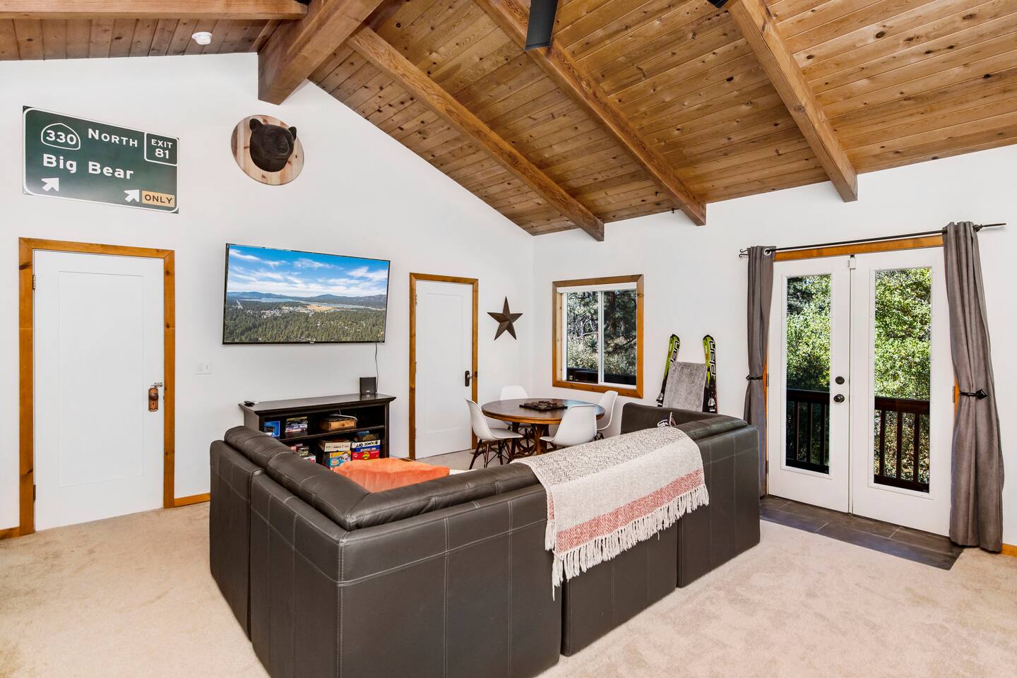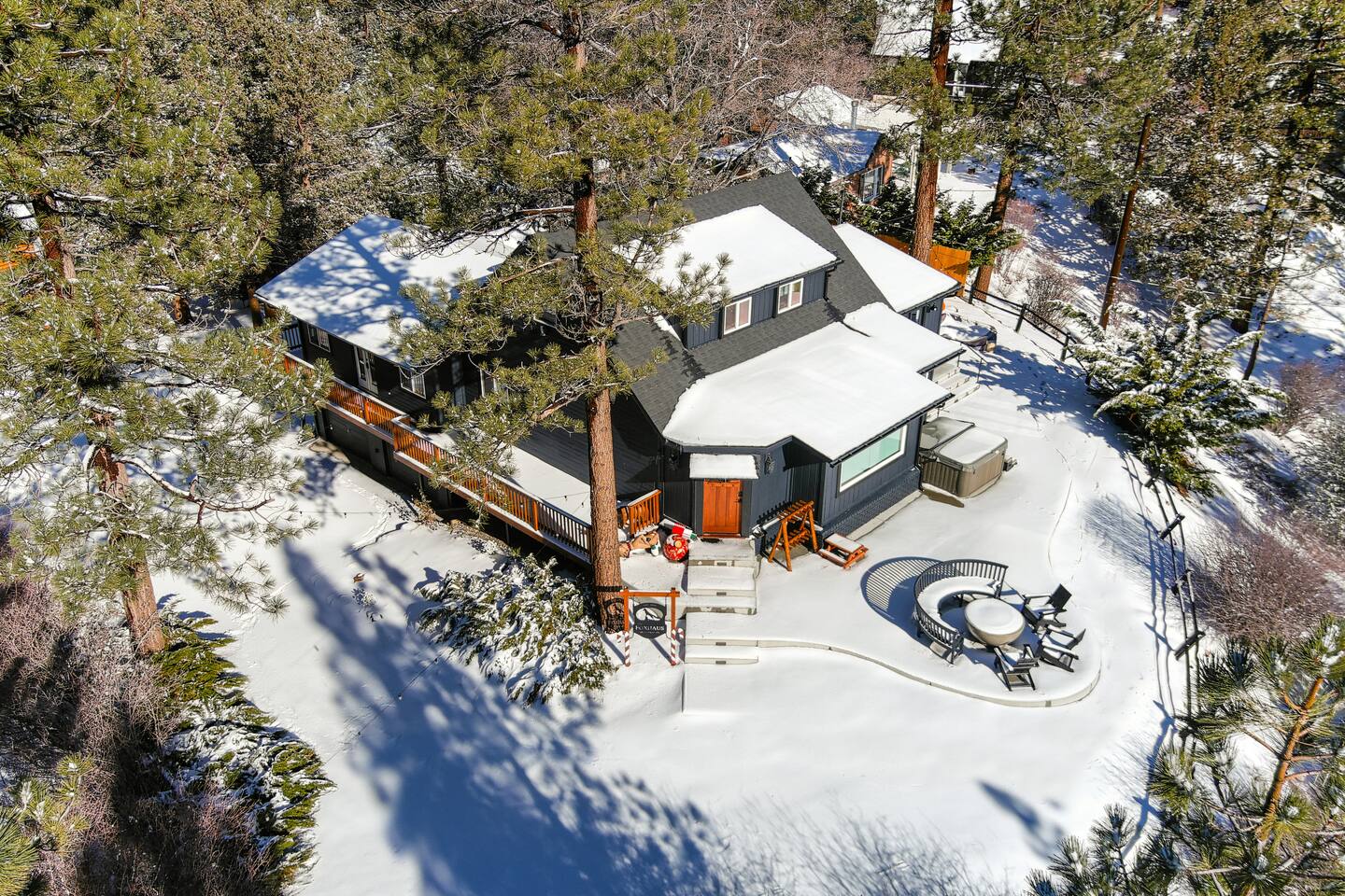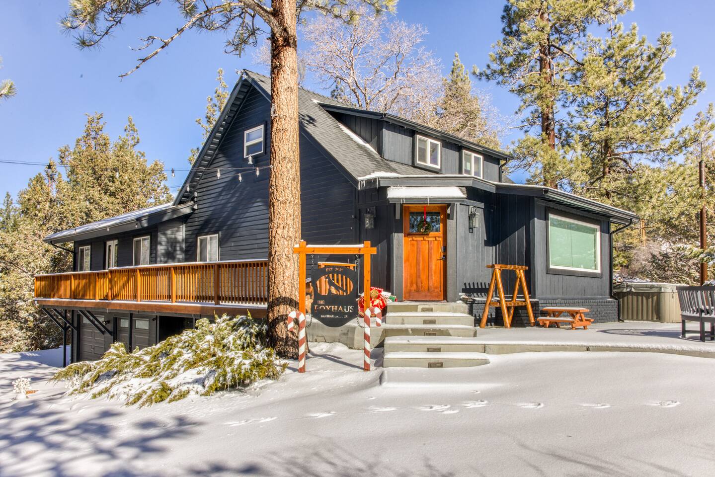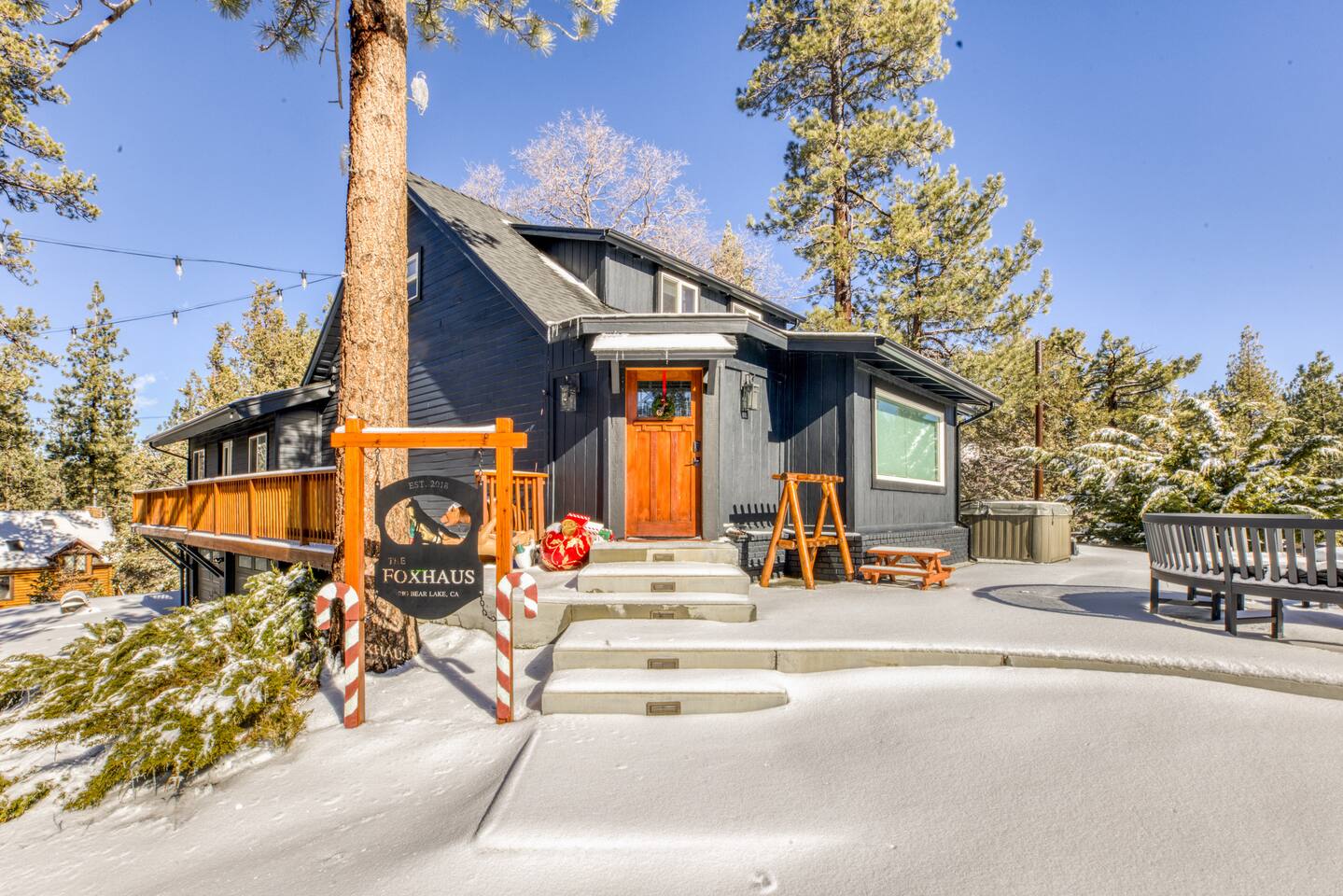 Welcome to Fox Haus, a gorgeous 2,400 sq. ft. classic charmer that sits high on its own private knoll with panoramic views of both ski resorts from inside & hot tub! One of the best outdoor spaces in Big Bear with views, hot tub, propane fire pit, & tons of seating. Centrally located in Lower Moonridge between Snow Summit & Bear Mountain ski resorts, we are a short walk to the new Alpine Zoo, Moonridge Coffee, & Dank Donuts. 5 min drive to the Village.