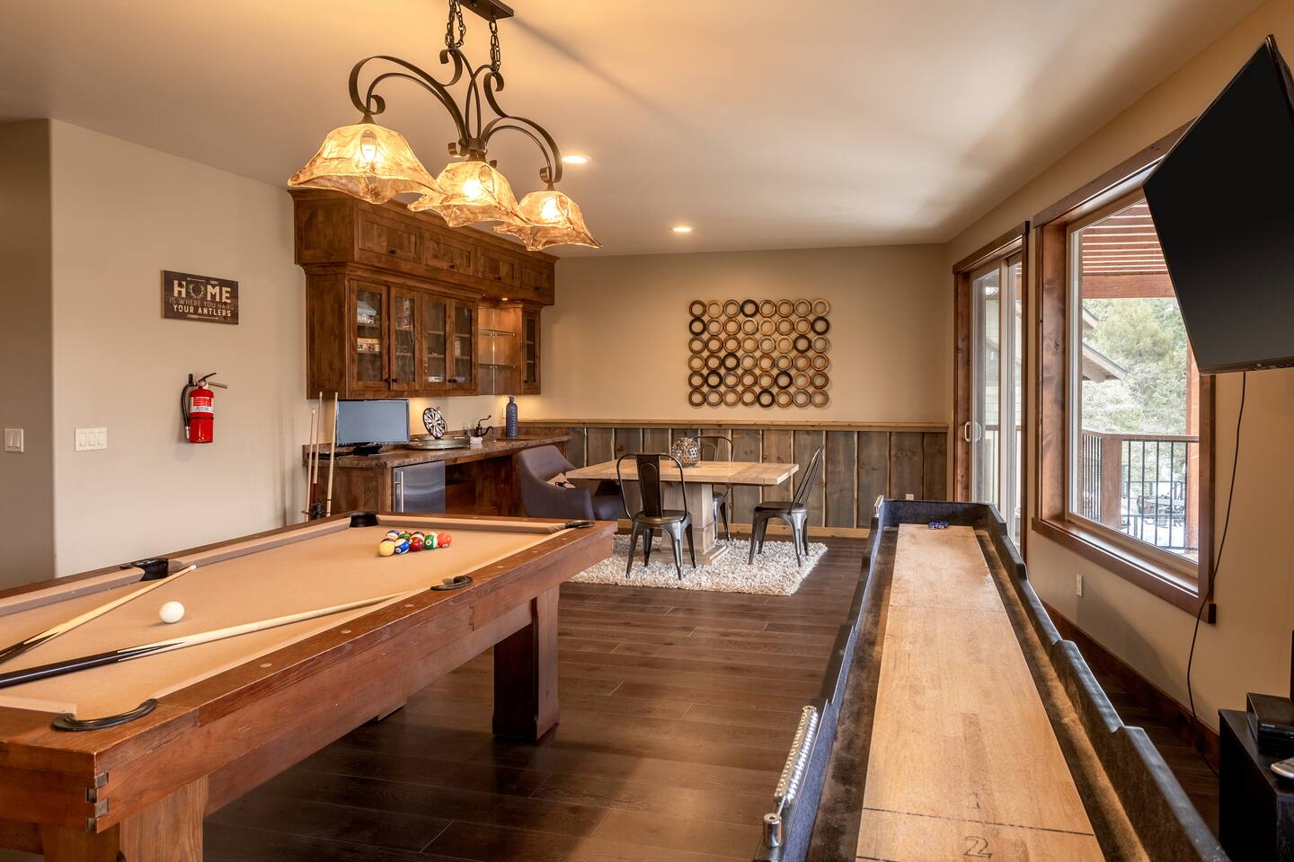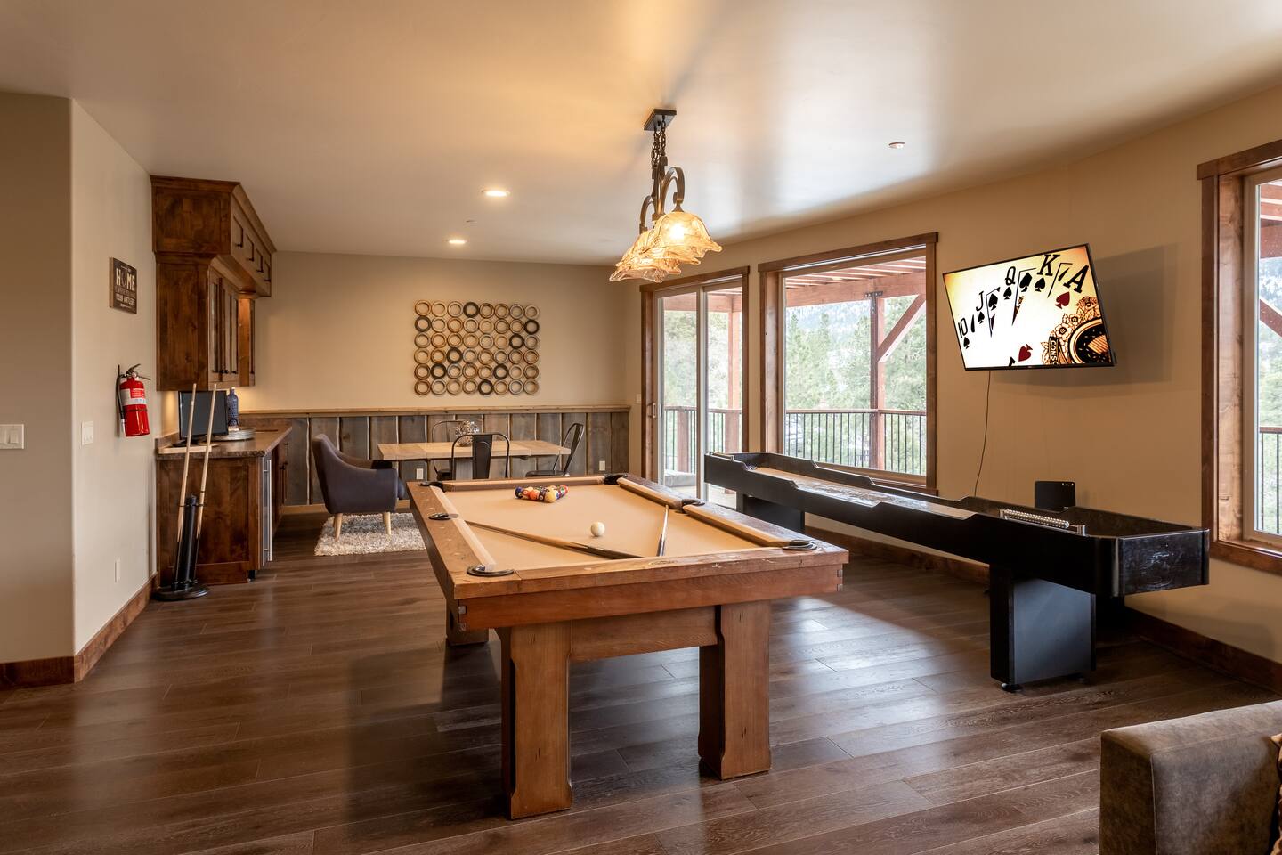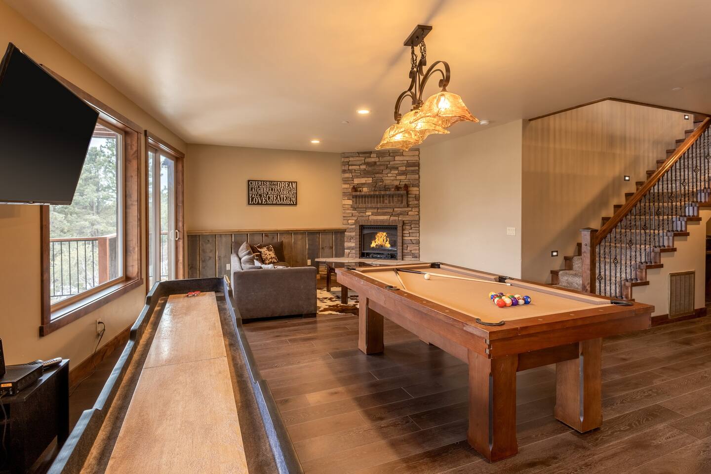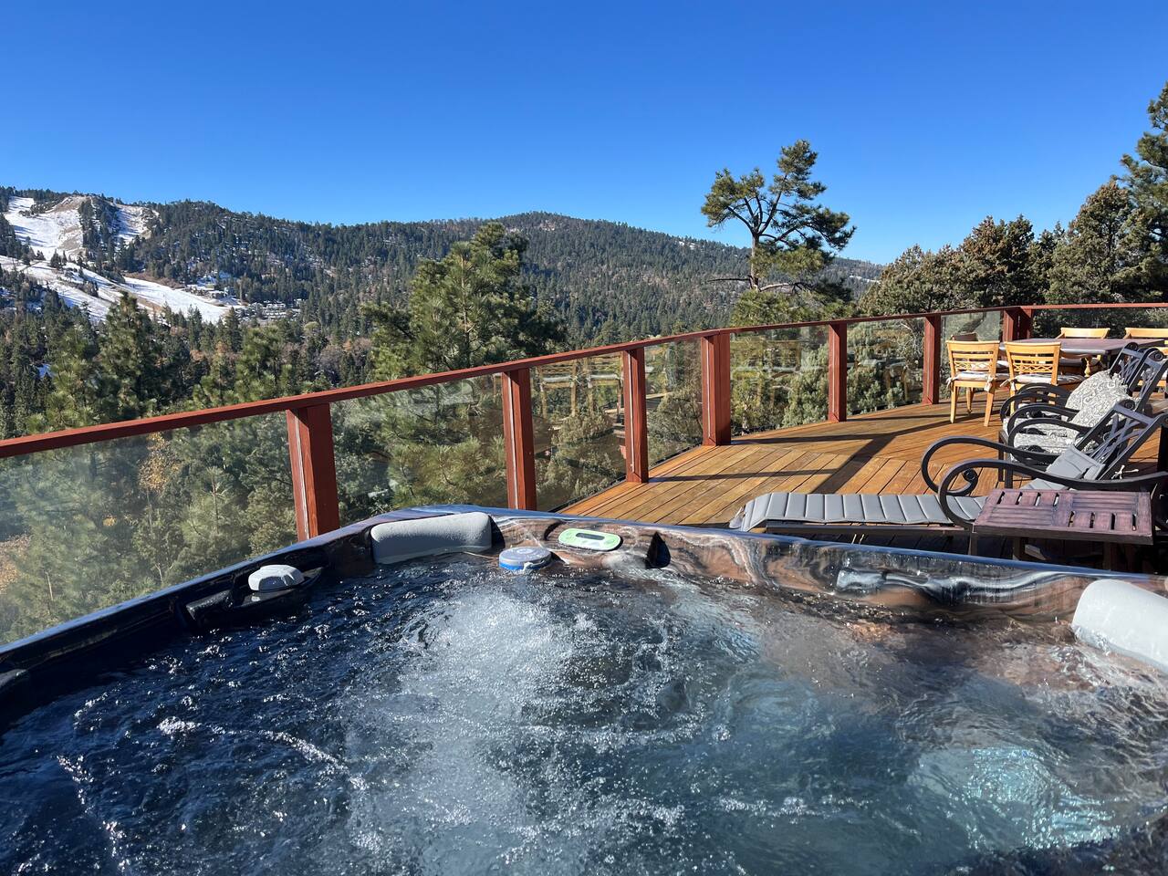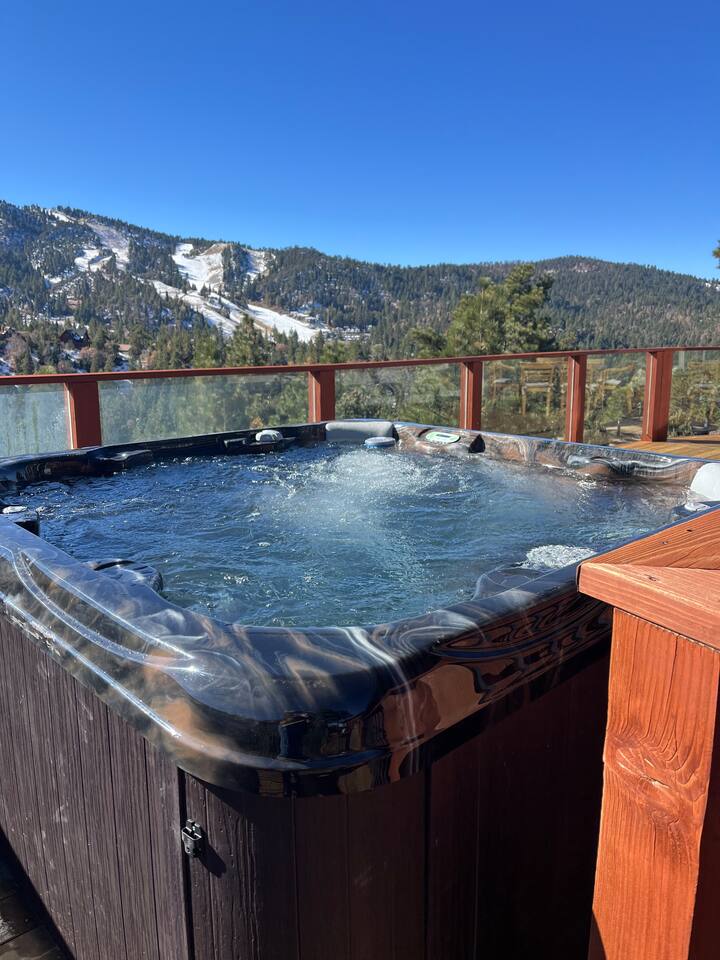 From the moment you walk in you will be stunned by the amazing views of Bear Mountain. Grey Wolf is a gorgeous 3,300+ sq. ft. luxury cabin in Upper Moonridge has 2 levels, 5 bedrooms, & 3.5 full bathrooms. It also has 2 master suites, 2 fireplaces, a custom gourmet kitchen, for 8, a pool table, & panoramic views of Big Bear. Maximum occupancy is 16 people & 4 parked cars (2 tandem, NO GARAGE ACCESS) for Gray Wolf Cabin. *** Peak Season CHECK IN / CHECK OUT INFO: December 1st to March 1st-Due to our incredibly busy schedule during these winter months, the Check-Out time is 10 am and the Check-In time is 4 pm. Unfortunately, early Check-In and late Check-Out times are not available during Peak Season and we apologize for the inconvenience. *** November 2024 we added a brand-new hot tub! ---------- * Living Room: Upstairs open-concept living room with wood-burning stove/fireplace, cathedral knotty pine ceiling, cable TV, telescope, 2 spacious sitting areas, upscale decor, & giant windows with breathtaking panoramic views of Bear Mountain Ski Resort. * Kitchen: Upstairs fully-stocked gourmet kitchen with Ninja blender, coffee makers (Keurig & Mr. Coffee), Krups toaster, and Sharp microwave drawer in the island. It has upscale stainless steel KitchenAid appliances including a refrigerator, gas range, wine fridge, dishwasher, & double wall ovens. It also features knotty alder custom cabinets, granite countertops, & big island with bar seating for 3. * Dining Room: Upstairs open-concept dining area with formal dining table for 6. * Laundry Room: Upstairs laundry room with full-size front-loading Whirlpool washer & dryer. * Half Bathroom: Upstairs half bathroom located near Laundry Room. * Bedroom #1 (Upstairs Master Suite): King bed with en-suite master bathroom, closet, carpet floor, & ceiling fan. * Full Bathroom #1 (Upstairs Master Suite): Upstairs en-suite master bathroom to Bedroom #1 with large jetted Ultra Bath bathtub, shower with a handheld showerhead, & dual sinks. * Game Room: Downstairs recreation room with pool table, shuffleboard, TV, gas fireplace with remote control, wet bar with mini-fridge, dining table for 4, sitting area with foosball coffee table, monitor for a gaming system, printer, & access to the lower deck. * Bedroom #2: Downstairs “Bunk Bed Room” with 2 twin over twin bunk beds, carpet floor, & closet. * Bedroom #3: Downstairs bedroom with queen bed, closet, & ceiling fan. * Full Bathroom #2 (Downstairs Master Suite): Downstairs en-suite master bath for Bedroom #4 with large jetted Ultra Bath bathtub, dual sinks, & rain shower with handheld showerhead. * Bedroom #4 (Downstairs Master Suite): Downstairs king bed with closet, ceiling fan, en-suite master bathroom, & carpet floor. * Full Bathroom #3: Downstairs bathroom with Ultra Bath jetted bathtub & shower. * Bonus Room / Bedroom #5: Downstairs bonus room with 4 portable twin-size cots for use on the downstairs level. This bonus room can accommodate approximately 1-3 cots comfortably as a spare bedroom (depending on layout). there are no windows or closets in here, it is * Upper Deck: The upper deck features include a propane barbecue grill, big hot tub for 8, an outdoor dining table for 4, lounge chairs, & breathtaking treetop panoramic views of Bear Mountain Ski Resort. Gray Wolf Cabin has 2 spacious wraparound decks. ---------- Gray Wolf Cabin has 9 beds total & sleeps 14 guests: 2 Kings, 1 Queen & 6 Twins. * 1 King: Bedroom #1 (upstairs). * 4 Twins (2 Bunk Beds): Bedroom #2 (downstairs). * 1 Queen: Bedroom #3 (downstairs). * 1 King: Bedroom #4 (downstairs). * 4 Twins (Portable Cots): Bonus Room / Bedroom #5 (downstairs). there are no windows or closets in here, it is more of there are no windows or closets in here, it is more of a storage room for the cots that people use as a bedroom as well. Big Bear Lake local ordinance 99.300 limits maximum occupancy to 16 people (10 adults max) & 4 cars. (Children, toddlers, and infants do count as a person.) Please do not book or arrive with more than the maximum or you could be fined from the city and evicted with no money back. Two Dogs Maximum. __________________________________________ ---- For your safety and protection, there is a Ring camera on the front deck facing the driveway recording on motion. We also have a Minut decibel meter outside on the upper back deck, near the spa. Minut is 100% privacy compliant- and cannot record conversations- it only reports noise levels so we have proof in case neighbors or Code Enforcement makes a complaint.