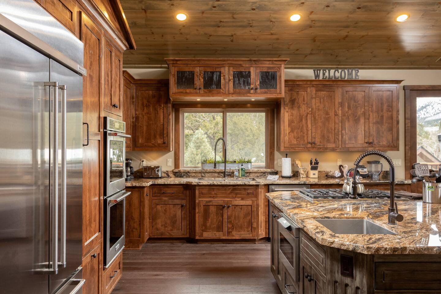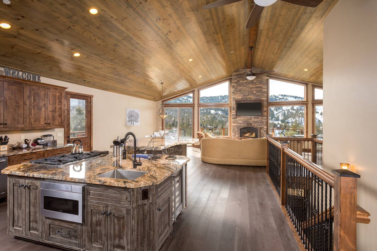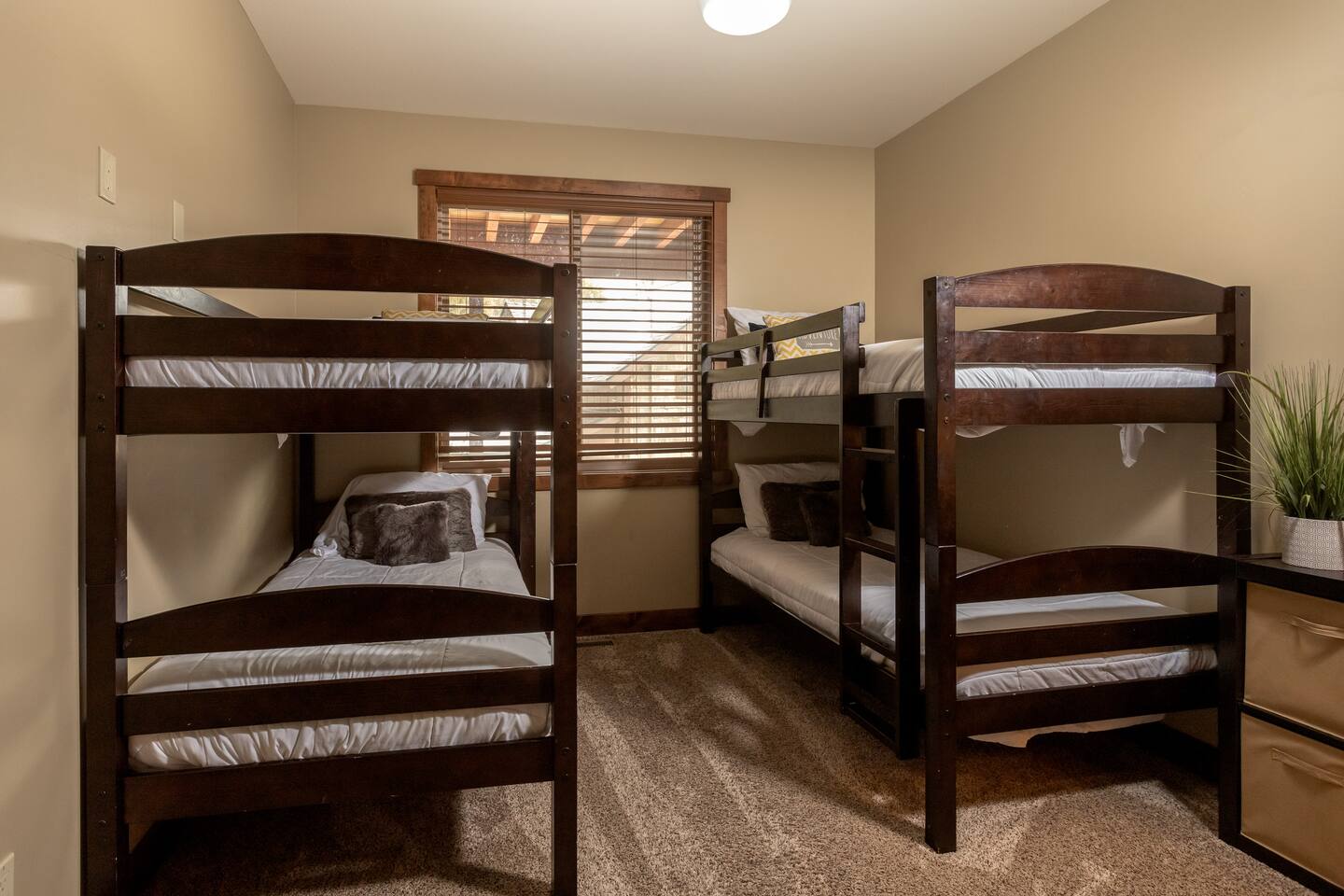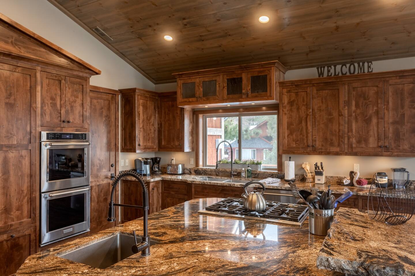 From the moment you walk in you will be stunned by the amazing views of Bear Mountain. Grey Wolf is a gorgeous 3,300+ sq. ft. luxury cabin in Upper Moonridge has 2 levels, 5 bedrooms, & 3.5 full bathrooms. It also has 2 master suites, 2 fireplaces, a custom gourmet kitchen, for 8, a pool table, & panoramic views of Big Bear. Maximum occupancy is 16 people & 4 parked cars (2 tandem, NO GARAGE ACCESS) for Gray Wolf Cabin. *** Peak Season CHECK IN / CHECK OUT INFO: December 1st to March 1st-Due to our incredibly busy schedule during these winter months, the Check-Out time is 10 am and the Check-In time is 4 pm. Unfortunately, early Check-In and late Check-Out times are not available during Peak Season and we apologize for the inconvenience. *** November 2024 we added a brand-new hot tub! ---------- * Living Room: Upstairs open-concept living room with wood-burning stove/fireplace, cathedral knotty pine ceiling, cable TV, telescope, 2 spacious sitting areas, upscale decor, & giant windows with breathtaking panoramic views of Bear Mountain Ski Resort. * Kitchen: Upstairs fully-stocked gourmet kitchen with Ninja blender, coffee makers (Keurig & Mr. Coffee), Krups toaster, and Sharp microwave drawer in the island. It has upscale stainless steel KitchenAid appliances including a refrigerator, gas range, wine fridge, dishwasher, & double wall ovens. It also features knotty alder custom cabinets, granite countertops, & big island with bar seating for 3. * Dining Room: Upstairs open-concept dining area with formal dining table for 6. * Laundry Room: Upstairs laundry room with full-size front-loading Whirlpool washer & dryer. * Half Bathroom: Upstairs half bathroom located near Laundry Room. * Bedroom #1 (Upstairs Master Suite): King bed with en-suite master bathroom, closet, carpet floor, & ceiling fan. * Full Bathroom #1 (Upstairs Master Suite): Upstairs en-suite master bathroom to Bedroom #1 with large jetted Ultra Bath bathtub, shower with a handheld showerhead, & dual sinks. * Game Room: Downstairs recreation room with pool table, shuffleboard, TV, gas fireplace with remote control, wet bar with mini-fridge, dining table for 4, sitting area with foosball coffee table, monitor for a gaming system, printer, & access to the lower deck. * Bedroom #2: Downstairs “Bunk Bed Room” with 2 twin over twin bunk beds, carpet floor, & closet. * Bedroom #3: Downstairs bedroom with queen bed, closet, & ceiling fan. * Full Bathroom #2 (Downstairs Master Suite): Downstairs en-suite master bath for Bedroom #4 with large jetted Ultra Bath bathtub, dual sinks, & rain shower with handheld showerhead. * Bedroom #4 (Downstairs Master Suite): Downstairs king bed with closet, ceiling fan, en-suite master bathroom, & carpet floor. * Full Bathroom #3: Downstairs bathroom with Ultra Bath jetted bathtub & shower. * Bonus Room / Bedroom #5: Downstairs bonus room with 4 portable twin-size cots for use on the downstairs level. This bonus room can accommodate approximately 1-3 cots comfortably as a spare bedroom (depending on layout). there are no windows or closets in here, it is * Upper Deck: The upper deck features include a propane barbecue grill, big hot tub for 8, an outdoor dining table for 4, lounge chairs, & breathtaking treetop panoramic views of Bear Mountain Ski Resort. Gray Wolf Cabin has 2 spacious wraparound decks. ---------- Gray Wolf Cabin has 9 beds total & sleeps 14 guests: 2 Kings, 1 Queen & 6 Twins. * 1 King: Bedroom #1 (upstairs). * 4 Twins (2 Bunk Beds): Bedroom #2 (downstairs). * 1 Queen: Bedroom #3 (downstairs). * 1 King: Bedroom #4 (downstairs). * 4 Twins (Portable Cots): Bonus Room / Bedroom #5 (downstairs). there are no windows or closets in here, it is more of there are no windows or closets in here, it is more of a storage room for the cots that people use as a bedroom as well. Big Bear Lake local ordinance 99.300 limits maximum occupancy to 16 people (10 adults max) & 4 cars. (Children, toddlers, and infants do count as a person.) Please do not book or arrive with more than the maximum or you could be fined from the city and evicted with no money back. Two Dogs Maximum. __________________________________________ ---- For your safety and protection, there is a Ring camera on the front deck facing the driveway recording on motion. We also have a Minut decibel meter outside on the upper back deck, near the spa. Minut is 100% privacy compliant- and cannot record conversations- it only reports noise levels so we have proof in case neighbors or Code Enforcement makes a complaint.