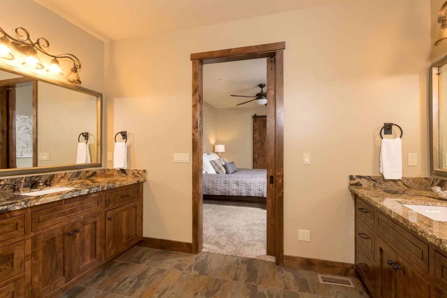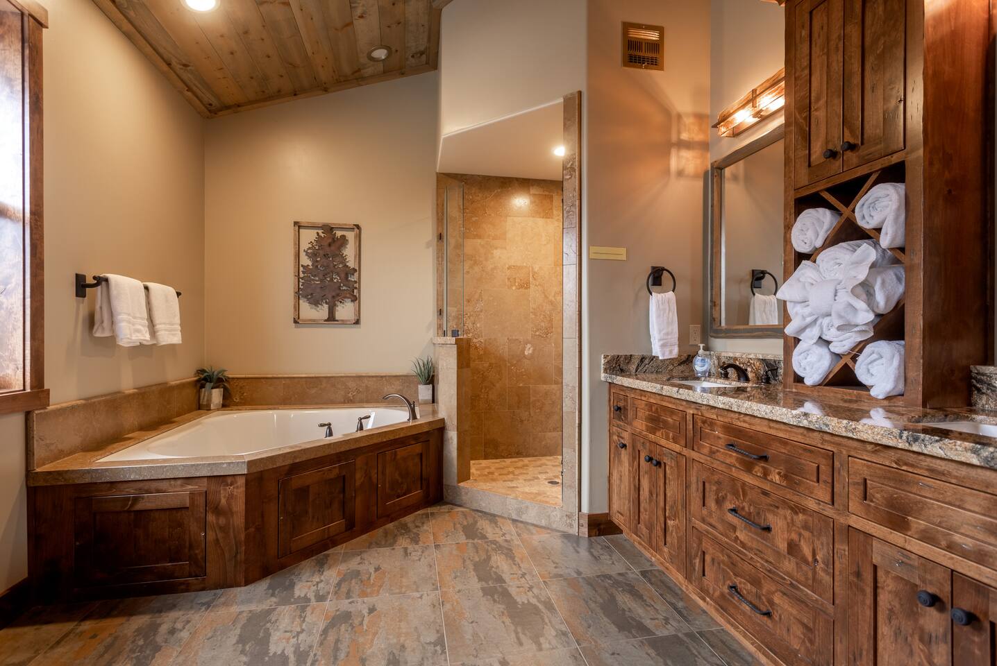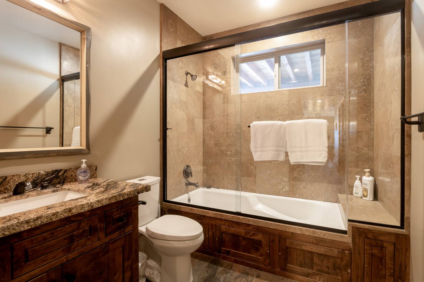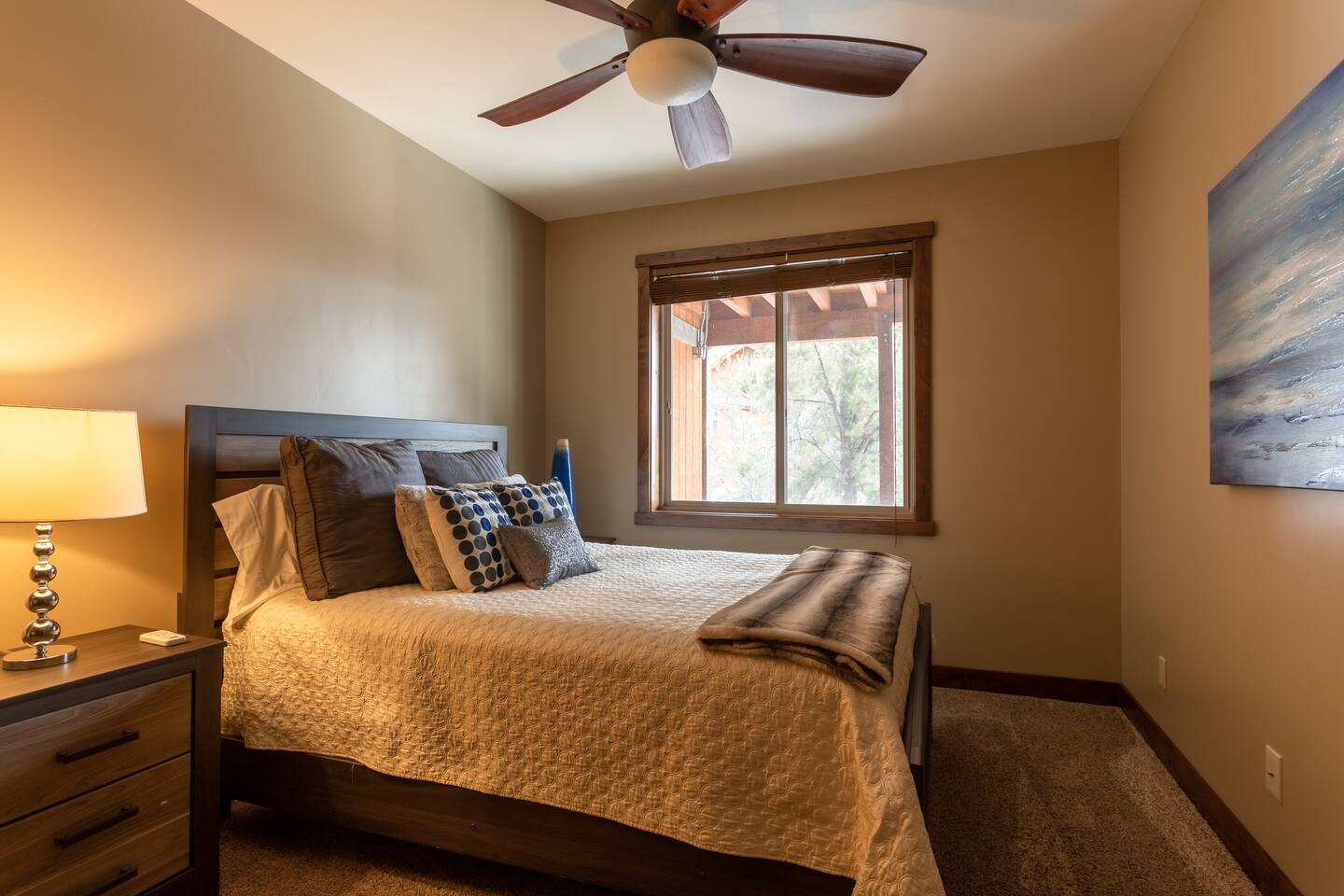 From the moment you walk in you will be stunned by the amazing views of Bear Mountain. Grey Wolf is a gorgeous 3,300+ sq. ft. luxury cabin in Upper Moonridge has 2 levels, 5 bedrooms, & 3.5 full bathrooms. It also has 2 master suites, 2 fireplaces, a custom gourmet kitchen, for 8, a pool table, & panoramic views of Big Bear. Maximum occupancy is 16 people & 4 parked cars (2 tandem, NO GARAGE ACCESS) for Gray Wolf Cabin. *** Peak Season CHECK IN / CHECK OUT INFO: December 1st to March 1st-Due to our incredibly busy schedule during these winter months, the Check-Out time is 10 am and the Check-In time is 4 pm. Unfortunately, early Check-In and late Check-Out times are not available during Peak Season and we apologize for the inconvenience. *** November 2024 we added a brand-new hot tub! ---------- * Living Room: Upstairs open-concept living room with wood-burning stove/fireplace, cathedral knotty pine ceiling, cable TV, telescope, 2 spacious sitting areas, upscale decor, & giant windows with breathtaking panoramic views of Bear Mountain Ski Resort. * Kitchen: Upstairs fully-stocked gourmet kitchen with Ninja blender, coffee makers (Keurig & Mr. Coffee), Krups toaster, and Sharp microwave drawer in the island. It has upscale stainless steel KitchenAid appliances including a refrigerator, gas range, wine fridge, dishwasher, & double wall ovens. It also features knotty alder custom cabinets, granite countertops, & big island with bar seating for 3. * Dining Room: Upstairs open-concept dining area with formal dining table for 6. * Laundry Room: Upstairs laundry room with full-size front-loading Whirlpool washer & dryer. * Half Bathroom: Upstairs half bathroom located near Laundry Room. * Bedroom #1 (Upstairs Master Suite): King bed with en-suite master bathroom, closet, carpet floor, & ceiling fan. * Full Bathroom #1 (Upstairs Master Suite): Upstairs en-suite master bathroom to Bedroom #1 with large jetted Ultra Bath bathtub, shower with a handheld showerhead, & dual sinks. * Game Room: Downstairs recreation room with pool table, shuffleboard, TV, gas fireplace with remote control, wet bar with mini-fridge, dining table for 4, sitting area with foosball coffee table, monitor for a gaming system, printer, & access to the lower deck. * Bedroom #2: Downstairs “Bunk Bed Room” with 2 twin over twin bunk beds, carpet floor, & closet. * Bedroom #3: Downstairs bedroom with queen bed, closet, & ceiling fan. * Full Bathroom #2 (Downstairs Master Suite): Downstairs en-suite master bath for Bedroom #4 with large jetted Ultra Bath bathtub, dual sinks, & rain shower with handheld showerhead. * Bedroom #4 (Downstairs Master Suite): Downstairs king bed with closet, ceiling fan, en-suite master bathroom, & carpet floor. * Full Bathroom #3: Downstairs bathroom with Ultra Bath jetted bathtub & shower. * Bonus Room / Bedroom #5: Downstairs bonus room with 4 portable twin-size cots for use on the downstairs level. This bonus room can accommodate approximately 1-3 cots comfortably as a spare bedroom (depending on layout). there are no windows or closets in here, it is * Upper Deck: The upper deck features include a propane barbecue grill, big hot tub for 8, an outdoor dining table for 4, lounge chairs, & breathtaking treetop panoramic views of Bear Mountain Ski Resort. Gray Wolf Cabin has 2 spacious wraparound decks. ---------- Gray Wolf Cabin has 9 beds total & sleeps 14 guests: 2 Kings, 1 Queen & 6 Twins. * 1 King: Bedroom #1 (upstairs). * 4 Twins (2 Bunk Beds): Bedroom #2 (downstairs). * 1 Queen: Bedroom #3 (downstairs). * 1 King: Bedroom #4 (downstairs). * 4 Twins (Portable Cots): Bonus Room / Bedroom #5 (downstairs). there are no windows or closets in here, it is more of there are no windows or closets in here, it is more of a storage room for the cots that people use as a bedroom as well. Big Bear Lake local ordinance 99.300 limits maximum occupancy to 16 people (10 adults max) & 4 cars. (Children, toddlers, and infants do count as a person.) Please do not book or arrive with more than the maximum or you could be fined from the city and evicted with no money back. Two Dogs Maximum. __________________________________________ ---- For your safety and protection, there is a Ring camera on the front deck facing the driveway recording on motion. We also have a Minut decibel meter outside on the upper back deck, near the spa. Minut is 100% privacy compliant- and cannot record conversations- it only reports noise levels so we have proof in case neighbors or Code Enforcement makes a complaint.