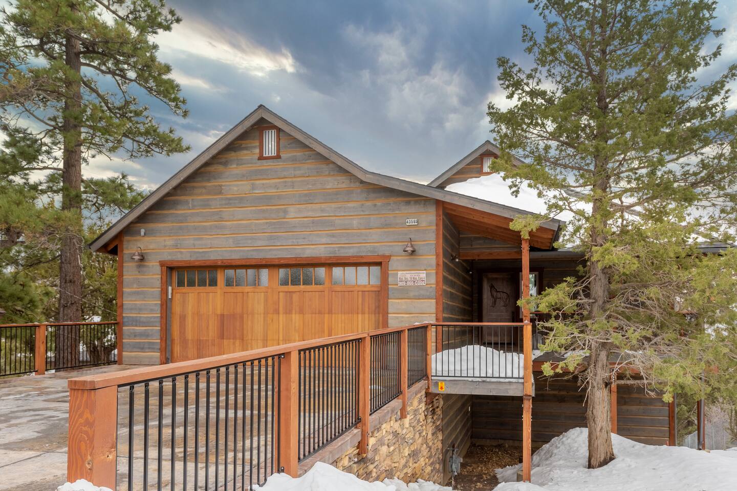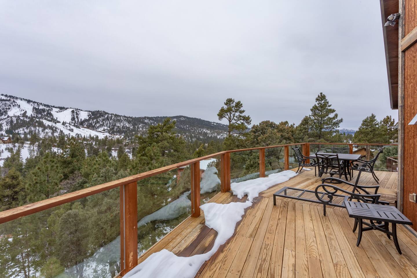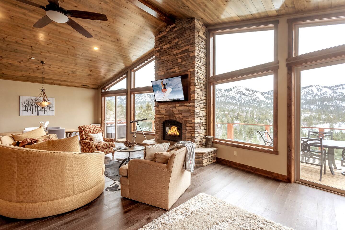 Breathtaking panoramic views of Bear Mountain Ski Resort from the floor-to-ceiling glass windows and the 2 wraparound decks. Huge 3,300+ square foot upscale cabin is a perfect family getaway. Custom gourmet kitchen with stainless steel appliances, wine fridge, game room- pool table & shuffleboard, 2 fireplaces (1 wood, 1 gas) wet bar, 2 master suites, tons of space for entertaining, & spectacular views. Overlooking and minutes away from Bear Skiing. ** New larger hot tub installed Nov 2024! **
