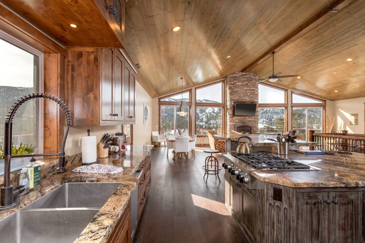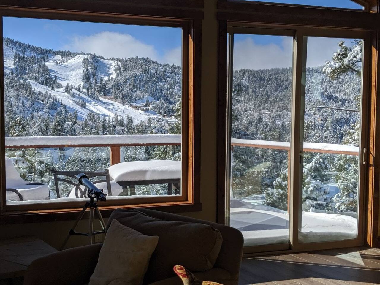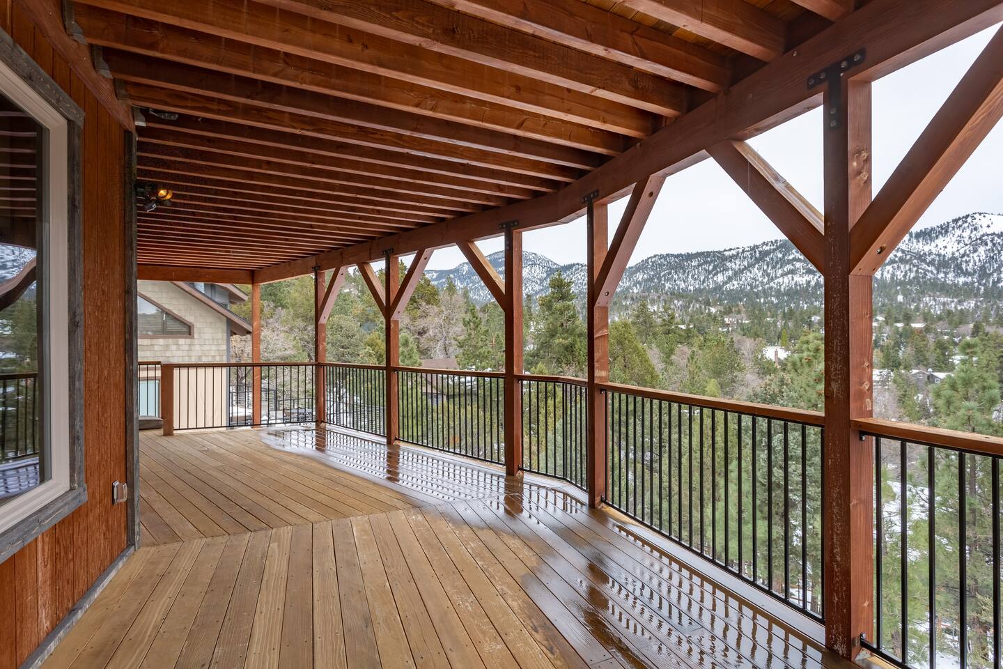 Breathtaking panoramic views of Bear Mountain Ski Resort from the floor-to-ceiling glass windows and the 2 wraparound decks. Huge 3,300+ square foot upscale cabin is a perfect family getaway. Custom gourmet kitchen with stainless steel appliances, wine fridge, game room- pool table & shuffleboard, 2 fireplaces (1 wood, 1 gas) wet bar, 2 master suites, tons of space for entertaining, & spectacular views. Overlooking and minutes away from Bear Skiing. ** New larger hot tub installed Nov 2024! **