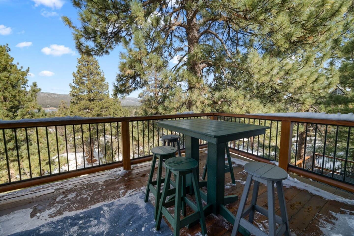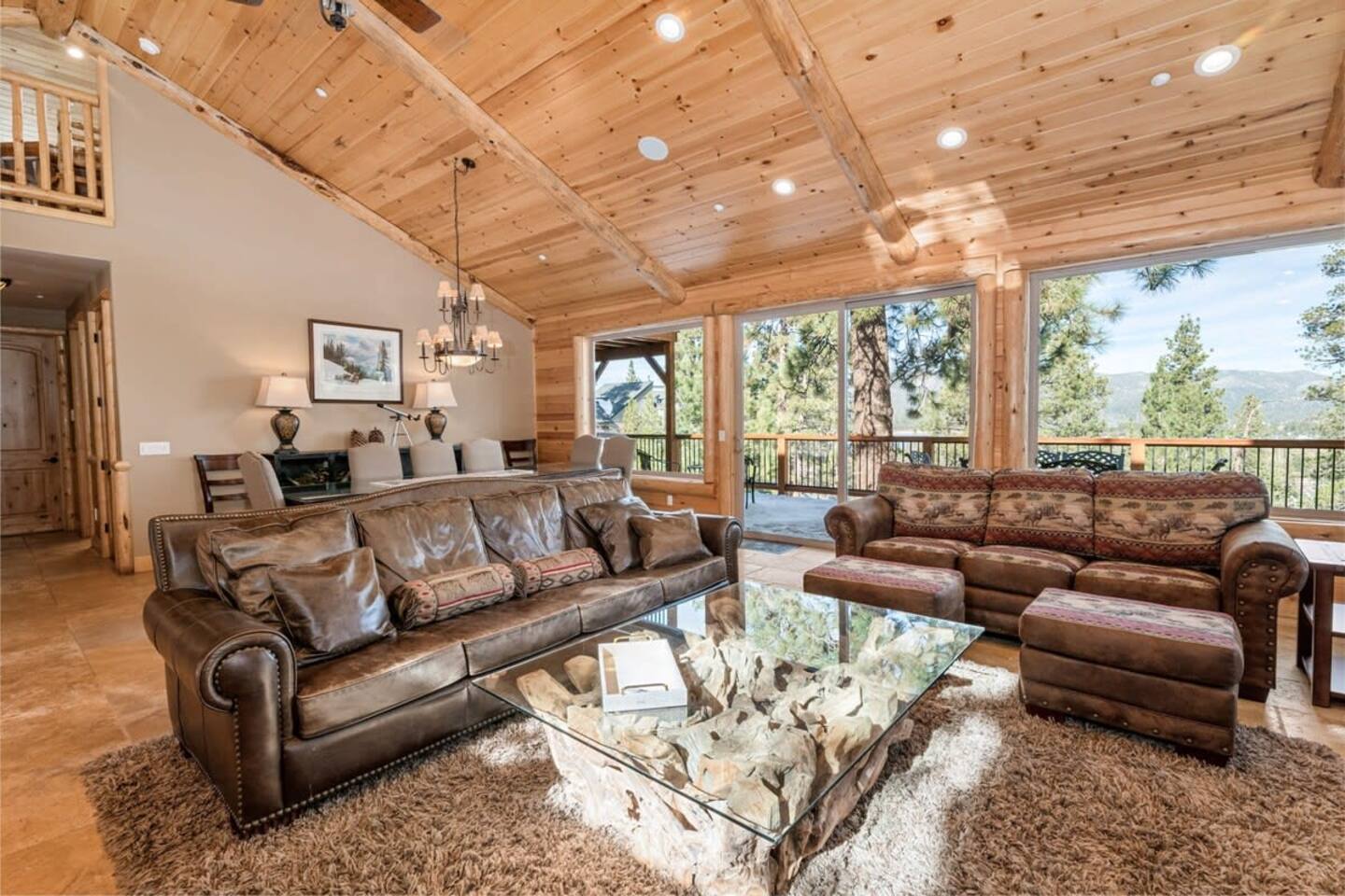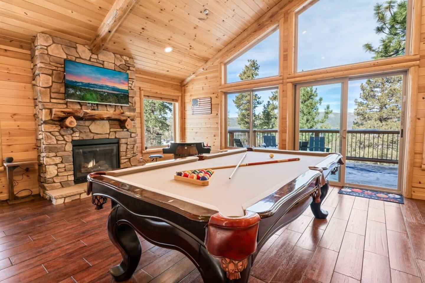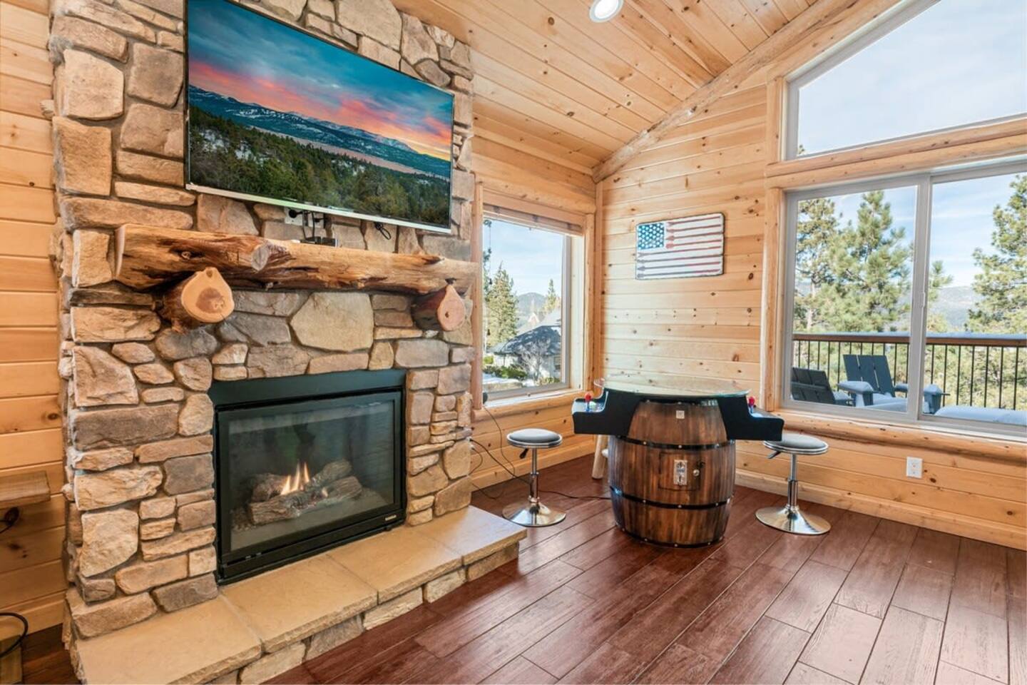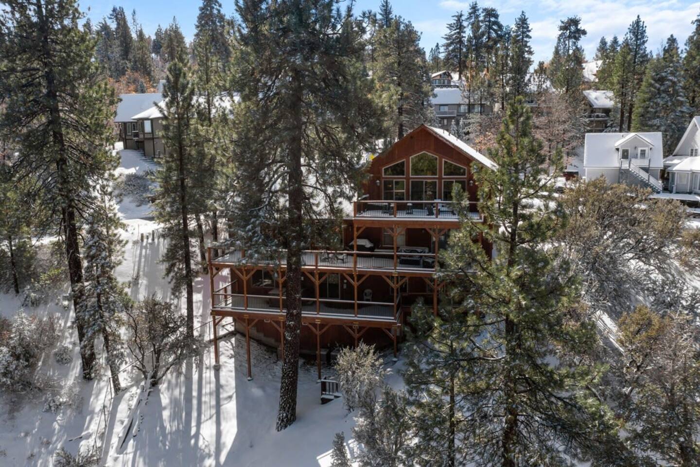 Welcome to Big Bucks Lodge! This gorgeous custom cabin in the exclusive Ironwood Estates neighborhood of Big Bear Lake, just a 10 min walk to the village and the lake, has 3 levels, 6 bedrooms, 3 decks, 4.5 bathrooms, & nearly 4,300 sq. ft. of luxury. Big Bucks Lodge has everything you and your family can imagine in a cabin in Big Bear. From lake views to a fully stocked chef's kitchen with Viking appliances to a movie theater room to a pool table and arcade game room and of course outdoor seating with amazing views and a hot tub, you'll never want to leave! There is parking for 2 cars in the garage. -------------------- AMENITIES Big Bucks Lodge has 2 primary bedroom suites (Bedroom #1 is on the main floor!), a wet bar called the Buck Off Bar, a game room, a movie room, 2 fireplaces (1 gas & 1 wood), & a private hot tub. The gourmet kitchen with Viking appliances is a cook's dream. All bedding & linens are provided by our professional cleaning crew. This spectacular cabin is the perfect getaway for family, friends, & even dogs! Additional amenities include free high speed Wi-Fi, a movie room with a home theater, a game room, TVs with streaming services, central air conditioning (AC), an arcade console with 400+ video games, breathtaking lake views, & more! -------------------- OCCUPANCY Big Bear Lake local ordinance 99.300 limits maximum occupancy to 16 people (14 adults) & 5 parked cars for Big Bucks Lodge. -------------------- LOCATION For your convenience, Big Bucks Lodge is in the upscale Ironwood Estates neighborhood of Big Bear & perfectly located just minutes from tons of activities - hiking, golfing, skiing, biking, swimming, & more. This spectacular retreat is 4.4 miles from Bear Mountain, 2.7 miles from Snow Summit, 3.4 miles from the Alpine Zoo, & 0.3 miles from Big Bear Village downtown shops & restaurants. -------------------- DOGS Dogs always stay for free at Big Bucks Lodge! The maximum number of dogs allowed for this cabin is 2. The yard is fenced off but please note that it is hilly. -------------------- ROOM DESCRIPTIONS * Entrance: Big Bucks Lodge has 3 levels and the entrance is located on the main level of the cabin. There are no stairs required to access the entrance. * Great Room: The luxurious open-concept great room has a grand wood fireplace, smart TV with streaming apps, an antique Everett baby grand piano, vaulted wood beam ceiling, spacious seating, 1 queen sofa pull out bed, a fake bison head, & large glass windows with breathtaking lake views. This room is on the main level and has access to the main level deck. There is also a closet full of board games on the main level. * Kitchen: The fully-stocked & open-concept gourmet kitchen has Viking stainless steel appliances including a refrigerator and 8 burner range with 2 ovens. There is also a microwave, 2 dishwashers, coffee makers (drip & K-cups), electric kettle, griddle, toaster, Ninja blender, air fryer, crock pot, & an island breakfast bar with seating for 4 guests. The kitchen is on the main level and has access to the main level deck. There is also a gas BBQ grill on the main deck. * Dining Area: There is a large dining table with seating adjacent to the open-concept great room and kitchen. * Movie Room: This dedicated media room with a home theater is located on the lower level. It has a motorized movie theater screen, projector with Apple TV, surround sound, plush individual seating for 8 guests, & classic movie theater themed decor. * Game Room: The game room is located on the upper level. It has a wet bar called the Buck Off Bar with a wine fridge, a pool table, a poker table, a gas fireplace, a TV with streaming services, an arcade console with 400+ video games, & seating for guests. This room has beautiful views of Big Bear and access to the upper deck. There is also a closet full of board games on the main level. * Laundry Room: The laundry room has a full size washer and dryer available for your convenience. This room is located on the main level. ----- BEDROOMS: Big Bucks Lodge has 6 bedrooms. All linens & 100% cotton sheets are provided by our professional cleaning crew. * Bedroom #1: This primary bedroom suite located on the main floor has 1 Eastern king bed, ceiling fan, carpet floor, charming rustic decor, and a private full bathroom (Bathroom #1). The Eastern king bed is a Split Sleep Number iLE 360 smart bed with a remote. * Bedroom #2: This bedroom on the lower level has 1 California king bed, ceiling fan, TV, dresser, and carpet floor. This bedroom is located next to the Movie Room and Bathroom #2. * Bedroom #3 (Bunk Bed Room): This dedicated bunk bed room on the lower level has 2 bunk beds, carpet floor, and ceiling fan. The first bunk bed has 1 twin bed over 1 queen bed with a twin XL trundle bed. The second bunk bed has 1 twin bed over 1 twin bed. * Bedroom #4: This primary bedroom suite on the upper level has 1 California king bed, ceiling fan, dresser, TV, and a private full bathroom (Bathroom #4). * Bedroom #5: This bedroom on the upper level has 1 queen bed, ceiling fan, carpet floor, and TV. * Bedroom #6: This bedroom on the upper level has 1 queen bed, ceiling fan, carpet floor, and TV. ----- BATHROOMS: Big Bucks Lodge has 4.5 (4 full & 1 half) bathrooms. * Bathroom #1: This full bathroom on the main level is adjacent to Bedroom #1, one of the two primary suites in Big Bucks Lodge. It has dual sinks, a walk-in shower, & a claw foot bathtub. * Bathroom #2: This full bathroom on the lower level has dual sinks and a walk-in shower. It is located next to the Movie Room, Bedroom #2, and Bedroom #3. * Bathroom #3: This full bathroom on the upper level has a combination shower with bathtub. * Bathroom #4: This full bathroom on the upper level is adjacent to Bedroom #4, one of the two primary suites in Big Bucks Cabin. It has a walk-in shower and dual sinks. * Bathroom #5: This half bathroom is located on the main level. ----- DECKS: Big Bucks Lodge is a large 3 story luxury cabin w