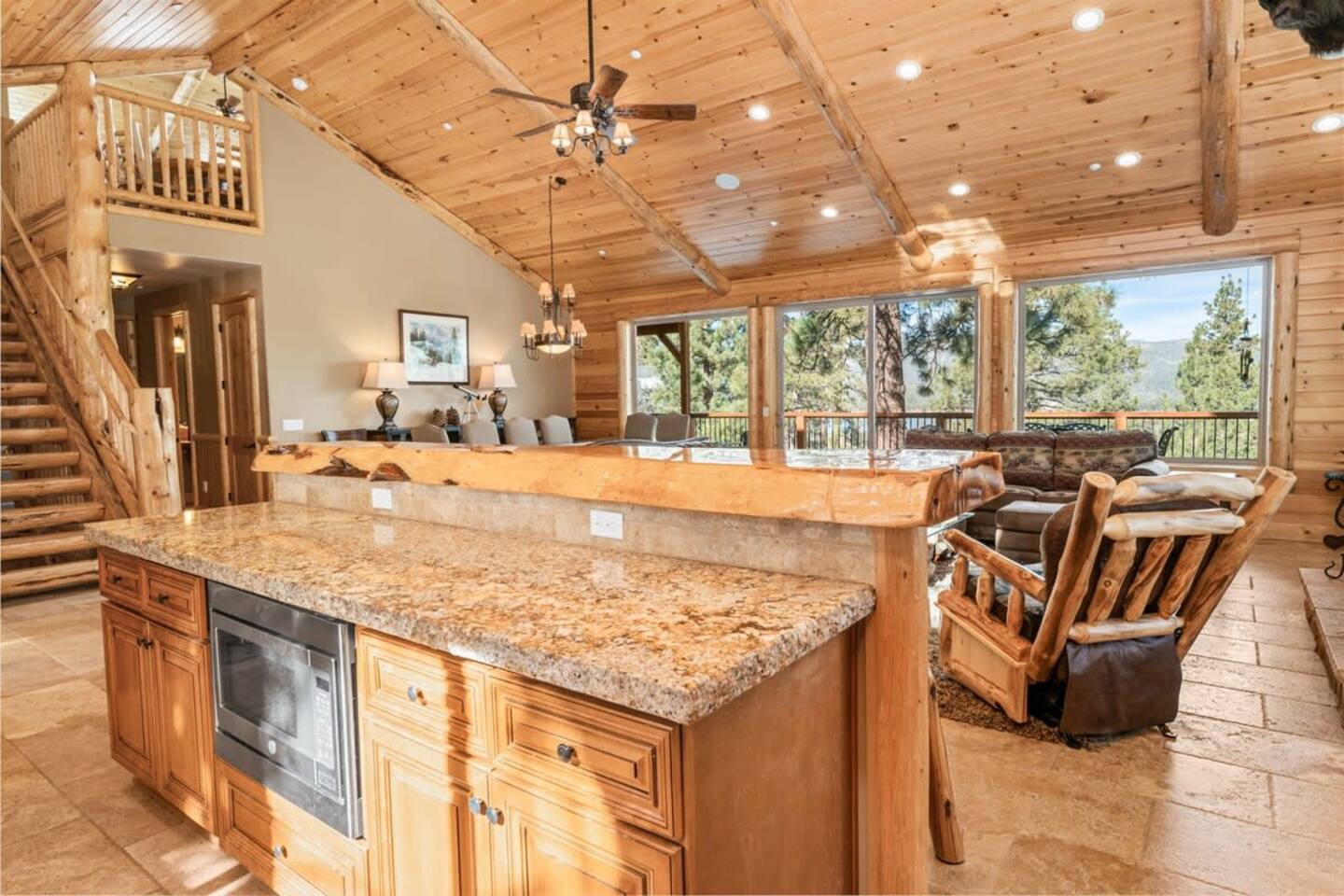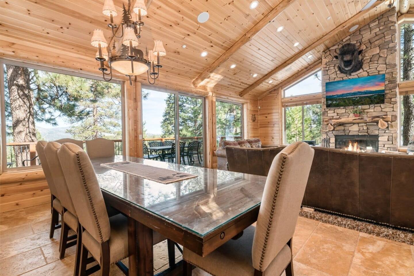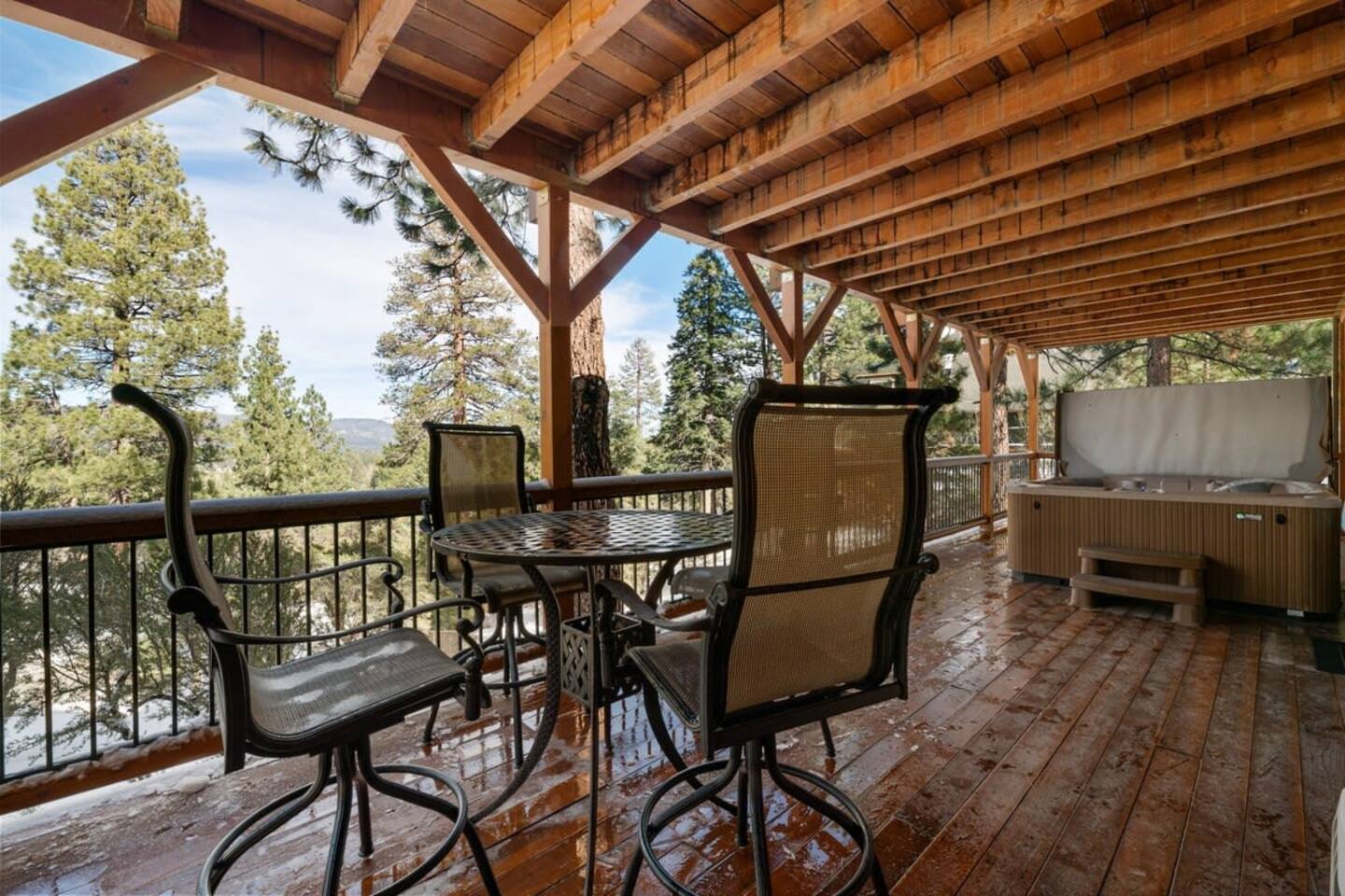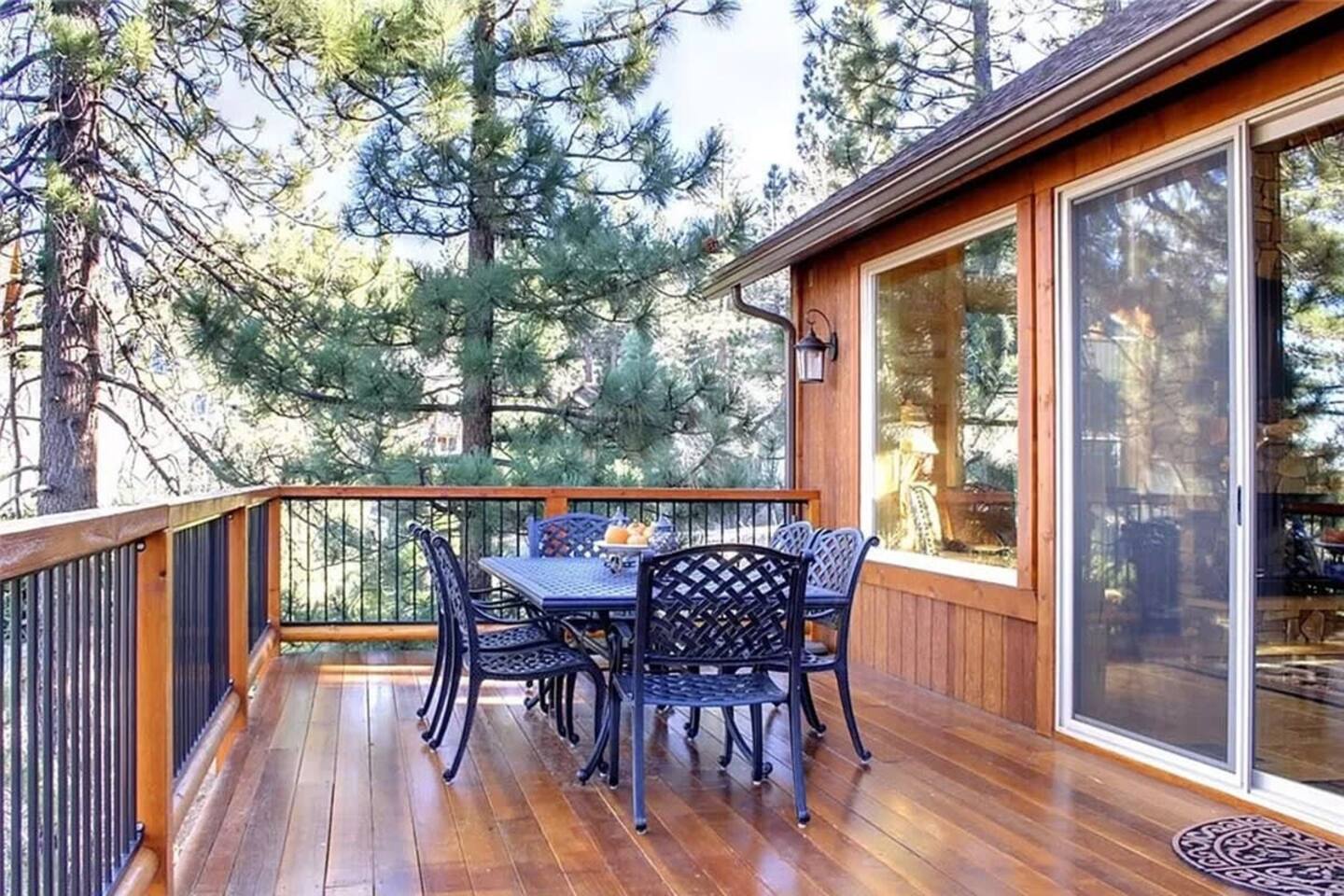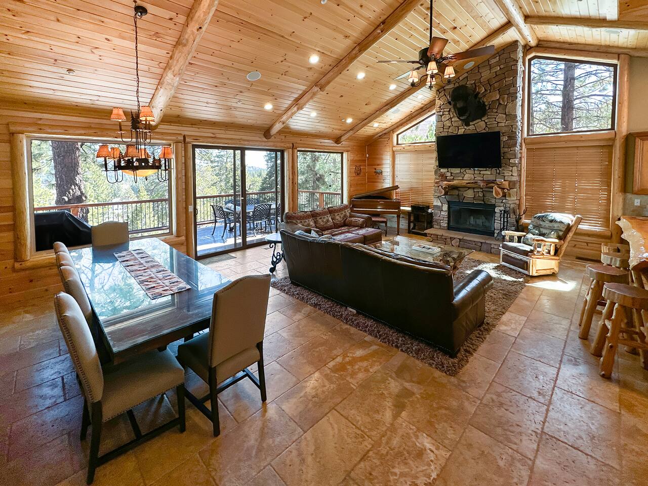 Welcome to Big Bucks Lodge! This gorgeous custom cabin in the exclusive Ironwood Estates neighborhood of Big Bear Lake, just a 10 min walk to the village and the lake, has 3 levels, 6 bedrooms, 3 decks, 4.5 bathrooms, & nearly 4,300 sq. ft. of luxury. Big Bucks Lodge has everything you and your family can imagine in a cabin in Big Bear. From lake views to a fully stocked chef's kitchen with Viking appliances to a movie theater room to a pool table and arcade game room and of course outdoor seating with amazing views and a hot tub, you'll never want to leave! There is parking for 2 cars in the garage. -------------------- AMENITIES Big Bucks Lodge has 2 primary bedroom suites (Bedroom #1 is on the main floor!), a wet bar called the Buck Off Bar, a game room, a movie room, 2 fireplaces (1 gas & 1 wood), & a private hot tub. The gourmet kitchen with Viking appliances is a cook's dream. All bedding & linens are provided by our professional cleaning crew. This spectacular cabin is the perfect getaway for family, friends, & even dogs! Additional amenities include free high speed Wi-Fi, a movie room with a home theater, a game room, TVs with streaming services, central air conditioning (AC), an arcade console with 400+ video games, breathtaking lake views, & more! -------------------- OCCUPANCY Big Bear Lake local ordinance 99.300 limits maximum occupancy to 16 people (14 adults) & 5 parked cars for Big Bucks Lodge. -------------------- LOCATION For your convenience, Big Bucks Lodge is in the upscale Ironwood Estates neighborhood of Big Bear & perfectly located just minutes from tons of activities - hiking, golfing, skiing, biking, swimming, & more. This spectacular retreat is 4.4 miles from Bear Mountain, 2.7 miles from Snow Summit, 3.4 miles from the Alpine Zoo, & 0.3 miles from Big Bear Village downtown shops & restaurants. -------------------- DOGS Dogs always stay for free at Big Bucks Lodge! The maximum number of dogs allowed for this cabin is 2. The yard is fenced off but please note that it is hilly. -------------------- ROOM DESCRIPTIONS * Entrance: Big Bucks Lodge has 3 levels and the entrance is located on the main level of the cabin. There are no stairs required to access the entrance. * Great Room: The luxurious open-concept great room has a grand wood fireplace, smart TV with streaming apps, an antique Everett baby grand piano, vaulted wood beam ceiling, spacious seating, 1 queen sofa pull out bed, a fake bison head, & large glass windows with breathtaking lake views. This room is on the main level and has access to the main level deck. There is also a closet full of board games on the main level. * Kitchen: The fully-stocked & open-concept gourmet kitchen has Viking stainless steel appliances including a refrigerator and 8 burner range with 2 ovens. There is also a microwave, 2 dishwashers, coffee makers (drip & K-cups), electric kettle, griddle, toaster, Ninja blender, air fryer, crock pot, & an island breakfast bar with seating for 4 guests. The kitchen is on the main level and has access to the main level deck. There is also a gas BBQ grill on the main deck. * Dining Area: There is a large dining table with seating adjacent to the open-concept great room and kitchen. * Movie Room: This dedicated media room with a home theater is located on the lower level. It has a motorized movie theater screen, projector with Apple TV, surround sound, plush individual seating for 8 guests, & classic movie theater themed decor. * Game Room: The game room is located on the upper level. It has a wet bar called the Buck Off Bar with a wine fridge, a pool table, a poker table, a gas fireplace, a TV with streaming services, an arcade console with 400+ video games, & seating for guests. This room has beautiful views of Big Bear and access to the upper deck. There is also a closet full of board games on the main level. * Laundry Room: The laundry room has a full size washer and dryer available for your convenience. This room is located on the main level. ----- BEDROOMS: Big Bucks Lodge has 6 bedrooms. All linens & 100% cotton sheets are provided by our professional cleaning crew. * Bedroom #1: This primary bedroom suite located on the main floor has 1 Eastern king bed, ceiling fan, carpet floor, charming rustic decor, and a private full bathroom (Bathroom #1). The Eastern king bed is a Split Sleep Number iLE 360 smart bed with a remote. * Bedroom #2: This bedroom on the lower level has 1 California king bed, ceiling fan, TV, dresser, and carpet floor. This bedroom is located next to the Movie Room and Bathroom #2. * Bedroom #3 (Bunk Bed Room): This dedicated bunk bed room on the lower level has 2 bunk beds, carpet floor, and ceiling fan. The first bunk bed has 1 twin bed over 1 queen bed with a twin XL trundle bed. The second bunk bed has 1 twin bed over 1 twin bed. * Bedroom #4: This primary bedroom suite on the upper level has 1 California king bed, ceiling fan, dresser, TV, and a private full bathroom (Bathroom #4). * Bedroom #5: This bedroom on the upper level has 1 queen bed, ceiling fan, carpet floor, and TV. * Bedroom #6: This bedroom on the upper level has 1 queen bed, ceiling fan, carpet floor, and TV. ----- BATHROOMS: Big Bucks Lodge has 4.5 (4 full & 1 half) bathrooms. * Bathroom #1: This full bathroom on the main level is adjacent to Bedroom #1, one of the two primary suites in Big Bucks Lodge. It has dual sinks, a walk-in shower, & a claw foot bathtub. * Bathroom #2: This full bathroom on the lower level has dual sinks and a walk-in shower. It is located next to the Movie Room, Bedroom #2, and Bedroom #3. * Bathroom #3: This full bathroom on the upper level has a combination shower with bathtub. * Bathroom #4: This full bathroom on the upper level is adjacent to Bedroom #4, one of the two primary suites in Big Bucks Cabin. It has a walk-in shower and dual sinks. * Bathroom #5: This half bathroom is located on the main level. ----- DECKS: Big Bucks Lodge is a large 3 story luxury cabin w