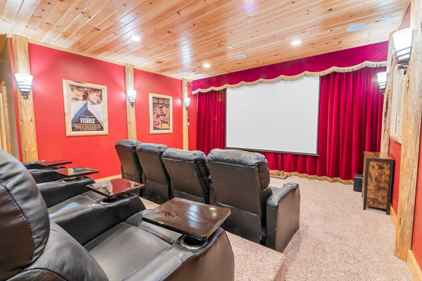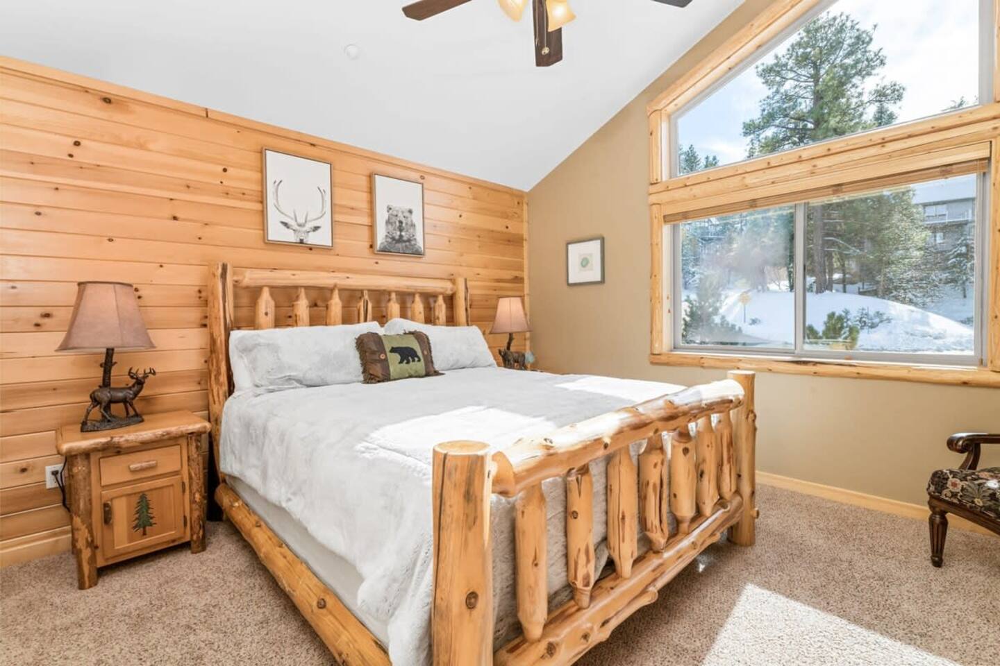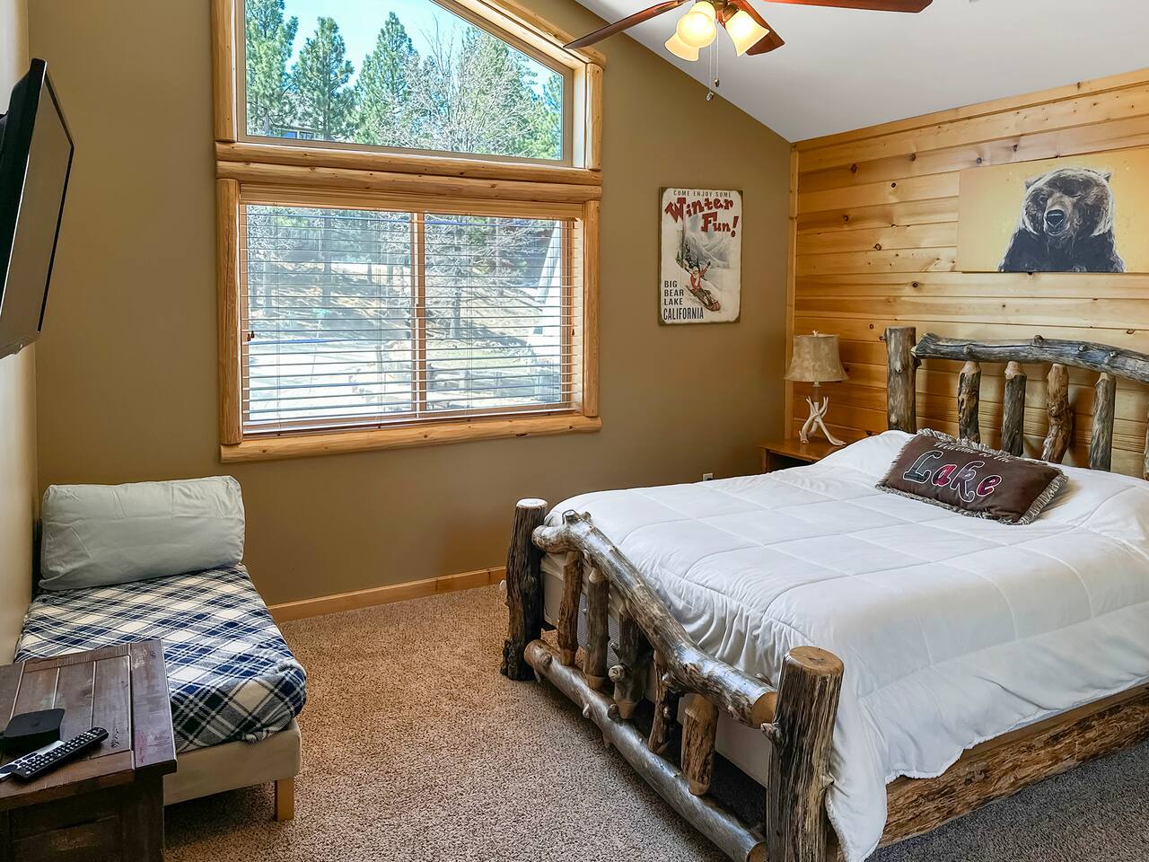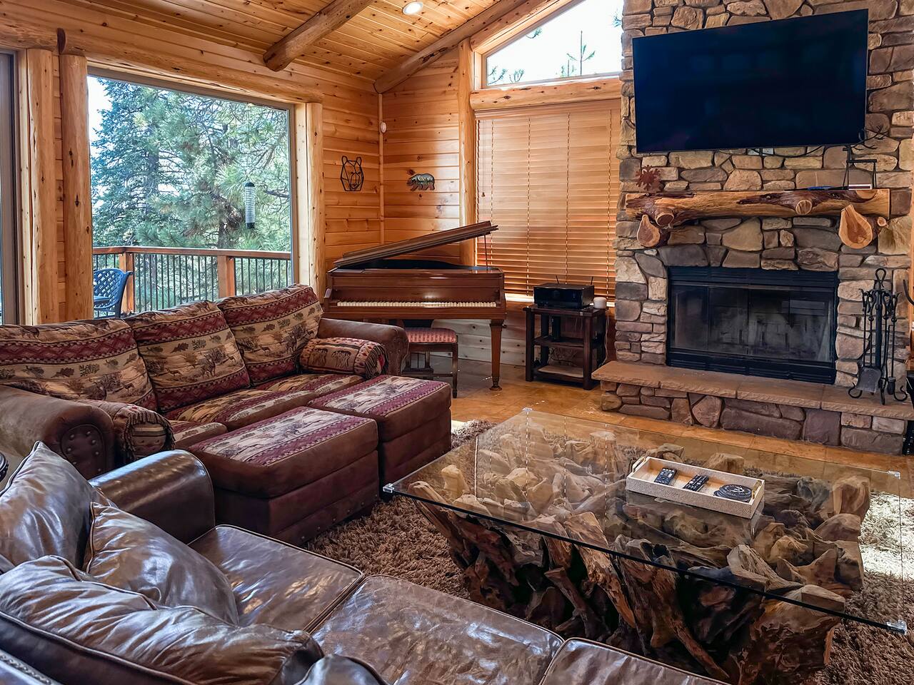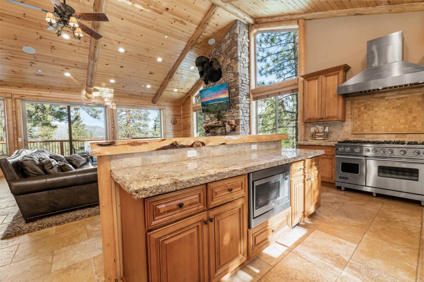Welcome to Big Bucks Lodge! This gorgeous custom cabin in the exclusive Ironwood Estates neighborhood of Big Bear Lake, just a 10 min walk to the village and the lake, has 3 levels, 6 bedrooms, 3 decks, 4.5 bathrooms, & nearly 4,300 sq. ft. of luxury. Big Bucks Lodge has everything you and your family can imagine in a cabin in Big Bear. From lake views to a fully stocked chef's kitchen with Viking appliances to a movie theater room to a pool table and arcade game room and of course outdoor seating with amazing views and a hot tub, you'll never want to leave! There is parking for 2 cars in the garage. -------------------- AMENITIES Big Bucks Lodge has 2 primary bedroom suites (Bedroom #1 is on the main floor!), a wet bar called the Buck Off Bar, a game room, a movie room, 2 fireplaces (1 gas & 1 wood), & a private hot tub. The gourmet kitchen with Viking appliances is a cook's dream. All bedding & linens are provided by our professional cleaning crew. This spectacular cabin is the perfect getaway for family, friends, & even dogs! Additional amenities include free high speed Wi-Fi, a movie room with a home theater, a game room, TVs with streaming services, central air conditioning (AC), an arcade console with 400+ video games, breathtaking lake views, & more! -------------------- OCCUPANCY Big Bear Lake local ordinance 99.300 limits maximum occupancy to 16 people (14 adults) & 5 parked cars for Big Bucks Lodge. -------------------- LOCATION For your convenience, Big Bucks Lodge is in the upscale Ironwood Estates neighborhood of Big Bear & perfectly located just minutes from tons of activities - hiking, golfing, skiing, biking, swimming, & more. This spectacular retreat is 4.4 miles from Bear Mountain, 2.7 miles from Snow Summit, 3.4 miles from the Alpine Zoo, & 0.3 miles from Big Bear Village downtown shops & restaurants. -------------------- DOGS Dogs always stay for free at Big Bucks Lodge! The maximum number of dogs allowed for this cabin is 2. The yard is fenced off but please note that it is hilly. -------------------- ROOM DESCRIPTIONS * Entrance: Big Bucks Lodge has 3 levels and the entrance is located on the main level of the cabin. There are no stairs required to access the entrance. * Great Room: The luxurious open-concept great room has a grand wood fireplace, smart TV with streaming apps, an antique Everett baby grand piano, vaulted wood beam ceiling, spacious seating, 1 queen sofa pull out bed, a fake bison head, & large glass windows with breathtaking lake views. This room is on the main level and has access to the main level deck. There is also a closet full of board games on the main level. * Kitchen: The fully-stocked & open-concept gourmet kitchen has Viking stainless steel appliances including a refrigerator and 8 burner range with 2 ovens. There is also a microwave, 2 dishwashers, coffee makers (drip & K-cups), electric kettle, griddle, toaster, Ninja blender, air fryer, crock pot, & an island breakfast bar with seating for 4 guests. The kitchen is on the main level and has access to the main level deck. There is also a gas BBQ grill on the main deck. * Dining Area: There is a large dining table with seating adjacent to the open-concept great room and kitchen. * Movie Room: This dedicated media room with a home theater is located on the lower level. It has a motorized movie theater screen, projector with Apple TV, surround sound, plush individual seating for 8 guests, & classic movie theater themed decor. * Game Room: The game room is located on the upper level. It has a wet bar called the Buck Off Bar with a wine fridge, a pool table, a poker table, a gas fireplace, a TV with streaming services, an arcade console with 400+ video games, & seating for guests. This room has beautiful views of Big Bear and access to the upper deck. There is also a closet full of board games on the main level. * Laundry Room: The laundry room has a full size washer and dryer available for your convenience. This room is located on the main level. ----- BEDROOMS: Big Bucks Lodge has 6 bedrooms. All linens & 100% cotton sheets are provided by our professional cleaning crew. * Bedroom #1: This primary bedroom suite located on the main floor has 1 Eastern king bed, ceiling fan, carpet floor, charming rustic decor, and a private full bathroom (Bathroom #1). The Eastern king bed is a Split Sleep Number iLE 360 smart bed with a remote. * Bedroom #2: This bedroom on the lower level has 1 California king bed, ceiling fan, TV, dresser, and carpet floor. This bedroom is located next to the Movie Room and Bathroom #2. * Bedroom #3 (Bunk Bed Room): This dedicated bunk bed room on the lower level has 2 bunk beds, carpet floor, and ceiling fan. The first bunk bed has 1 twin bed over 1 queen bed with a twin XL trundle bed. The second bunk bed has 1 twin bed over 1 twin bed. * Bedroom #4: This primary bedroom suite on the upper level has 1 California king bed, ceiling fan, dresser, TV, and a private full bathroom (Bathroom #4). * Bedroom #5: This bedroom on the upper level has 1 queen bed, ceiling fan, carpet floor, and TV. * Bedroom #6: This bedroom on the upper level has 1 queen bed, ceiling fan, carpet floor, and TV. ----- BATHROOMS: Big Bucks Lodge has 4.5 (4 full & 1 half) bathrooms. * Bathroom #1: This full bathroom on the main level is adjacent to Bedroom #1, one of the two primary suites in Big Bucks Lodge. It has dual sinks, a walk-in shower, & a claw foot bathtub. * Bathroom #2: This full bathroom on the lower level has dual sinks and a walk-in shower. It is located next to the Movie Room, Bedroom #2, and Bedroom #3. * Bathroom #3: This full bathroom on the upper level has a combination shower with bathtub. * Bathroom #4: This full bathroom on the upper level is adjacent to Bedroom #4, one of the two primary suites in Big Bucks Cabin. It has a walk-in shower and dual sinks. * Bathroom #5: This half bathroom is located on the main level. ----- DECKS: Big Bucks Lodge is a large 3 story luxury cabin w