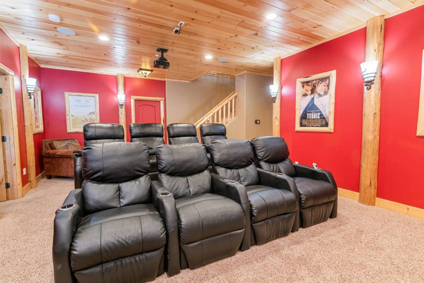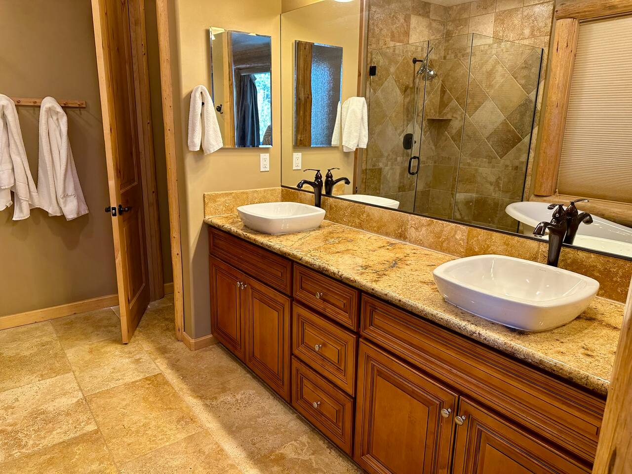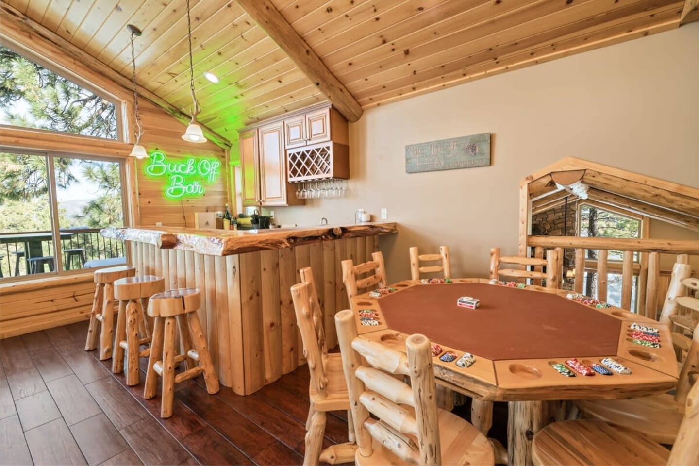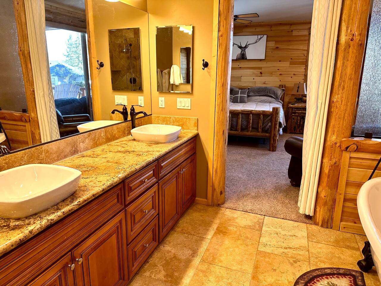 Welcome to Big Bucks Lodge! This gorgeous custom cabin in the exclusive Ironwood Estates neighborhood of Big Bear Lake, just a 10 min walk to the village and the lake, has 3 levels, 6 bedrooms, 3 decks, 4.5 bathrooms, & nearly 4,300 sq. ft. of luxury. Big Bucks Lodge has everything you and your family can imagine in a cabin in Big Bear. From lake views to a fully stocked chef's kitchen with Viking appliances to a movie theater room to a pool table and arcade game room and of course outdoor seating with amazing views and a hot tub, you'll never want to leave! There is parking for 2 cars in the garage. -------------------- AMENITIES Big Bucks Lodge has 2 primary bedroom suites (Bedroom #1 is on the main floor!), a wet bar called the Buck Off Bar, a game room, a movie room, 2 fireplaces (1 gas & 1 wood), & a private hot tub. The gourmet kitchen with Viking appliances is a cook's dream. All bedding & linens are provided by our professional cleaning crew. This spectacular cabin is the perfect getaway for family, friends, & even dogs! Additional amenities include free high speed Wi-Fi, a movie room with a home theater, a game room, TVs with streaming services, central air conditioning (AC), an arcade console with 400+ video games, breathtaking lake views, & more! -------------------- OCCUPANCY Big Bear Lake local ordinance 99.300 limits maximum occupancy to 16 people (14 adults) & 5 parked cars for Big Bucks Lodge. -------------------- LOCATION For your convenience, Big Bucks Lodge is in the upscale Ironwood Estates neighborhood of Big Bear & perfectly located just minutes from tons of activities - hiking, golfing, skiing, biking, swimming, & more. This spectacular retreat is 4.4 miles from Bear Mountain, 2.7 miles from Snow Summit, 3.4 miles from the Alpine Zoo, & 0.3 miles from Big Bear Village downtown shops & restaurants. -------------------- DOGS Dogs always stay for free at Big Bucks Lodge! The maximum number of dogs allowed for this cabin is 2. The yard is fenced off but please note that it is hilly. -------------------- ROOM DESCRIPTIONS * Entrance: Big Bucks Lodge has 3 levels and the entrance is located on the main level of the cabin. There are no stairs required to access the entrance. * Great Room: The luxurious open-concept great room has a grand wood fireplace, smart TV with streaming apps, an antique Everett baby grand piano, vaulted wood beam ceiling, spacious seating, 1 queen sofa pull out bed, a fake bison head, & large glass windows with breathtaking lake views. This room is on the main level and has access to the main level deck. There is also a closet full of board games on the main level. * Kitchen: The fully-stocked & open-concept gourmet kitchen has Viking stainless steel appliances including a refrigerator and 8 burner range with 2 ovens. There is also a microwave, 2 dishwashers, coffee makers (drip & K-cups), electric kettle, griddle, toaster, Ninja blender, air fryer, crock pot, & an island breakfast bar with seating for 4 guests. The kitchen is on the main level and has access to the main level deck. There is also a gas BBQ grill on the main deck. * Dining Area: There is a large dining table with seating adjacent to the open-concept great room and kitchen. * Movie Room: This dedicated media room with a home theater is located on the lower level. It has a motorized movie theater screen, projector with Apple TV, surround sound, plush individual seating for 8 guests, & classic movie theater themed decor. * Game Room: The game room is located on the upper level. It has a wet bar called the Buck Off Bar with a wine fridge, a pool table, a poker table, a gas fireplace, a TV with streaming services, an arcade console with 400+ video games, & seating for guests. This room has beautiful views of Big Bear and access to the upper deck. There is also a closet full of board games on the main level. * Laundry Room: The laundry room has a full size washer and dryer available for your convenience. This room is located on the main level. ----- BEDROOMS: Big Bucks Lodge has 6 bedrooms. All linens & 100% cotton sheets are provided by our professional cleaning crew. * Bedroom #1: This primary bedroom suite located on the main floor has 1 Eastern king bed, ceiling fan, carpet floor, charming rustic decor, and a private full bathroom (Bathroom #1). The Eastern king bed is a Split Sleep Number iLE 360 smart bed with a remote. * Bedroom #2: This bedroom on the lower level has 1 California king bed, ceiling fan, TV, dresser, and carpet floor. This bedroom is located next to the Movie Room and Bathroom #2. * Bedroom #3 (Bunk Bed Room): This dedicated bunk bed room on the lower level has 2 bunk beds, carpet floor, and ceiling fan. The first bunk bed has 1 twin bed over 1 queen bed with a twin XL trundle bed. The second bunk bed has 1 twin bed over 1 twin bed. * Bedroom #4: This primary bedroom suite on the upper level has 1 California king bed, ceiling fan, dresser, TV, and a private full bathroom (Bathroom #4). * Bedroom #5: This bedroom on the upper level has 1 queen bed, ceiling fan, carpet floor, and TV. * Bedroom #6: This bedroom on the upper level has 1 queen bed, ceiling fan, carpet floor, and TV. ----- BATHROOMS: Big Bucks Lodge has 4.5 (4 full & 1 half) bathrooms. * Bathroom #1: This full bathroom on the main level is adjacent to Bedroom #1, one of the two primary suites in Big Bucks Lodge. It has dual sinks, a walk-in shower, & a claw foot bathtub. * Bathroom #2: This full bathroom on the lower level has dual sinks and a walk-in shower. It is located next to the Movie Room, Bedroom #2, and Bedroom #3. * Bathroom #3: This full bathroom on the upper level has a combination shower with bathtub. * Bathroom #4: This full bathroom on the upper level is adjacent to Bedroom #4, one of the two primary suites in Big Bucks Cabin. It has a walk-in shower and dual sinks. * Bathroom #5: This half bathroom is located on the main level. ----- DECKS: Big Bucks Lodge is a large 3 story luxury cabin w