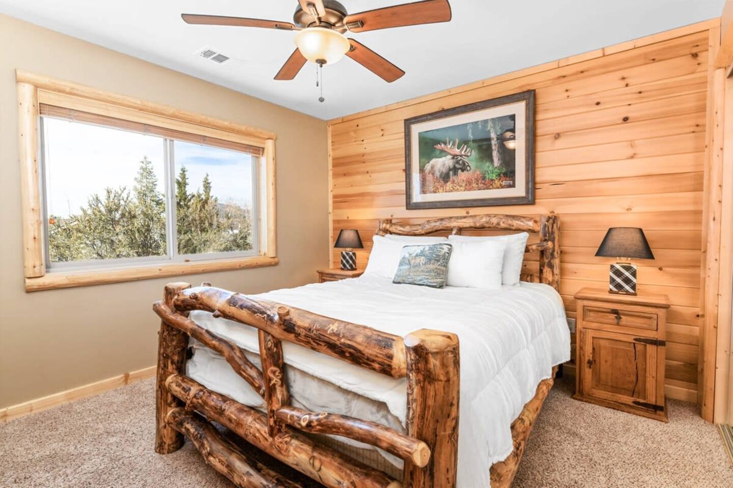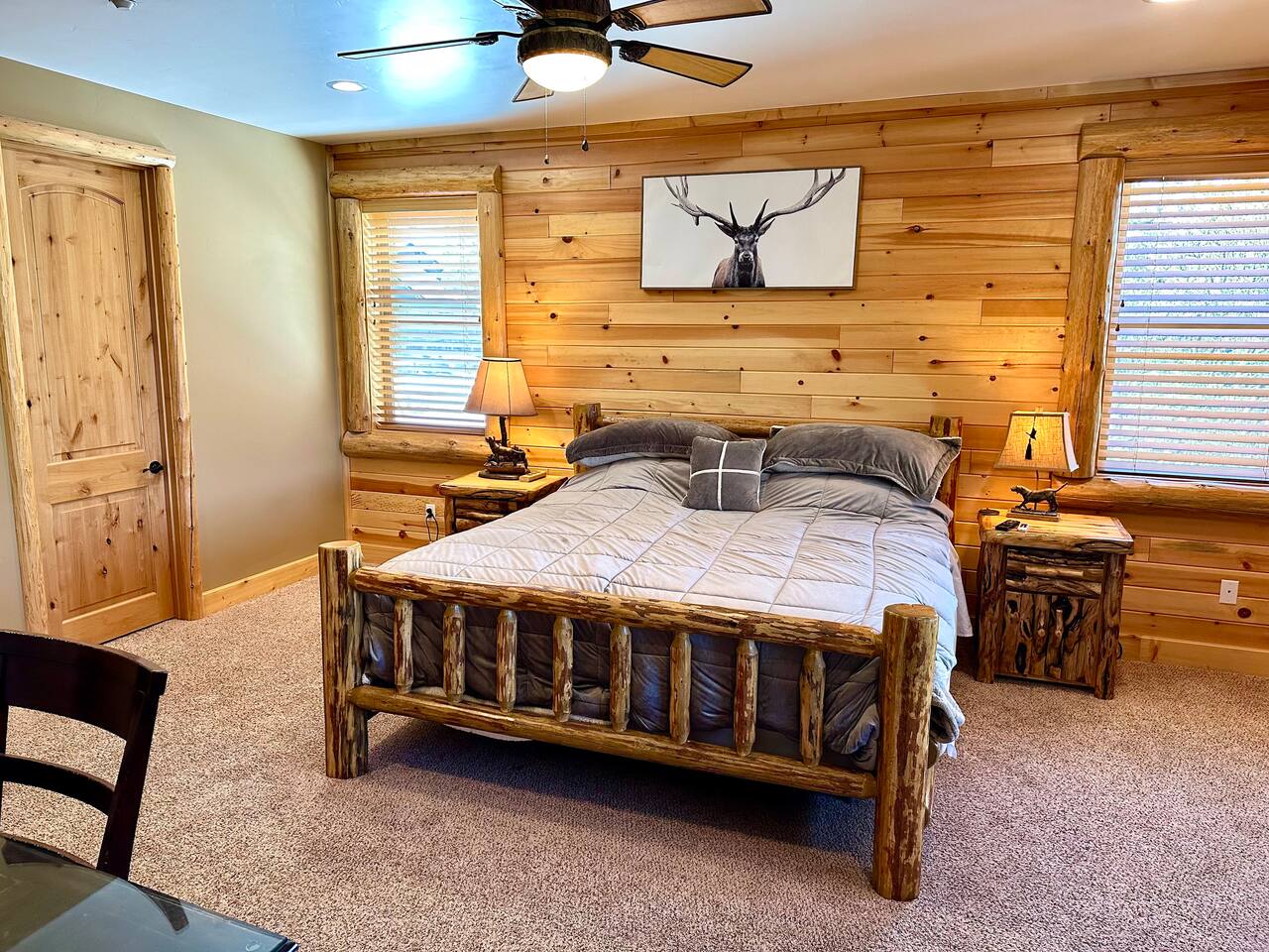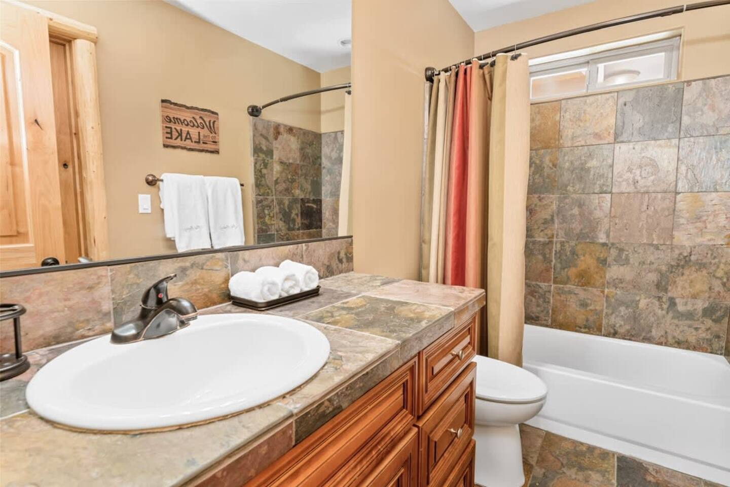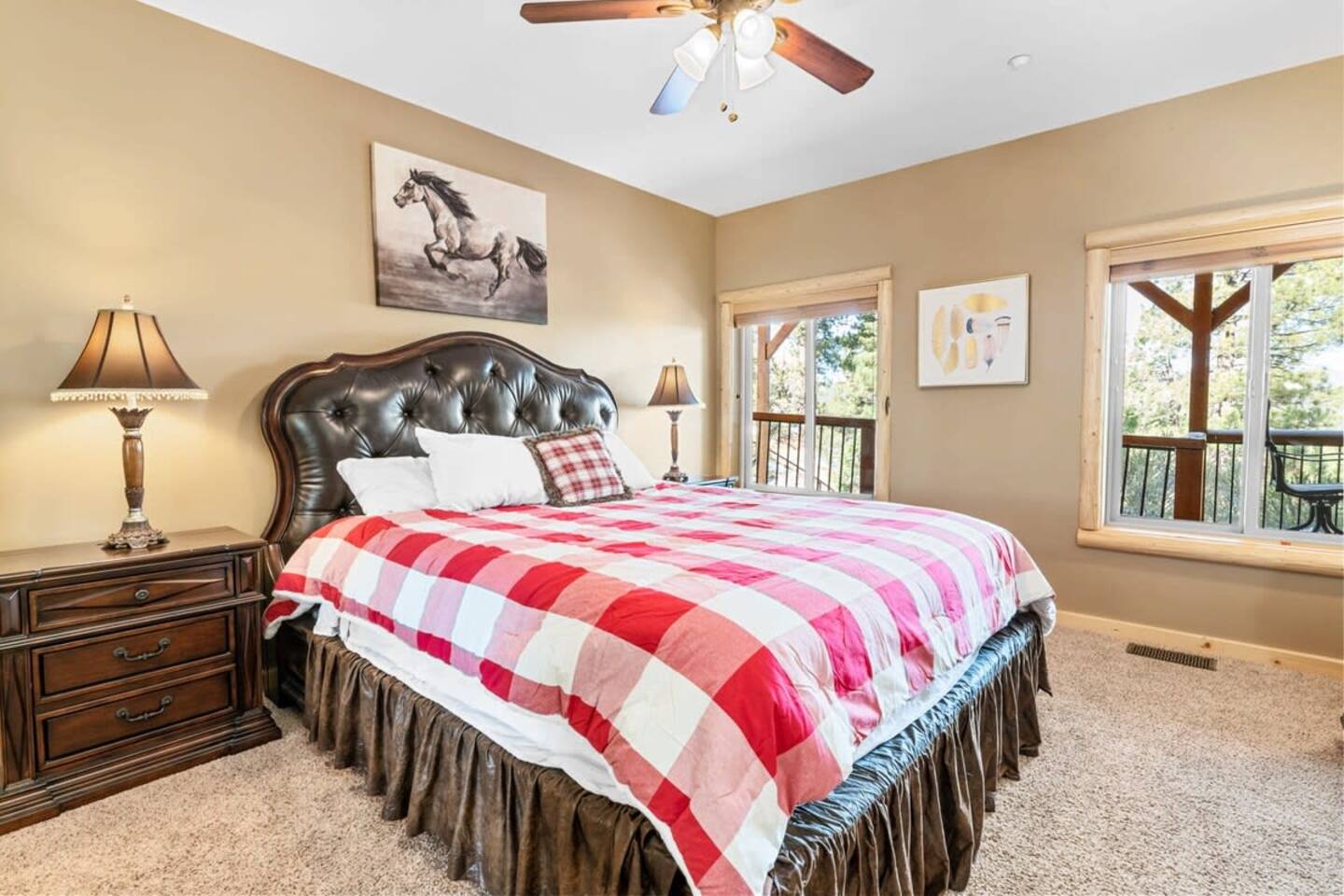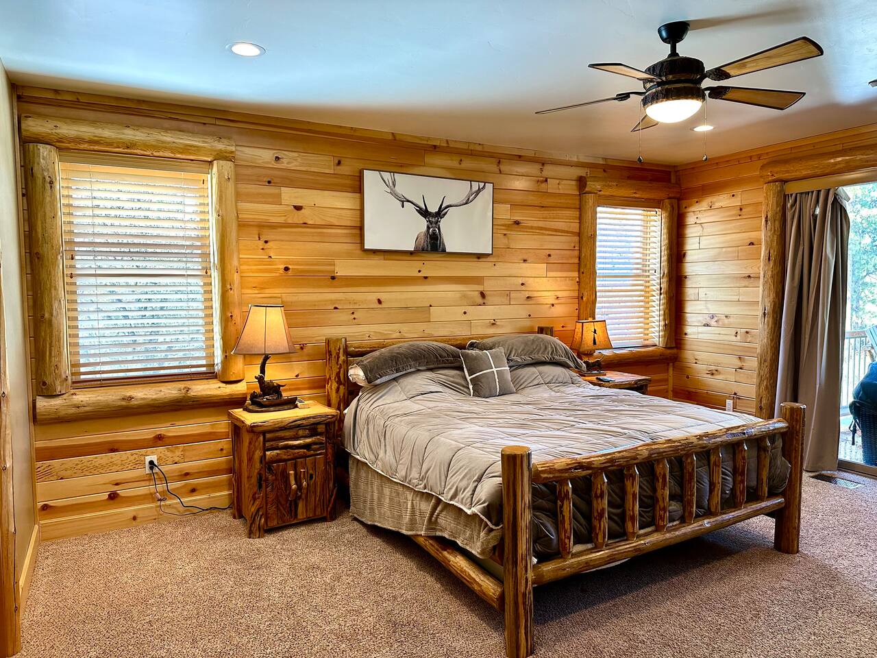 Welcome to Big Bucks Lodge! This gorgeous custom cabin in the exclusive Ironwood Estates neighborhood of Big Bear Lake, just a 10 min walk to the village and the lake, has 3 levels, 6 bedrooms, 3 decks, 4.5 bathrooms, & nearly 4,300 sq. ft. of luxury. Big Bucks Lodge has everything you and your family can imagine in a cabin in Big Bear. From lake views to a fully stocked chef's kitchen with Viking appliances to a movie theater room to a pool table and arcade game room and of course outdoor seating with amazing views and a hot tub, you'll never want to leave! There is parking for 2 cars in the garage. -------------------- AMENITIES Big Bucks Lodge has 2 primary bedroom suites (Bedroom #1 is on the main floor!), a wet bar called the Buck Off Bar, a game room, a movie room, 2 fireplaces (1 gas & 1 wood), & a private hot tub. The gourmet kitchen with Viking appliances is a cook's dream. All bedding & linens are provided by our professional cleaning crew. This spectacular cabin is the perfect getaway for family, friends, & even dogs! Additional amenities include free high speed Wi-Fi, a movie room with a home theater, a game room, TVs with streaming services, central air conditioning (AC), an arcade console with 400+ video games, breathtaking lake views, & more! -------------------- OCCUPANCY Big Bear Lake local ordinance 99.300 limits maximum occupancy to 16 people (14 adults) & 5 parked cars for Big Bucks Lodge. -------------------- LOCATION For your convenience, Big Bucks Lodge is in the upscale Ironwood Estates neighborhood of Big Bear & perfectly located just minutes from tons of activities - hiking, golfing, skiing, biking, swimming, & more. This spectacular retreat is 4.4 miles from Bear Mountain, 2.7 miles from Snow Summit, 3.4 miles from the Alpine Zoo, & 0.3 miles from Big Bear Village downtown shops & restaurants. -------------------- DOGS Dogs always stay for free at Big Bucks Lodge! The maximum number of dogs allowed for this cabin is 2. The yard is fenced off but please note that it is hilly. -------------------- ROOM DESCRIPTIONS * Entrance: Big Bucks Lodge has 3 levels and the entrance is located on the main level of the cabin. There are no stairs required to access the entrance. * Great Room: The luxurious open-concept great room has a grand wood fireplace, smart TV with streaming apps, an antique Everett baby grand piano, vaulted wood beam ceiling, spacious seating, 1 queen sofa pull out bed, a fake bison head, & large glass windows with breathtaking lake views. This room is on the main level and has access to the main level deck. There is also a closet full of board games on the main level. * Kitchen: The fully-stocked & open-concept gourmet kitchen has Viking stainless steel appliances including a refrigerator and 8 burner range with 2 ovens. There is also a microwave, 2 dishwashers, coffee makers (drip & K-cups), electric kettle, griddle, toaster, Ninja blender, air fryer, crock pot, & an island breakfast bar with seating for 4 guests. The kitchen is on the main level and has access to the main level deck. There is also a gas BBQ grill on the main deck. * Dining Area: There is a large dining table with seating adjacent to the open-concept great room and kitchen. * Movie Room: This dedicated media room with a home theater is located on the lower level. It has a motorized movie theater screen, projector with Apple TV, surround sound, plush individual seating for 8 guests, & classic movie theater themed decor. * Game Room: The game room is located on the upper level. It has a wet bar called the Buck Off Bar with a wine fridge, a pool table, a poker table, a gas fireplace, a TV with streaming services, an arcade console with 400+ video games, & seating for guests. This room has beautiful views of Big Bear and access to the upper deck. There is also a closet full of board games on the main level. * Laundry Room: The laundry room has a full size washer and dryer available for your convenience. This room is located on the main level. ----- BEDROOMS: Big Bucks Lodge has 6 bedrooms. All linens & 100% cotton sheets are provided by our professional cleaning crew. * Bedroom #1: This primary bedroom suite located on the main floor has 1 Eastern king bed, ceiling fan, carpet floor, charming rustic decor, and a private full bathroom (Bathroom #1). The Eastern king bed is a Split Sleep Number iLE 360 smart bed with a remote. * Bedroom #2: This bedroom on the lower level has 1 California king bed, ceiling fan, TV, dresser, and carpet floor. This bedroom is located next to the Movie Room and Bathroom #2. * Bedroom #3 (Bunk Bed Room): This dedicated bunk bed room on the lower level has 2 bunk beds, carpet floor, and ceiling fan. The first bunk bed has 1 twin bed over 1 queen bed with a twin XL trundle bed. The second bunk bed has 1 twin bed over 1 twin bed. * Bedroom #4: This primary bedroom suite on the upper level has 1 California king bed, ceiling fan, dresser, TV, and a private full bathroom (Bathroom #4). * Bedroom #5: This bedroom on the upper level has 1 queen bed, ceiling fan, carpet floor, and TV. * Bedroom #6: This bedroom on the upper level has 1 queen bed, ceiling fan, carpet floor, and TV. ----- BATHROOMS: Big Bucks Lodge has 4.5 (4 full & 1 half) bathrooms. * Bathroom #1: This full bathroom on the main level is adjacent to Bedroom #1, one of the two primary suites in Big Bucks Lodge. It has dual sinks, a walk-in shower, & a claw foot bathtub. * Bathroom #2: This full bathroom on the lower level has dual sinks and a walk-in shower. It is located next to the Movie Room, Bedroom #2, and Bedroom #3. * Bathroom #3: This full bathroom on the upper level has a combination shower with bathtub. * Bathroom #4: This full bathroom on the upper level is adjacent to Bedroom #4, one of the two primary suites in Big Bucks Cabin. It has a walk-in shower and dual sinks. * Bathroom #5: This half bathroom is located on the main level. ----- DECKS: Big Bucks Lodge is a large 3 story luxury cabin w