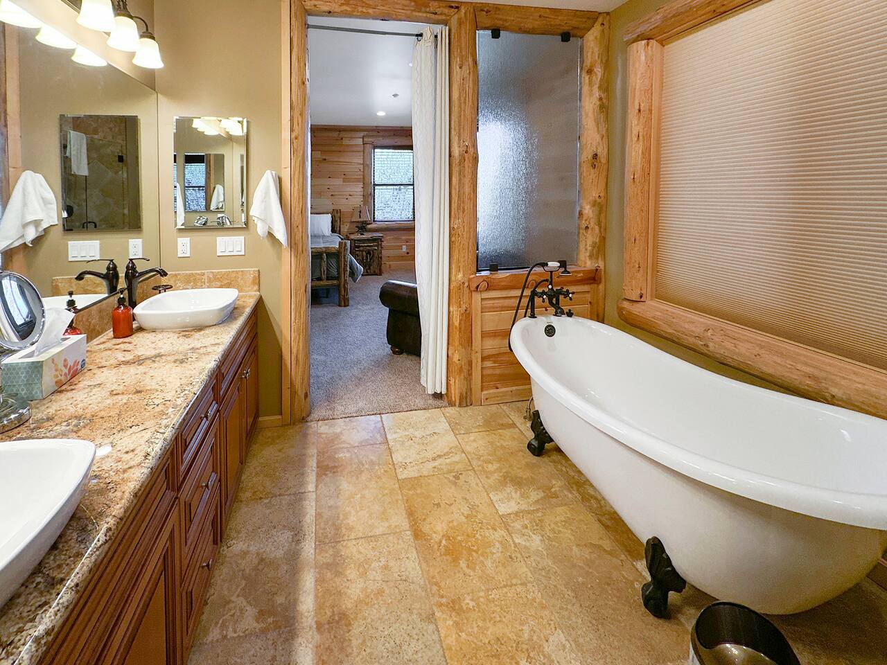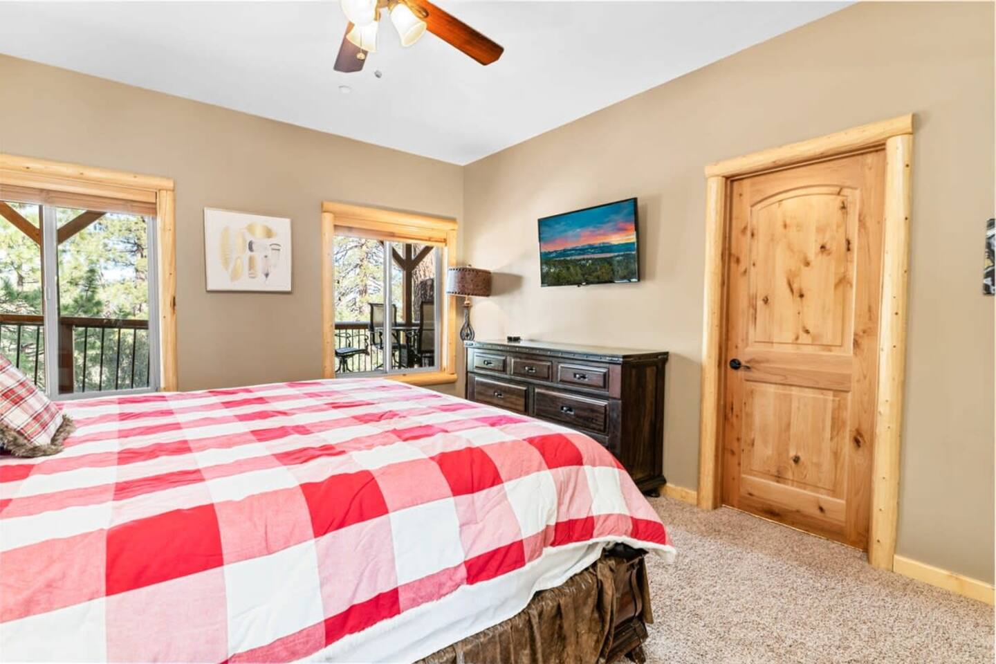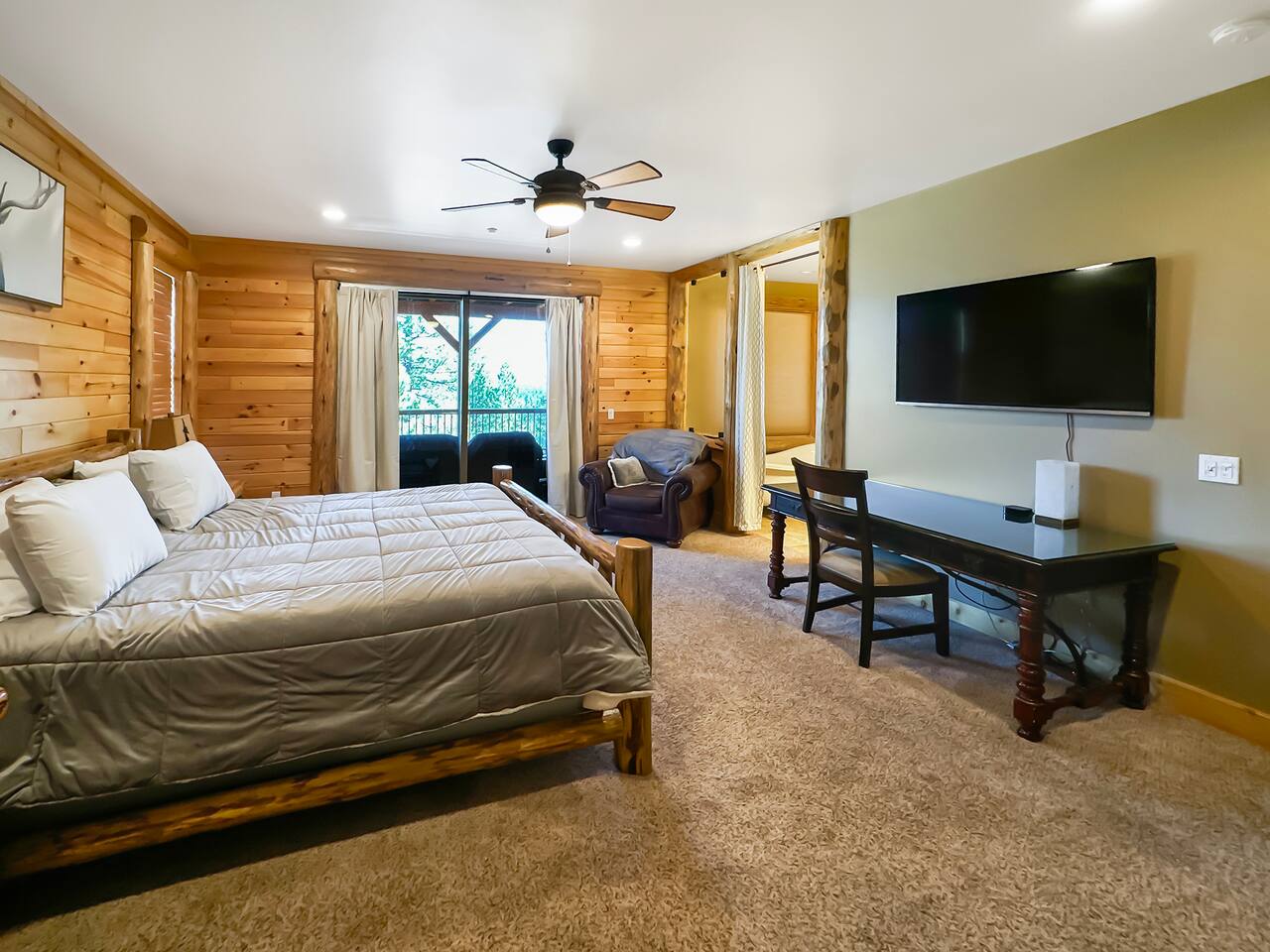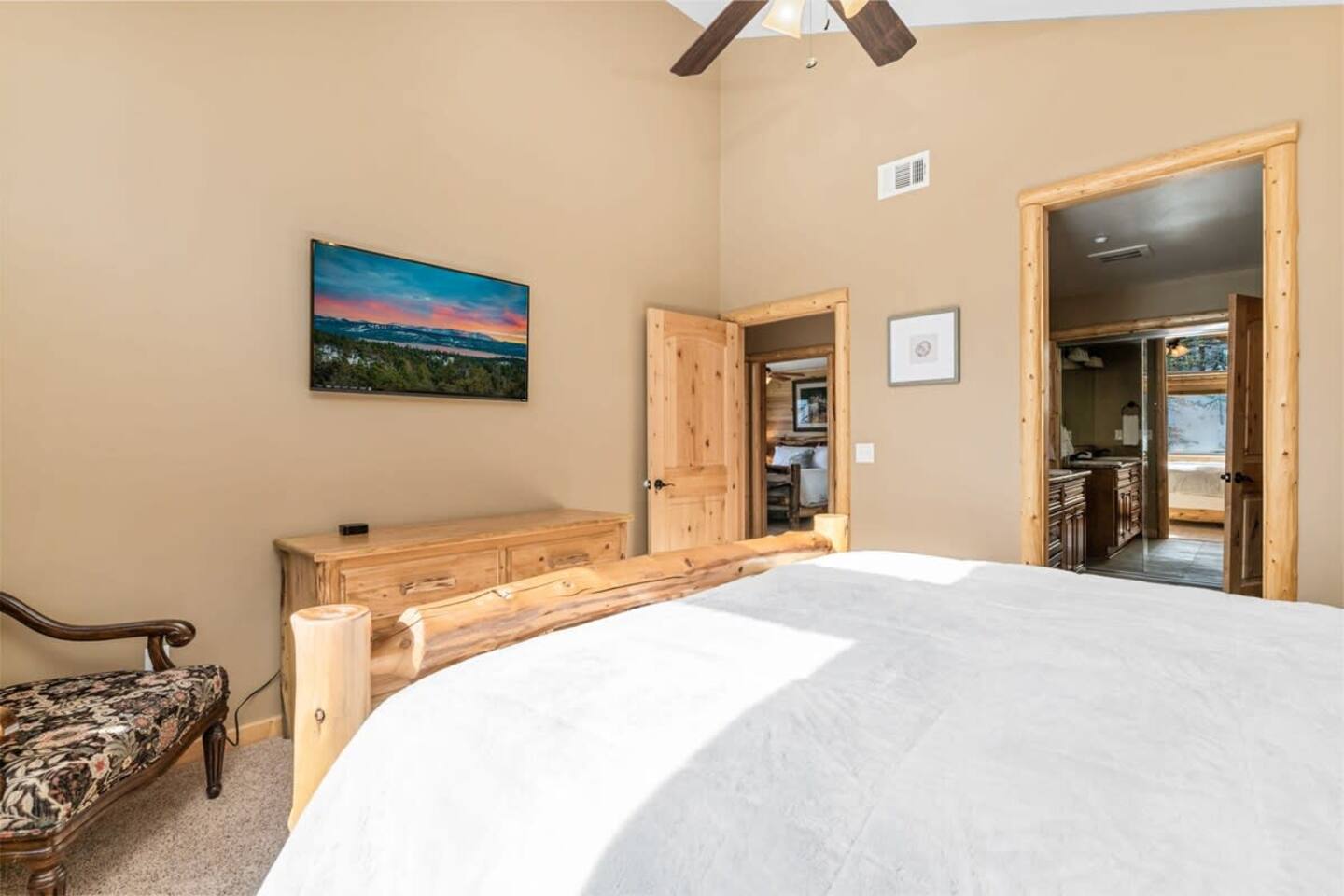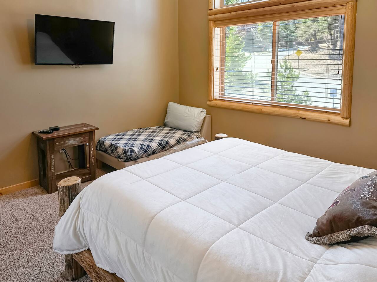 Welcome to Big Bucks Lodge! This gorgeous custom cabin in the exclusive Ironwood Estates neighborhood of Big Bear Lake, just a 10 min walk to the village and the lake, has 3 levels, 6 bedrooms, 3 decks, 4.5 bathrooms, & nearly 4,300 sq. ft. of luxury. Big Bucks Lodge has everything you and your family can imagine in a cabin in Big Bear. From lake views to a fully stocked chef's kitchen with Viking appliances to a movie theater room to a pool table and arcade game room and of course outdoor seating with amazing views and a hot tub, you'll never want to leave! There is parking for 2 cars in the garage. -------------------- AMENITIES Big Bucks Lodge has 2 primary bedroom suites (Bedroom #1 is on the main floor!), a wet bar called the Buck Off Bar, a game room, a movie room, 2 fireplaces (1 gas & 1 wood), & a private hot tub. The gourmet kitchen with Viking appliances is a cook's dream. All bedding & linens are provided by our professional cleaning crew. This spectacular cabin is the perfect getaway for family, friends, & even dogs! Additional amenities include free high speed Wi-Fi, a movie room with a home theater, a game room, TVs with streaming services, central air conditioning (AC), an arcade console with 400+ video games, breathtaking lake views, & more! -------------------- OCCUPANCY Big Bear Lake local ordinance 99.300 limits maximum occupancy to 16 people (14 adults) & 5 parked cars for Big Bucks Lodge. -------------------- LOCATION For your convenience, Big Bucks Lodge is in the upscale Ironwood Estates neighborhood of Big Bear & perfectly located just minutes from tons of activities - hiking, golfing, skiing, biking, swimming, & more. This spectacular retreat is 4.4 miles from Bear Mountain, 2.7 miles from Snow Summit, 3.4 miles from the Alpine Zoo, & 0.3 miles from Big Bear Village downtown shops & restaurants. -------------------- DOGS Dogs always stay for free at Big Bucks Lodge! The maximum number of dogs allowed for this cabin is 2. The yard is fenced off but please note that it is hilly. -------------------- ROOM DESCRIPTIONS * Entrance: Big Bucks Lodge has 3 levels and the entrance is located on the main level of the cabin. There are no stairs required to access the entrance. * Great Room: The luxurious open-concept great room has a grand wood fireplace, smart TV with streaming apps, an antique Everett baby grand piano, vaulted wood beam ceiling, spacious seating, 1 queen sofa pull out bed, a fake bison head, & large glass windows with breathtaking lake views. This room is on the main level and has access to the main level deck. There is also a closet full of board games on the main level. * Kitchen: The fully-stocked & open-concept gourmet kitchen has Viking stainless steel appliances including a refrigerator and 8 burner range with 2 ovens. There is also a microwave, 2 dishwashers, coffee makers (drip & K-cups), electric kettle, griddle, toaster, Ninja blender, air fryer, crock pot, & an island breakfast bar with seating for 4 guests. The kitchen is on the main level and has access to the main level deck. There is also a gas BBQ grill on the main deck. * Dining Area: There is a large dining table with seating adjacent to the open-concept great room and kitchen. * Movie Room: This dedicated media room with a home theater is located on the lower level. It has a motorized movie theater screen, projector with Apple TV, surround sound, plush individual seating for 8 guests, & classic movie theater themed decor. * Game Room: The game room is located on the upper level. It has a wet bar called the Buck Off Bar with a wine fridge, a pool table, a poker table, a gas fireplace, a TV with streaming services, an arcade console with 400+ video games, & seating for guests. This room has beautiful views of Big Bear and access to the upper deck. There is also a closet full of board games on the main level. * Laundry Room: The laundry room has a full size washer and dryer available for your convenience. This room is located on the main level. ----- BEDROOMS: Big Bucks Lodge has 6 bedrooms. All linens & 100% cotton sheets are provided by our professional cleaning crew. * Bedroom #1: This primary bedroom suite located on the main floor has 1 Eastern king bed, ceiling fan, carpet floor, charming rustic decor, and a private full bathroom (Bathroom #1). The Eastern king bed is a Split Sleep Number iLE 360 smart bed with a remote. * Bedroom #2: This bedroom on the lower level has 1 California king bed, ceiling fan, TV, dresser, and carpet floor. This bedroom is located next to the Movie Room and Bathroom #2. * Bedroom #3 (Bunk Bed Room): This dedicated bunk bed room on the lower level has 2 bunk beds, carpet floor, and ceiling fan. The first bunk bed has 1 twin bed over 1 queen bed with a twin XL trundle bed. The second bunk bed has 1 twin bed over 1 twin bed. * Bedroom #4: This primary bedroom suite on the upper level has 1 California king bed, ceiling fan, dresser, TV, and a private full bathroom (Bathroom #4). * Bedroom #5: This bedroom on the upper level has 1 queen bed, ceiling fan, carpet floor, and TV. * Bedroom #6: This bedroom on the upper level has 1 queen bed, ceiling fan, carpet floor, and TV. ----- BATHROOMS: Big Bucks Lodge has 4.5 (4 full & 1 half) bathrooms. * Bathroom #1: This full bathroom on the main level is adjacent to Bedroom #1, one of the two primary suites in Big Bucks Lodge. It has dual sinks, a walk-in shower, & a claw foot bathtub. * Bathroom #2: This full bathroom on the lower level has dual sinks and a walk-in shower. It is located next to the Movie Room, Bedroom #2, and Bedroom #3. * Bathroom #3: This full bathroom on the upper level has a combination shower with bathtub. * Bathroom #4: This full bathroom on the upper level is adjacent to Bedroom #4, one of the two primary suites in Big Bucks Cabin. It has a walk-in shower and dual sinks. * Bathroom #5: This half bathroom is located on the main level. ----- DECKS: Big Bucks Lodge is a large 3 story luxury cabin w