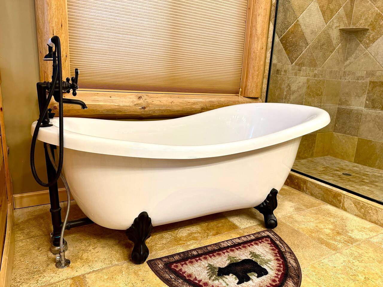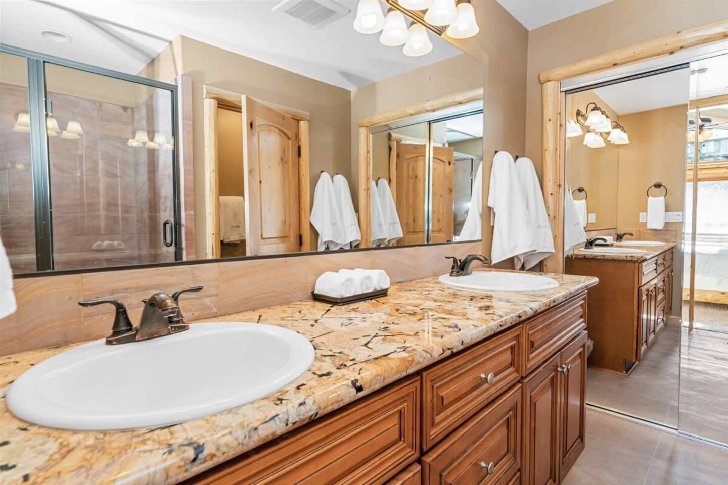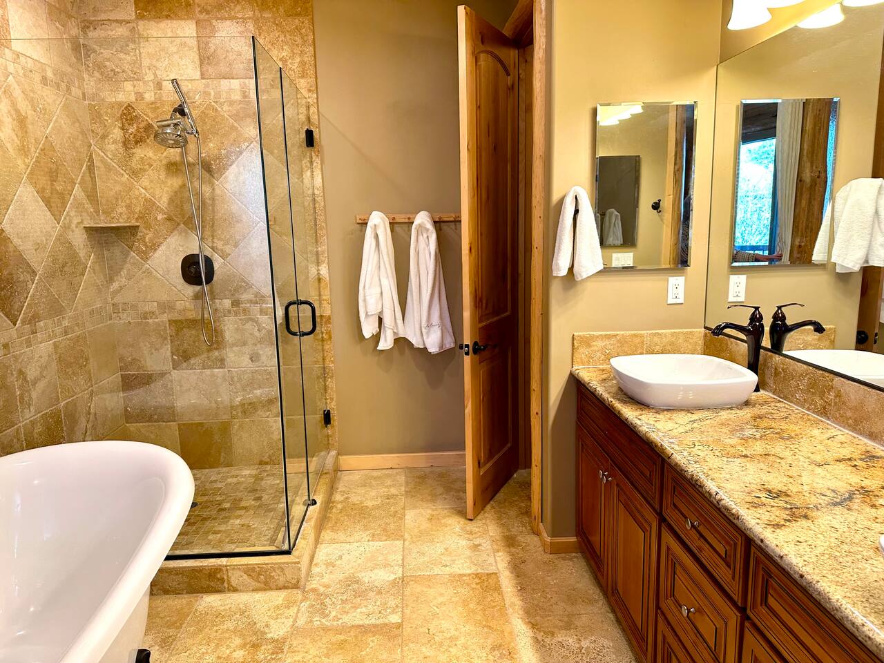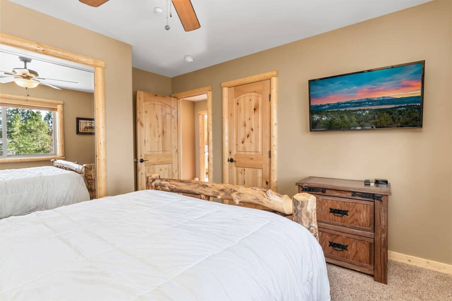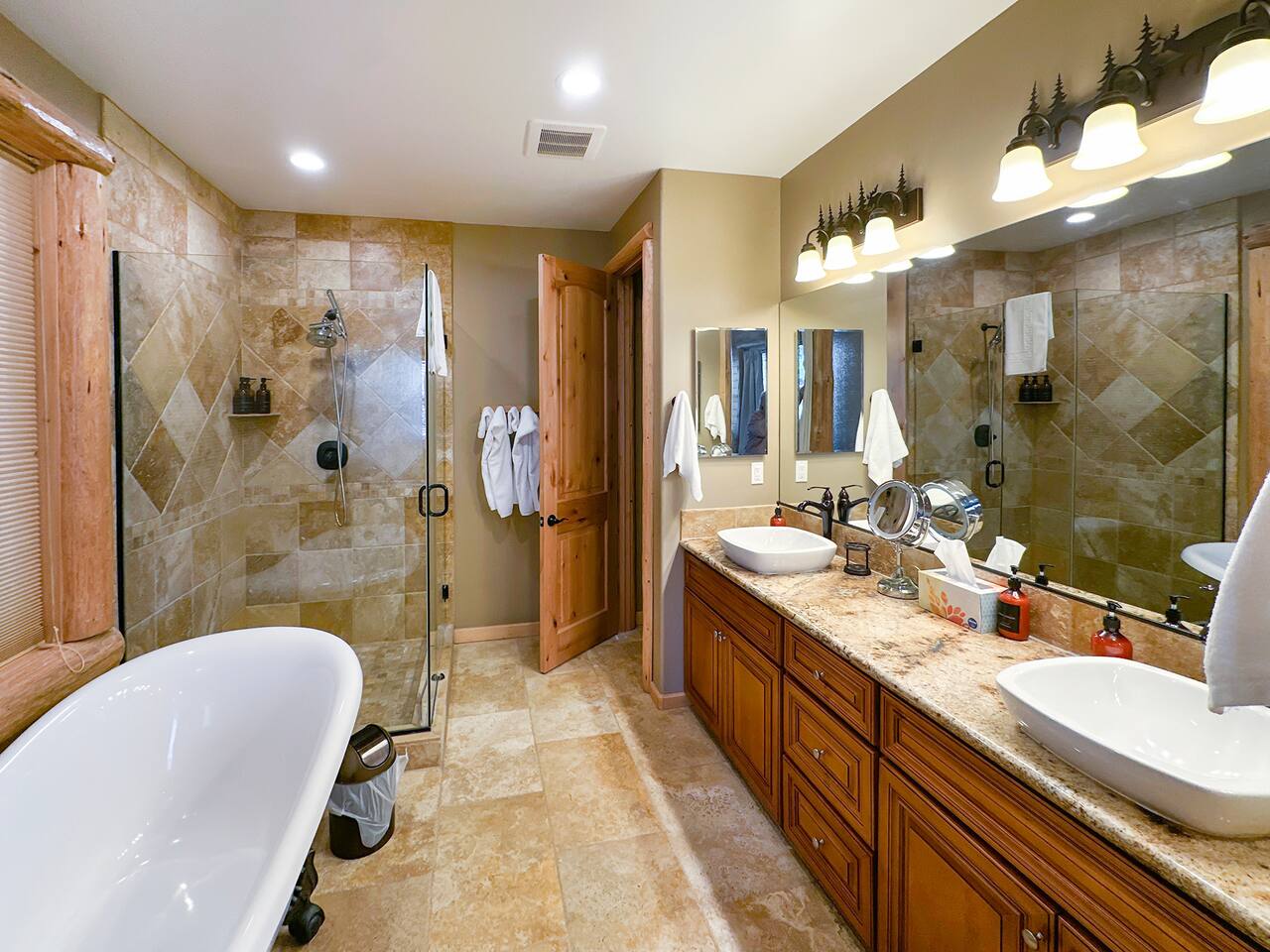 Welcome to Big Bucks Lodge! This gorgeous custom cabin in the exclusive Ironwood Estates neighborhood of Big Bear Lake, just a 10 min walk to the village and the lake, has 3 levels, 6 bedrooms, 3 decks, 4.5 bathrooms, & nearly 4,300 sq. ft. of luxury. Big Bucks Lodge has everything you and your family can imagine in a cabin in Big Bear. From lake views to a fully stocked chef's kitchen with Viking appliances to a movie theater room to a pool table and arcade game room and of course outdoor seating with amazing views and a hot tub, you'll never want to leave! There is parking for 2 cars in the garage. -------------------- AMENITIES Big Bucks Lodge has 2 primary bedroom suites (Bedroom #1 is on the main floor!), a wet bar called the Buck Off Bar, a game room, a movie room, 2 fireplaces (1 gas & 1 wood), & a private hot tub. The gourmet kitchen with Viking appliances is a cook's dream. All bedding & linens are provided by our professional cleaning crew. This spectacular cabin is the perfect getaway for family, friends, & even dogs! Additional amenities include free high speed Wi-Fi, a movie room with a home theater, a game room, TVs with streaming services, central air conditioning (AC), an arcade console with 400+ video games, breathtaking lake views, & more! -------------------- OCCUPANCY Big Bear Lake local ordinance 99.300 limits maximum occupancy to 16 people (14 adults) & 5 parked cars for Big Bucks Lodge. -------------------- LOCATION For your convenience, Big Bucks Lodge is in the upscale Ironwood Estates neighborhood of Big Bear & perfectly located just minutes from tons of activities - hiking, golfing, skiing, biking, swimming, & more. This spectacular retreat is 4.4 miles from Bear Mountain, 2.7 miles from Snow Summit, 3.4 miles from the Alpine Zoo, & 0.3 miles from Big Bear Village downtown shops & restaurants. -------------------- DOGS Dogs always stay for free at Big Bucks Lodge! The maximum number of dogs allowed for this cabin is 2. The yard is fenced off but please note that it is hilly. -------------------- ROOM DESCRIPTIONS * Entrance: Big Bucks Lodge has 3 levels and the entrance is located on the main level of the cabin. There are no stairs required to access the entrance. * Great Room: The luxurious open-concept great room has a grand wood fireplace, smart TV with streaming apps, an antique Everett baby grand piano, vaulted wood beam ceiling, spacious seating, 1 queen sofa pull out bed, a fake bison head, & large glass windows with breathtaking lake views. This room is on the main level and has access to the main level deck. There is also a closet full of board games on the main level. * Kitchen: The fully-stocked & open-concept gourmet kitchen has Viking stainless steel appliances including a refrigerator and 8 burner range with 2 ovens. There is also a microwave, 2 dishwashers, coffee makers (drip & K-cups), electric kettle, griddle, toaster, Ninja blender, air fryer, crock pot, & an island breakfast bar with seating for 4 guests. The kitchen is on the main level and has access to the main level deck. There is also a gas BBQ grill on the main deck. * Dining Area: There is a large dining table with seating adjacent to the open-concept great room and kitchen. * Movie Room: This dedicated media room with a home theater is located on the lower level. It has a motorized movie theater screen, projector with Apple TV, surround sound, plush individual seating for 8 guests, & classic movie theater themed decor. * Game Room: The game room is located on the upper level. It has a wet bar called the Buck Off Bar with a wine fridge, a pool table, a poker table, a gas fireplace, a TV with streaming services, an arcade console with 400+ video games, & seating for guests. This room has beautiful views of Big Bear and access to the upper deck. There is also a closet full of board games on the main level. * Laundry Room: The laundry room has a full size washer and dryer available for your convenience. This room is located on the main level. ----- BEDROOMS: Big Bucks Lodge has 6 bedrooms. All linens & 100% cotton sheets are provided by our professional cleaning crew. * Bedroom #1: This primary bedroom suite located on the main floor has 1 Eastern king bed, ceiling fan, carpet floor, charming rustic decor, and a private full bathroom (Bathroom #1). The Eastern king bed is a Split Sleep Number iLE 360 smart bed with a remote. * Bedroom #2: This bedroom on the lower level has 1 California king bed, ceiling fan, TV, dresser, and carpet floor. This bedroom is located next to the Movie Room and Bathroom #2. * Bedroom #3 (Bunk Bed Room): This dedicated bunk bed room on the lower level has 2 bunk beds, carpet floor, and ceiling fan. The first bunk bed has 1 twin bed over 1 queen bed with a twin XL trundle bed. The second bunk bed has 1 twin bed over 1 twin bed. * Bedroom #4: This primary bedroom suite on the upper level has 1 California king bed, ceiling fan, dresser, TV, and a private full bathroom (Bathroom #4). * Bedroom #5: This bedroom on the upper level has 1 queen bed, ceiling fan, carpet floor, and TV. * Bedroom #6: This bedroom on the upper level has 1 queen bed, ceiling fan, carpet floor, and TV. ----- BATHROOMS: Big Bucks Lodge has 4.5 (4 full & 1 half) bathrooms. * Bathroom #1: This full bathroom on the main level is adjacent to Bedroom #1, one of the two primary suites in Big Bucks Lodge. It has dual sinks, a walk-in shower, & a claw foot bathtub. * Bathroom #2: This full bathroom on the lower level has dual sinks and a walk-in shower. It is located next to the Movie Room, Bedroom #2, and Bedroom #3. * Bathroom #3: This full bathroom on the upper level has a combination shower with bathtub. * Bathroom #4: This full bathroom on the upper level is adjacent to Bedroom #4, one of the two primary suites in Big Bucks Cabin. It has a walk-in shower and dual sinks. * Bathroom #5: This half bathroom is located on the main level. ----- DECKS: Big Bucks Lodge is a large 3 story luxury cabin w