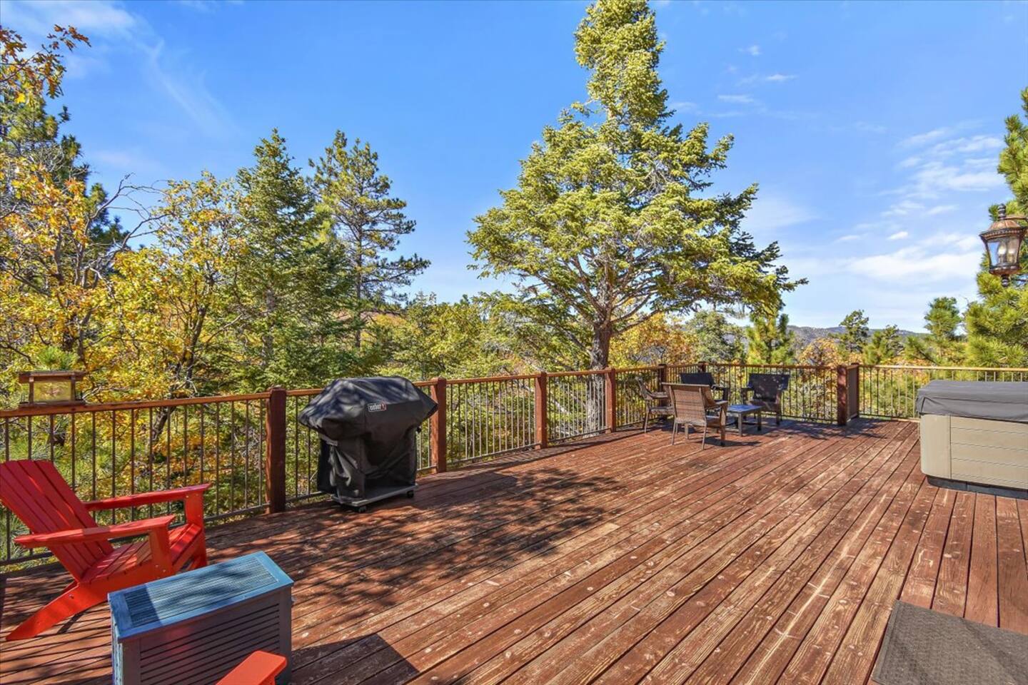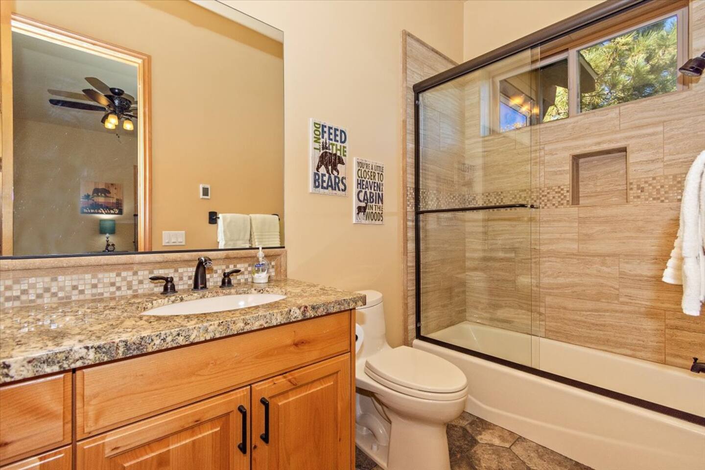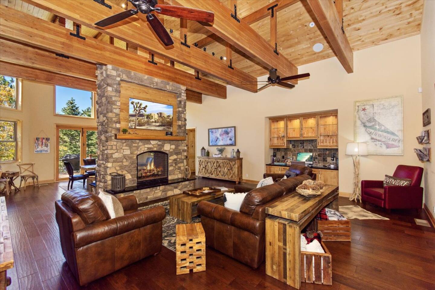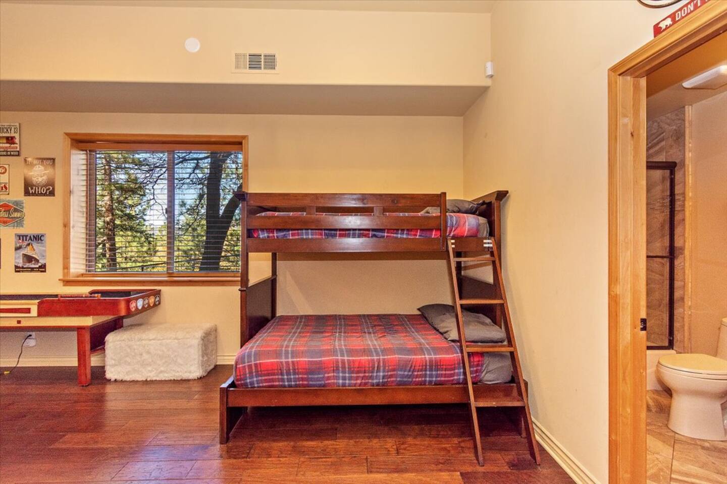 Welcome to Angels Camp! Your family and friends will love the luxury, comfort, and roominess of this 4800+ sq. ft. cabin with a spacious hot tub deck outside connecting you with nature. Every bedroom has its own attached ensuite bathroom. This breathtaking getaway in the Upper Moonridge neighborhood of Big Bear has 2 levels, 4 bedrooms, 5.5 bathrooms, & a nearly half acre fully fenced lot. Big Bear Lake local ordinance 99.300 limits maximum occupancy to 13 guests & 5 parked cars for Angels Camp. Angels Camp has 2 master suites, 2 wet bars, a stacked stone two-sided gas fireplace, a dedicated game room, ensuite bathrooms with heated floors for all 4 bedrooms, a hot tub, and amenities galore. The kitchen is fully-stocked and all bedding & linens are provided by our professional cleaning crew. This upscale cabin is the perfect getaway for family & friends! Amenities include free high speed Wi-Fi, smart TVs, central air conditioning (AC), and gorgeous forest views. For your convenience, Angels Camp is perfectly located just minutes from tons of Big Bear activities including hiking, golfing, skiing, biking, swimming, & more. LIVING ROOM: The open concept living room is located on the main level. It features a stacked stone two-sided gas fireplace, hardwood floor, a wet bar, Samsung smart TV with cable, and a Denon speaker (surround sound). With a large sofa and two armchairs, there is plenty of seating for guests. A workstation with a built-in desk and an iMac computer are available for guest use. Board games and puzzles are located in the large wooden cabinet. High speed Wi-Fi is free. DINING ROOM: The open concept formal dining room is located on the main level next to the living room. It features a large rustic wood dining table with seating for 8 guests in front of the dual-sided gas fireplace. It has a hardwood floor, small game table with seating for 2 guests, beautiful forest views, and access to the large private deck. Extra table linens and place settings are stored in a wooden cabinet in the living room. KITCHEN: The fully-stocked kitchen is a chef's dream come true! Located on the main level next to the dining room, it has stainless steel appliances, oak cabinets, an island, granite counters, hardwood floor, and a breakfast bar with seating for 3 guests. Features include a 6 burner gas range with griddle, double ovens, microwave, toaster oven, drip coffee maker, dishwasher, over-sized refrigerator, electric kettle, Denon speaker, and more. DECK: The expansive private deck has a Weber barbecue grill, outdoor seating, and a Bullfrog spa. This deck can be accessed through the dining room on the main level. BEDROOM #1: This master bedroom is located on the main level. It has 1 California king bed, hardwood floor, Samsung smart TV with sound bar, Denon speaker, Nest thermostat, and walk-in closet. The ensuite bathroom (bathroom #1) has a Jacuzzi bathtub, waterfall shower, toilet, and dual sinks with a built-in vanity. BATHROOM #1: The full private master bathroom for bedroom #1 is located on the main level. It has a Jacuzzi spa bathtub, waterfall shower, toilet, dual sinks with a built-in vanity, and a heated floor. LAUNDRY ROOM: The laundry room is located on the main level next to the garage. It has a full size washer and dryer, sink, and first aid kit. PLAYROOM: This dedicated playroom for children is located on the main level. It has an electric keyboard, play tent, stuffed animals, and big windows with beautiful views. BEDROOM #2: This bedroom is located on the main level. It has 2 full beds with an ensuite bathroom (bathroom #2), Nest thermostat, beautiful forest views, and hardwood floor. BATHROOM #2: The full private bathroom for bedroom #2 is located on the main level. It has a bathtub with shower, toilet, sink, and a heated floor. BEDROOM #3: This bedroom is located on the main level. It has 1 queen bed with an ensuite bathroom (bathroom #3), hardwood floor, and charming decor. BATHROOM #3: The full private bathroom for bedroom #3 is located on the main level. It has a walk-in shower, toilet, sink, and a heated floor. BEDROOM #4: This bedroom is located on the main level. It has 1 king bed with an ensuite bathroom (bathroom #4), hardwood floor, and private access to the deck (and hot tub!). BATHROOM #4: The full private bathroom for bedroom #4 is located on the main level. It has a walk-in shower, toilet, sink, and a heated floor. BEDROOM #5 / GAME ROOM - This downstairs bedroom has 1 bunk bed (1 twin bed over 1 full bed) and serves as a game room. Features include a Samsung smart TV with cable, wet bar with refrigerator, Nest thermostat, Denon speaker, big sectional sofa, high-top game table with seating for 4 guests, shuffleboard, foosball table, PS4 video game console, Crokinole, and access to a concrete deck. This room can serve as a 5th bedroom. BATHROOM #5: This full bathroom is located on the downstairs level next to the Game Room. It has a bathtub with shower, toilet, sink, and a heated floor. BATHROOM #6: This half bathroom with a sink and toilet is located off the Living Room on the main level. BACKYARD: Angels Camp has a nearly half acre lot with a fully fenced backyard that is perfect for children and pets. Please note that garage access is allowed. However, there are no garage door remotes. There are several Google Home / Alexa devices in the home. These devices are turned "On" and will capture voice. Feel free to turn off the microphones on the devices. We do allow 1 well behaved, house trained dog who can not be left alone in the cabin at any time.