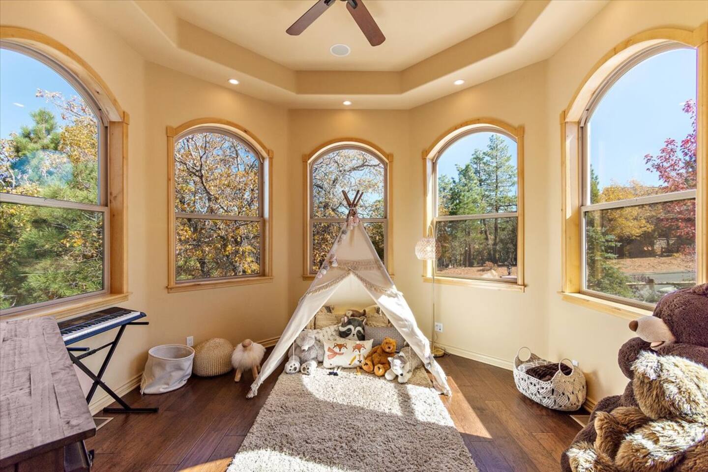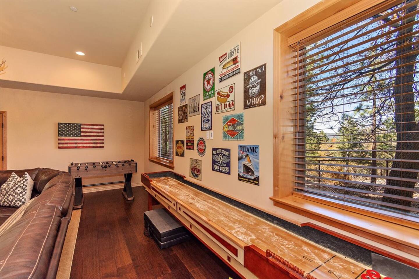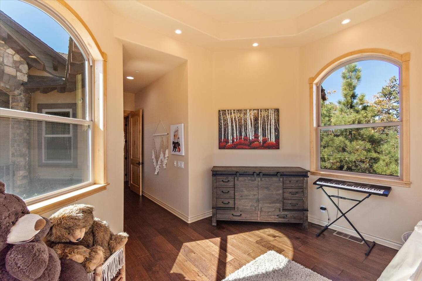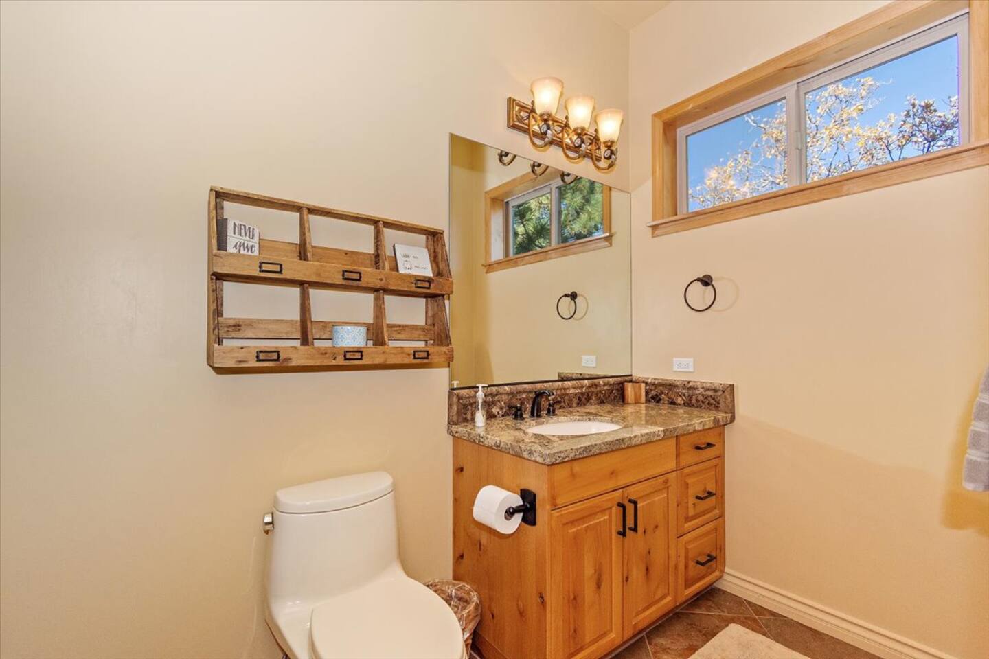Welcome to Angels Camp! Your family and friends will love the luxury, comfort, and roominess of this 4800+ sq. ft. cabin with a spacious hot tub deck outside connecting you with nature. Every bedroom has its own attached ensuite bathroom. This breathtaking getaway in the Upper Moonridge neighborhood of Big Bear has 2 levels, 4 bedrooms, 5.5 bathrooms, & a nearly half acre fully fenced lot. Big Bear Lake local ordinance 99.300 limits maximum occupancy to 13 guests & 5 parked cars for Angels Camp. Angels Camp has 2 master suites, 2 wet bars, a stacked stone two-sided gas fireplace, a dedicated game room, ensuite bathrooms with heated floors for all 4 bedrooms, a hot tub, and amenities galore. The kitchen is fully-stocked and all bedding & linens are provided by our professional cleaning crew. This upscale cabin is the perfect getaway for family & friends! Amenities include free high speed Wi-Fi, smart TVs, central air conditioning (AC), and gorgeous forest views. For your convenience, Angels Camp is perfectly located just minutes from tons of Big Bear activities including hiking, golfing, skiing, biking, swimming, & more. LIVING ROOM: The open concept living room is located on the main level. It features a stacked stone two-sided gas fireplace, hardwood floor, a wet bar, Samsung smart TV with cable, and a Denon speaker (surround sound). With a large sofa and two armchairs, there is plenty of seating for guests. A workstation with a built-in desk and an iMac computer are available for guest use. Board games and puzzles are located in the large wooden cabinet. High speed Wi-Fi is free. DINING ROOM: The open concept formal dining room is located on the main level next to the living room. It features a large rustic wood dining table with seating for 8 guests in front of the dual-sided gas fireplace. It has a hardwood floor, small game table with seating for 2 guests, beautiful forest views, and access to the large private deck. Extra table linens and place settings are stored in a wooden cabinet in the living room. KITCHEN: The fully-stocked kitchen is a chef's dream come true! Located on the main level next to the dining room, it has stainless steel appliances, oak cabinets, an island, granite counters, hardwood floor, and a breakfast bar with seating for 3 guests. Features include a 6 burner gas range with griddle, double ovens, microwave, toaster oven, drip coffee maker, dishwasher, over-sized refrigerator, electric kettle, Denon speaker, and more. DECK: The expansive private deck has a Weber barbecue grill, outdoor seating, and a Bullfrog spa. This deck can be accessed through the dining room on the main level. BEDROOM #1: This master bedroom is located on the main level. It has 1 California king bed, hardwood floor, Samsung smart TV with sound bar, Denon speaker, Nest thermostat, and walk-in closet. The ensuite bathroom (bathroom #1) has a Jacuzzi bathtub, waterfall shower, toilet, and dual sinks with a built-in vanity. BATHROOM #1: The full private master bathroom for bedroom #1 is located on the main level. It has a Jacuzzi spa bathtub, waterfall shower, toilet, dual sinks with a built-in vanity, and a heated floor. LAUNDRY ROOM: The laundry room is located on the main level next to the garage. It has a full size washer and dryer, sink, and first aid kit. PLAYROOM: This dedicated playroom for children is located on the main level. It has an electric keyboard, play tent, stuffed animals, and big windows with beautiful views. BEDROOM #2: This bedroom is located on the main level. It has 2 full beds with an ensuite bathroom (bathroom #2), Nest thermostat, beautiful forest views, and hardwood floor. BATHROOM #2: The full private bathroom for bedroom #2 is located on the main level. It has a bathtub with shower, toilet, sink, and a heated floor. BEDROOM #3: This bedroom is located on the main level. It has 1 queen bed with an ensuite bathroom (bathroom #3), hardwood floor, and charming decor. BATHROOM #3: The full private bathroom for bedroom #3 is located on the main level. It has a walk-in shower, toilet, sink, and a heated floor. BEDROOM #4: This bedroom is located on the main level. It has 1 king bed with an ensuite bathroom (bathroom #4), hardwood floor, and private access to the deck (and hot tub!). BATHROOM #4: The full private bathroom for bedroom #4 is located on the main level. It has a walk-in shower, toilet, sink, and a heated floor. BEDROOM #5 / GAME ROOM - This downstairs bedroom has 1 bunk bed (1 twin bed over 1 full bed) and serves as a game room. Features include a Samsung smart TV with cable, wet bar with refrigerator, Nest thermostat, Denon speaker, big sectional sofa, high-top game table with seating for 4 guests, shuffleboard, foosball table, PS4 video game console, Crokinole, and access to a concrete deck. This room can serve as a 5th bedroom. BATHROOM #5: This full bathroom is located on the downstairs level next to the Game Room. It has a bathtub with shower, toilet, sink, and a heated floor. BATHROOM #6: This half bathroom with a sink and toilet is located off the Living Room on the main level. BACKYARD: Angels Camp has a nearly half acre lot with a fully fenced backyard that is perfect for children and pets. Please note that garage access is allowed. However, there are no garage door remotes. There are several Google Home / Alexa devices in the home. These devices are turned "On" and will capture voice. Feel free to turn off the microphones on the devices. We do allow 1 well behaved, house trained dog who can not be left alone in the cabin at any time.