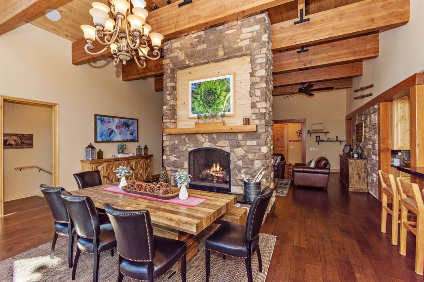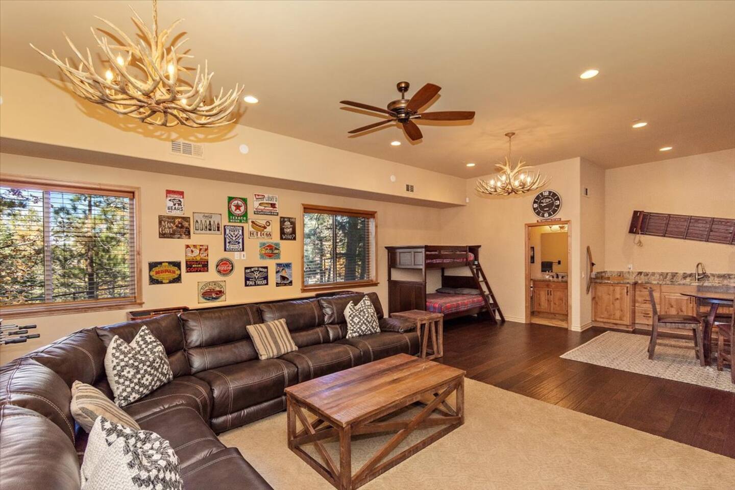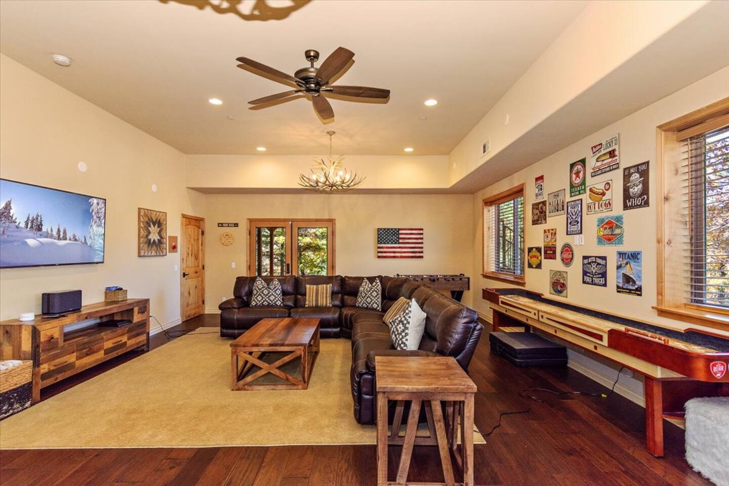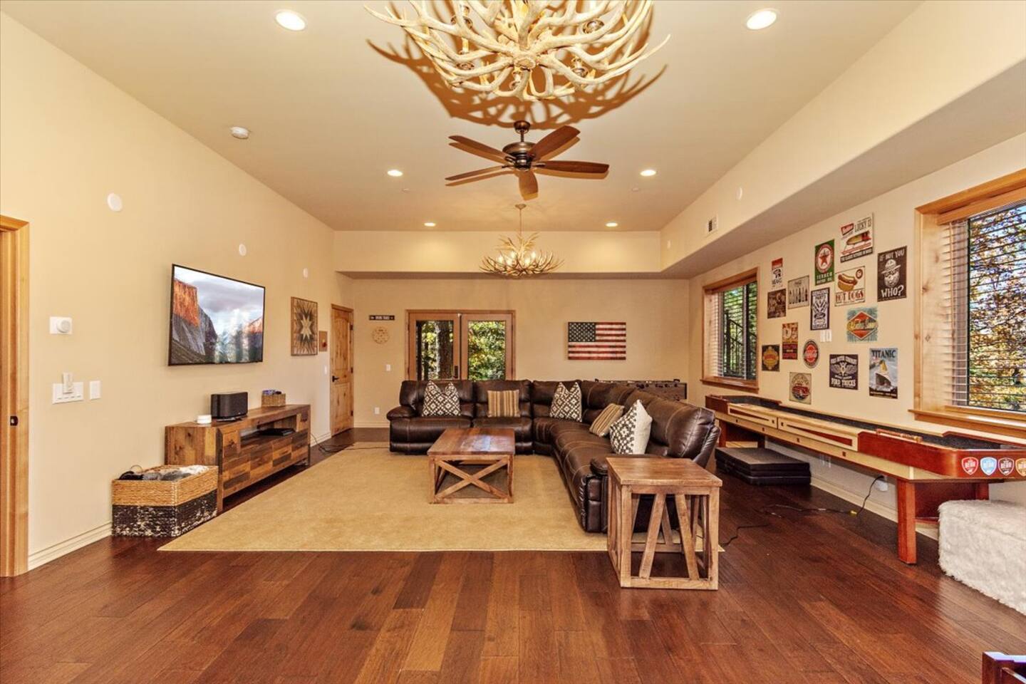 Welcome to Angels Camp! This grand luxury cabin has 4800+ sq. ft., 5 bedrooms, 5.5 baths (every bedroom is an ensuite!), & central air conditioning (AC)! Enjoy a soak in the private hot tub, play in the game room, or cuddle up in front of the dual gas fireplace. Enjoy the chef's kitchen or surf the web in the computer cubby with an iMac computer. This exceptional retreat has a large enclosed yard, a spacious deck, washer & dryer, and amenities galore! Angels Camp is the perfect getaway!