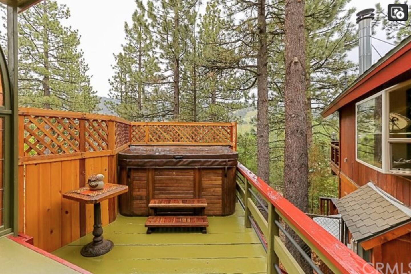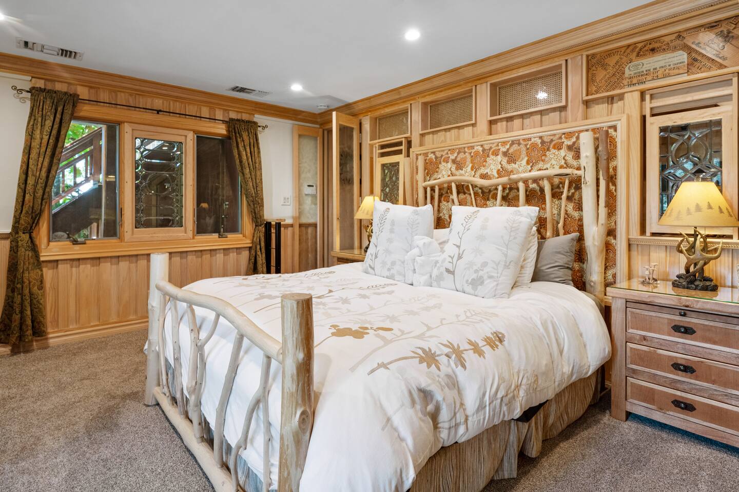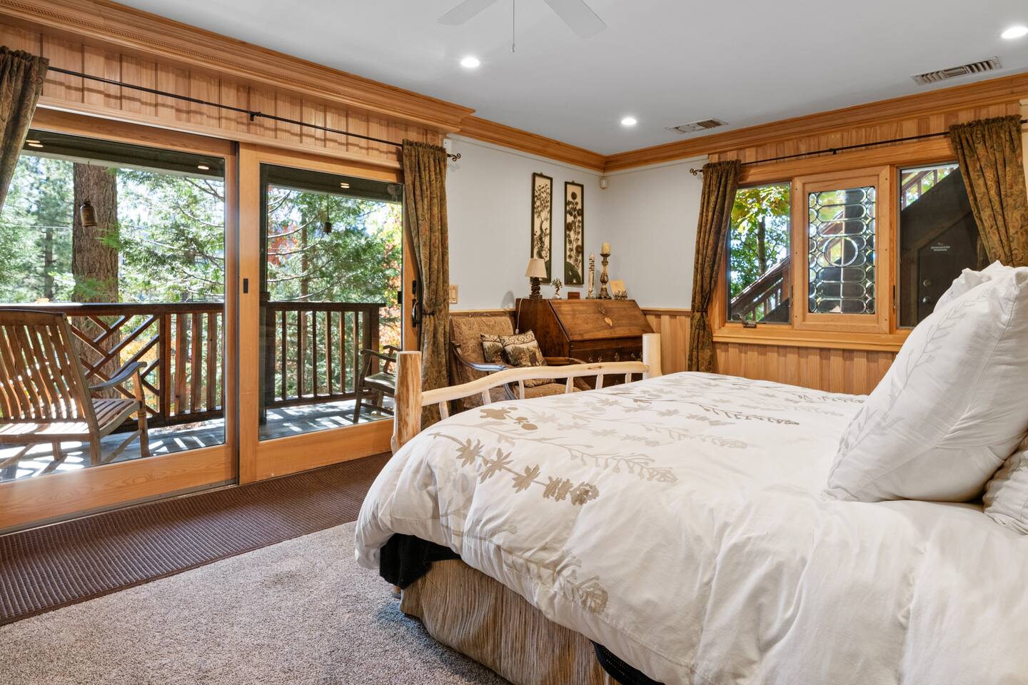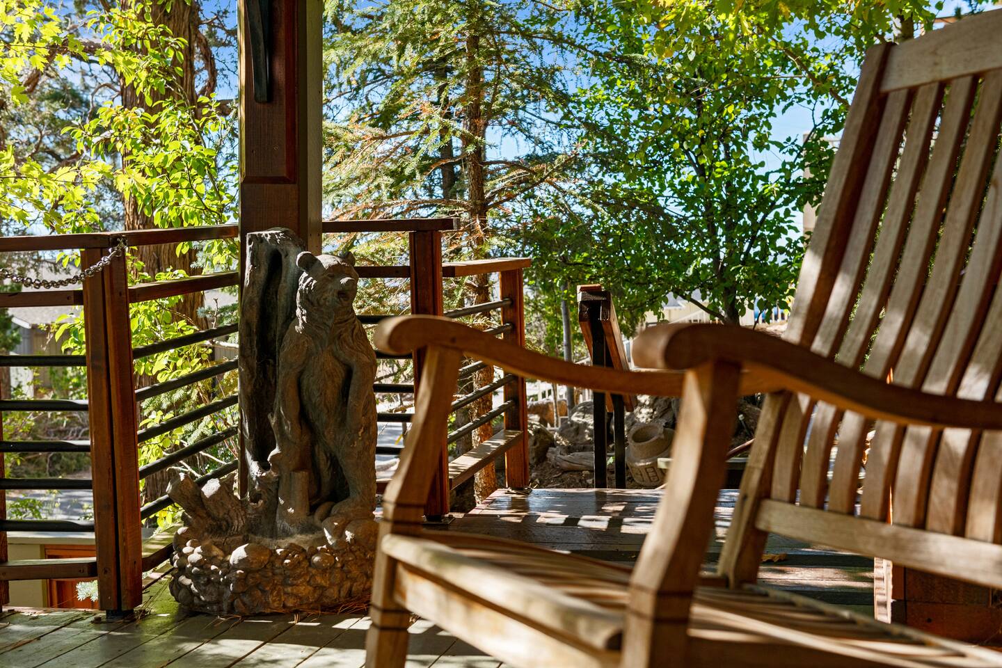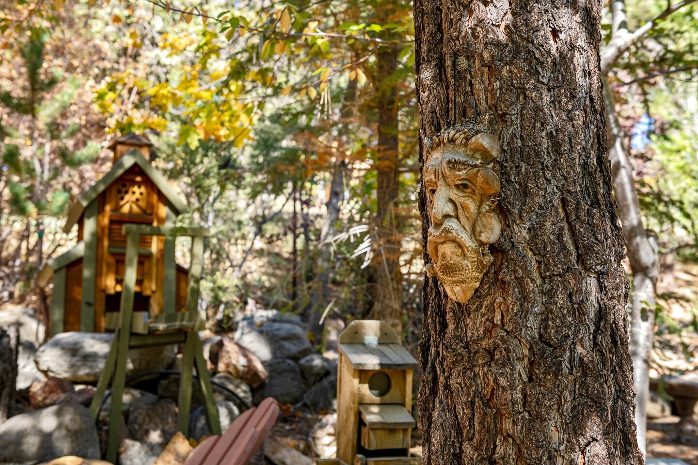 Step into the Tree of Life – an Artisan Treehouse, an exclusive one-of-a-kind retreat in the heart of Big Bear Lake/Moonridge. Just three minutes from Bear Mountain skiing, this extraordinary escape offers an unparalleled experience where you'll feel as if you're floating among the trees, surrounded by natural beauty, crisp mountain air, breathtaking vistas, and uncompromising luxury. It's a destination getaway unlike any other in the Big Bear Lake. This magnificent mountain retreat was meticulously created over a 10-year period by Master Craftsman Gerard as a loving ode to his ballerina wife. He poured his heart and soul into this home, a testament to his unwavering love and dedication, which you'll find reflected in every detail of the property. One-of-a-kind features, custom woodwork, and custom glasswork shine throughout the house, creating a unique and artistic atmosphere. The home is adorned with art and handcrafted furniture from around the world. The living room on the upper/main level offers a cozy ambiance while retaining the ease of an open floor plan. You'll find plush leather sofas with cozy thows. The living area has a flat-screen TV, cable, Apple TV, a PS3 gaming system, a surround sound system, and a game area with various board games to enjoy. The kitchen, a true culinary delight, boasts an integrated refrigerator and freezer, high-quality pots and pans, dinnerware and flatware, a Frigidaire Gallery oven, a gas stovetop, a tiled center island with a breakfast bar, and a trash compactor. There is a coffee station for your convenience. The dining room features a one-of-a-kind handcrafted table made from Bubinga wood, a treasure brought back from a journey to Africa, where you can savor delicious meals in front of the wood-burning fireplace. Bedroom #1, known as the "Tree of Life" room, is on the main level and features a cozy queen-size bed. This romantic masterpiece boasts a truly unique and stunning centerpiece – the "Tree of Life" mosaic. Within this room, you'll discover custom leaded glasswork and three 200-pound cedar closet doors adorned with a crushed rock, glass, and tile mosaic that took over a year to create. This testament to craftsmanship is a work of artistry that tells a story of love and dedication, mirroring the commitment of the Master Craftsman. The Tree of Life Room has an attached ensuite bath (Bathroom #1) with a jacuzzi tub and shower. Bedroom #2, located downstairs, is a cozy and unique haven. It features a luxurious king-size bed, an ensuite bath (Bathroom #2), and a jacuzzi tub. Bathroom #2 has an attached laundry with a washer and dryer for added convenience. This room offers a snug and inviting atmosphere and even has a private deck, providing a unique space to relax and enjoy the beauty of the surroundings. Bathroom #1 is an ensuite connected to Bedroom #1. Full bath with glass vessel sink and jacuzzi tub. Bathroom #2 is an ensuite connected to Bedroom #2. Full bath with jacuzzi tub and connected laundry room with full size washer and dryer. The main living area opens to the backyard, allowing you to seamlessly connect with the natural beauty that surrounds this unique haven. You'll find an outdoor kitchen with a propane barbecue grill and a multi-level outdoor space with several seating areas, including a charming tree spirit (mysterious face carved into a tree trunk), a chess table, and private areas that are perfect for reflecting on nature or sharing an intimate chat over a drink. The hot tub is in a private deck area, that provides an ideal vantage point to gaze at the ski slopes and the lush treetop views surrounding the property. During the winter season, you find an abundance of sleds and snow gear in the closet under the stairs for your use. This is not just a home; it's a five-star accommodation, a masterpiece that embodies the heart and soul of artisan craftsmanship, from the intricate work and rare items from across the globe to the love and artistry that has gone into every corner. The Tree of Life Artisan Treehouse is an unparalleled getaway where luxury, artistry, and nature converge to create an experience that is simply beyond compare in the Big Bear Lake Valley. It's a destination that promises a truly unforgettable retreat, a unique haven where you can escape the ordinary and immerse yourself in the extraordinary. The driveway is steep an narrow so in the winter you MUST have AWD vehicle with chains. If you do not have this- please do not book as you might not be able to get into the driveway. There are over 40 stairs to climb as well to get to the front door. The view is worth it!