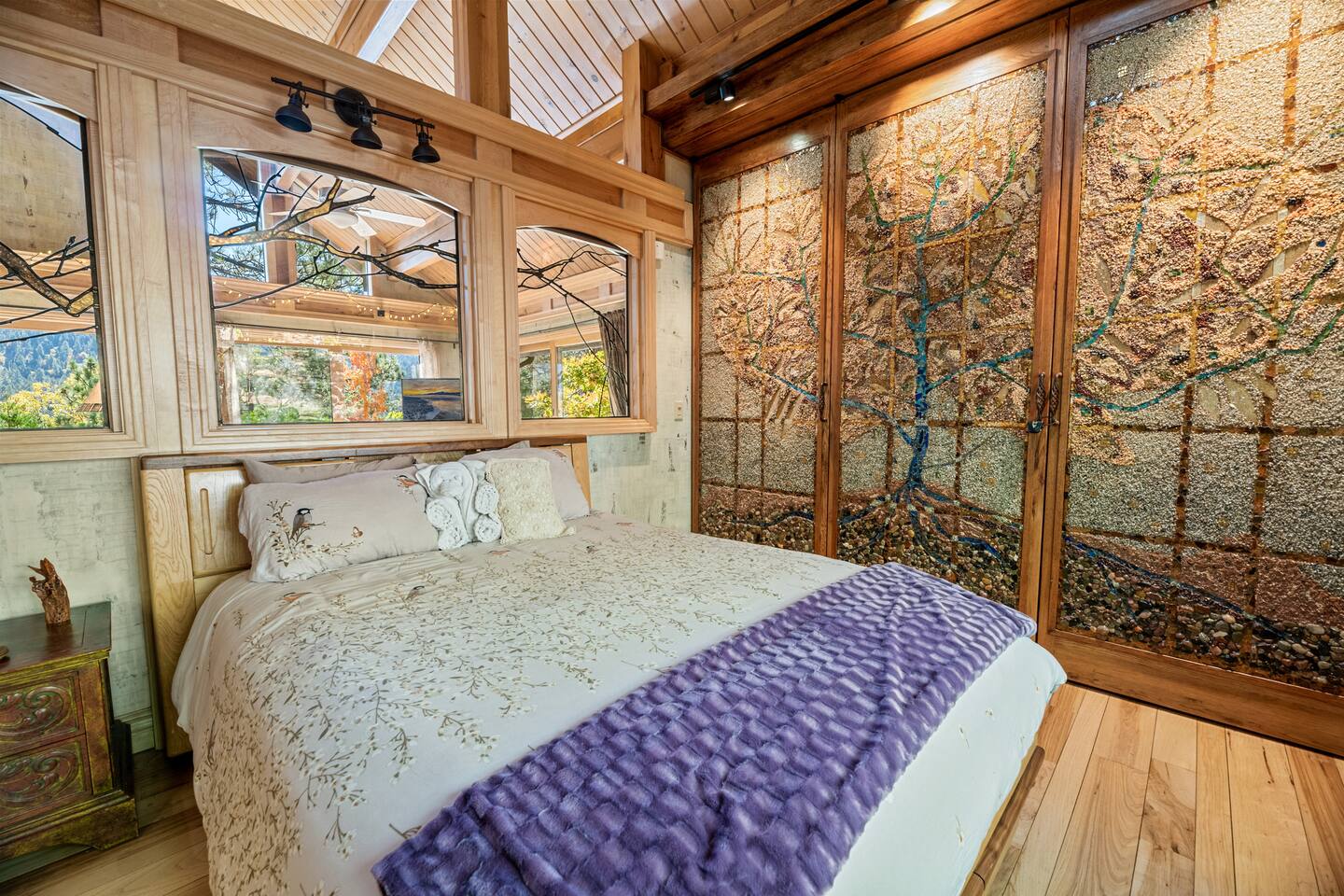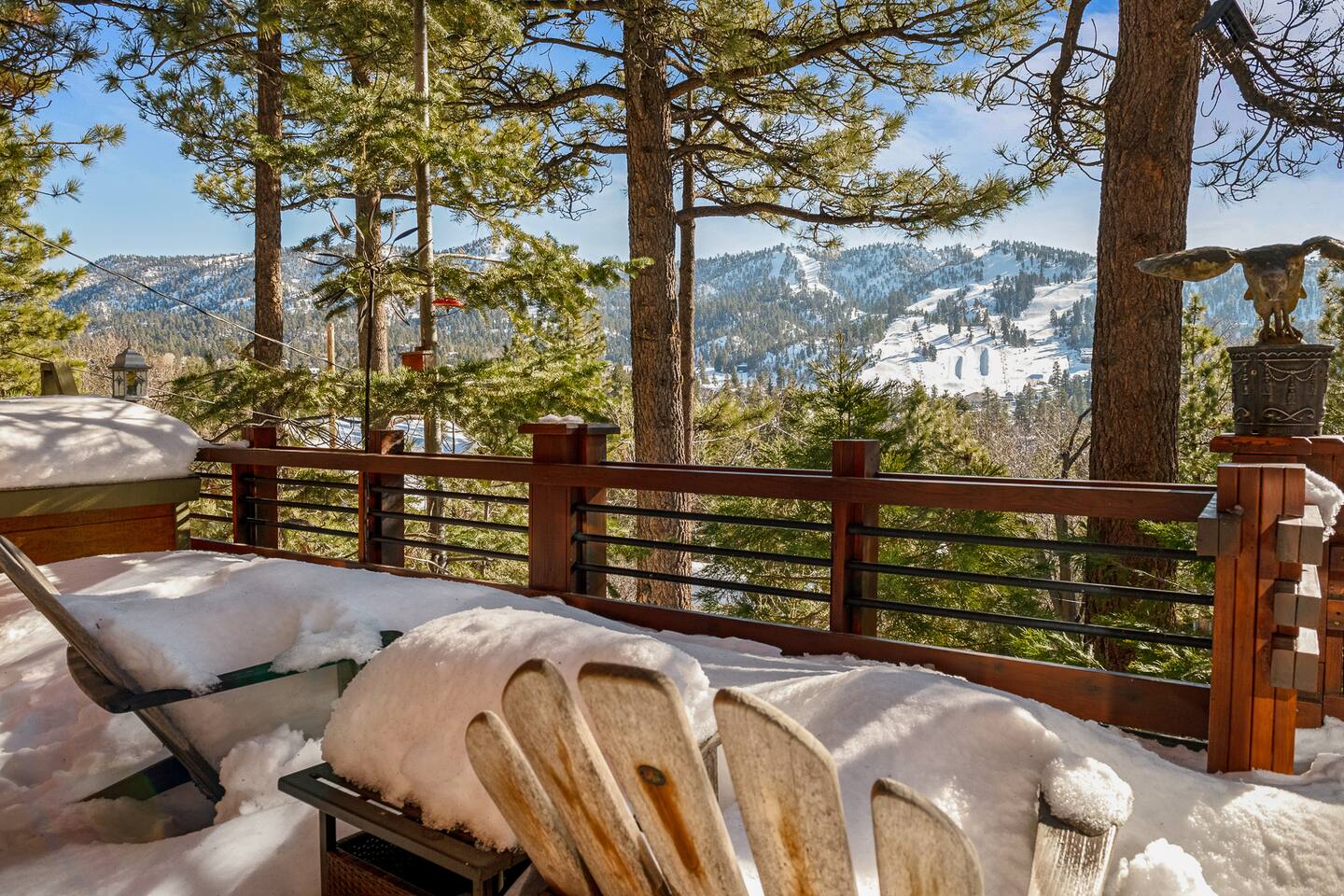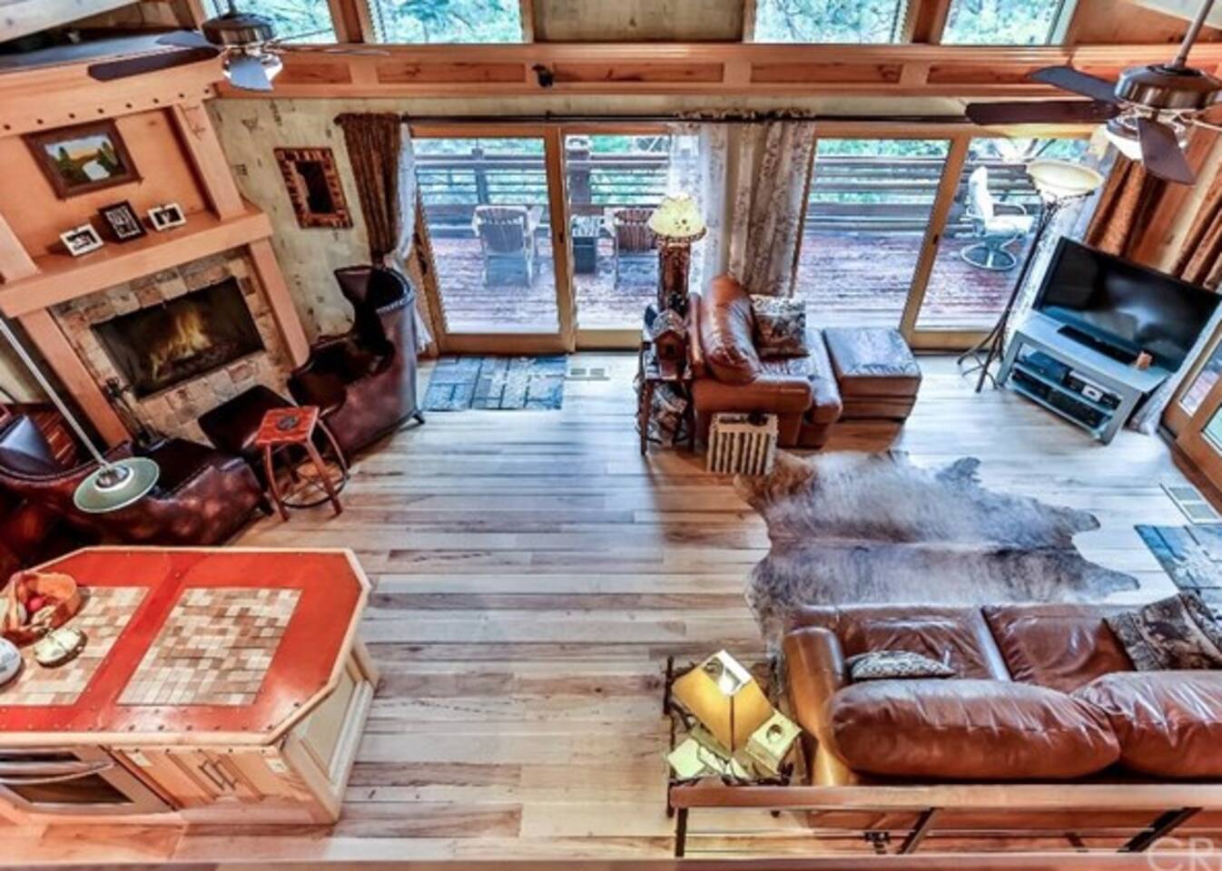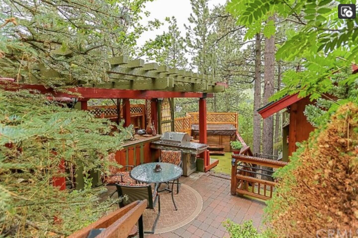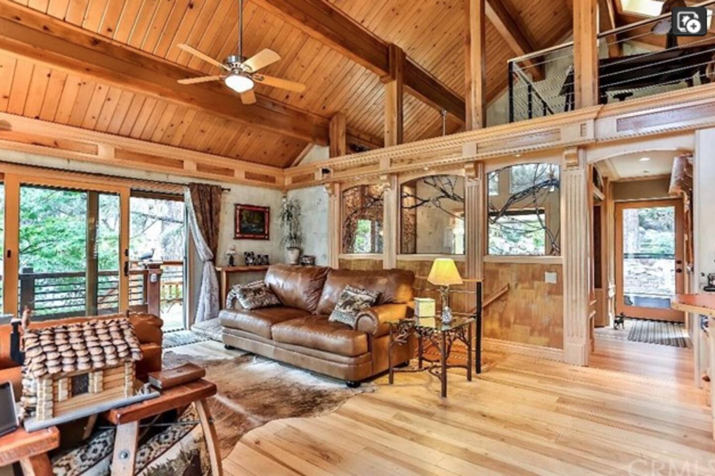 Step into the Tree of Life – an Artisan Treehouse, an exclusive one-of-a-kind retreat in the heart of Big Bear Lake/Moonridge. Just three minutes from Bear Mountain skiing, this extraordinary escape offers an unparalleled experience where you'll feel as if you're floating among the trees, surrounded by natural beauty, crisp mountain air, breathtaking vistas, and uncompromising luxury. It's a destination getaway unlike any other in the Big Bear Lake. This magnificent mountain retreat was meticulously created over a 10-year period by Master Craftsman Gerard as a loving ode to his ballerina wife. He poured his heart and soul into this home, a testament to his unwavering love and dedication, which you'll find reflected in every detail of the property. One-of-a-kind features, custom woodwork, and custom glasswork shine throughout the house, creating a unique and artistic atmosphere. The home is adorned with art and handcrafted furniture from around the world. The living room on the upper/main level offers a cozy ambiance while retaining the ease of an open floor plan. You'll find plush leather sofas with cozy thows. The living area has a flat-screen TV, cable, Apple TV, a PS3 gaming system, a surround sound system, and a game area with various board games to enjoy. The kitchen, a true culinary delight, boasts an integrated refrigerator and freezer, high-quality pots and pans, dinnerware and flatware, a Frigidaire Gallery oven, a gas stovetop, a tiled center island with a breakfast bar, and a trash compactor. There is a coffee station for your convenience. The dining room features a one-of-a-kind handcrafted table made from Bubinga wood, a treasure brought back from a journey to Africa, where you can savor delicious meals in front of the wood-burning fireplace. Bedroom #1, known as the "Tree of Life" room, is on the main level and features a cozy queen-size bed. This romantic masterpiece boasts a truly unique and stunning centerpiece – the "Tree of Life" mosaic. Within this room, you'll discover custom leaded glasswork and three 200-pound cedar closet doors adorned with a crushed rock, glass, and tile mosaic that took over a year to create. This testament to craftsmanship is a work of artistry that tells a story of love and dedication, mirroring the commitment of the Master Craftsman. The Tree of Life Room has an attached ensuite bath (Bathroom #1) with a jacuzzi tub and shower. Bedroom #2, located downstairs, is a cozy and unique haven. It features a luxurious king-size bed, an ensuite bath (Bathroom #2), and a jacuzzi tub. Bathroom #2 has an attached laundry with a washer and dryer for added convenience. This room offers a snug and inviting atmosphere and even has a private deck, providing a unique space to relax and enjoy the beauty of the surroundings. Bathroom #1 is an ensuite connected to Bedroom #1. Full bath with glass vessel sink and jacuzzi tub. Bathroom #2 is an ensuite connected to Bedroom #2. Full bath with jacuzzi tub and connected laundry room with full size washer and dryer. The main living area opens to the backyard, allowing you to seamlessly connect with the natural beauty that surrounds this unique haven. You'll find an outdoor kitchen with a propane barbecue grill and a multi-level outdoor space with several seating areas, including a charming tree spirit (mysterious face carved into a tree trunk), a chess table, and private areas that are perfect for reflecting on nature or sharing an intimate chat over a drink. The hot tub is in a private deck area, that provides an ideal vantage point to gaze at the ski slopes and the lush treetop views surrounding the property. During the winter season, you find an abundance of sleds and snow gear in the closet under the stairs for your use. This is not just a home; it's a five-star accommodation, a masterpiece that embodies the heart and soul of artisan craftsmanship, from the intricate work and rare items from across the globe to the love and artistry that has gone into every corner. The Tree of Life Artisan Treehouse is an unparalleled getaway where luxury, artistry, and nature converge to create an experience that is simply beyond compare in the Big Bear Lake Valley. It's a destination that promises a truly unforgettable retreat, a unique haven where you can escape the ordinary and immerse yourself in the extraordinary. The driveway is steep an narrow so in the winter you MUST have AWD vehicle with chains. If you do not have this- please do not book as you might not be able to get into the driveway. There are over 40 stairs to climb as well to get to the front door. The view is worth it!