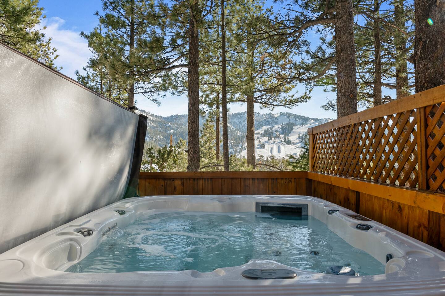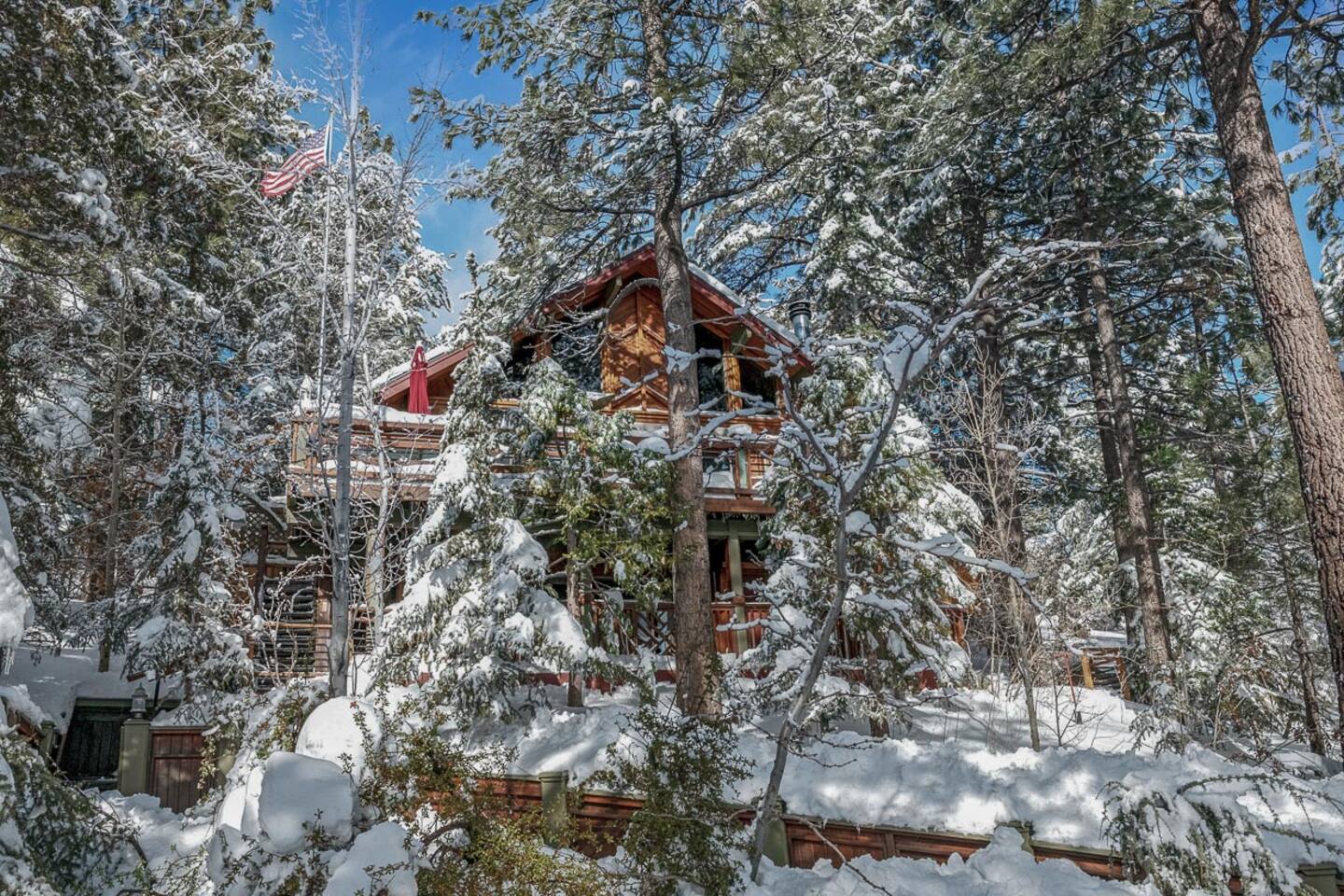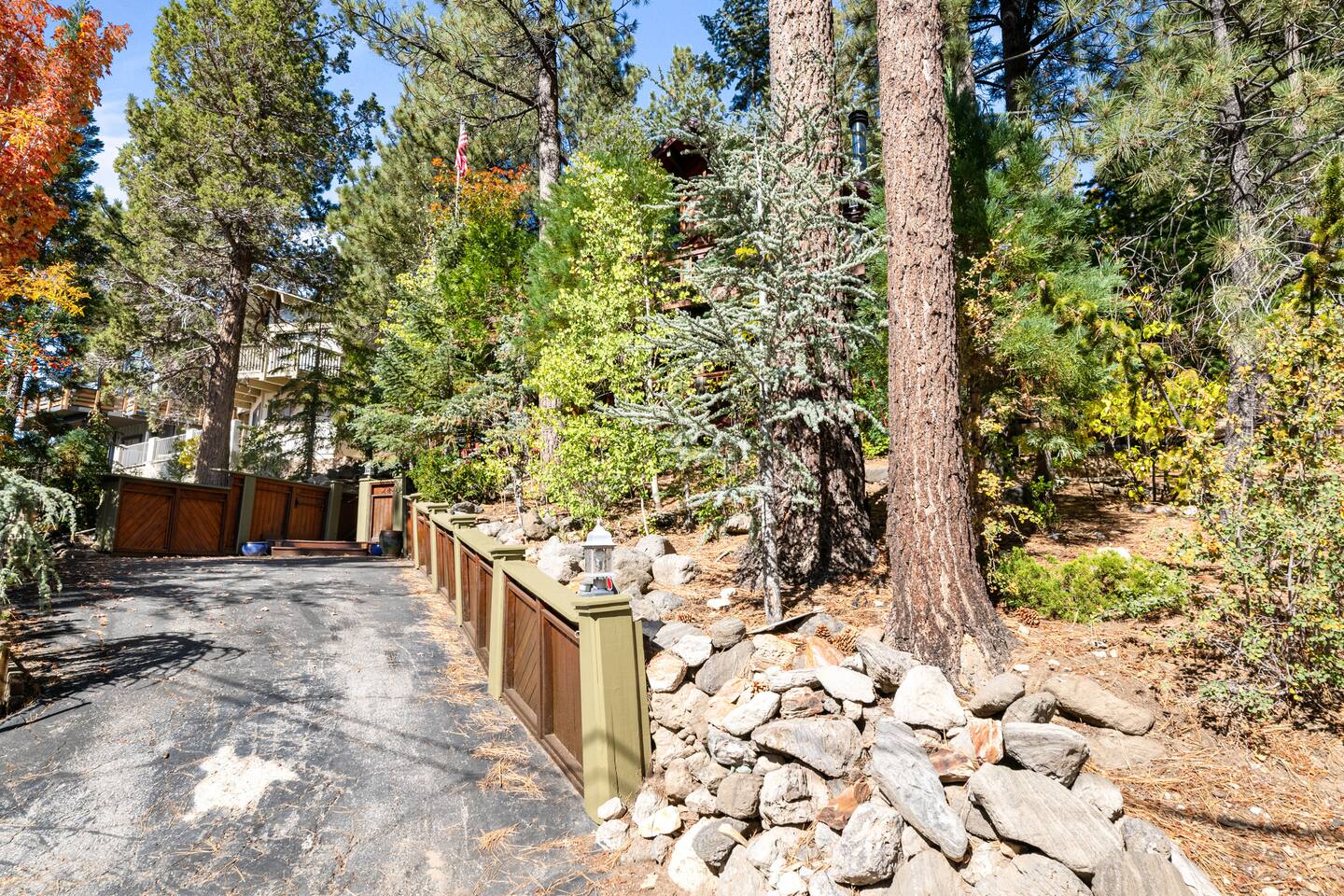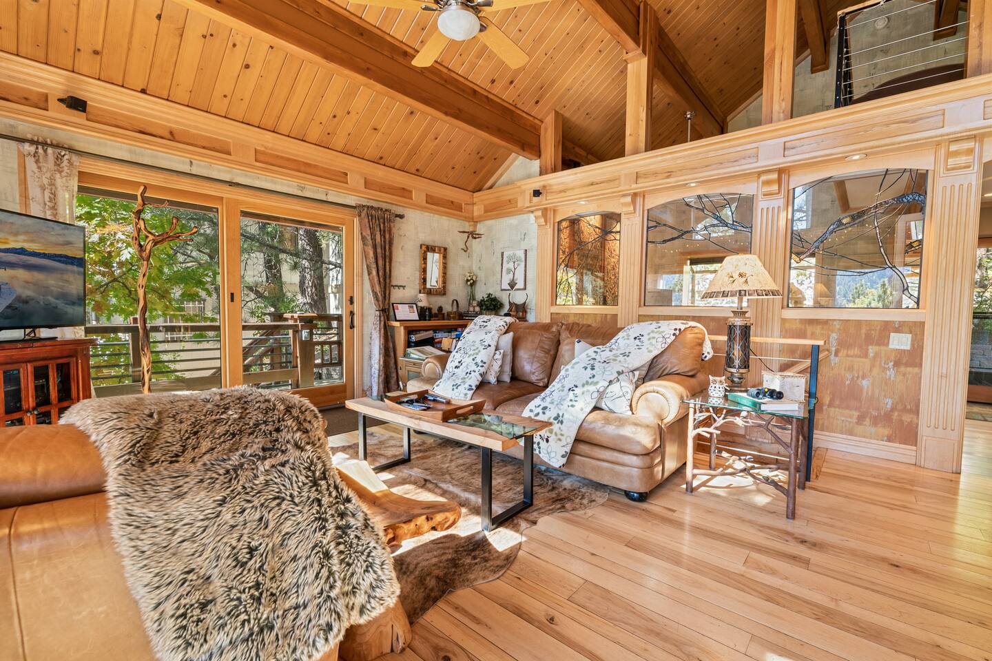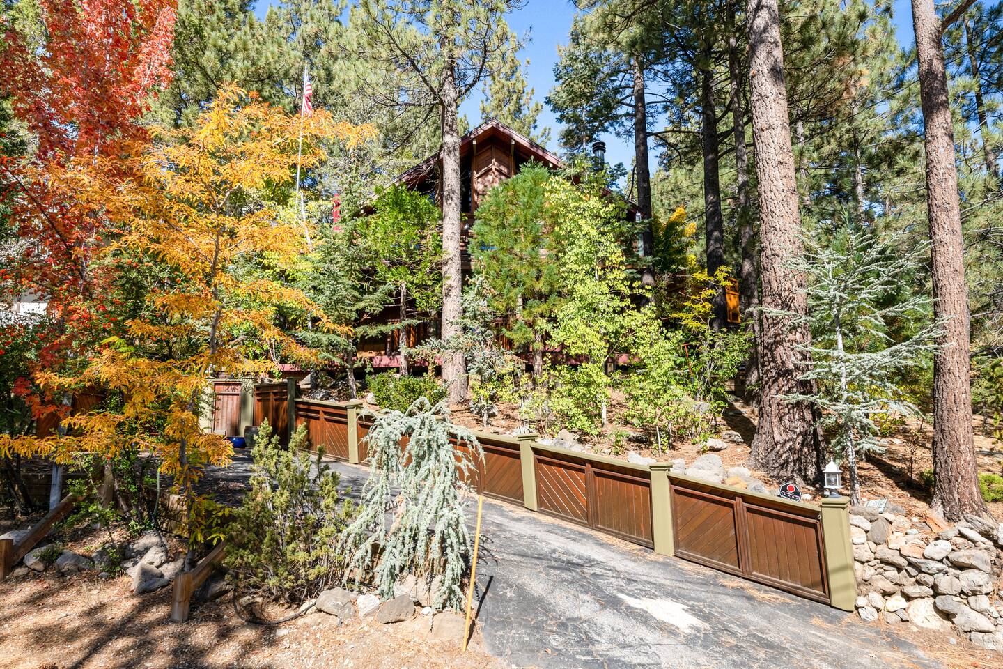 Step into the Tree of Life – an Artisan Treehouse, an exclusive one-of-a-kind retreat in the heart of Big Bear Lake/Moonridge. Just three minutes from Bear Mountain skiing, this extraordinary escape offers an unparalleled experience where you'll feel as if you're floating among the trees, surrounded by natural beauty, crisp mountain air, breathtaking vistas, and uncompromising luxury. It's a destination getaway unlike any other in the Big Bear Lake. This magnificent mountain retreat was meticulously created over a 10-year period by Master Craftsman Gerard as a loving ode to his ballerina wife. He poured his heart and soul into this home, a testament to his unwavering love and dedication, which you'll find reflected in every detail of the property. One-of-a-kind features, custom woodwork, and custom glasswork shine throughout the house, creating a unique and artistic atmosphere. The home is adorned with art and handcrafted furniture from around the world. The living room on the upper/main level offers a cozy ambiance while retaining the ease of an open floor plan. You'll find plush leather sofas with cozy thows. The living area has a flat-screen TV, cable, Apple TV, a PS3 gaming system, a surround sound system, and a game area with various board games to enjoy. The kitchen, a true culinary delight, boasts an integrated refrigerator and freezer, high-quality pots and pans, dinnerware and flatware, a Frigidaire Gallery oven, a gas stovetop, a tiled center island with a breakfast bar, and a trash compactor. There is a coffee station for your convenience. The dining room features a one-of-a-kind handcrafted table made from Bubinga wood, a treasure brought back from a journey to Africa, where you can savor delicious meals in front of the wood-burning fireplace. Bedroom #1, known as the "Tree of Life" room, is on the main level and features a cozy queen-size bed. This romantic masterpiece boasts a truly unique and stunning centerpiece – the "Tree of Life" mosaic. Within this room, you'll discover custom leaded glasswork and three 200-pound cedar closet doors adorned with a crushed rock, glass, and tile mosaic that took over a year to create. This testament to craftsmanship is a work of artistry that tells a story of love and dedication, mirroring the commitment of the Master Craftsman. The Tree of Life Room has an attached ensuite bath (Bathroom #1) with a jacuzzi tub and shower. Bedroom #2, located downstairs, is a cozy and unique haven. It features a luxurious king-size bed, an ensuite bath (Bathroom #2), and a jacuzzi tub. Bathroom #2 has an attached laundry with a washer and dryer for added convenience. This room offers a snug and inviting atmosphere and even has a private deck, providing a unique space to relax and enjoy the beauty of the surroundings. Bathroom #1 is an ensuite connected to Bedroom #1. Full bath with glass vessel sink and jacuzzi tub. Bathroom #2 is an ensuite connected to Bedroom #2. Full bath with jacuzzi tub and connected laundry room with full size washer and dryer. The main living area opens to the backyard, allowing you to seamlessly connect with the natural beauty that surrounds this unique haven. You'll find an outdoor kitchen with a propane barbecue grill and a multi-level outdoor space with several seating areas, including a charming tree spirit (mysterious face carved into a tree trunk), a chess table, and private areas that are perfect for reflecting on nature or sharing an intimate chat over a drink. The hot tub is in a private deck area, that provides an ideal vantage point to gaze at the ski slopes and the lush treetop views surrounding the property. During the winter season, you find an abundance of sleds and snow gear in the closet under the stairs for your use. This is not just a home; it's a five-star accommodation, a masterpiece that embodies the heart and soul of artisan craftsmanship, from the intricate work and rare items from across the globe to the love and artistry that has gone into every corner. The Tree of Life Artisan Treehouse is an unparalleled getaway where luxury, artistry, and nature converge to create an experience that is simply beyond compare in the Big Bear Lake Valley. It's a destination that promises a truly unforgettable retreat, a unique haven where you can escape the ordinary and immerse yourself in the extraordinary. The driveway is steep an narrow so in the winter you MUST have AWD vehicle with chains. If you do not have this- please do not book as you might not be able to get into the driveway. There are over 40 stairs to climb as well to get to the front door. The view is worth it!