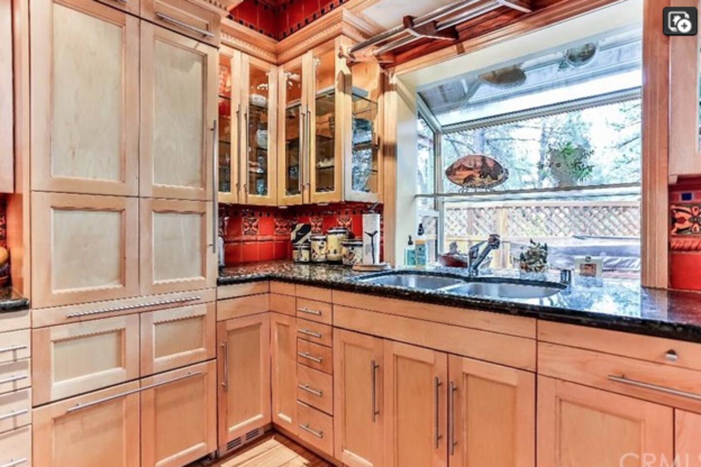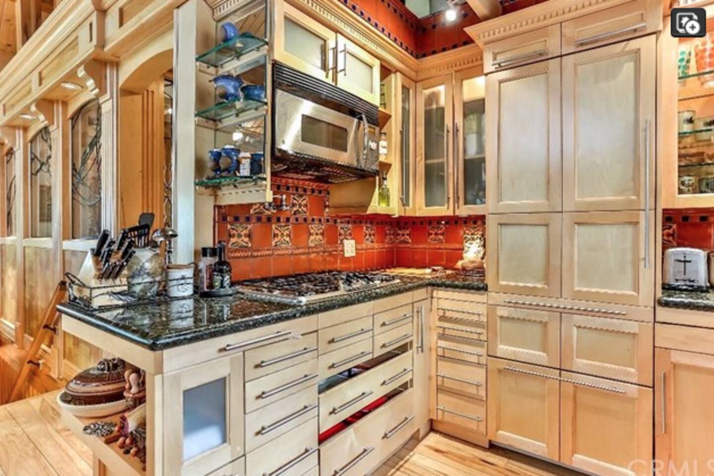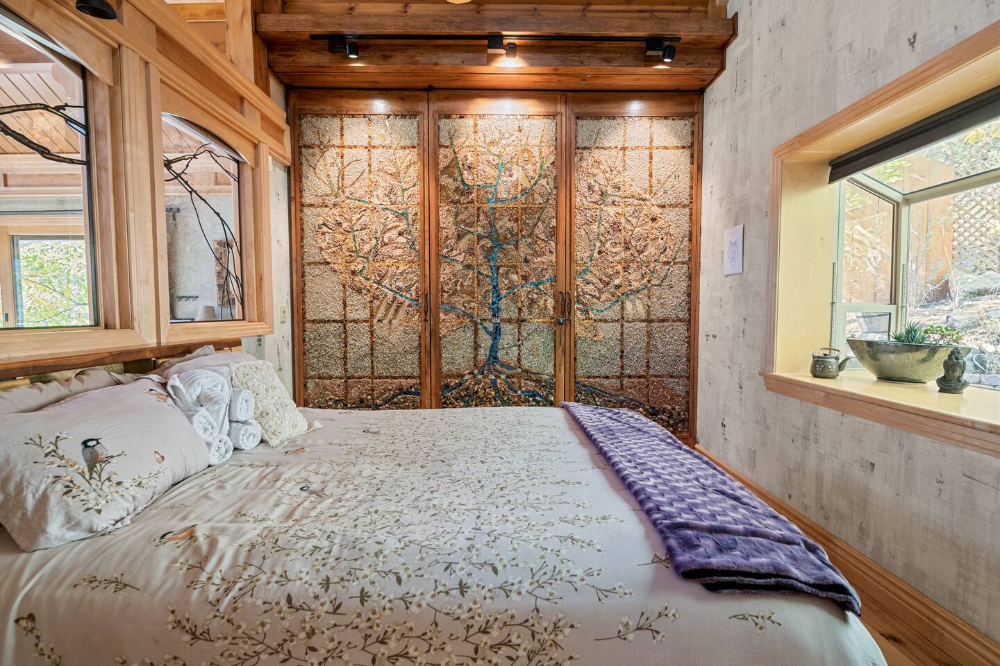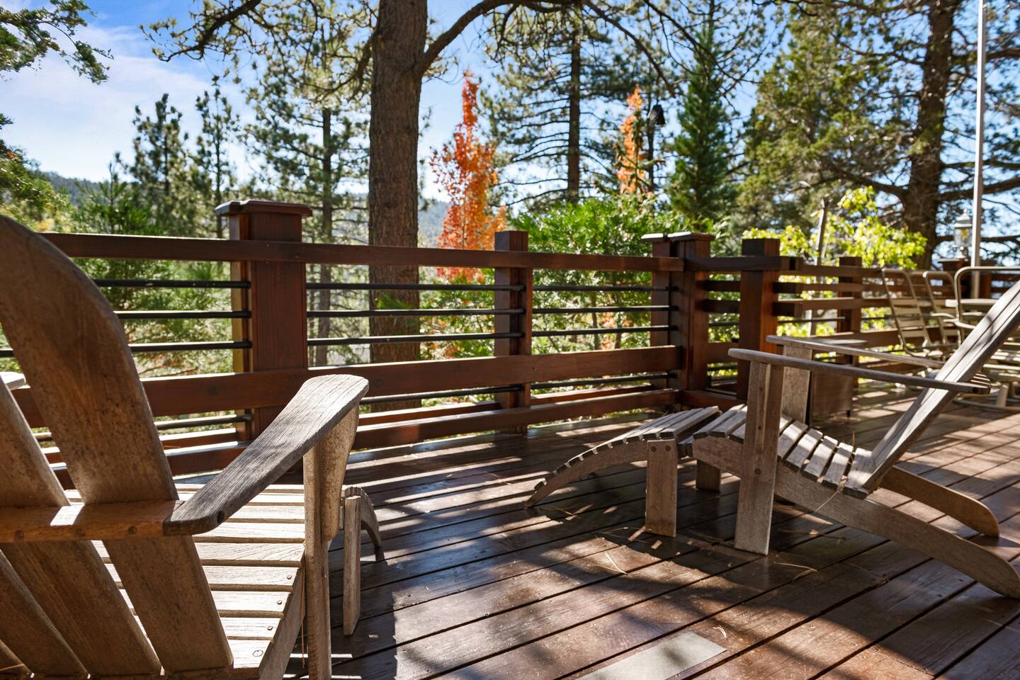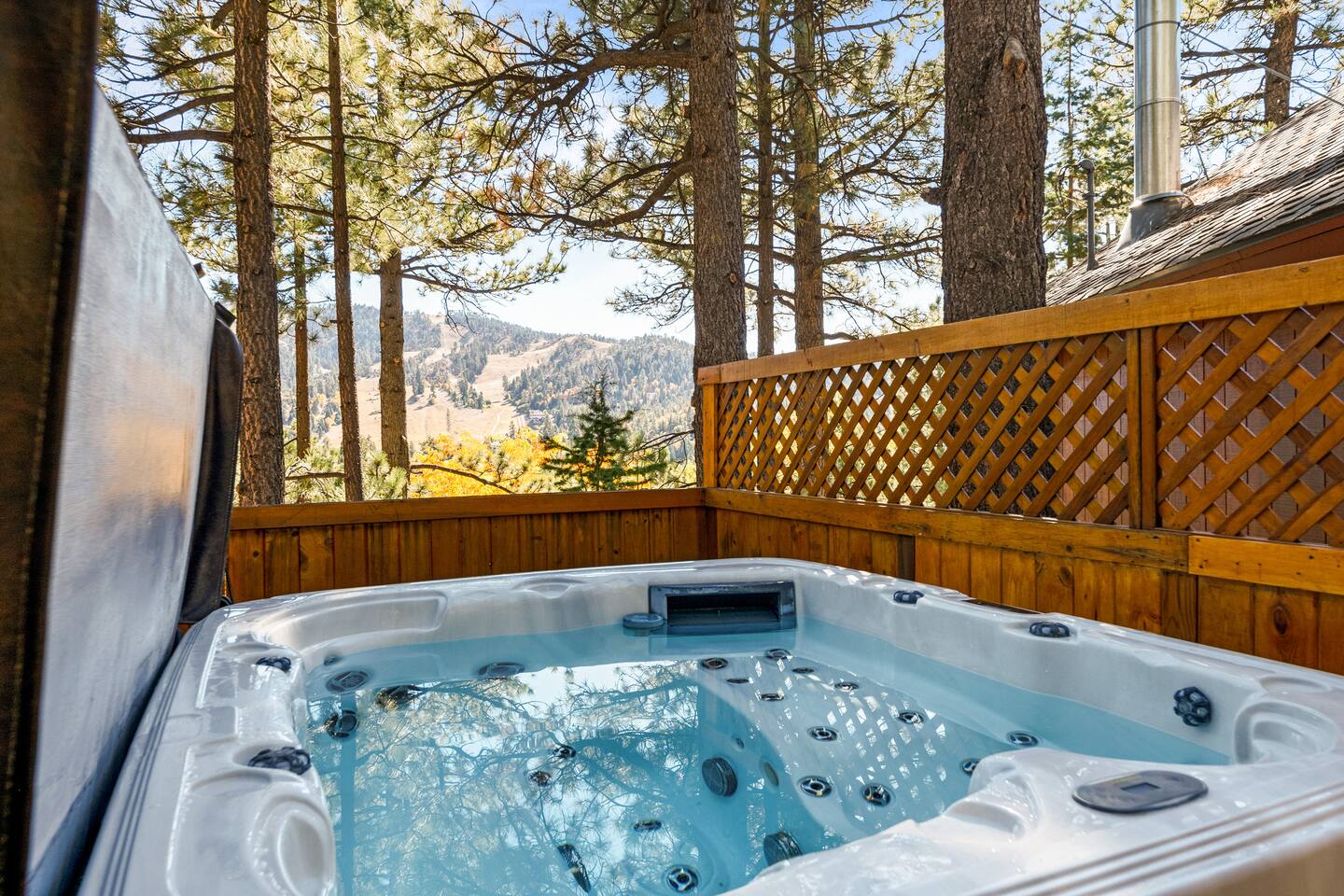 Step into the Tree of Life – an Artisan Treehouse, an exclusive one-of-a-kind retreat in the heart of Big Bear Lake/Moonridge. Just three minutes from Bear Mountain skiing, this extraordinary escape offers an unparalleled experience where you'll feel as if you're floating among the trees, surrounded by natural beauty, crisp mountain air, breathtaking vistas, and uncompromising luxury. It's a destination getaway unlike any other in the Big Bear Lake. This magnificent mountain retreat was meticulously created over a 10-year period by Master Craftsman Gerard as a loving ode to his ballerina wife. He poured his heart and soul into this home, a testament to his unwavering love and dedication, which you'll find reflected in every detail of the property. One-of-a-kind features, custom woodwork, and custom glasswork shine throughout the house, creating a unique and artistic atmosphere. The home is adorned with art and handcrafted furniture from around the world. The living room on the upper/main level offers a cozy ambiance while retaining the ease of an open floor plan. You'll find plush leather sofas with cozy thows. The living area has a flat-screen TV, cable, Apple TV, a PS3 gaming system, a surround sound system, and a game area with various board games to enjoy. The kitchen, a true culinary delight, boasts an integrated refrigerator and freezer, high-quality pots and pans, dinnerware and flatware, a Frigidaire Gallery oven, a gas stovetop, a tiled center island with a breakfast bar, and a trash compactor. There is a coffee station for your convenience. The dining room features a one-of-a-kind handcrafted table made from Bubinga wood, a treasure brought back from a journey to Africa, where you can savor delicious meals in front of the wood-burning fireplace. Bedroom #1, known as the "Tree of Life" room, is on the main level and features a cozy queen-size bed. This romantic masterpiece boasts a truly unique and stunning centerpiece – the "Tree of Life" mosaic. Within this room, you'll discover custom leaded glasswork and three 200-pound cedar closet doors adorned with a crushed rock, glass, and tile mosaic that took over a year to create. This testament to craftsmanship is a work of artistry that tells a story of love and dedication, mirroring the commitment of the Master Craftsman. The Tree of Life Room has an attached ensuite bath (Bathroom #1) with a jacuzzi tub and shower. Bedroom #2, located downstairs, is a cozy and unique haven. It features a luxurious king-size bed, an ensuite bath (Bathroom #2), and a jacuzzi tub. Bathroom #2 has an attached laundry with a washer and dryer for added convenience. This room offers a snug and inviting atmosphere and even has a private deck, providing a unique space to relax and enjoy the beauty of the surroundings. Bathroom #1 is an ensuite connected to Bedroom #1. Full bath with glass vessel sink and jacuzzi tub. Bathroom #2 is an ensuite connected to Bedroom #2. Full bath with jacuzzi tub and connected laundry room with full size washer and dryer. The main living area opens to the backyard, allowing you to seamlessly connect with the natural beauty that surrounds this unique haven. You'll find an outdoor kitchen with a propane barbecue grill and a multi-level outdoor space with several seating areas, including a charming tree spirit (mysterious face carved into a tree trunk), a chess table, and private areas that are perfect for reflecting on nature or sharing an intimate chat over a drink. The hot tub is in a private deck area, that provides an ideal vantage point to gaze at the ski slopes and the lush treetop views surrounding the property. During the winter season, you find an abundance of sleds and snow gear in the closet under the stairs for your use. This is not just a home; it's a five-star accommodation, a masterpiece that embodies the heart and soul of artisan craftsmanship, from the intricate work and rare items from across the globe to the love and artistry that has gone into every corner. The Tree of Life Artisan Treehouse is an unparalleled getaway where luxury, artistry, and nature converge to create an experience that is simply beyond compare in the Big Bear Lake Valley. It's a destination that promises a truly unforgettable retreat, a unique haven where you can escape the ordinary and immerse yourself in the extraordinary. The driveway is steep an narrow so in the winter you MUST have AWD vehicle with chains. If you do not have this- please do not book as you might not be able to get into the driveway. There are over 40 stairs to climb as well to get to the front door. The view is worth it!
