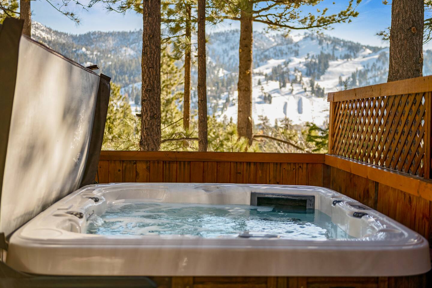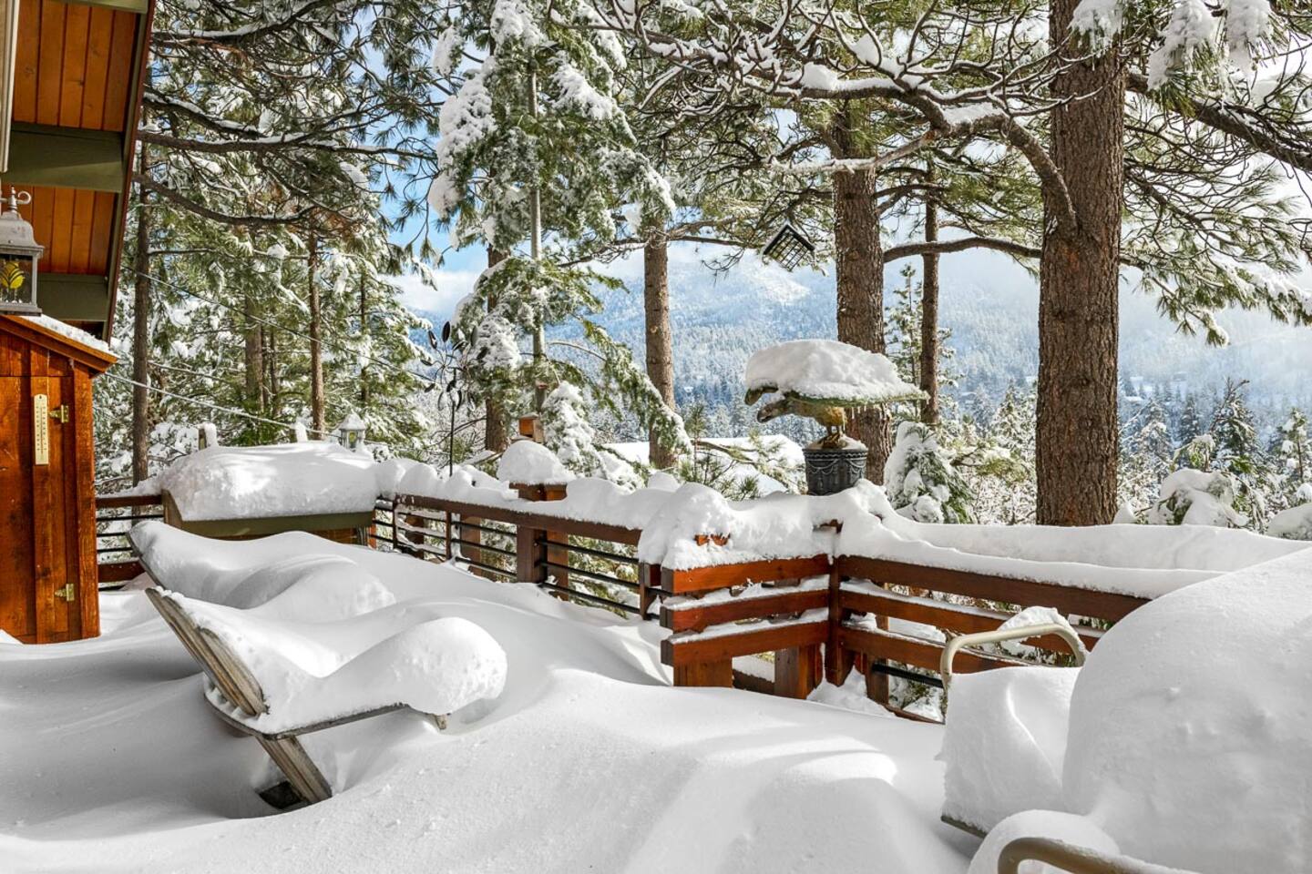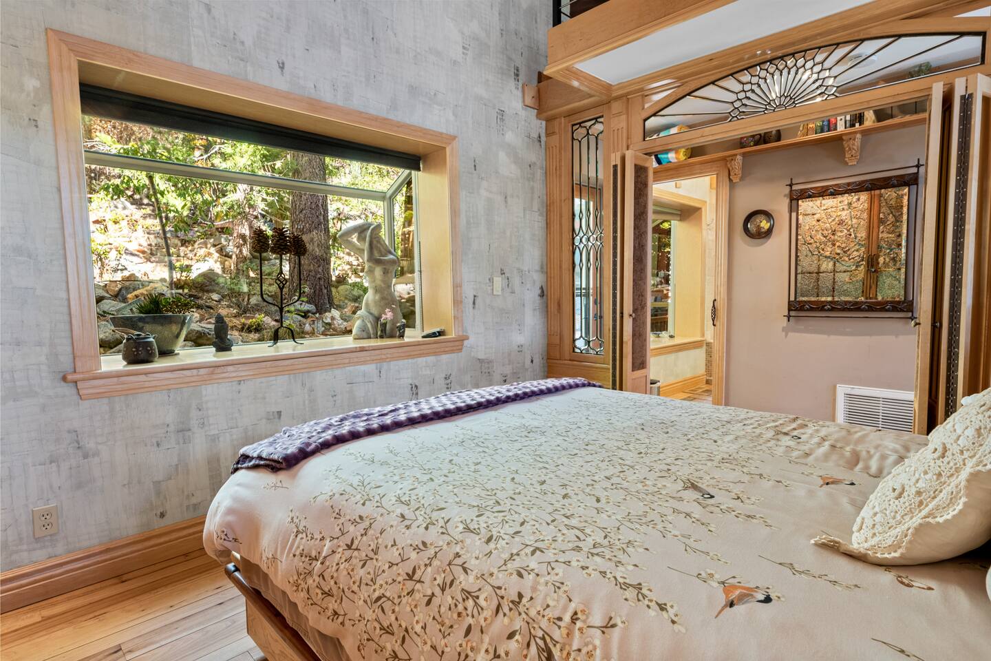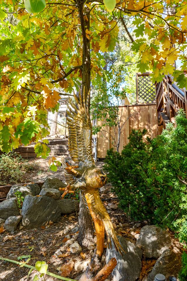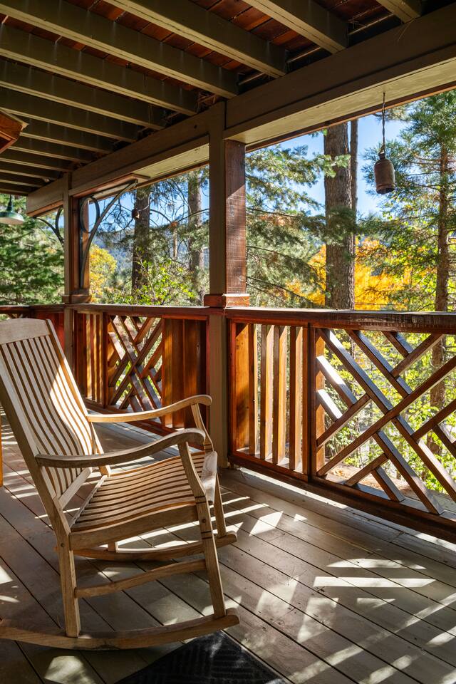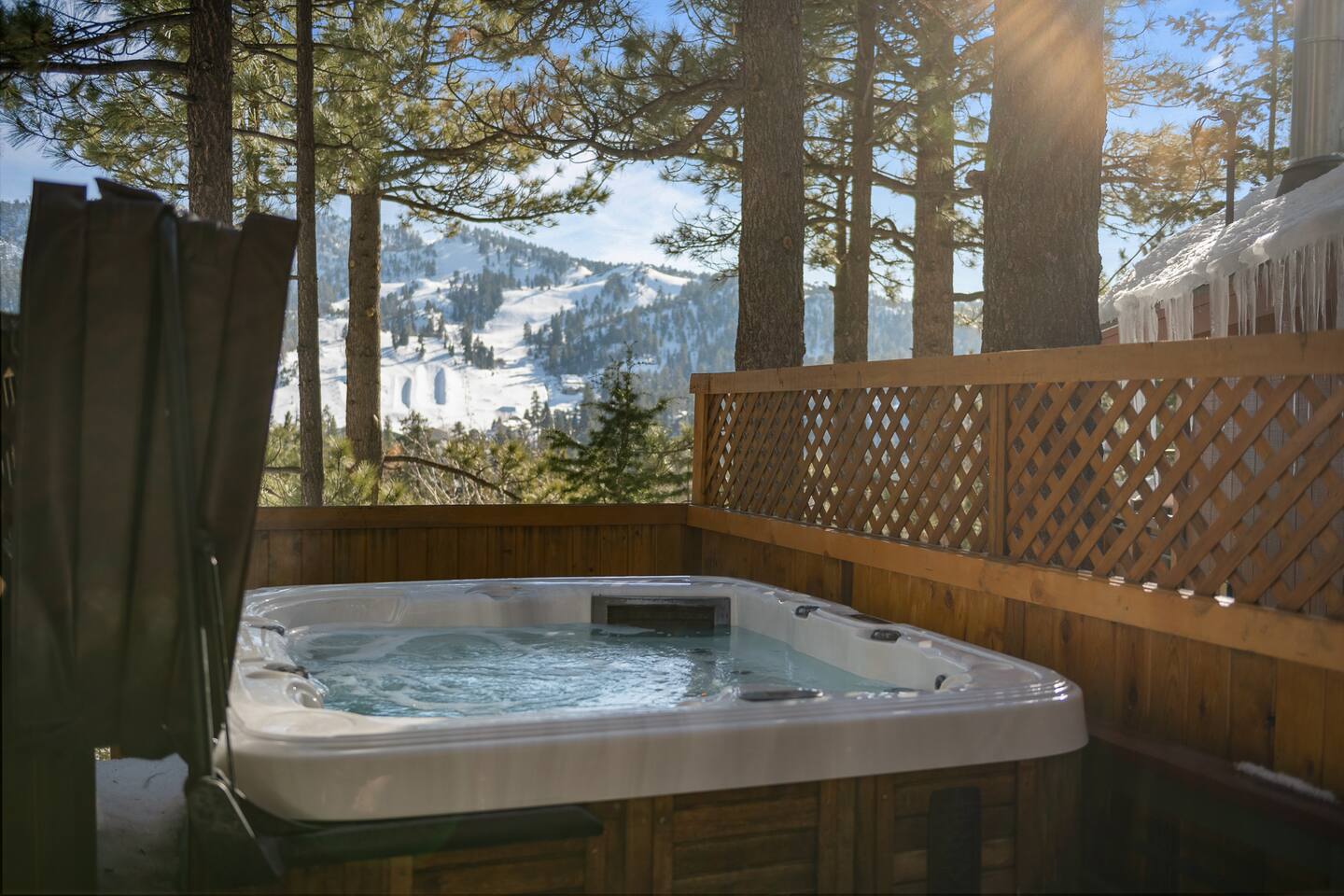 Step into the Tree of Life – an Artisan Treehouse, an exclusive one-of-a-kind retreat in the heart of Big Bear Lake/Moonridge. Just three minutes from Bear Mountain skiing, this extraordinary escape offers an unparalleled experience where you'll feel as if you're floating among the trees, surrounded by natural beauty, crisp mountain air, breathtaking vistas, and uncompromising luxury. It's a destination getaway unlike any other in the Big Bear Lake. This magnificent mountain retreat was meticulously created over a 10-year period by Master Craftsman Gerard as a loving ode to his ballerina wife. He poured his heart and soul into this home, a testament to his unwavering love and dedication, which you'll find reflected in every detail of the property. One-of-a-kind features, custom woodwork, and custom glasswork shine throughout the house, creating a unique and artistic atmosphere. The home is adorned with art and handcrafted furniture from around the world. The living room on the upper/main level offers a cozy ambiance while retaining the ease of an open floor plan. You'll find plush leather sofas with cozy thows. The living area has a flat-screen TV, cable, Apple TV, a PS3 gaming system, a surround sound system, and a game area with various board games to enjoy. The kitchen, a true culinary delight, boasts an integrated refrigerator and freezer, high-quality pots and pans, dinnerware and flatware, a Frigidaire Gallery oven, a gas stovetop, a tiled center island with a breakfast bar, and a trash compactor. There is a coffee station for your convenience. The dining room features a one-of-a-kind handcrafted table made from Bubinga wood, a treasure brought back from a journey to Africa, where you can savor delicious meals in front of the wood-burning fireplace. Bedroom #1, known as the "Tree of Life" room, is on the main level and features a cozy queen-size bed. This romantic masterpiece boasts a truly unique and stunning centerpiece – the "Tree of Life" mosaic. Within this room, you'll discover custom leaded glasswork and three 200-pound cedar closet doors adorned with a crushed rock, glass, and tile mosaic that took over a year to create. This testament to craftsmanship is a work of artistry that tells a story of love and dedication, mirroring the commitment of the Master Craftsman. The Tree of Life Room has an attached ensuite bath (Bathroom #1) with a jacuzzi tub and shower. Bedroom #2, located downstairs, is a cozy and unique haven. It features a luxurious king-size bed, an ensuite bath (Bathroom #2), and a jacuzzi tub. Bathroom #2 has an attached laundry with a washer and dryer for added convenience. This room offers a snug and inviting atmosphere and even has a private deck, providing a unique space to relax and enjoy the beauty of the surroundings. Bathroom #1 is an ensuite connected to Bedroom #1. Full bath with glass vessel sink and jacuzzi tub. Bathroom #2 is an ensuite connected to Bedroom #2. Full bath with jacuzzi tub and connected laundry room with full size washer and dryer. The main living area opens to the backyard, allowing you to seamlessly connect with the natural beauty that surrounds this unique haven. You'll find an outdoor kitchen with a propane barbecue grill and a multi-level outdoor space with several seating areas, including a charming tree spirit (mysterious face carved into a tree trunk), a chess table, and private areas that are perfect for reflecting on nature or sharing an intimate chat over a drink. The hot tub is in a private deck area, that provides an ideal vantage point to gaze at the ski slopes and the lush treetop views surrounding the property. During the winter season, you find an abundance of sleds and snow gear in the closet under the stairs for your use. This is not just a home; it's a five-star accommodation, a masterpiece that embodies the heart and soul of artisan craftsmanship, from the intricate work and rare items from across the globe to the love and artistry that has gone into every corner. The Tree of Life Artisan Treehouse is an unparalleled getaway where luxury, artistry, and nature converge to create an experience that is simply beyond compare in the Big Bear Lake Valley. It's a destination that promises a truly unforgettable retreat, a unique haven where you can escape the ordinary and immerse yourself in the extraordinary. The driveway is steep an narrow so in the winter you MUST have AWD vehicle with chains. If you do not have this- please do not book as you might not be able to get into the driveway. There are over 40 stairs to climb as well to get to the front door. The view is worth it!