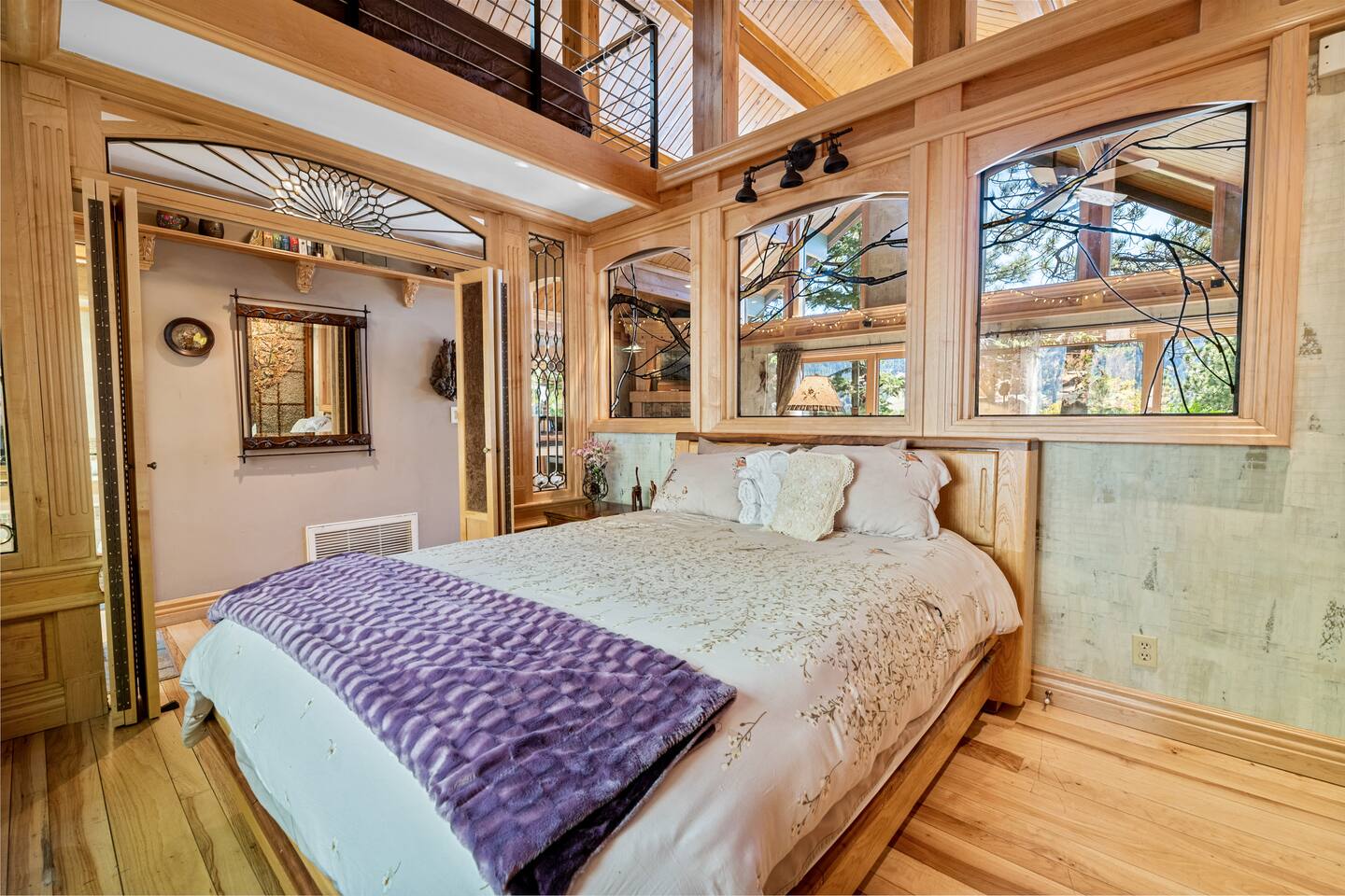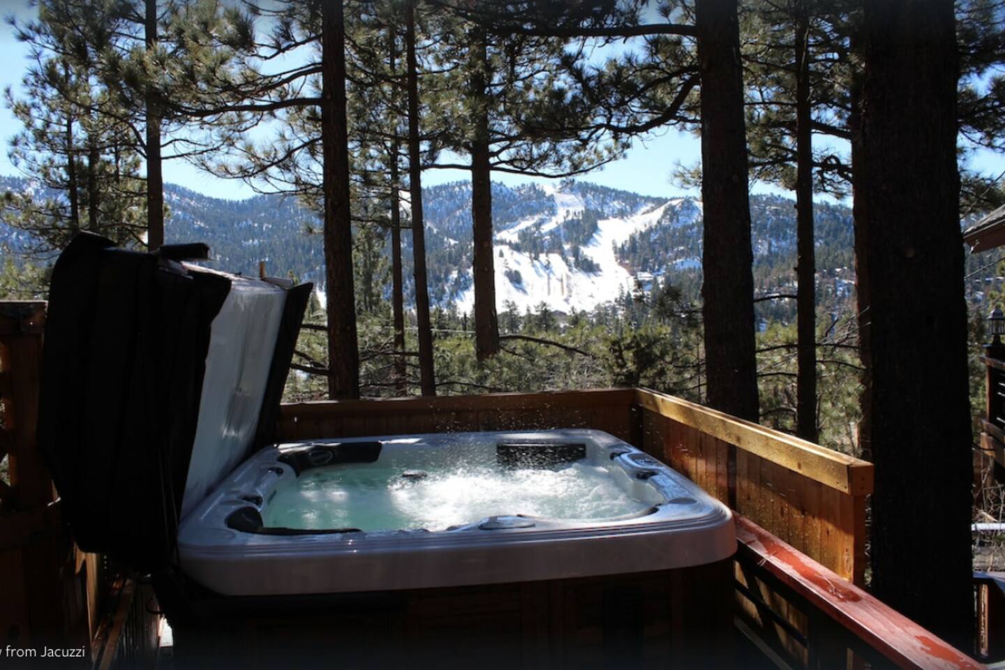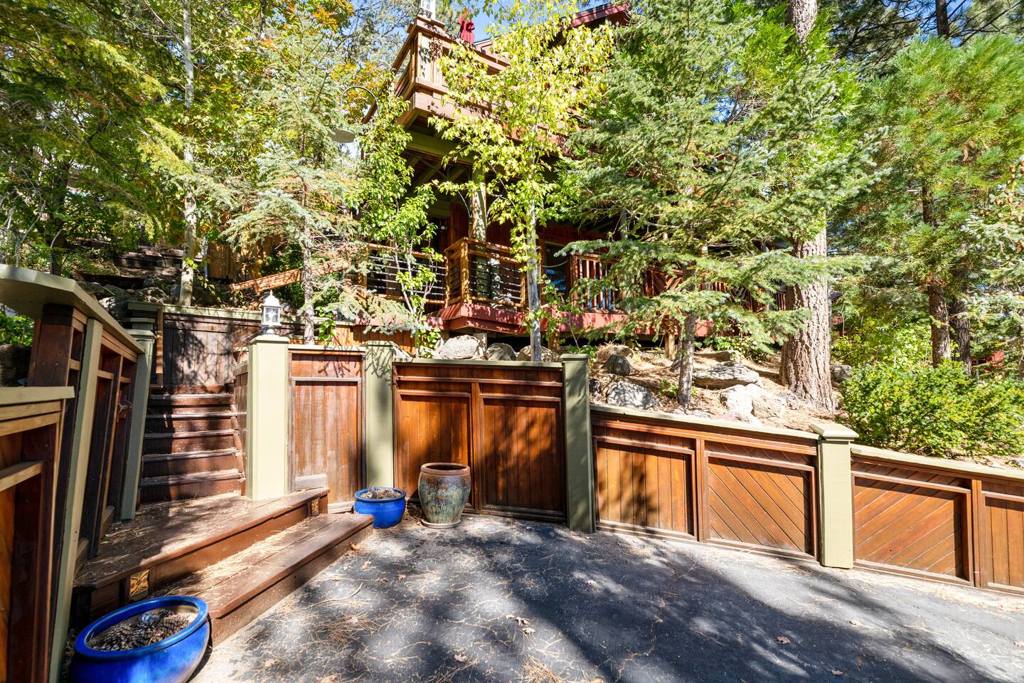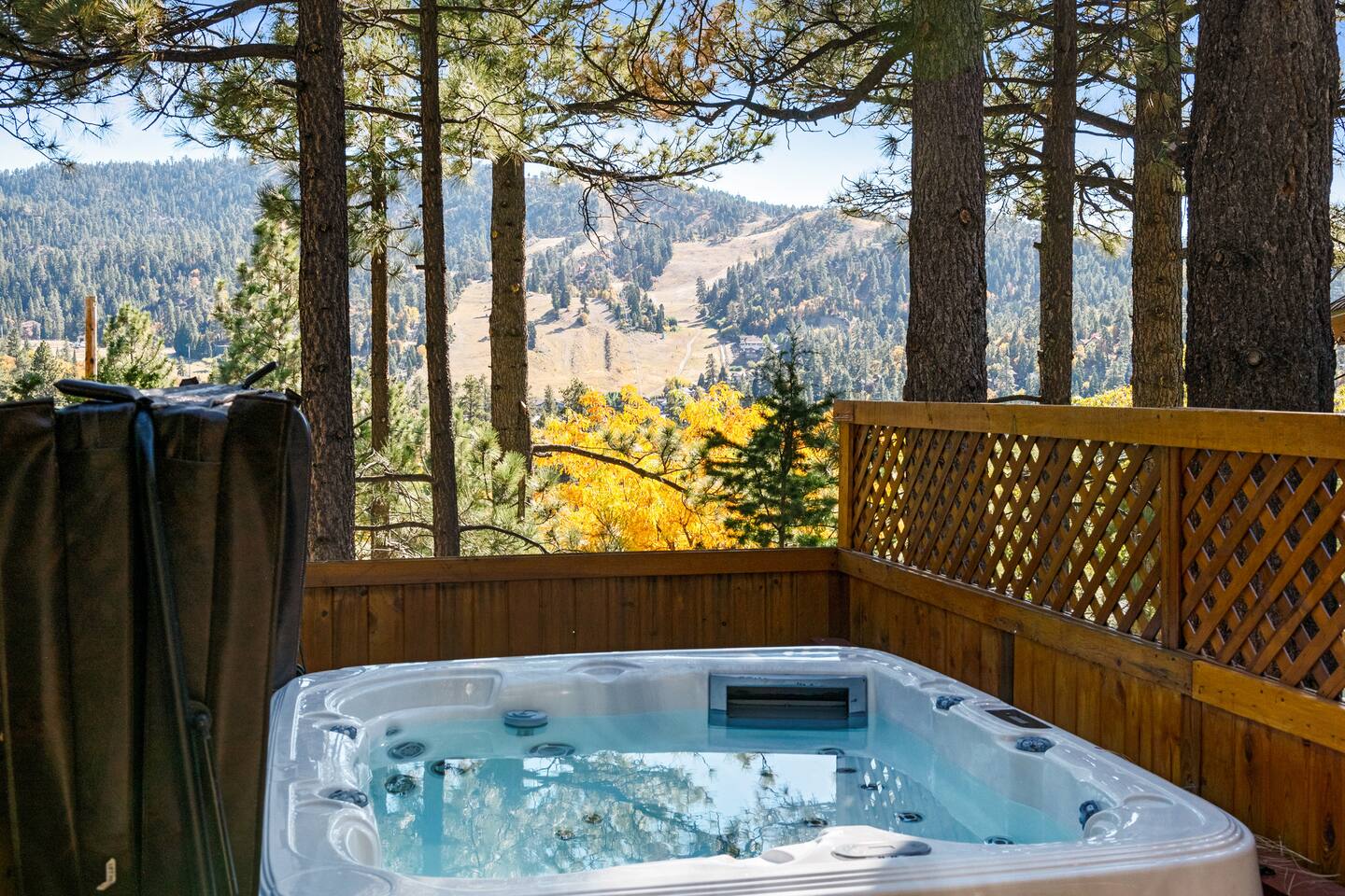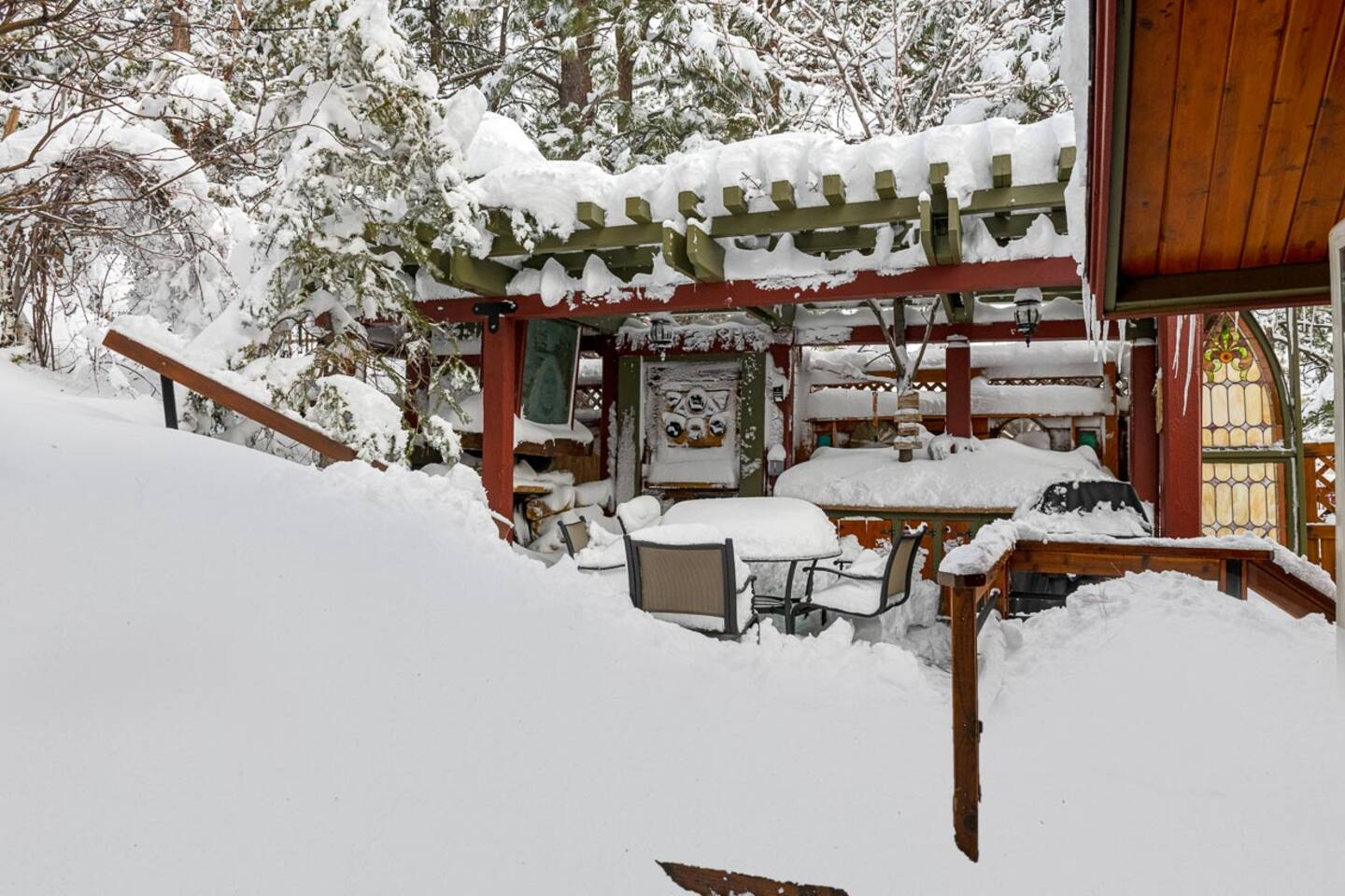Step into the Tree of Life – an Artisan Treehouse, an exclusive one-of-a-kind retreat in the heart of Big Bear Lake/Moonridge. Just three minutes from Bear Mountain skiing, this extraordinary escape offers an unparalleled experience where you'll feel as if you're floating among the trees, surrounded by natural beauty, crisp mountain air, breathtaking vistas, and uncompromising luxury. It's a destination getaway unlike any other in the Big Bear Lake. This magnificent mountain retreat was meticulously created over a 10-year period by Master Craftsman Gerard as a loving ode to his ballerina wife. He poured his heart and soul into this home, a testament to his unwavering love and dedication, which you'll find reflected in every detail of the property. One-of-a-kind features, custom woodwork, and custom glasswork shine throughout the house, creating a unique and artistic atmosphere. The home is adorned with art and handcrafted furniture from around the world. The living room on the upper/main level offers a cozy ambiance while retaining the ease of an open floor plan. You'll find plush leather sofas with cozy thows. The living area has a flat-screen TV, cable, Apple TV, a PS3 gaming system, a surround sound system, and a game area with various board games to enjoy. The kitchen, a true culinary delight, boasts an integrated refrigerator and freezer, high-quality pots and pans, dinnerware and flatware, a Frigidaire Gallery oven, a gas stovetop, a tiled center island with a breakfast bar, and a trash compactor. There is a coffee station for your convenience. The dining room features a one-of-a-kind handcrafted table made from Bubinga wood, a treasure brought back from a journey to Africa, where you can savor delicious meals in front of the wood-burning fireplace. Bedroom #1, known as the "Tree of Life" room, is on the main level and features a cozy queen-size bed. This romantic masterpiece boasts a truly unique and stunning centerpiece – the "Tree of Life" mosaic. Within this room, you'll discover custom leaded glasswork and three 200-pound cedar closet doors adorned with a crushed rock, glass, and tile mosaic that took over a year to create. This testament to craftsmanship is a work of artistry that tells a story of love and dedication, mirroring the commitment of the Master Craftsman. The Tree of Life Room has an attached ensuite bath (Bathroom #1) with a jacuzzi tub and shower. Bedroom #2, located downstairs, is a cozy and unique haven. It features a luxurious king-size bed, an ensuite bath (Bathroom #2), and a jacuzzi tub. Bathroom #2 has an attached laundry with a washer and dryer for added convenience. This room offers a snug and inviting atmosphere and even has a private deck, providing a unique space to relax and enjoy the beauty of the surroundings. Bathroom #1 is an ensuite connected to Bedroom #1. Full bath with glass vessel sink and jacuzzi tub. Bathroom #2 is an ensuite connected to Bedroom #2. Full bath with jacuzzi tub and connected laundry room with full size washer and dryer. The main living area opens to the backyard, allowing you to seamlessly connect with the natural beauty that surrounds this unique haven. You'll find an outdoor kitchen with a propane barbecue grill and a multi-level outdoor space with several seating areas, including a charming tree spirit (mysterious face carved into a tree trunk), a chess table, and private areas that are perfect for reflecting on nature or sharing an intimate chat over a drink. The hot tub is in a private deck area, that provides an ideal vantage point to gaze at the ski slopes and the lush treetop views surrounding the property. During the winter season, you find an abundance of sleds and snow gear in the closet under the stairs for your use. This is not just a home; it's a five-star accommodation, a masterpiece that embodies the heart and soul of artisan craftsmanship, from the intricate work and rare items from across the globe to the love and artistry that has gone into every corner. The Tree of Life Artisan Treehouse is an unparalleled getaway where luxury, artistry, and nature converge to create an experience that is simply beyond compare in the Big Bear Lake Valley. It's a destination that promises a truly unforgettable retreat, a unique haven where you can escape the ordinary and immerse yourself in the extraordinary. The driveway is steep an narrow so in the winter you MUST have AWD vehicle with chains. If you do not have this- please do not book as you might not be able to get into the driveway. There are over 40 stairs to climb as well to get to the front door. The view is worth it!
