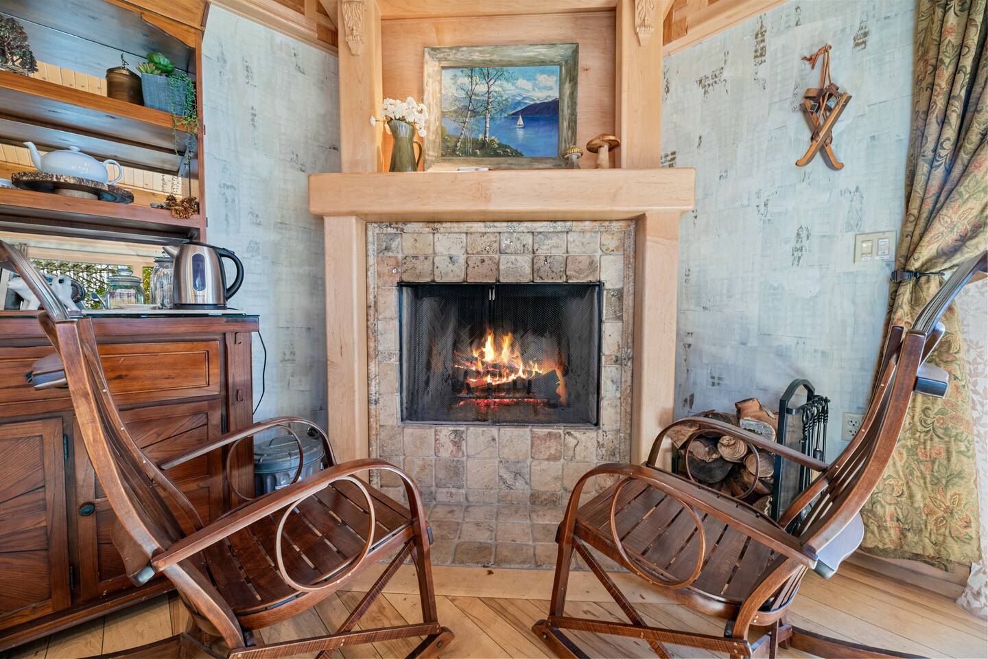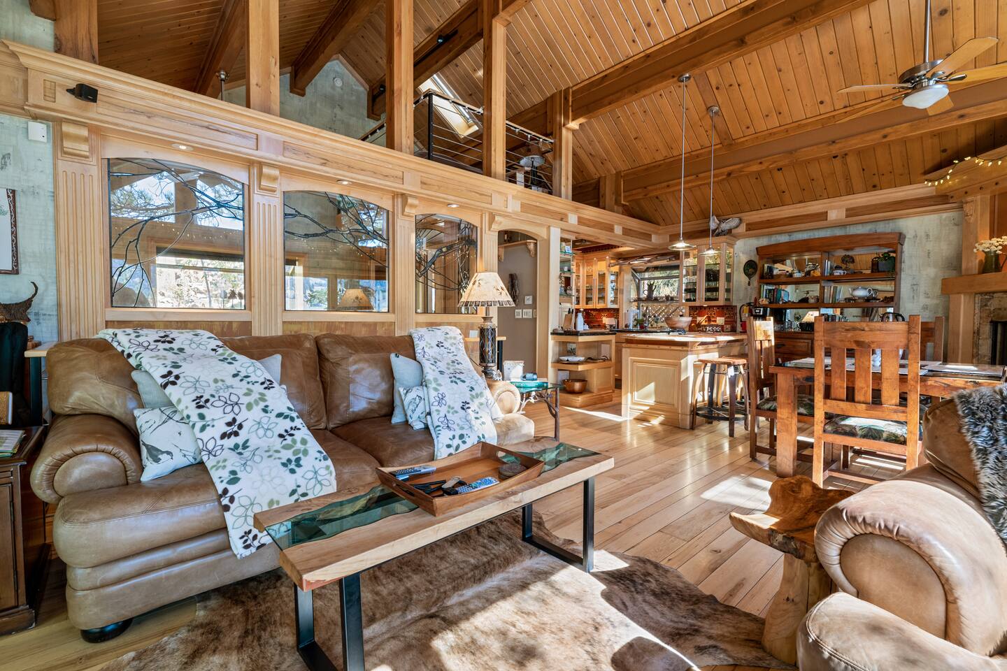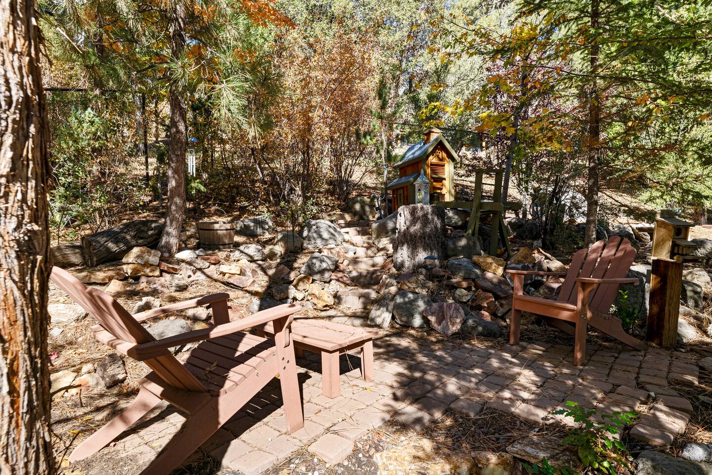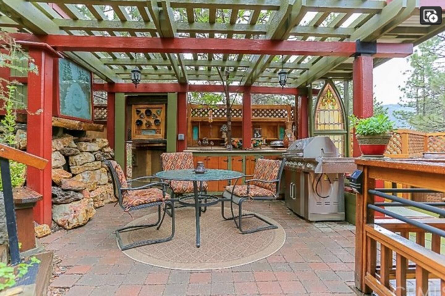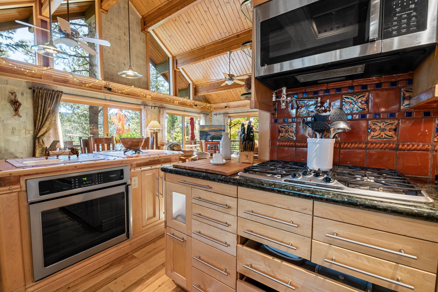 Step into the Tree of Life – an Artisan Treehouse, an exclusive one-of-a-kind retreat in the heart of Big Bear Lake/Moonridge. Just three minutes from Bear Mountain skiing, this extraordinary escape offers an unparalleled experience where you'll feel as if you're floating among the trees, surrounded by natural beauty, crisp mountain air, breathtaking vistas, and uncompromising luxury. It's a destination getaway unlike any other in the Big Bear Lake. This magnificent mountain retreat was meticulously created over a 10-year period by Master Craftsman Gerard as a loving ode to his ballerina wife. He poured his heart and soul into this home, a testament to his unwavering love and dedication, which you'll find reflected in every detail of the property. One-of-a-kind features, custom woodwork, and custom glasswork shine throughout the house, creating a unique and artistic atmosphere. The home is adorned with art and handcrafted furniture from around the world. The living room on the upper/main level offers a cozy ambiance while retaining the ease of an open floor plan. You'll find plush leather sofas with cozy thows. The living area has a flat-screen TV, cable, Apple TV, a PS3 gaming system, a surround sound system, and a game area with various board games to enjoy. The kitchen, a true culinary delight, boasts an integrated refrigerator and freezer, high-quality pots and pans, dinnerware and flatware, a Frigidaire Gallery oven, a gas stovetop, a tiled center island with a breakfast bar, and a trash compactor. There is a coffee station for your convenience. The dining room features a one-of-a-kind handcrafted table made from Bubinga wood, a treasure brought back from a journey to Africa, where you can savor delicious meals in front of the wood-burning fireplace. Bedroom #1, known as the "Tree of Life" room, is on the main level and features a cozy queen-size bed. This romantic masterpiece boasts a truly unique and stunning centerpiece – the "Tree of Life" mosaic. Within this room, you'll discover custom leaded glasswork and three 200-pound cedar closet doors adorned with a crushed rock, glass, and tile mosaic that took over a year to create. This testament to craftsmanship is a work of artistry that tells a story of love and dedication, mirroring the commitment of the Master Craftsman. The Tree of Life Room has an attached ensuite bath (Bathroom #1) with a jacuzzi tub and shower. Bedroom #2, located downstairs, is a cozy and unique haven. It features a luxurious king-size bed, an ensuite bath (Bathroom #2), and a jacuzzi tub. Bathroom #2 has an attached laundry with a washer and dryer for added convenience. This room offers a snug and inviting atmosphere and even has a private deck, providing a unique space to relax and enjoy the beauty of the surroundings. Bathroom #1 is an ensuite connected to Bedroom #1. Full bath with glass vessel sink and jacuzzi tub. Bathroom #2 is an ensuite connected to Bedroom #2. Full bath with jacuzzi tub and connected laundry room with full size washer and dryer. The main living area opens to the backyard, allowing you to seamlessly connect with the natural beauty that surrounds this unique haven. You'll find an outdoor kitchen with a propane barbecue grill and a multi-level outdoor space with several seating areas, including a charming tree spirit (mysterious face carved into a tree trunk), a chess table, and private areas that are perfect for reflecting on nature or sharing an intimate chat over a drink. The hot tub is in a private deck area, that provides an ideal vantage point to gaze at the ski slopes and the lush treetop views surrounding the property. During the winter season, you find an abundance of sleds and snow gear in the closet under the stairs for your use. This is not just a home; it's a five-star accommodation, a masterpiece that embodies the heart and soul of artisan craftsmanship, from the intricate work and rare items from across the globe to the love and artistry that has gone into every corner. The Tree of Life Artisan Treehouse is an unparalleled getaway where luxury, artistry, and nature converge to create an experience that is simply beyond compare in the Big Bear Lake Valley. It's a destination that promises a truly unforgettable retreat, a unique haven where you can escape the ordinary and immerse yourself in the extraordinary. The driveway is steep an narrow so in the winter you MUST have AWD vehicle with chains. If you do not have this- please do not book as you might not be able to get into the driveway. There are over 40 stairs to climb as well to get to the front door. The view is worth it!