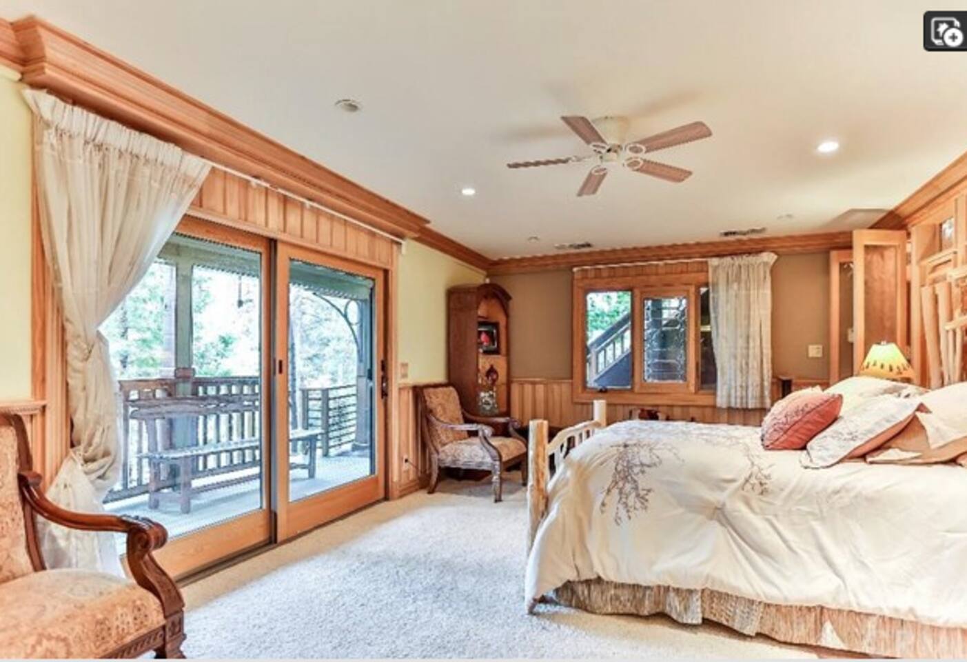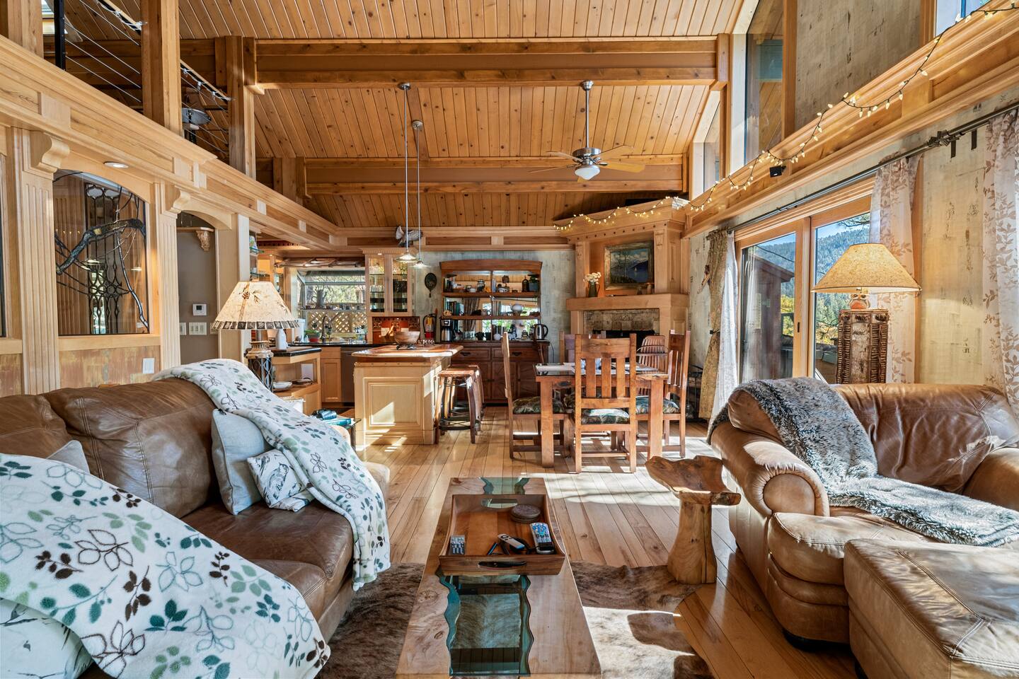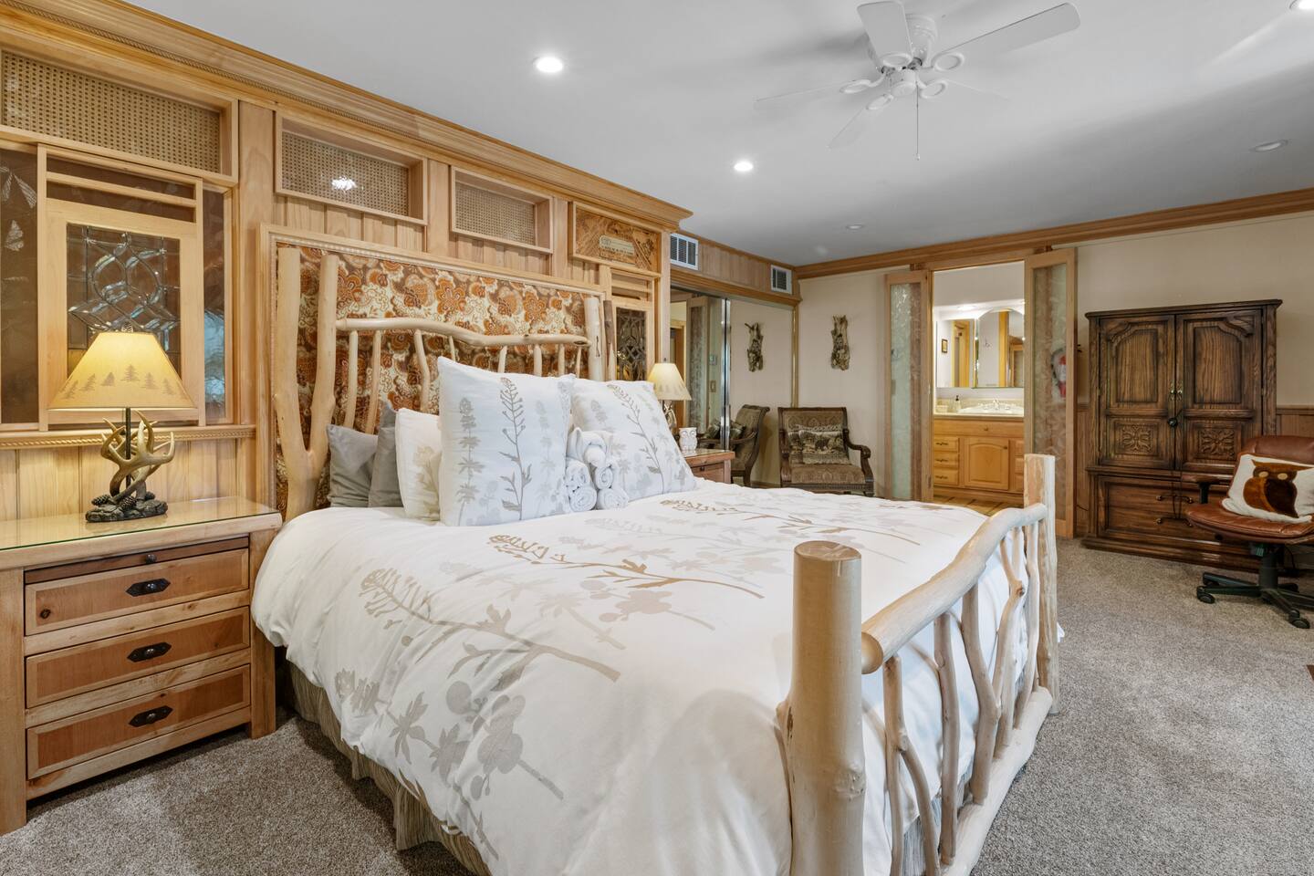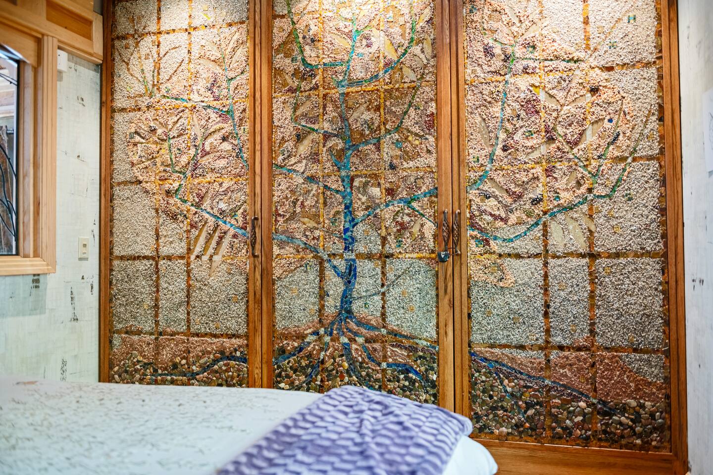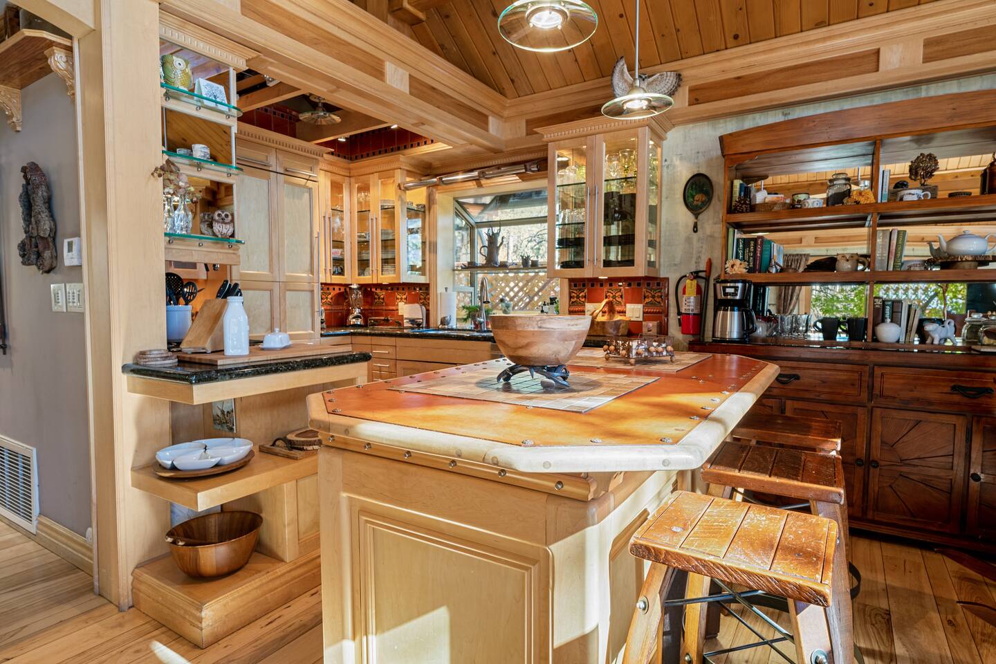 Step into the Tree of Life – an Artisan Treehouse, an exclusive one-of-a-kind retreat in the heart of Big Bear Lake/Moonridge. Just three minutes from Bear Mountain skiing, this extraordinary escape offers an unparalleled experience where you'll feel as if you're floating among the trees, surrounded by natural beauty, crisp mountain air, breathtaking vistas, and uncompromising luxury. It's a destination getaway unlike any other in the Big Bear Lake. This magnificent mountain retreat was meticulously created over a 10-year period by Master Craftsman Gerard as a loving ode to his ballerina wife. He poured his heart and soul into this home, a testament to his unwavering love and dedication, which you'll find reflected in every detail of the property. One-of-a-kind features, custom woodwork, and custom glasswork shine throughout the house, creating a unique and artistic atmosphere. The home is adorned with art and handcrafted furniture from around the world. The living room on the upper/main level offers a cozy ambiance while retaining the ease of an open floor plan. You'll find plush leather sofas with cozy thows. The living area has a flat-screen TV, cable, Apple TV, a PS3 gaming system, a surround sound system, and a game area with various board games to enjoy. The kitchen, a true culinary delight, boasts an integrated refrigerator and freezer, high-quality pots and pans, dinnerware and flatware, a Frigidaire Gallery oven, a gas stovetop, a tiled center island with a breakfast bar, and a trash compactor. There is a coffee station for your convenience. The dining room features a one-of-a-kind handcrafted table made from Bubinga wood, a treasure brought back from a journey to Africa, where you can savor delicious meals in front of the wood-burning fireplace. Bedroom #1, known as the "Tree of Life" room, is on the main level and features a cozy queen-size bed. This romantic masterpiece boasts a truly unique and stunning centerpiece – the "Tree of Life" mosaic. Within this room, you'll discover custom leaded glasswork and three 200-pound cedar closet doors adorned with a crushed rock, glass, and tile mosaic that took over a year to create. This testament to craftsmanship is a work of artistry that tells a story of love and dedication, mirroring the commitment of the Master Craftsman. The Tree of Life Room has an attached ensuite bath (Bathroom #1) with a jacuzzi tub and shower. Bedroom #2, located downstairs, is a cozy and unique haven. It features a luxurious king-size bed, an ensuite bath (Bathroom #2), and a jacuzzi tub. Bathroom #2 has an attached laundry with a washer and dryer for added convenience. This room offers a snug and inviting atmosphere and even has a private deck, providing a unique space to relax and enjoy the beauty of the surroundings. Bathroom #1 is an ensuite connected to Bedroom #1. Full bath with glass vessel sink and jacuzzi tub. Bathroom #2 is an ensuite connected to Bedroom #2. Full bath with jacuzzi tub and connected laundry room with full size washer and dryer. The main living area opens to the backyard, allowing you to seamlessly connect with the natural beauty that surrounds this unique haven. You'll find an outdoor kitchen with a propane barbecue grill and a multi-level outdoor space with several seating areas, including a charming tree spirit (mysterious face carved into a tree trunk), a chess table, and private areas that are perfect for reflecting on nature or sharing an intimate chat over a drink. The hot tub is in a private deck area, that provides an ideal vantage point to gaze at the ski slopes and the lush treetop views surrounding the property. During the winter season, you find an abundance of sleds and snow gear in the closet under the stairs for your use. This is not just a home; it's a five-star accommodation, a masterpiece that embodies the heart and soul of artisan craftsmanship, from the intricate work and rare items from across the globe to the love and artistry that has gone into every corner. The Tree of Life Artisan Treehouse is an unparalleled getaway where luxury, artistry, and nature converge to create an experience that is simply beyond compare in the Big Bear Lake Valley. It's a destination that promises a truly unforgettable retreat, a unique haven where you can escape the ordinary and immerse yourself in the extraordinary. The driveway is steep an narrow so in the winter you MUST have AWD vehicle with chains. If you do not have this- please do not book as you might not be able to get into the driveway. There are over 40 stairs to climb as well to get to the front door. The view is worth it!