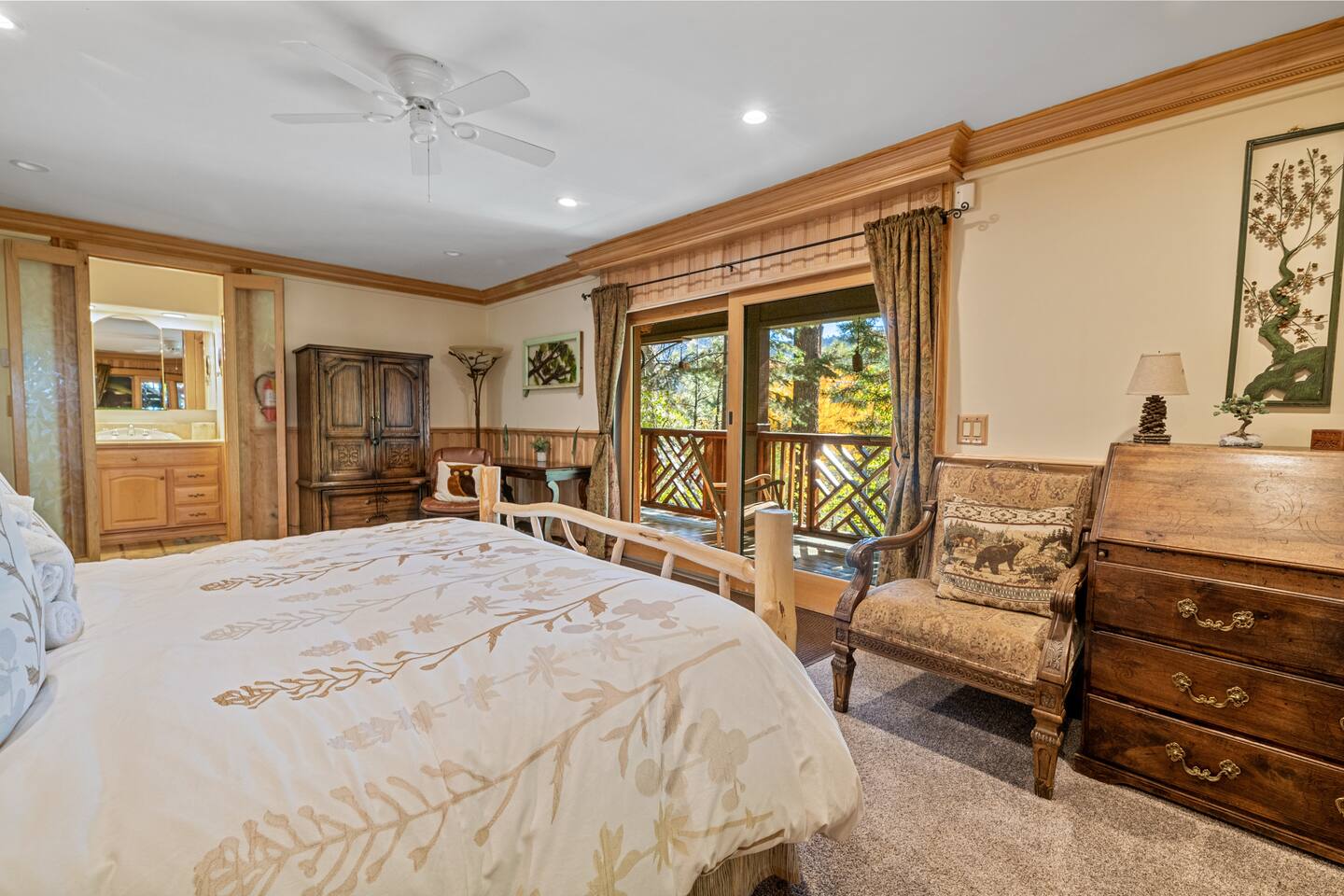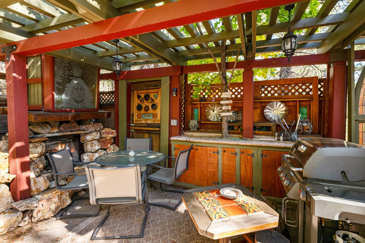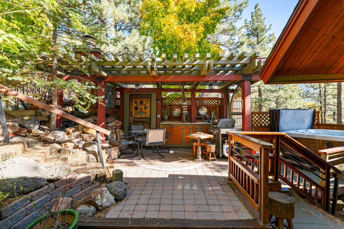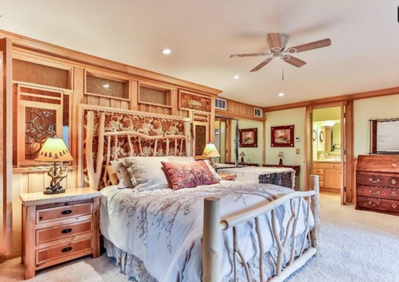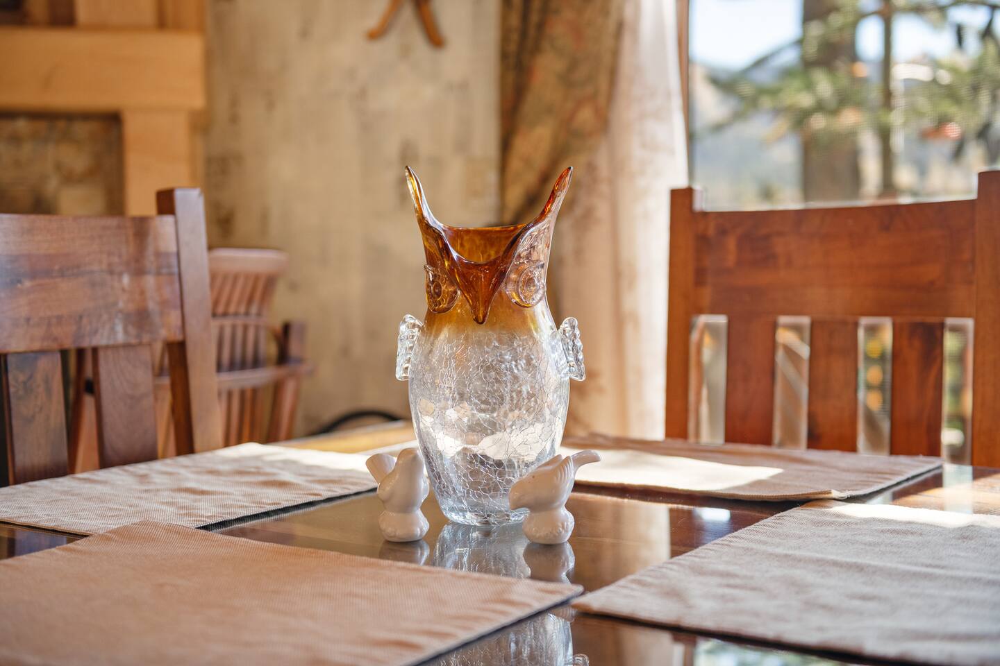 Step into the Tree of Life – an Artisan Treehouse, an exclusive one-of-a-kind retreat in the heart of Big Bear Lake/Moonridge. Just three minutes from Bear Mountain skiing, this extraordinary escape offers an unparalleled experience where you'll feel as if you're floating among the trees, surrounded by natural beauty, crisp mountain air, breathtaking vistas, and uncompromising luxury. It's a destination getaway unlike any other in the Big Bear Lake. This magnificent mountain retreat was meticulously created over a 10-year period by Master Craftsman Gerard as a loving ode to his ballerina wife. He poured his heart and soul into this home, a testament to his unwavering love and dedication, which you'll find reflected in every detail of the property. One-of-a-kind features, custom woodwork, and custom glasswork shine throughout the house, creating a unique and artistic atmosphere. The home is adorned with art and handcrafted furniture from around the world. The living room on the upper/main level offers a cozy ambiance while retaining the ease of an open floor plan. You'll find plush leather sofas with cozy thows. The living area has a flat-screen TV, cable, Apple TV, a PS3 gaming system, a surround sound system, and a game area with various board games to enjoy. The kitchen, a true culinary delight, boasts an integrated refrigerator and freezer, high-quality pots and pans, dinnerware and flatware, a Frigidaire Gallery oven, a gas stovetop, a tiled center island with a breakfast bar, and a trash compactor. There is a coffee station for your convenience. The dining room features a one-of-a-kind handcrafted table made from Bubinga wood, a treasure brought back from a journey to Africa, where you can savor delicious meals in front of the wood-burning fireplace. Bedroom #1, known as the "Tree of Life" room, is on the main level and features a cozy queen-size bed. This romantic masterpiece boasts a truly unique and stunning centerpiece – the "Tree of Life" mosaic. Within this room, you'll discover custom leaded glasswork and three 200-pound cedar closet doors adorned with a crushed rock, glass, and tile mosaic that took over a year to create. This testament to craftsmanship is a work of artistry that tells a story of love and dedication, mirroring the commitment of the Master Craftsman. The Tree of Life Room has an attached ensuite bath (Bathroom #1) with a jacuzzi tub and shower. Bedroom #2, located downstairs, is a cozy and unique haven. It features a luxurious king-size bed, an ensuite bath (Bathroom #2), and a jacuzzi tub. Bathroom #2 has an attached laundry with a washer and dryer for added convenience. This room offers a snug and inviting atmosphere and even has a private deck, providing a unique space to relax and enjoy the beauty of the surroundings. Bathroom #1 is an ensuite connected to Bedroom #1. Full bath with glass vessel sink and jacuzzi tub. Bathroom #2 is an ensuite connected to Bedroom #2. Full bath with jacuzzi tub and connected laundry room with full size washer and dryer. The main living area opens to the backyard, allowing you to seamlessly connect with the natural beauty that surrounds this unique haven. You'll find an outdoor kitchen with a propane barbecue grill and a multi-level outdoor space with several seating areas, including a charming tree spirit (mysterious face carved into a tree trunk), a chess table, and private areas that are perfect for reflecting on nature or sharing an intimate chat over a drink. The hot tub is in a private deck area, that provides an ideal vantage point to gaze at the ski slopes and the lush treetop views surrounding the property. During the winter season, you find an abundance of sleds and snow gear in the closet under the stairs for your use. This is not just a home; it's a five-star accommodation, a masterpiece that embodies the heart and soul of artisan craftsmanship, from the intricate work and rare items from across the globe to the love and artistry that has gone into every corner. The Tree of Life Artisan Treehouse is an unparalleled getaway where luxury, artistry, and nature converge to create an experience that is simply beyond compare in the Big Bear Lake Valley. It's a destination that promises a truly unforgettable retreat, a unique haven where you can escape the ordinary and immerse yourself in the extraordinary. The driveway is steep an narrow so in the winter you MUST have AWD vehicle with chains. If you do not have this- please do not book as you might not be able to get into the driveway. There are over 40 stairs to climb as well to get to the front door. The view is worth it!