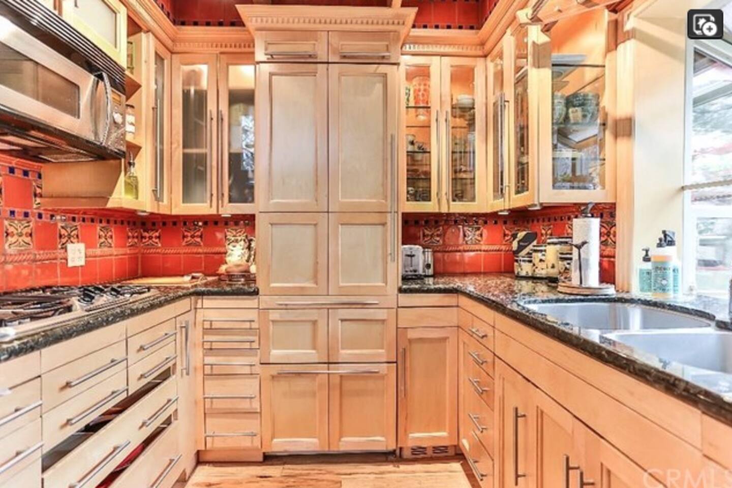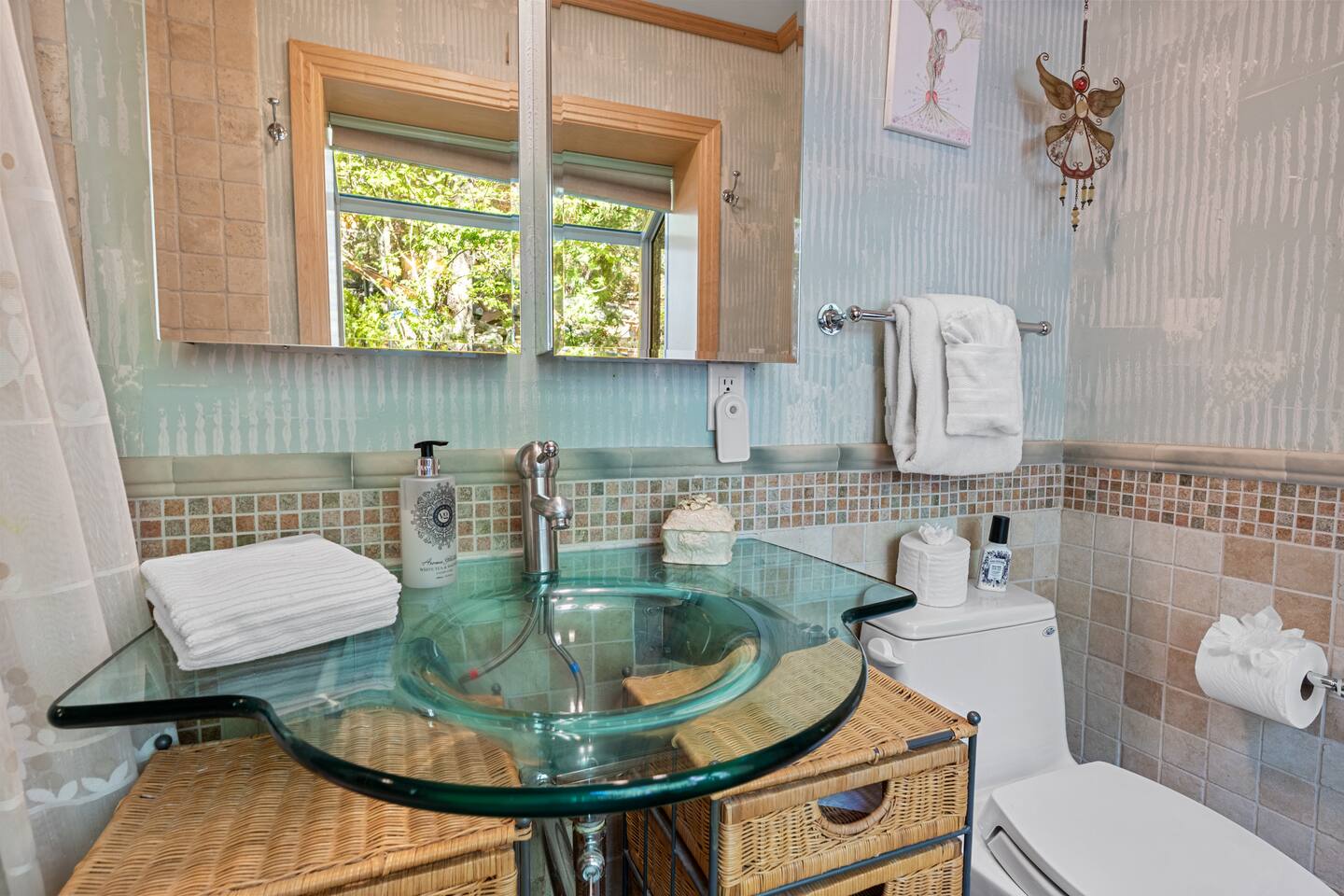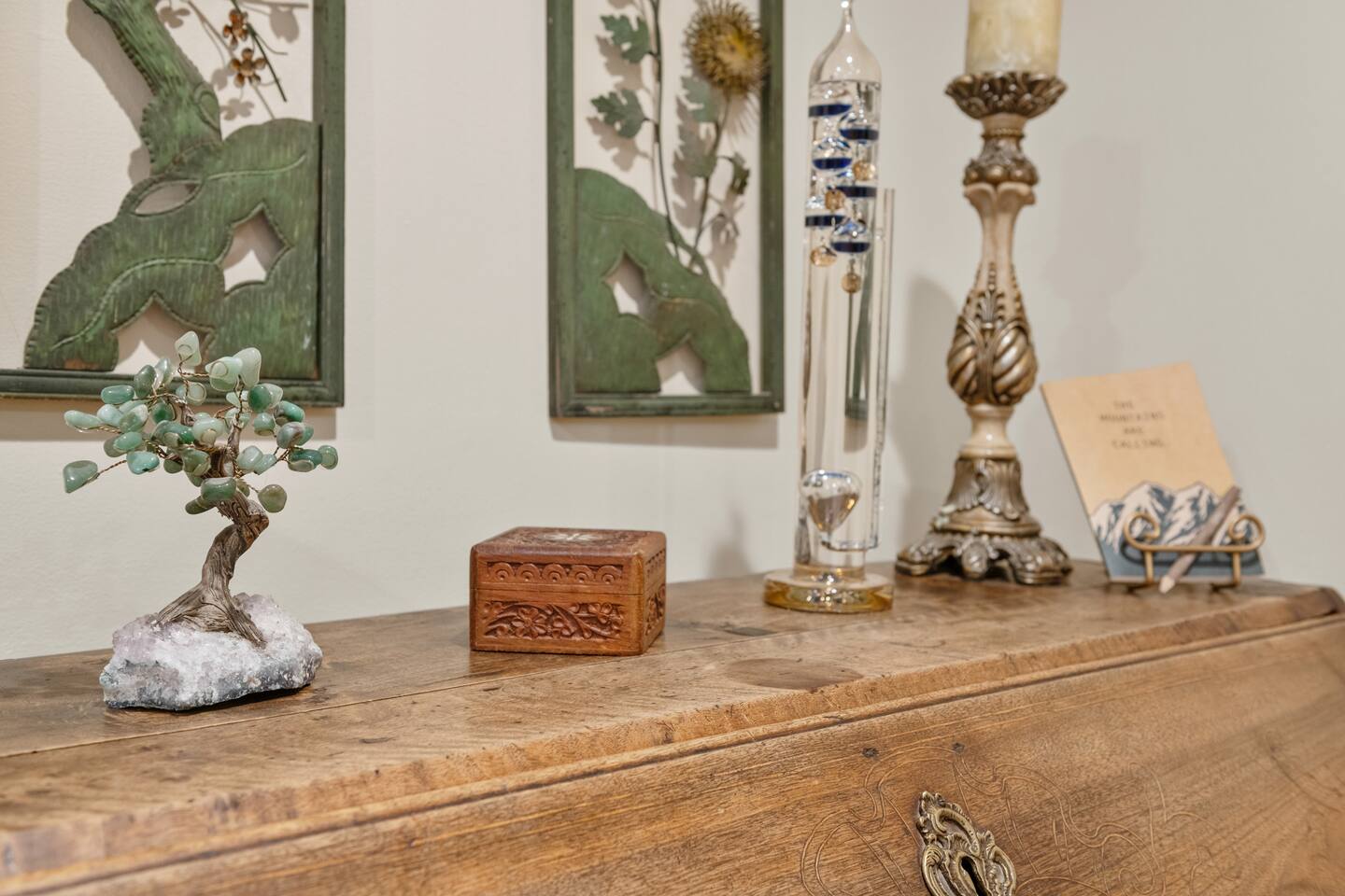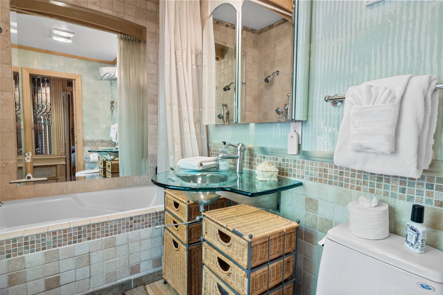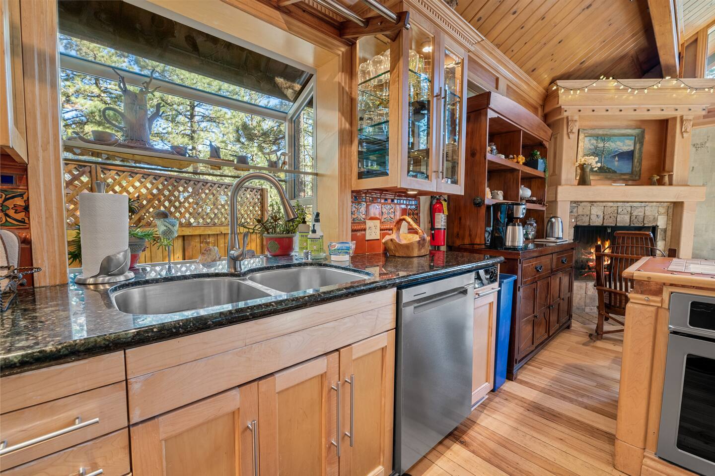Step into the Tree of Life – an Artisan Treehouse, an exclusive one-of-a-kind retreat in the heart of Big Bear Lake/Moonridge. Just three minutes from Bear Mountain skiing, this extraordinary escape offers an unparalleled experience where you'll feel as if you're floating among the trees, surrounded by natural beauty, crisp mountain air, breathtaking vistas, and uncompromising luxury. It's a destination getaway unlike any other in the Big Bear Lake. This magnificent mountain retreat was meticulously created over a 10-year period by Master Craftsman Gerard as a loving ode to his ballerina wife. He poured his heart and soul into this home, a testament to his unwavering love and dedication, which you'll find reflected in every detail of the property. One-of-a-kind features, custom woodwork, and custom glasswork shine throughout the house, creating a unique and artistic atmosphere. The home is adorned with art and handcrafted furniture from around the world. The living room on the upper/main level offers a cozy ambiance while retaining the ease of an open floor plan. You'll find plush leather sofas with cozy thows. The living area has a flat-screen TV, cable, Apple TV, a PS3 gaming system, a surround sound system, and a game area with various board games to enjoy. The kitchen, a true culinary delight, boasts an integrated refrigerator and freezer, high-quality pots and pans, dinnerware and flatware, a Frigidaire Gallery oven, a gas stovetop, a tiled center island with a breakfast bar, and a trash compactor. There is a coffee station for your convenience. The dining room features a one-of-a-kind handcrafted table made from Bubinga wood, a treasure brought back from a journey to Africa, where you can savor delicious meals in front of the wood-burning fireplace. Bedroom #1, known as the "Tree of Life" room, is on the main level and features a cozy queen-size bed. This romantic masterpiece boasts a truly unique and stunning centerpiece – the "Tree of Life" mosaic. Within this room, you'll discover custom leaded glasswork and three 200-pound cedar closet doors adorned with a crushed rock, glass, and tile mosaic that took over a year to create. This testament to craftsmanship is a work of artistry that tells a story of love and dedication, mirroring the commitment of the Master Craftsman. The Tree of Life Room has an attached ensuite bath (Bathroom #1) with a jacuzzi tub and shower. Bedroom #2, located downstairs, is a cozy and unique haven. It features a luxurious king-size bed, an ensuite bath (Bathroom #2), and a jacuzzi tub. Bathroom #2 has an attached laundry with a washer and dryer for added convenience. This room offers a snug and inviting atmosphere and even has a private deck, providing a unique space to relax and enjoy the beauty of the surroundings. Bathroom #1 is an ensuite connected to Bedroom #1. Full bath with glass vessel sink and jacuzzi tub. Bathroom #2 is an ensuite connected to Bedroom #2. Full bath with jacuzzi tub and connected laundry room with full size washer and dryer. The main living area opens to the backyard, allowing you to seamlessly connect with the natural beauty that surrounds this unique haven. You'll find an outdoor kitchen with a propane barbecue grill and a multi-level outdoor space with several seating areas, including a charming tree spirit (mysterious face carved into a tree trunk), a chess table, and private areas that are perfect for reflecting on nature or sharing an intimate chat over a drink. The hot tub is in a private deck area, that provides an ideal vantage point to gaze at the ski slopes and the lush treetop views surrounding the property. During the winter season, you find an abundance of sleds and snow gear in the closet under the stairs for your use. This is not just a home; it's a five-star accommodation, a masterpiece that embodies the heart and soul of artisan craftsmanship, from the intricate work and rare items from across the globe to the love and artistry that has gone into every corner. The Tree of Life Artisan Treehouse is an unparalleled getaway where luxury, artistry, and nature converge to create an experience that is simply beyond compare in the Big Bear Lake Valley. It's a destination that promises a truly unforgettable retreat, a unique haven where you can escape the ordinary and immerse yourself in the extraordinary. The driveway is steep an narrow so in the winter you MUST have AWD vehicle with chains. If you do not have this- please do not book as you might not be able to get into the driveway. There are over 40 stairs to climb as well to get to the front door. The view is worth it!