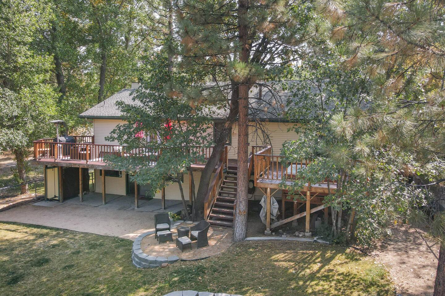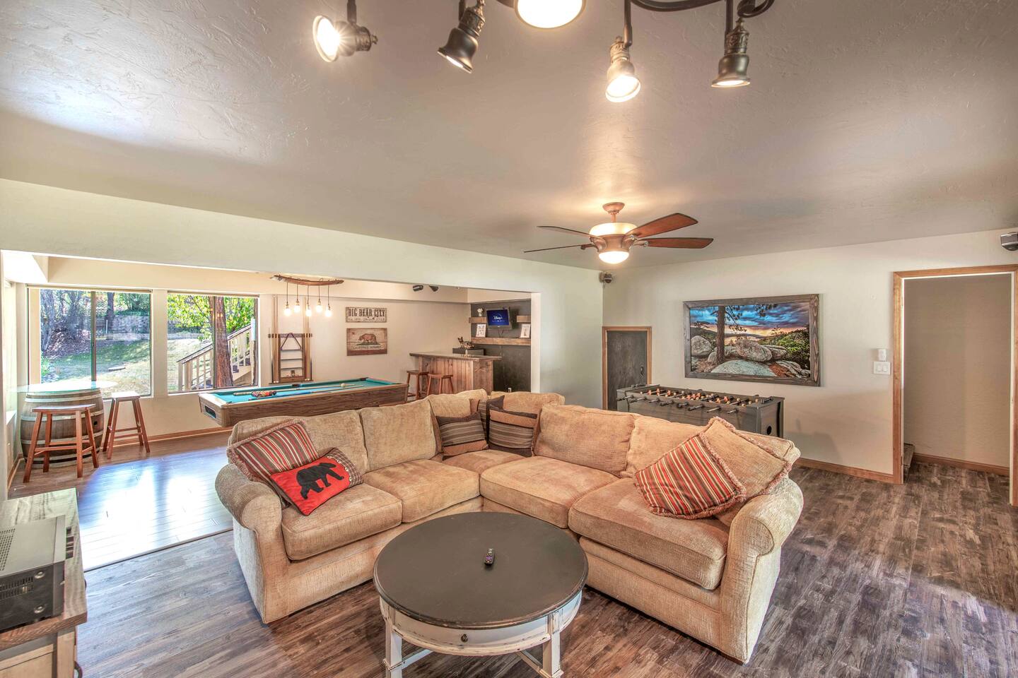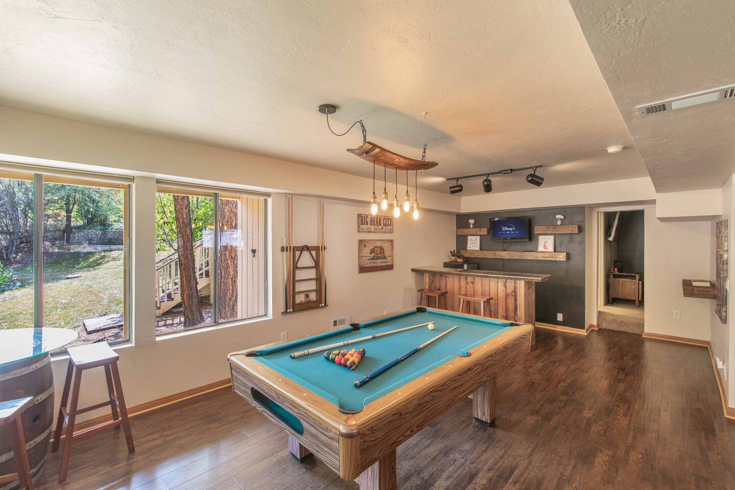 Only 1 mile/ 3 min drive to Oktoberfest! A short 5 minute car ride to Bear Mountain in one of the nicest neighborhoods in Moonridge. Edelweiss boasts an open floorplan and tree views from every window. Four bedrooms (3 on the main floor/bunk bedroom downstairs) 3 bathrooms, a game room has foosball table, pool table, wood-burning fireplace. The deck has ample seating, a gas grill, and jacuzzi spa. Spacious yard is fenced and includes a trampoline. Occupancy 10 people /4 cars
