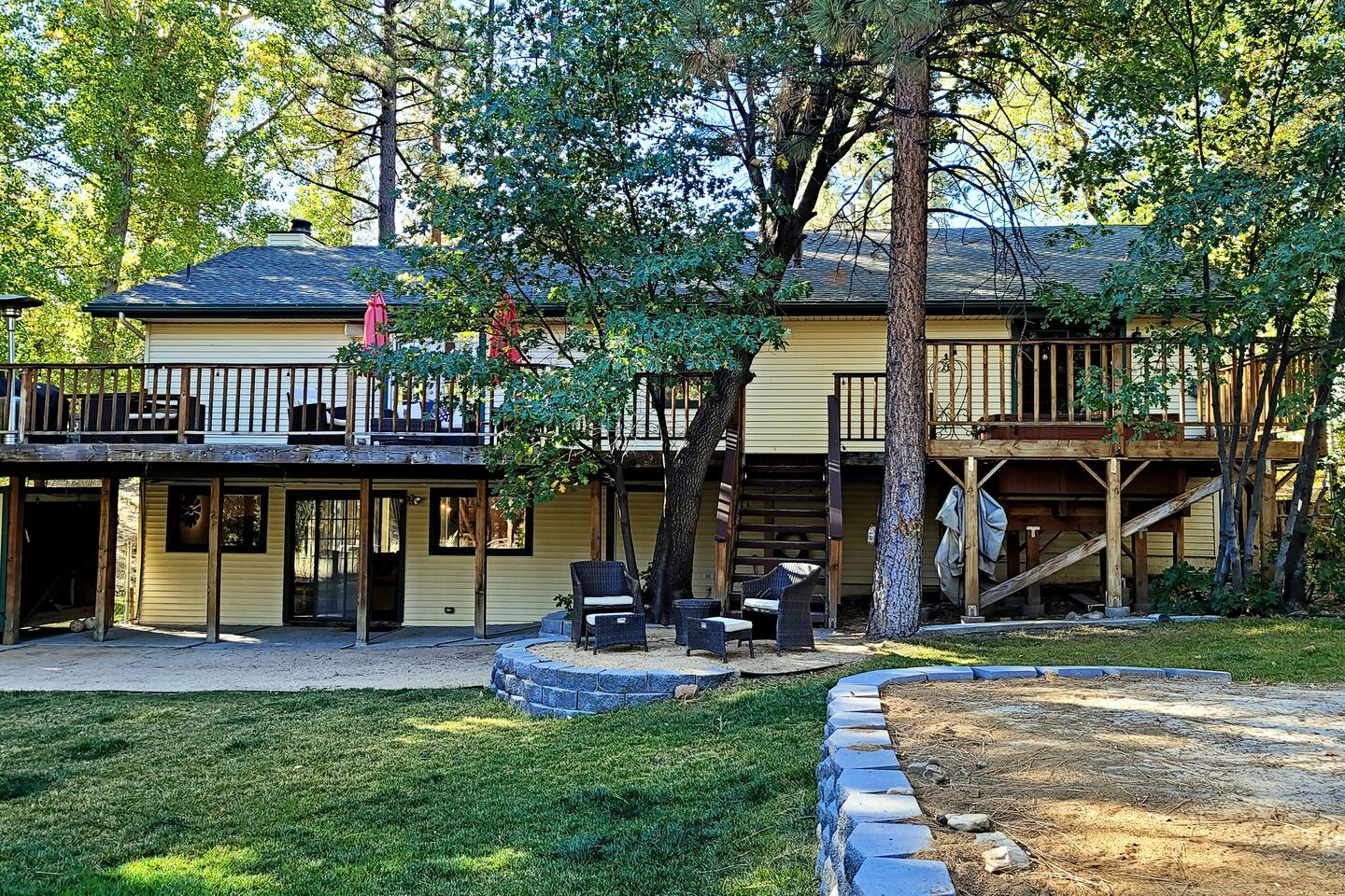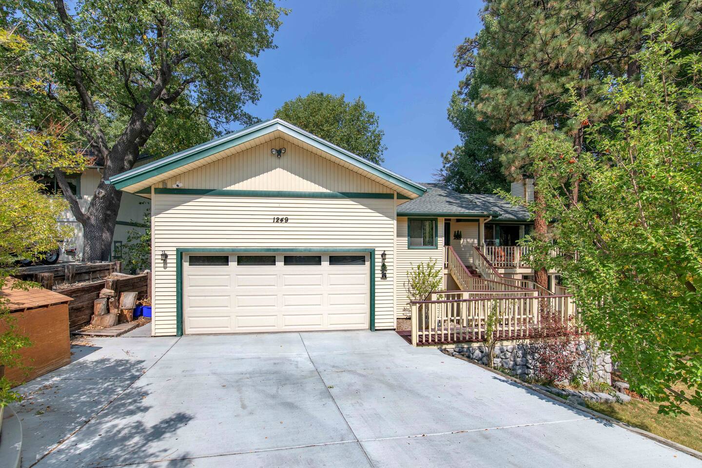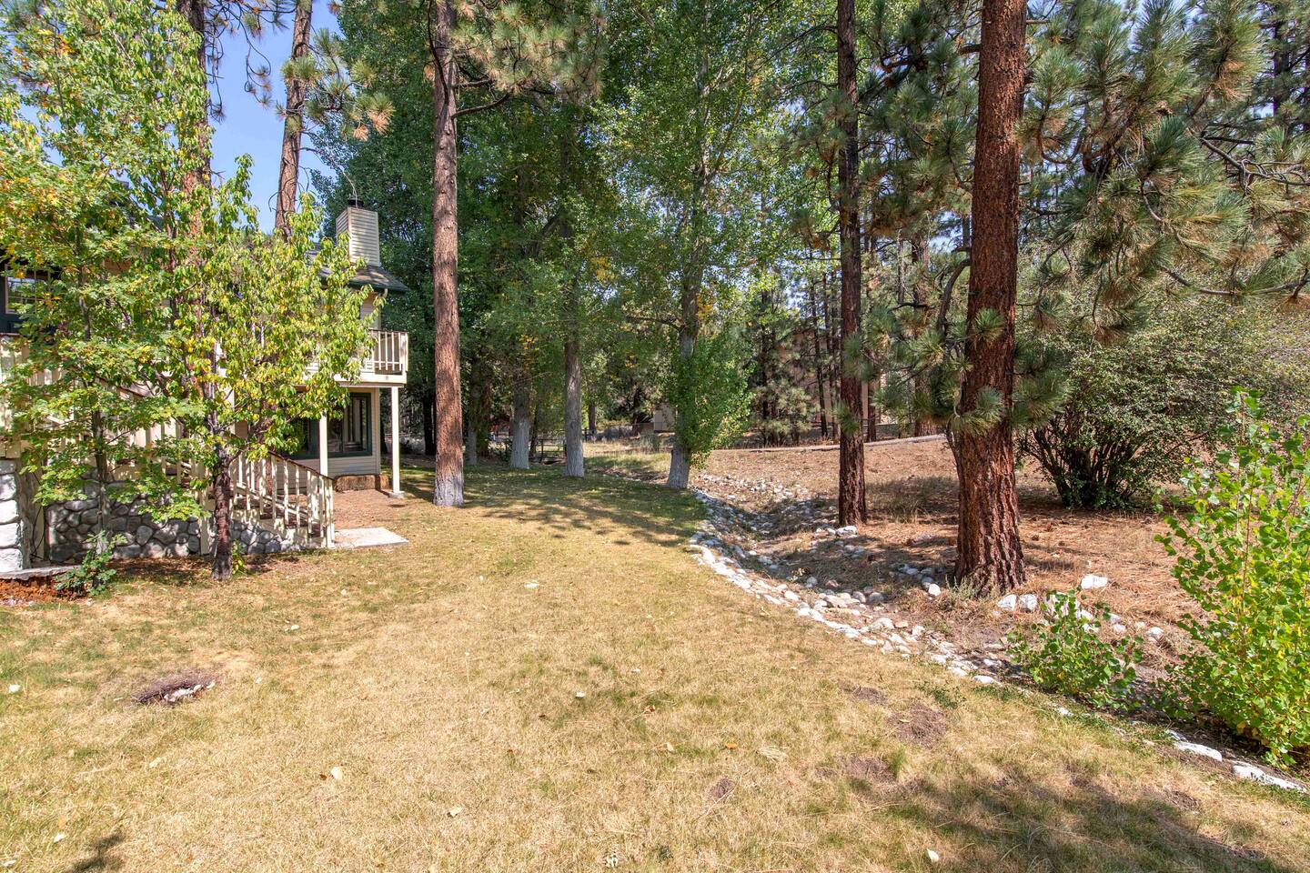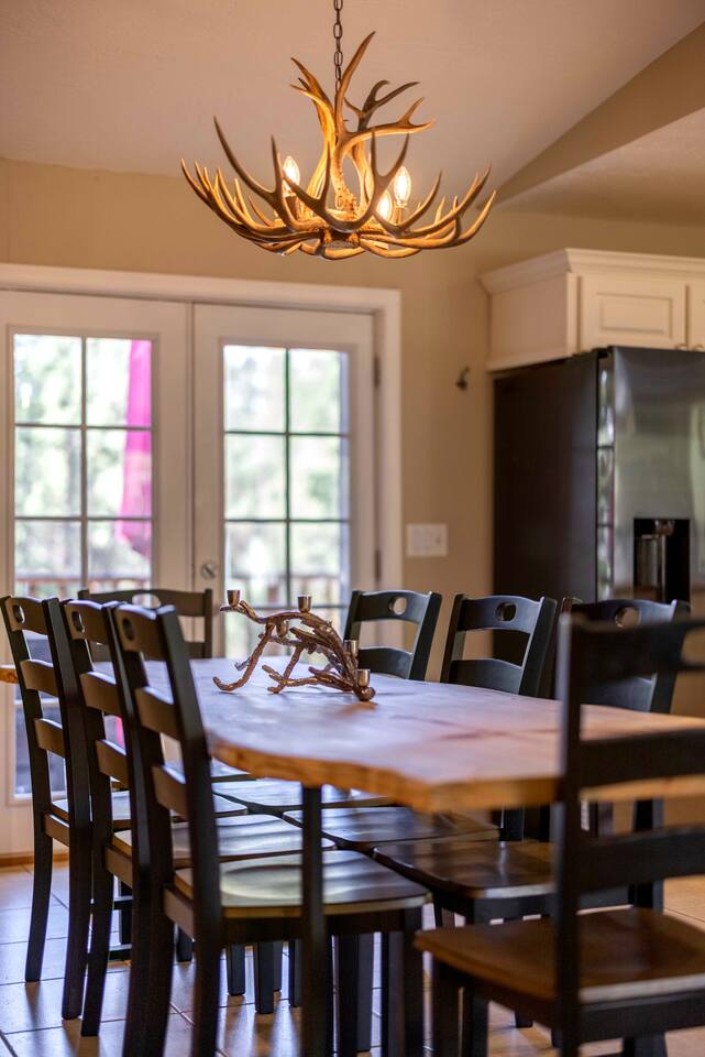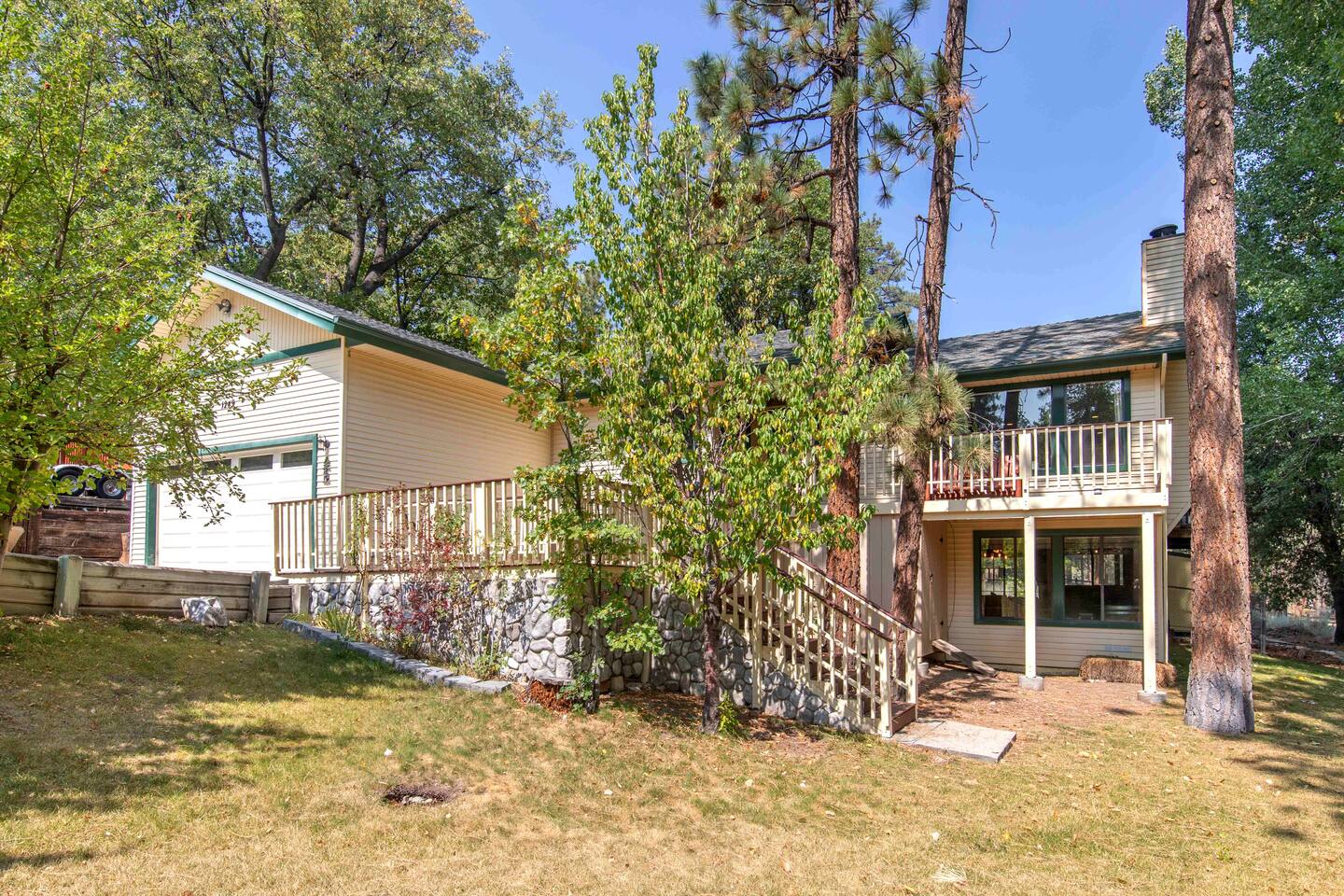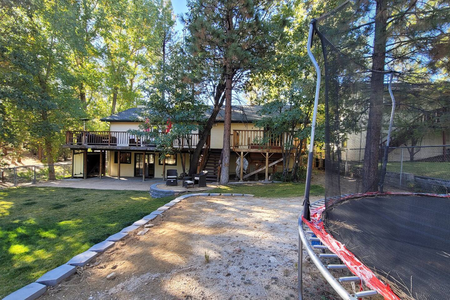 Welcome to Edelweiss Cabin! This hidden gem is nestled in the serene Fox Farm neighborhood of the Moonridge area, one of Big Bear's most desirable communities. Surrounded by lush trees, this pet-friendly retreat is perfect for a relaxing getaway. Enjoy modern amenities, stunning panoramic views, and plenty of space for your entire family including your furry friends! Very close to Bear Mountain and Snow Summit. Key Features: Spacious & Secluded: Situated on a large fenced lot with a massive backyard featuring a trampoline, this retreat is perfect for kids and pets to play. Parking is available for up to four vehicles. Entertainment for All Ages: Game room with a pool table, foosball, and smart TVs throughout the cabin. Enjoy free high-speed Wi-Fi and access to popular streaming services (please login with your own accounts). Relax and Unwind: Large upper deck with ample seating, a gas grill, a stand-up heating lamp, and a hot tub. Cabin Layout: Main Floor: Living Room: Open living area with a natural stone, wood-burning fireplace and large flat-screen TV. French doors open to the oversized deck with views of the lush forest, a brook, and a winding path. Dining Room: Features an elegant wood accent wall, with seating for eight. Direct access to the deck for outdoor dining. Kitchen: Fully stocked with updated appliances, including a double-door refrigerator with ice/water dispenser, Jen-Air gas cooktop, large farmhouse sink, under-cabinet microwave, coffee maker, and toaster. Plenty of counter space and a breakfast bar for extra seating. Bedroom 1 (Master Suite): King bed, wall-mounted TV, vanity with lighted mirror, ceiling fan, and double doors leading to the patio with a jacuzzi spa. Ensuite bathroom with a stylish hammered stainless steel sink and walk-in rain shower. Bedroom 2: Queen bed, lounging sofa, and scenic window views. Bedroom 3: Queen bed with cozy ambiance. Bathroom 2: Full bathroom with tub/shower combo. Laundry Room: Equipped with a newer washer and dryer. Safety: Stairway off the living area is gated to keep toddlers and pets safe. Downstairs: Game Room: All-new wood flooring, featuring a pool table, foosball, two TVs, and a bar area with stools. Downstairs Pellet stove is not functioning as of 2/14/25. Bedroom 4 (Kids’ Room): Four single beds in a bunk setup, low ceiling, and a wall-mounted TV—perfect for children. Bathroom 3: Conveniently located with a walk-in shower. Outdoor Space: Yard: Expansive, fenced, and wooded—ideal for family and pet adventures. Includes a sandy area with a trampoline (use at your own risk) and a seating area with a rattan outdoor table and chairs. Deck: Accessible from both the living area and the Master bedroom. Equipped with comfortable seating, a gas grill, a stand-up heating lamp, and a jacuzzi spa—perfect for relaxing under the stars. Additional Details: Non-family renters must be at least 25 years old. Two dogs maximum. Create Unforgettable Memories: Edelweiss Cabin offers a unique and tranquil setting for guests of all ages. Whether you're here for adventure or relaxation, this beautiful cabin promises an exceptional experience. Book now and make lasting memories with your loved ones! _____________________________________ Pets are welcome. Absolutely no smoking in or around the cabin. No parties allowed. Non-family renters must be at least 25 years old. For your safety, we have two security cameras installed. One is attached to the doorbell, and the other is a floodlight camera above the garage. We also have ONE (1) Minut decibel meter outside. 24/7” NOTE: Big Bear Lake local ordinance 99.300 limits maximum occupancy to 10 people & 4 parked cars. (Children, toddlers, and infants do count as a person.) Please do not book or arrive with more than the maximum or you could be fined from the city and evicted with no money back.
