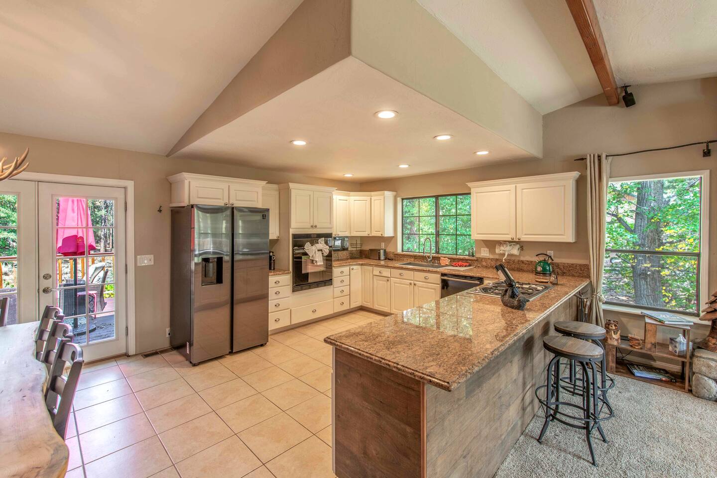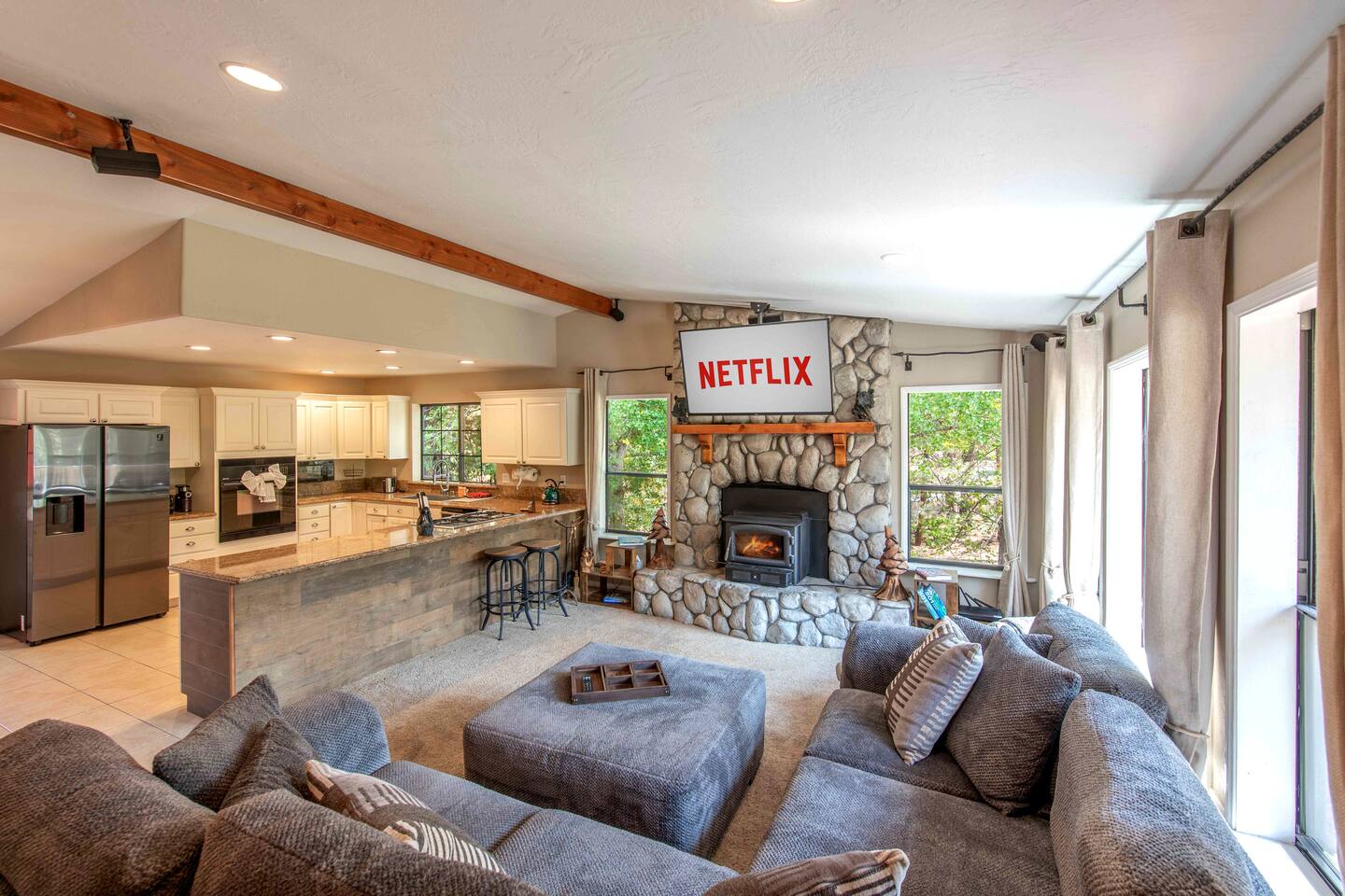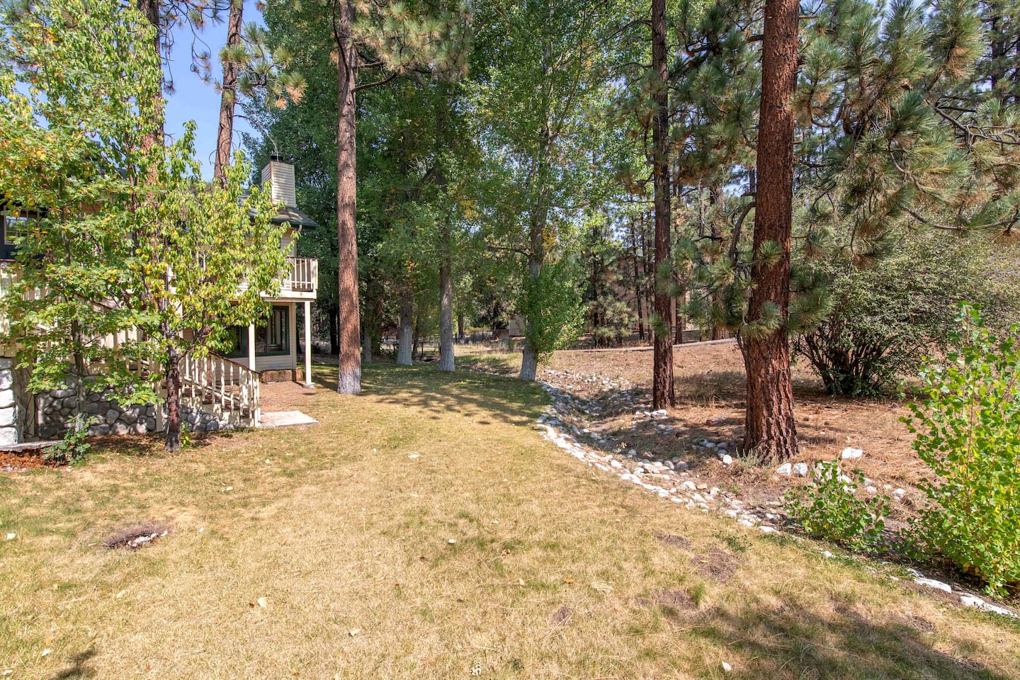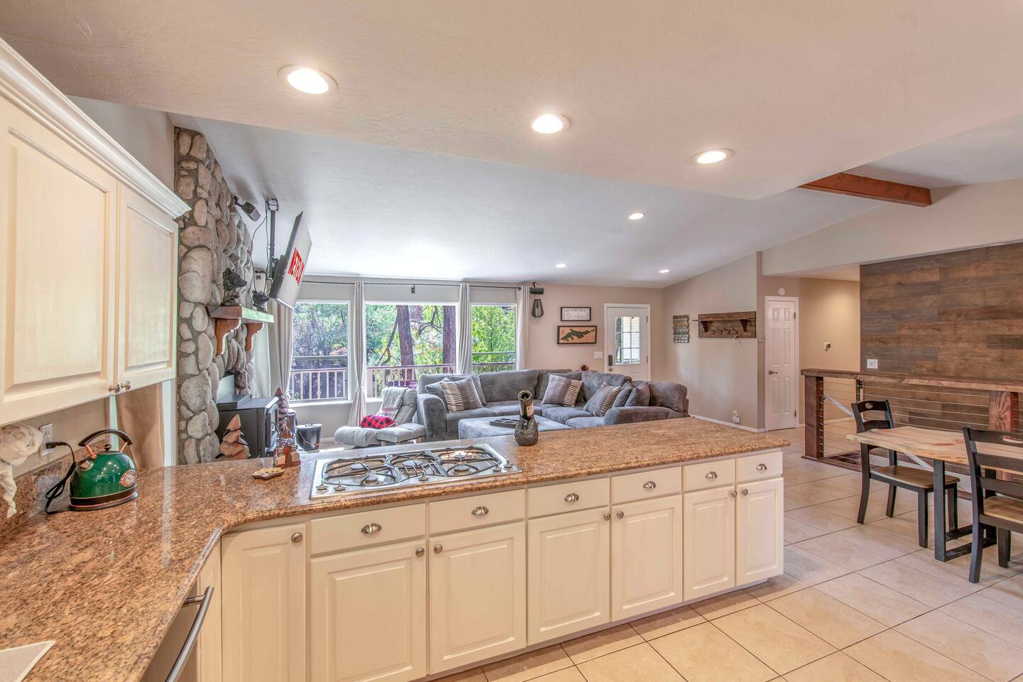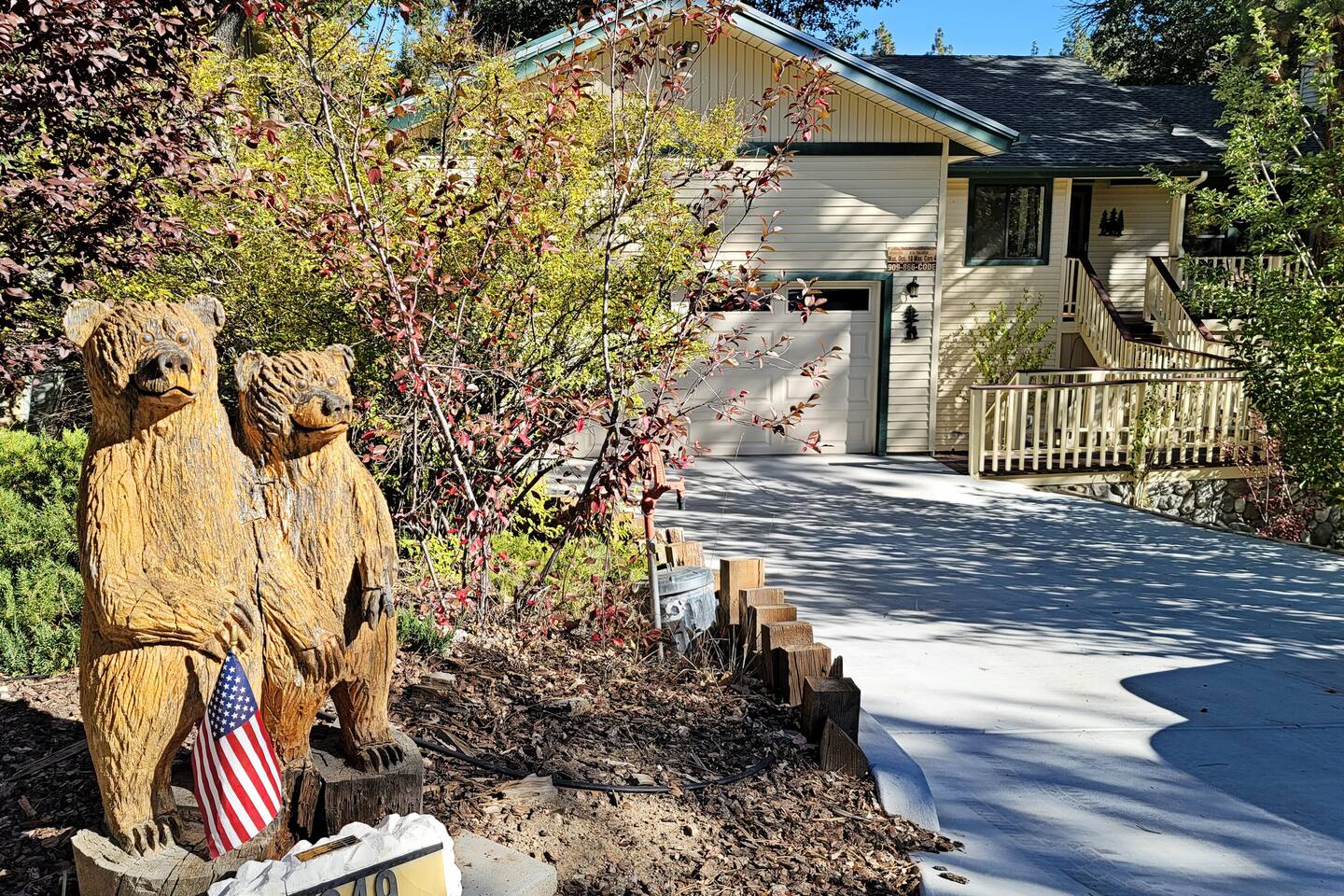 Welcome to Edelweiss Cabin! This hidden gem is nestled in the serene Fox Farm neighborhood of the Moonridge area, one of Big Bear's most desirable communities. Surrounded by lush trees, this pet-friendly retreat is perfect for a relaxing getaway. Enjoy modern amenities, stunning panoramic views, and plenty of space for your entire family including your furry friends! Very close to Bear Mountain and Snow Summit. Key Features: Spacious & Secluded: Situated on a large fenced lot with a massive backyard featuring a trampoline, this retreat is perfect for kids and pets to play. Parking is available for up to four vehicles. Entertainment for All Ages: Game room with a pool table, foosball, and smart TVs throughout the cabin. Enjoy free high-speed Wi-Fi and access to popular streaming services (please login with your own accounts). Relax and Unwind: Large upper deck with ample seating, a gas grill, a stand-up heating lamp, and a hot tub. Cabin Layout: Main Floor: Living Room: Open living area with a natural stone, wood-burning fireplace and large flat-screen TV. French doors open to the oversized deck with views of the lush forest, a brook, and a winding path. Dining Room: Features an elegant wood accent wall, with seating for eight. Direct access to the deck for outdoor dining. Kitchen: Fully stocked with updated appliances, including a double-door refrigerator with ice/water dispenser, Jen-Air gas cooktop, large farmhouse sink, under-cabinet microwave, coffee maker, and toaster. Plenty of counter space and a breakfast bar for extra seating. Bedroom 1 (Master Suite): King bed, wall-mounted TV, vanity with lighted mirror, ceiling fan, and double doors leading to the patio with a jacuzzi spa. Ensuite bathroom with a stylish hammered stainless steel sink and walk-in rain shower. Bedroom 2: Queen bed, lounging sofa, and scenic window views. Bedroom 3: Queen bed with cozy ambiance. Bathroom 2: Full bathroom with tub/shower combo. Laundry Room: Equipped with a newer washer and dryer. Safety: Stairway off the living area is gated to keep toddlers and pets safe. Downstairs: Game Room: All-new wood flooring, featuring a pool table, foosball, two TVs, and a bar area with stools. Downstairs Pellet stove is not functioning as of 2/14/25. Bedroom 4 (Kids’ Room): Four single beds in a bunk setup, low ceiling, and a wall-mounted TV—perfect for children. Bathroom 3: Conveniently located with a walk-in shower. Outdoor Space: Yard: Expansive, fenced, and wooded—ideal for family and pet adventures. Includes a sandy area with a trampoline (use at your own risk) and a seating area with a rattan outdoor table and chairs. Deck: Accessible from both the living area and the Master bedroom. Equipped with comfortable seating, a gas grill, a stand-up heating lamp, and a jacuzzi spa—perfect for relaxing under the stars. Additional Details: Non-family renters must be at least 25 years old. Two dogs maximum. Create Unforgettable Memories: Edelweiss Cabin offers a unique and tranquil setting for guests of all ages. Whether you're here for adventure or relaxation, this beautiful cabin promises an exceptional experience. Book now and make lasting memories with your loved ones! _____________________________________ Pets are welcome. Absolutely no smoking in or around the cabin. No parties allowed. Non-family renters must be at least 25 years old. For your safety, we have two security cameras installed. One is attached to the doorbell, and the other is a floodlight camera above the garage. We also have ONE (1) Minut decibel meter outside. 24/7” NOTE: Big Bear Lake local ordinance 99.300 limits maximum occupancy to 10 people & 4 parked cars. (Children, toddlers, and infants do count as a person.) Please do not book or arrive with more than the maximum or you could be fined from the city and evicted with no money back.