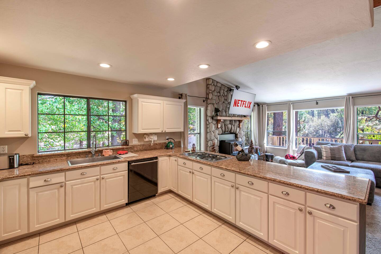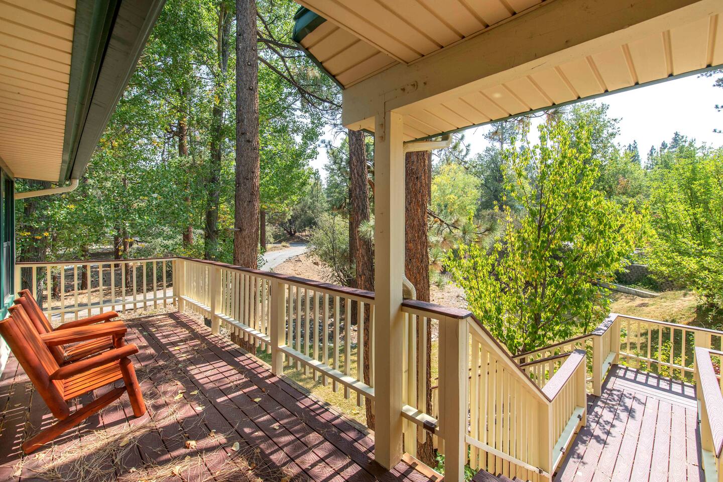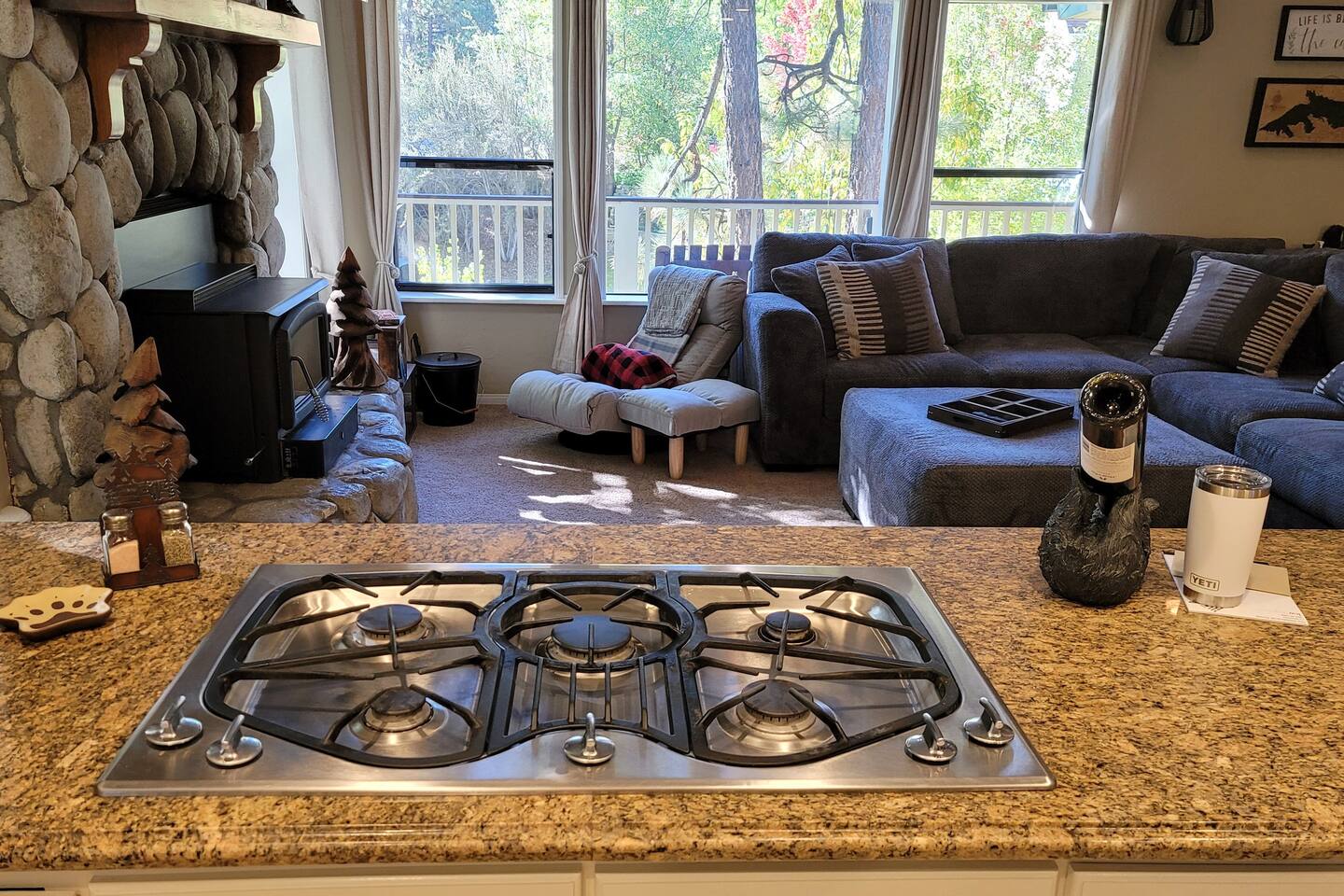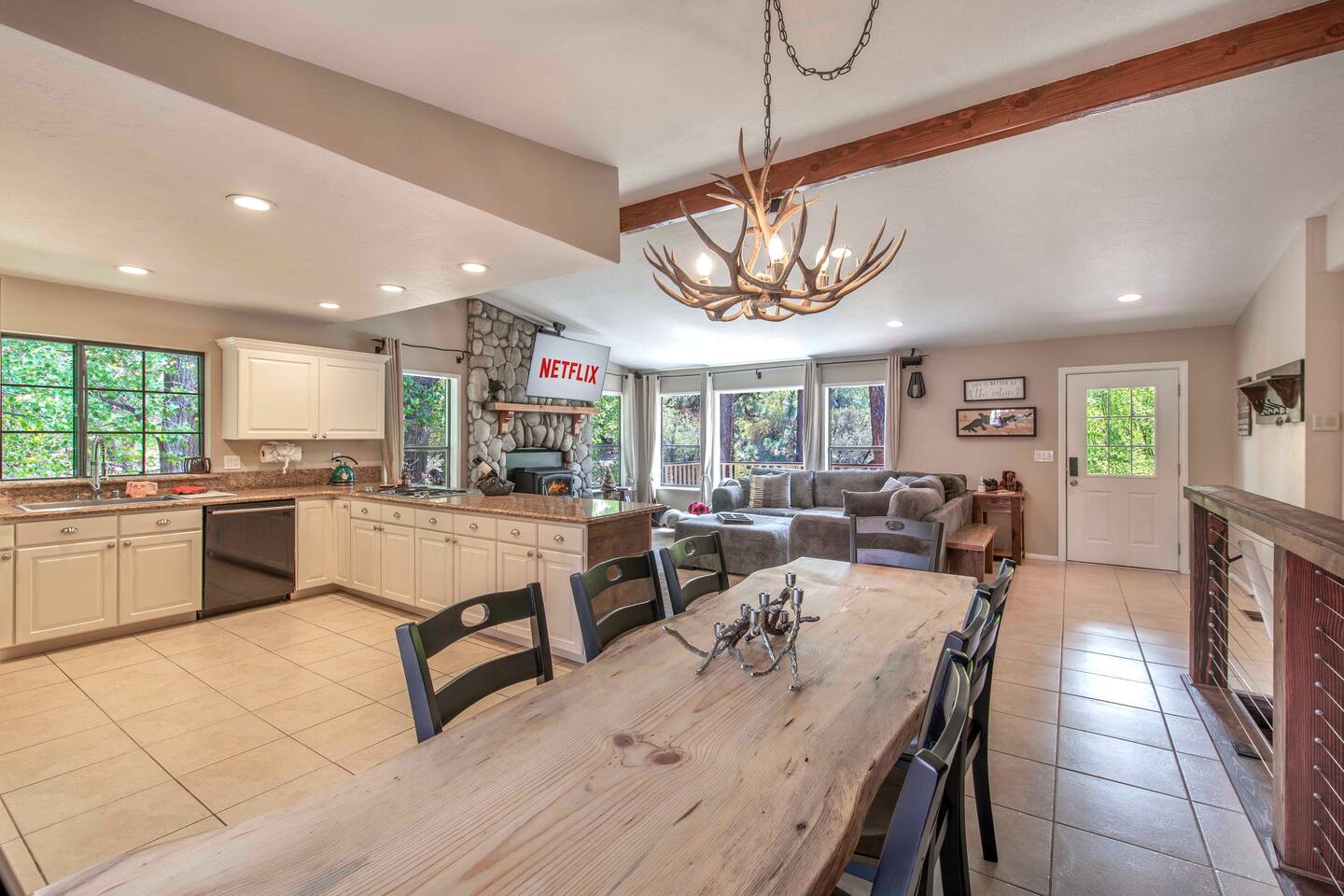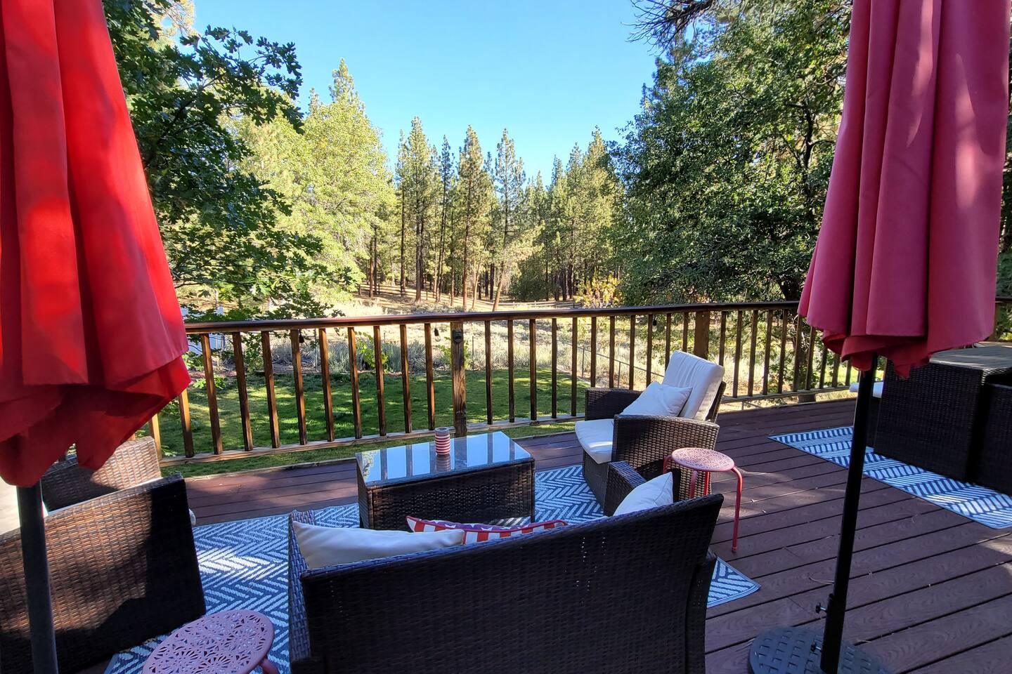 Welcome to Edelweiss Cabin! This hidden gem is nestled in the serene Fox Farm neighborhood of the Moonridge area, one of Big Bear's most desirable communities. Surrounded by lush trees, this pet-friendly retreat is perfect for a relaxing getaway. Enjoy modern amenities, stunning panoramic views, and plenty of space for your entire family including your furry friends! Very close to Bear Mountain and Snow Summit. Key Features: Spacious & Secluded: Situated on a large fenced lot with a massive backyard featuring a trampoline, this retreat is perfect for kids and pets to play. Parking is available for up to four vehicles. Entertainment for All Ages: Game room with a pool table, foosball, and smart TVs throughout the cabin. Enjoy free high-speed Wi-Fi and access to popular streaming services (please login with your own accounts). Relax and Unwind: Large upper deck with ample seating, a gas grill, a stand-up heating lamp, and a hot tub. Cabin Layout: Main Floor: Living Room: Open living area with a natural stone, wood-burning fireplace and large flat-screen TV. French doors open to the oversized deck with views of the lush forest, a brook, and a winding path. Dining Room: Features an elegant wood accent wall, with seating for eight. Direct access to the deck for outdoor dining. Kitchen: Fully stocked with updated appliances, including a double-door refrigerator with ice/water dispenser, Jen-Air gas cooktop, large farmhouse sink, under-cabinet microwave, coffee maker, and toaster. Plenty of counter space and a breakfast bar for extra seating. Bedroom 1 (Master Suite): King bed, wall-mounted TV, vanity with lighted mirror, ceiling fan, and double doors leading to the patio with a jacuzzi spa. Ensuite bathroom with a stylish hammered stainless steel sink and walk-in rain shower. Bedroom 2: Queen bed, lounging sofa, and scenic window views. Bedroom 3: Queen bed with cozy ambiance. Bathroom 2: Full bathroom with tub/shower combo. Laundry Room: Equipped with a newer washer and dryer. Safety: Stairway off the living area is gated to keep toddlers and pets safe. Downstairs: Game Room: All-new wood flooring, featuring a pool table, foosball, two TVs, and a bar area with stools. Downstairs Pellet stove is not functioning as of 2/14/25. Bedroom 4 (Kids’ Room): Four single beds in a bunk setup, low ceiling, and a wall-mounted TV—perfect for children. Bathroom 3: Conveniently located with a walk-in shower. Outdoor Space: Yard: Expansive, fenced, and wooded—ideal for family and pet adventures. Includes a sandy area with a trampoline (use at your own risk) and a seating area with a rattan outdoor table and chairs. Deck: Accessible from both the living area and the Master bedroom. Equipped with comfortable seating, a gas grill, a stand-up heating lamp, and a jacuzzi spa—perfect for relaxing under the stars. Additional Details: Non-family renters must be at least 25 years old. Two dogs maximum. Create Unforgettable Memories: Edelweiss Cabin offers a unique and tranquil setting for guests of all ages. Whether you're here for adventure or relaxation, this beautiful cabin promises an exceptional experience. Book now and make lasting memories with your loved ones! _____________________________________ Pets are welcome. Absolutely no smoking in or around the cabin. No parties allowed. Non-family renters must be at least 25 years old. For your safety, we have two security cameras installed. One is attached to the doorbell, and the other is a floodlight camera above the garage. We also have ONE (1) Minut decibel meter outside. 24/7” NOTE: Big Bear Lake local ordinance 99.300 limits maximum occupancy to 10 people & 4 parked cars. (Children, toddlers, and infants do count as a person.) Please do not book or arrive with more than the maximum or you could be fined from the city and evicted with no money back.