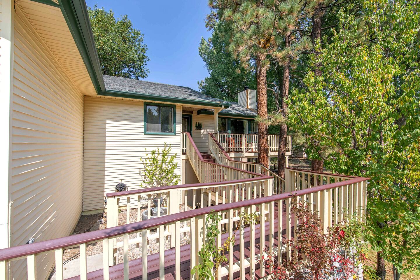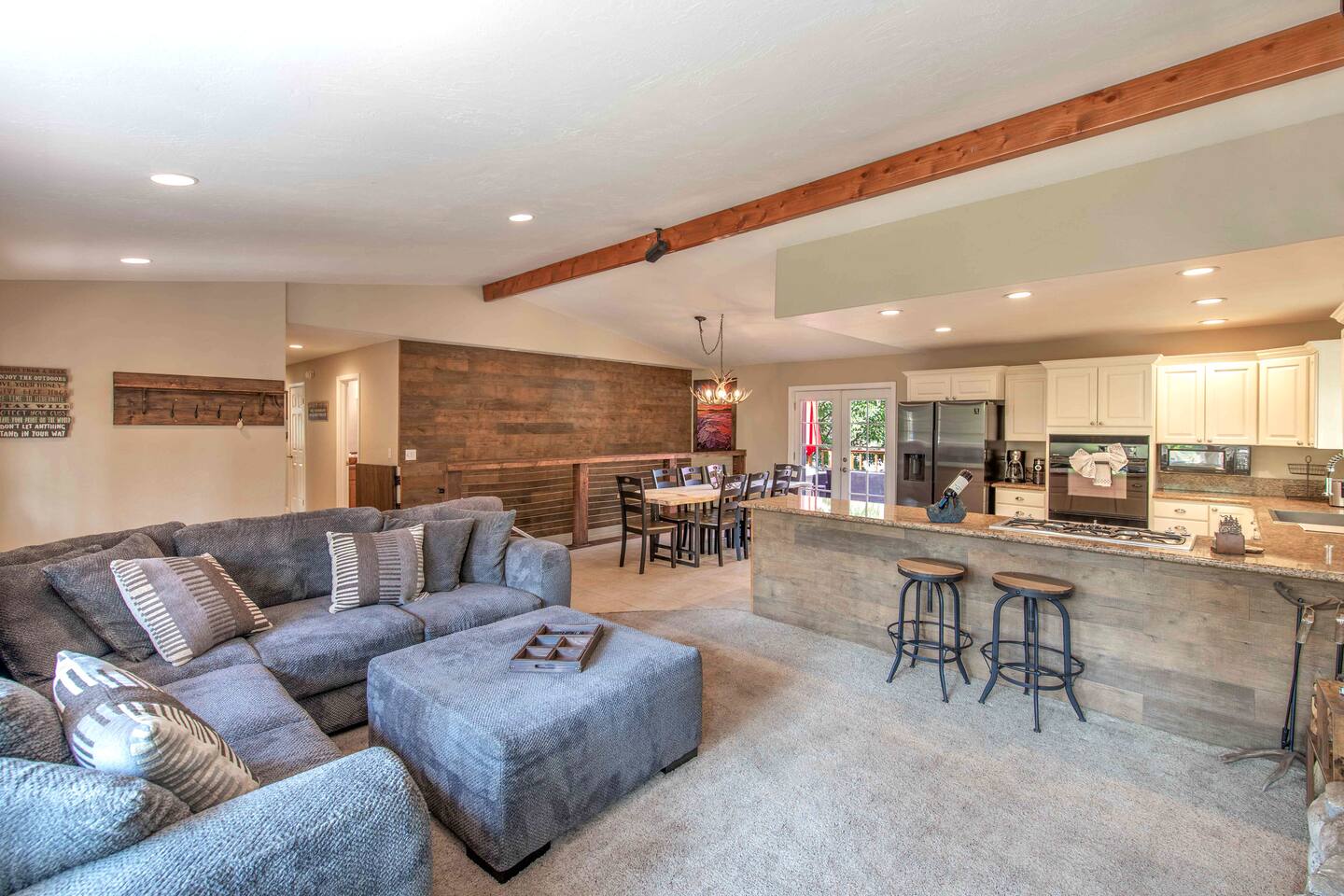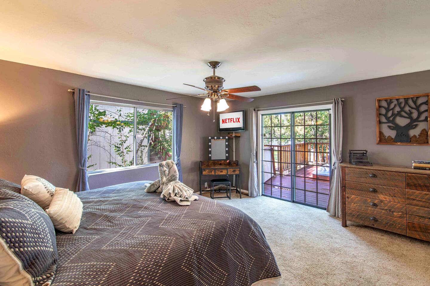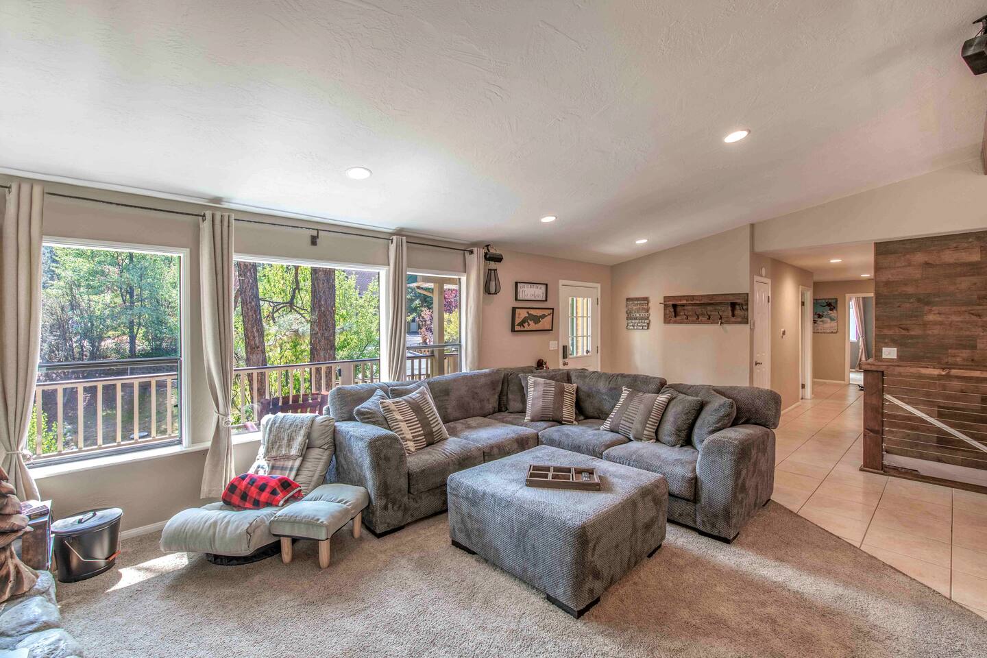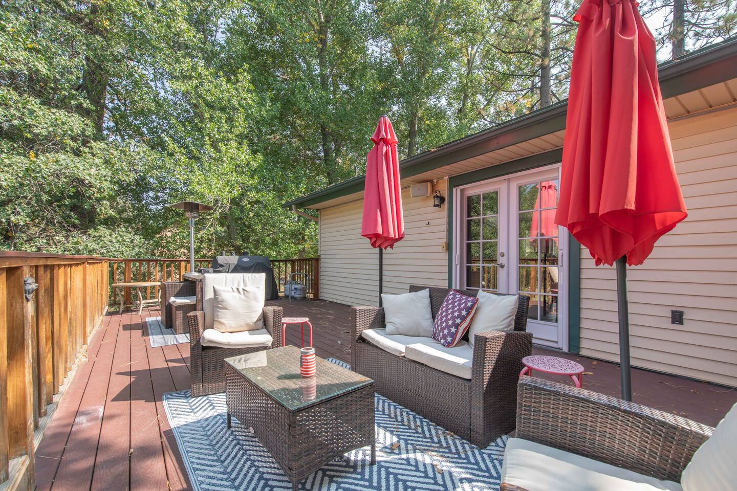 Welcome to Edelweiss Cabin! This hidden gem is nestled in the serene Fox Farm neighborhood of the Moonridge area, one of Big Bear's most desirable communities. Surrounded by lush trees, this pet-friendly retreat is perfect for a relaxing getaway. Enjoy modern amenities, stunning panoramic views, and plenty of space for your entire family including your furry friends! Very close to Bear Mountain and Snow Summit. Key Features: Spacious & Secluded: Situated on a large fenced lot with a massive backyard featuring a trampoline, this retreat is perfect for kids and pets to play. Parking is available for up to four vehicles. Entertainment for All Ages: Game room with a pool table, foosball, and smart TVs throughout the cabin. Enjoy free high-speed Wi-Fi and access to popular streaming services (please login with your own accounts). Relax and Unwind: Large upper deck with ample seating, a gas grill, a stand-up heating lamp, and a hot tub. Cabin Layout: Main Floor: Living Room: Open living area with a natural stone, wood-burning fireplace and large flat-screen TV. French doors open to the oversized deck with views of the lush forest, a brook, and a winding path. Dining Room: Features an elegant wood accent wall, with seating for eight. Direct access to the deck for outdoor dining. Kitchen: Fully stocked with updated appliances, including a double-door refrigerator with ice/water dispenser, Jen-Air gas cooktop, large farmhouse sink, under-cabinet microwave, coffee maker, and toaster. Plenty of counter space and a breakfast bar for extra seating. Bedroom 1 (Master Suite): King bed, wall-mounted TV, vanity with lighted mirror, ceiling fan, and double doors leading to the patio with a jacuzzi spa. Ensuite bathroom with a stylish hammered stainless steel sink and walk-in rain shower. Bedroom 2: Queen bed, lounging sofa, and scenic window views. Bedroom 3: Queen bed with cozy ambiance. Bathroom 2: Full bathroom with tub/shower combo. Laundry Room: Equipped with a newer washer and dryer. Safety: Stairway off the living area is gated to keep toddlers and pets safe. Downstairs: Game Room: All-new wood flooring, featuring a pool table, foosball, two TVs, and a bar area with stools. Downstairs Pellet stove is not functioning as of 2/14/25. Bedroom 4 (Kids’ Room): Four single beds in a bunk setup, low ceiling, and a wall-mounted TV—perfect for children. Bathroom 3: Conveniently located with a walk-in shower. Outdoor Space: Yard: Expansive, fenced, and wooded—ideal for family and pet adventures. Includes a sandy area with a trampoline (use at your own risk) and a seating area with a rattan outdoor table and chairs. Deck: Accessible from both the living area and the Master bedroom. Equipped with comfortable seating, a gas grill, a stand-up heating lamp, and a jacuzzi spa—perfect for relaxing under the stars. Additional Details: Non-family renters must be at least 25 years old. Two dogs maximum. Create Unforgettable Memories: Edelweiss Cabin offers a unique and tranquil setting for guests of all ages. Whether you're here for adventure or relaxation, this beautiful cabin promises an exceptional experience. Book now and make lasting memories with your loved ones! _____________________________________ Pets are welcome. Absolutely no smoking in or around the cabin. No parties allowed. Non-family renters must be at least 25 years old. For your safety, we have two security cameras installed. One is attached to the doorbell, and the other is a floodlight camera above the garage. We also have ONE (1) Minut decibel meter outside. 24/7” NOTE: Big Bear Lake local ordinance 99.300 limits maximum occupancy to 10 people & 4 parked cars. (Children, toddlers, and infants do count as a person.) Please do not book or arrive with more than the maximum or you could be fined from the city and evicted with no money back.