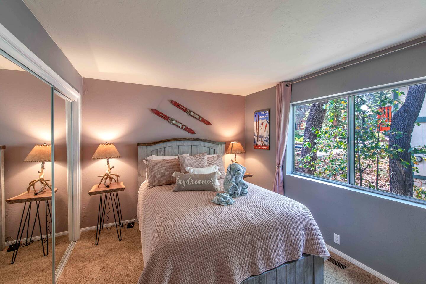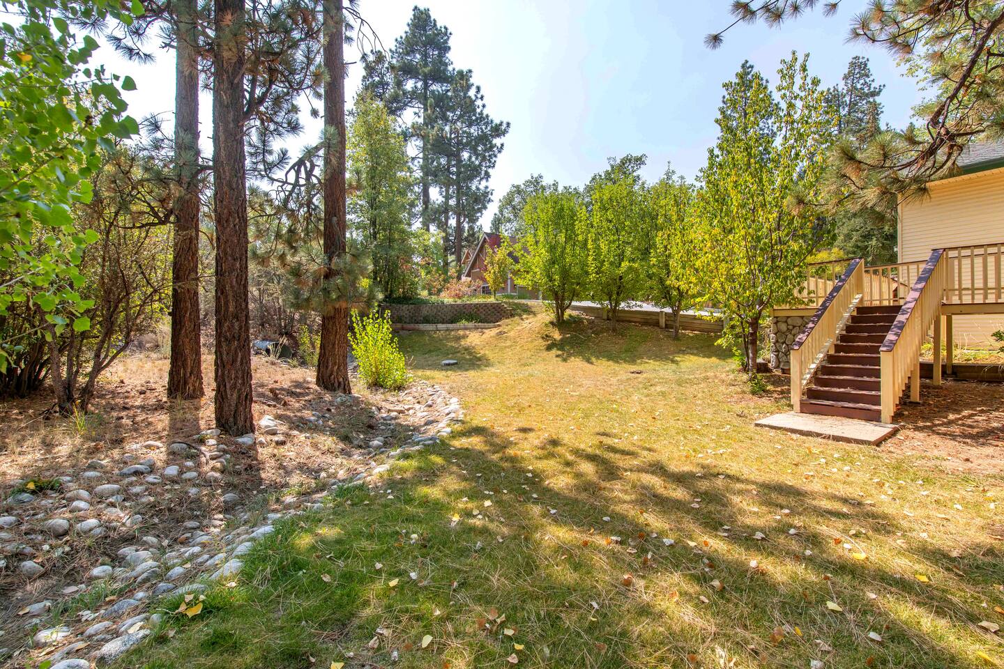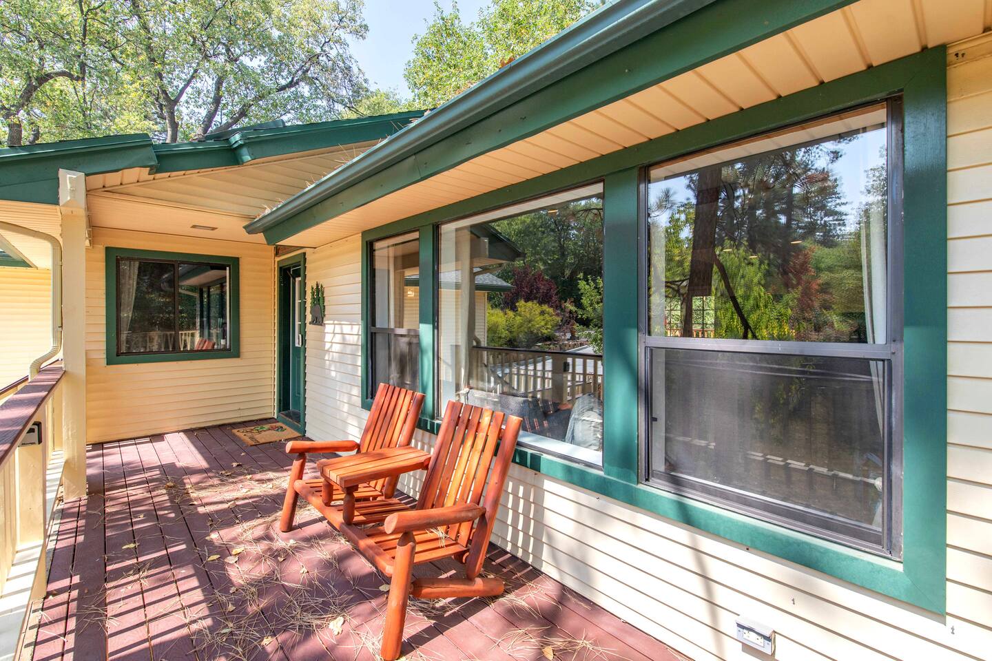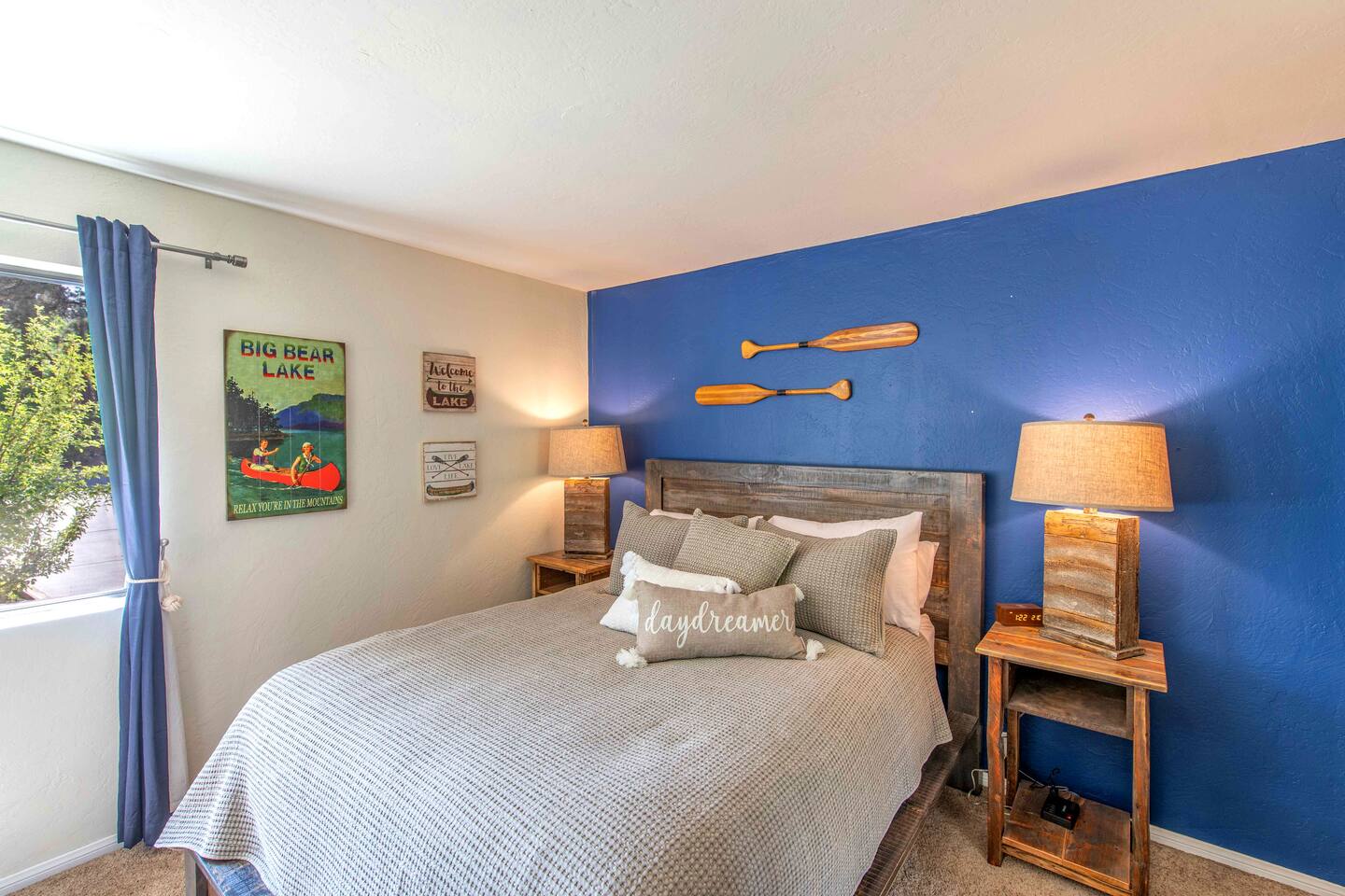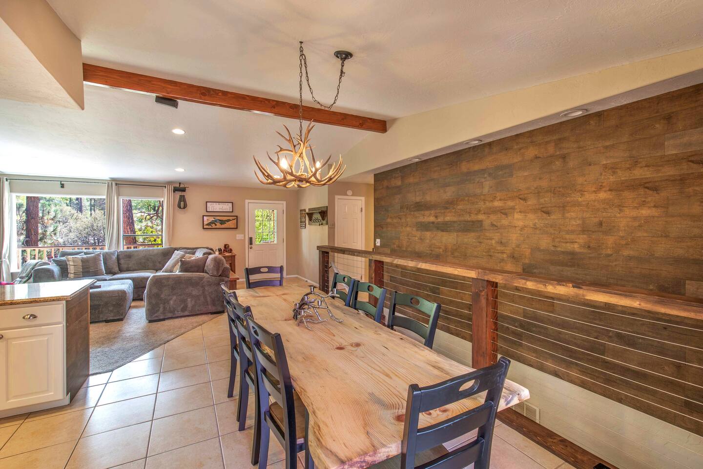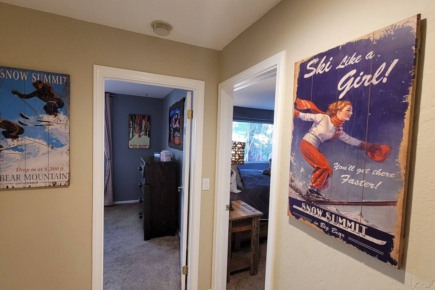 Welcome to Edelweiss Cabin! This hidden gem is nestled in the serene Fox Farm neighborhood of the Moonridge area, one of Big Bear's most desirable communities. Surrounded by lush trees, this pet-friendly retreat is perfect for a relaxing getaway. Enjoy modern amenities, stunning panoramic views, and plenty of space for your entire family including your furry friends! Very close to Bear Mountain and Snow Summit. Key Features: Spacious & Secluded: Situated on a large fenced lot with a massive backyard featuring a trampoline, this retreat is perfect for kids and pets to play. Parking is available for up to four vehicles. Entertainment for All Ages: Game room with a pool table, foosball, and smart TVs throughout the cabin. Enjoy free high-speed Wi-Fi and access to popular streaming services (please login with your own accounts). Relax and Unwind: Large upper deck with ample seating, a gas grill, a stand-up heating lamp, and a hot tub. Cabin Layout: Main Floor: Living Room: Open living area with a natural stone, wood-burning fireplace and large flat-screen TV. French doors open to the oversized deck with views of the lush forest, a brook, and a winding path. Dining Room: Features an elegant wood accent wall, with seating for eight. Direct access to the deck for outdoor dining. Kitchen: Fully stocked with updated appliances, including a double-door refrigerator with ice/water dispenser, Jen-Air gas cooktop, large farmhouse sink, under-cabinet microwave, coffee maker, and toaster. Plenty of counter space and a breakfast bar for extra seating. Bedroom 1 (Master Suite): King bed, wall-mounted TV, vanity with lighted mirror, ceiling fan, and double doors leading to the patio with a jacuzzi spa. Ensuite bathroom with a stylish hammered stainless steel sink and walk-in rain shower. Bedroom 2: Queen bed, lounging sofa, and scenic window views. Bedroom 3: Queen bed with cozy ambiance. Bathroom 2: Full bathroom with tub/shower combo. Laundry Room: Equipped with a newer washer and dryer. Safety: Stairway off the living area is gated to keep toddlers and pets safe. Downstairs: Game Room: All-new wood flooring, featuring a pool table, foosball, two TVs, and a bar area with stools. Downstairs Pellet stove is not functioning as of 2/14/25. Bedroom 4 (Kids’ Room): Four single beds in a bunk setup, low ceiling, and a wall-mounted TV—perfect for children. Bathroom 3: Conveniently located with a walk-in shower. Outdoor Space: Yard: Expansive, fenced, and wooded—ideal for family and pet adventures. Includes a sandy area with a trampoline (use at your own risk) and a seating area with a rattan outdoor table and chairs. Deck: Accessible from both the living area and the Master bedroom. Equipped with comfortable seating, a gas grill, a stand-up heating lamp, and a jacuzzi spa—perfect for relaxing under the stars. Additional Details: Non-family renters must be at least 25 years old. Two dogs maximum. Create Unforgettable Memories: Edelweiss Cabin offers a unique and tranquil setting for guests of all ages. Whether you're here for adventure or relaxation, this beautiful cabin promises an exceptional experience. Book now and make lasting memories with your loved ones! _____________________________________ Pets are welcome. Absolutely no smoking in or around the cabin. No parties allowed. Non-family renters must be at least 25 years old. For your safety, we have two security cameras installed. One is attached to the doorbell, and the other is a floodlight camera above the garage. We also have ONE (1) Minut decibel meter outside. 24/7” NOTE: Big Bear Lake local ordinance 99.300 limits maximum occupancy to 10 people & 4 parked cars. (Children, toddlers, and infants do count as a person.) Please do not book or arrive with more than the maximum or you could be fined from the city and evicted with no money back.