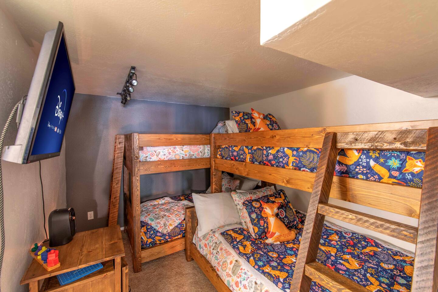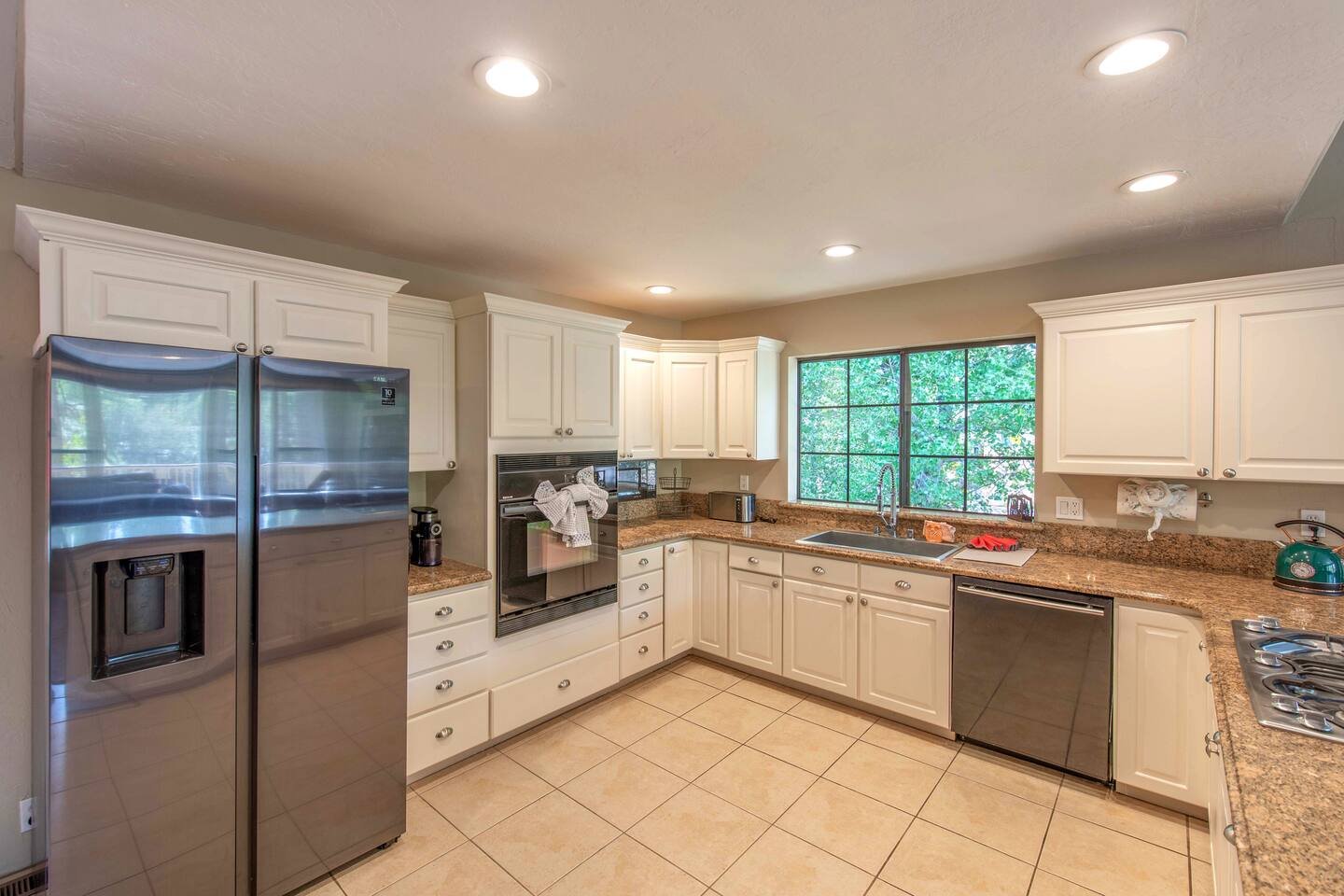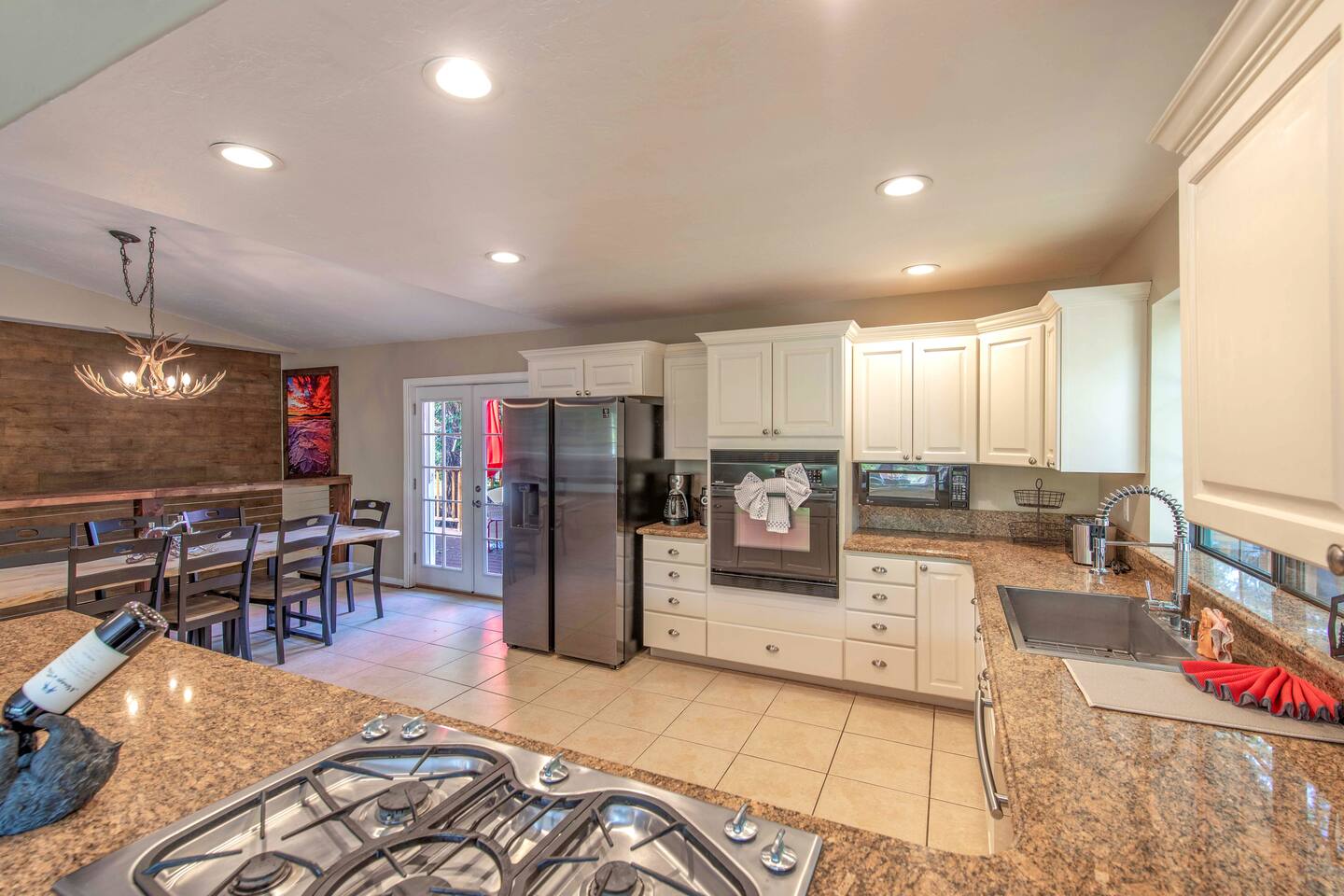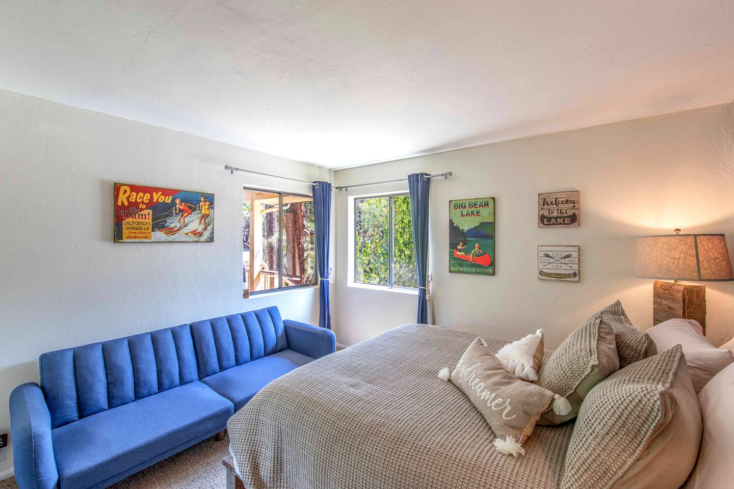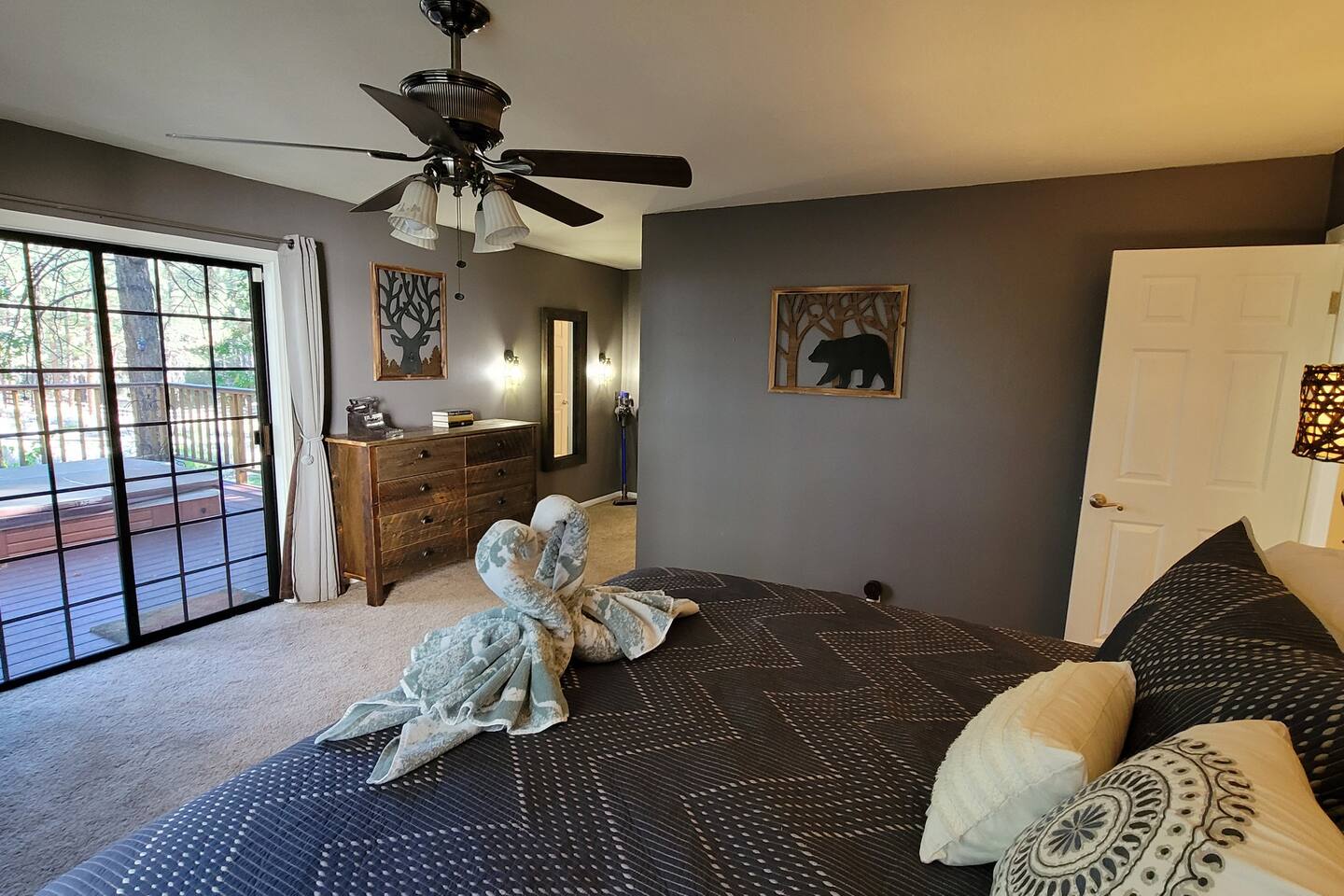 Welcome to Edelweiss Cabin! This hidden gem is nestled in the serene Fox Farm neighborhood of the Moonridge area, one of Big Bear's most desirable communities. Surrounded by lush trees, this pet-friendly retreat is perfect for a relaxing getaway. Enjoy modern amenities, stunning panoramic views, and plenty of space for your entire family including your furry friends! Very close to Bear Mountain and Snow Summit. Key Features: Spacious & Secluded: Situated on a large fenced lot with a massive backyard featuring a trampoline, this retreat is perfect for kids and pets to play. Parking is available for up to four vehicles. Entertainment for All Ages: Game room with a pool table, foosball, and smart TVs throughout the cabin. Enjoy free high-speed Wi-Fi and access to popular streaming services (please login with your own accounts). Relax and Unwind: Large upper deck with ample seating, a gas grill, a stand-up heating lamp, and a hot tub. Cabin Layout: Main Floor: Living Room: Open living area with a natural stone, wood-burning fireplace and large flat-screen TV. French doors open to the oversized deck with views of the lush forest, a brook, and a winding path. Dining Room: Features an elegant wood accent wall, with seating for eight. Direct access to the deck for outdoor dining. Kitchen: Fully stocked with updated appliances, including a double-door refrigerator with ice/water dispenser, Jen-Air gas cooktop, large farmhouse sink, under-cabinet microwave, coffee maker, and toaster. Plenty of counter space and a breakfast bar for extra seating. Bedroom 1 (Master Suite): King bed, wall-mounted TV, vanity with lighted mirror, ceiling fan, and double doors leading to the patio with a jacuzzi spa. Ensuite bathroom with a stylish hammered stainless steel sink and walk-in rain shower. Bedroom 2: Queen bed, lounging sofa, and scenic window views. Bedroom 3: Queen bed with cozy ambiance. Bathroom 2: Full bathroom with tub/shower combo. Laundry Room: Equipped with a newer washer and dryer. Safety: Stairway off the living area is gated to keep toddlers and pets safe. Downstairs: Game Room: All-new wood flooring, featuring a pool table, foosball, two TVs, and a bar area with stools. Downstairs Pellet stove is not functioning as of 2/14/25. Bedroom 4 (Kids’ Room): Four single beds in a bunk setup, low ceiling, and a wall-mounted TV—perfect for children. Bathroom 3: Conveniently located with a walk-in shower. Outdoor Space: Yard: Expansive, fenced, and wooded—ideal for family and pet adventures. Includes a sandy area with a trampoline (use at your own risk) and a seating area with a rattan outdoor table and chairs. Deck: Accessible from both the living area and the Master bedroom. Equipped with comfortable seating, a gas grill, a stand-up heating lamp, and a jacuzzi spa—perfect for relaxing under the stars. Additional Details: Non-family renters must be at least 25 years old. Two dogs maximum. Create Unforgettable Memories: Edelweiss Cabin offers a unique and tranquil setting for guests of all ages. Whether you're here for adventure or relaxation, this beautiful cabin promises an exceptional experience. Book now and make lasting memories with your loved ones! _____________________________________ Pets are welcome. Absolutely no smoking in or around the cabin. No parties allowed. Non-family renters must be at least 25 years old. For your safety, we have two security cameras installed. One is attached to the doorbell, and the other is a floodlight camera above the garage. We also have ONE (1) Minut decibel meter outside. 24/7” NOTE: Big Bear Lake local ordinance 99.300 limits maximum occupancy to 10 people & 4 parked cars. (Children, toddlers, and infants do count as a person.) Please do not book or arrive with more than the maximum or you could be fined from the city and evicted with no money back.